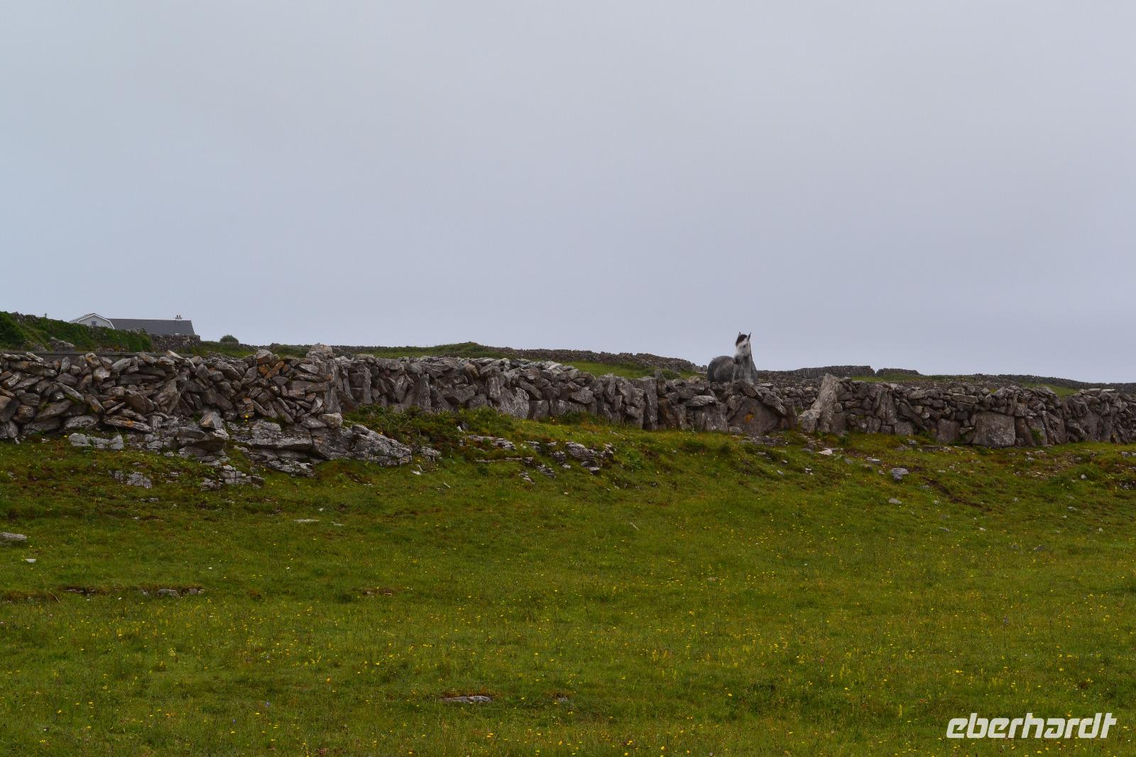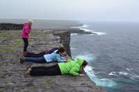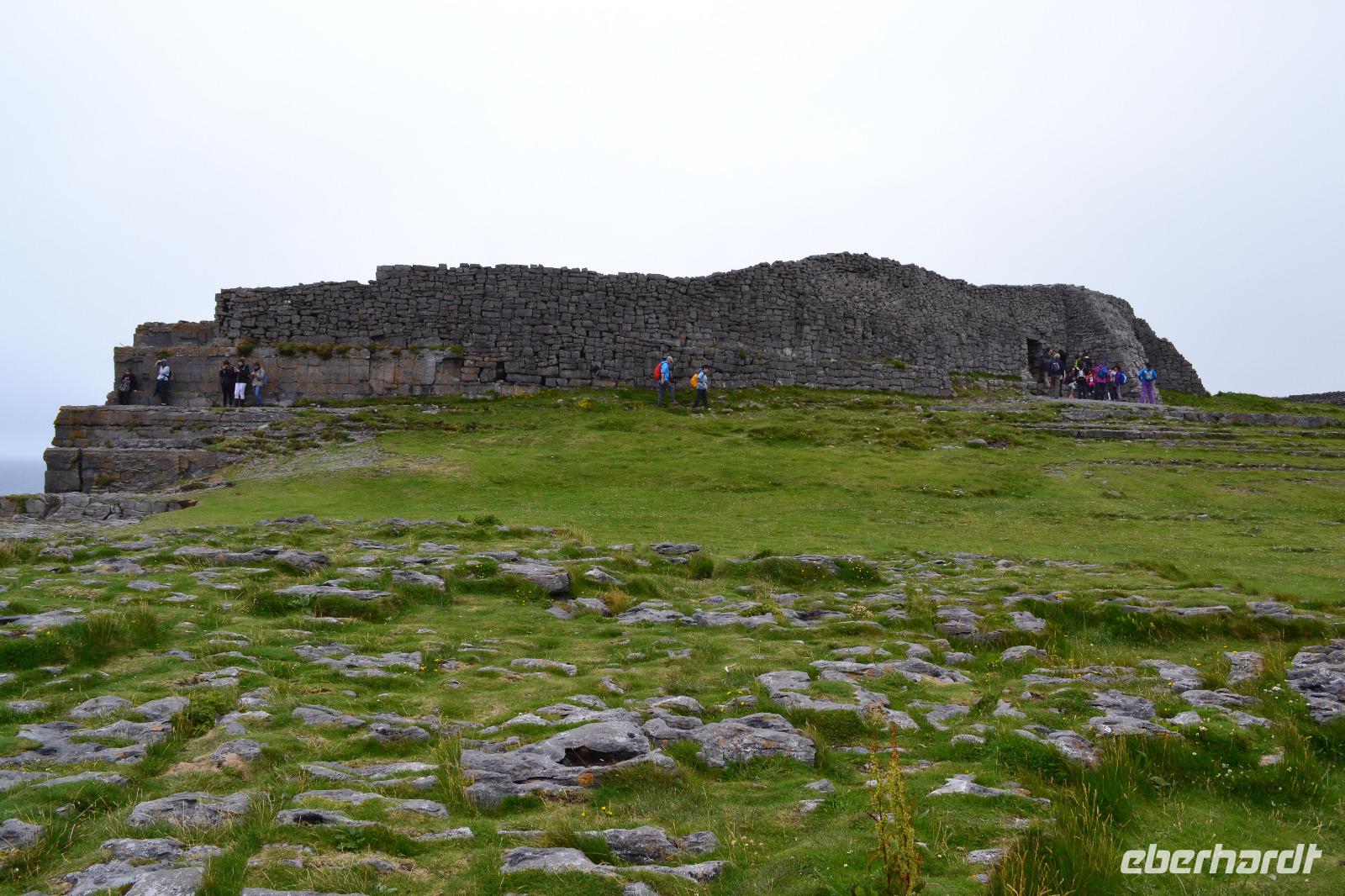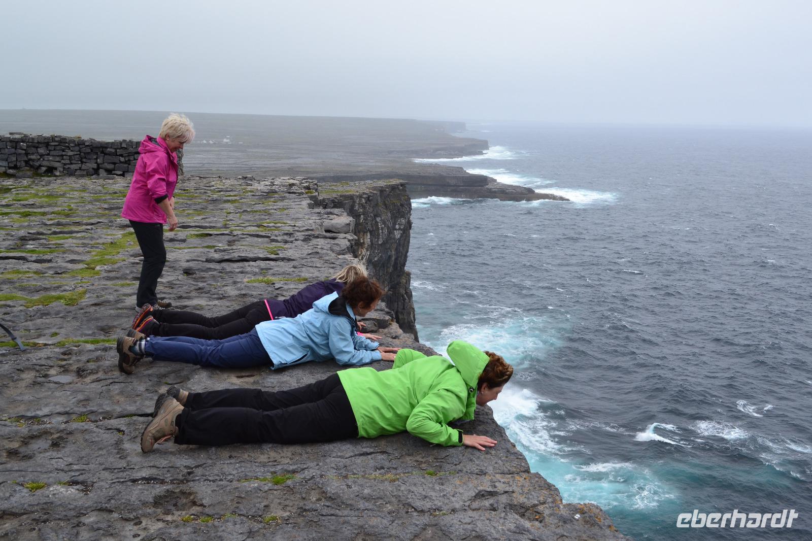 In der Bucht von Galway liegen die Aran Islands. Die größte der drei Inseln, Inishmore, ist unser heutiges Ausflugsziel. Wieder ein banger Blick auf den Wetterbericht: kein Regen. Wir starten nach dem Frühstück in Richtung Rossaveel, wo wir die Fähre nach Kilronan besteigen. 45 Minuten dauert die Überfahrt. Ein bisschen springt das Boot schon auf und ab auf den Wellen. Wir bleiben da lieber unter Deck. Unsere Wanderung führt entlang der Nordküste. Zunächst laufen wir entlang der kaum befahrenen Straße bis wir auf einen Feldweg abbiegen. Unterwegs besichtigen wir kurz Kirians Kapelle, die Überreste einer kleiner Kirche, welche St. Kirian, Gründer von Clonmacnoise, gestiftet haben soll. Die Mittagspause machen wir am Seal Viewpoint. Und tatsächlich: immer wieder tauchen die Köpfe von Seehunden aus dem Wasser auf und beäugen uns misstrauisch. Als das Wasser immer mehr zurückgeht, beginnt der geräuschvolle Kampf um die besten Liegeplätze auf den Felsen. Seehunde haben halt keine Handtücher. Wir setzen unsere Wanderung fort und erreichen schließlich unser Ziel: Dun Aengus. Wenig ist von den Erbauern des alten Ringforts bekannt. Wie lebten sie? Vor wem versuchten sie sich hier zu schützen? Auch der ursprüngliche Name des Bauwerks ist unbekannt. Dun Aengus heißt es erst seit dem 20. Jahrhundert. Das halbkreisförmige Fort wird an der offenen Seite nur vom Meer begrenzt. 100 m geht es in die Tiefe. Wer mutig genug ist, kann auf dem Bauch liegend hinunter in den Abgrund schauen und sehen, wie die tosenden Wellen gegen die Klippen schlagen. Vom Besucherzentrum werden wir mit zwei Kleinbussen zur Fähre gebracht und kehren über Rossaveel in unser Hotel in Leenane zurück, wo schon das Abendessen auf uns wartet.