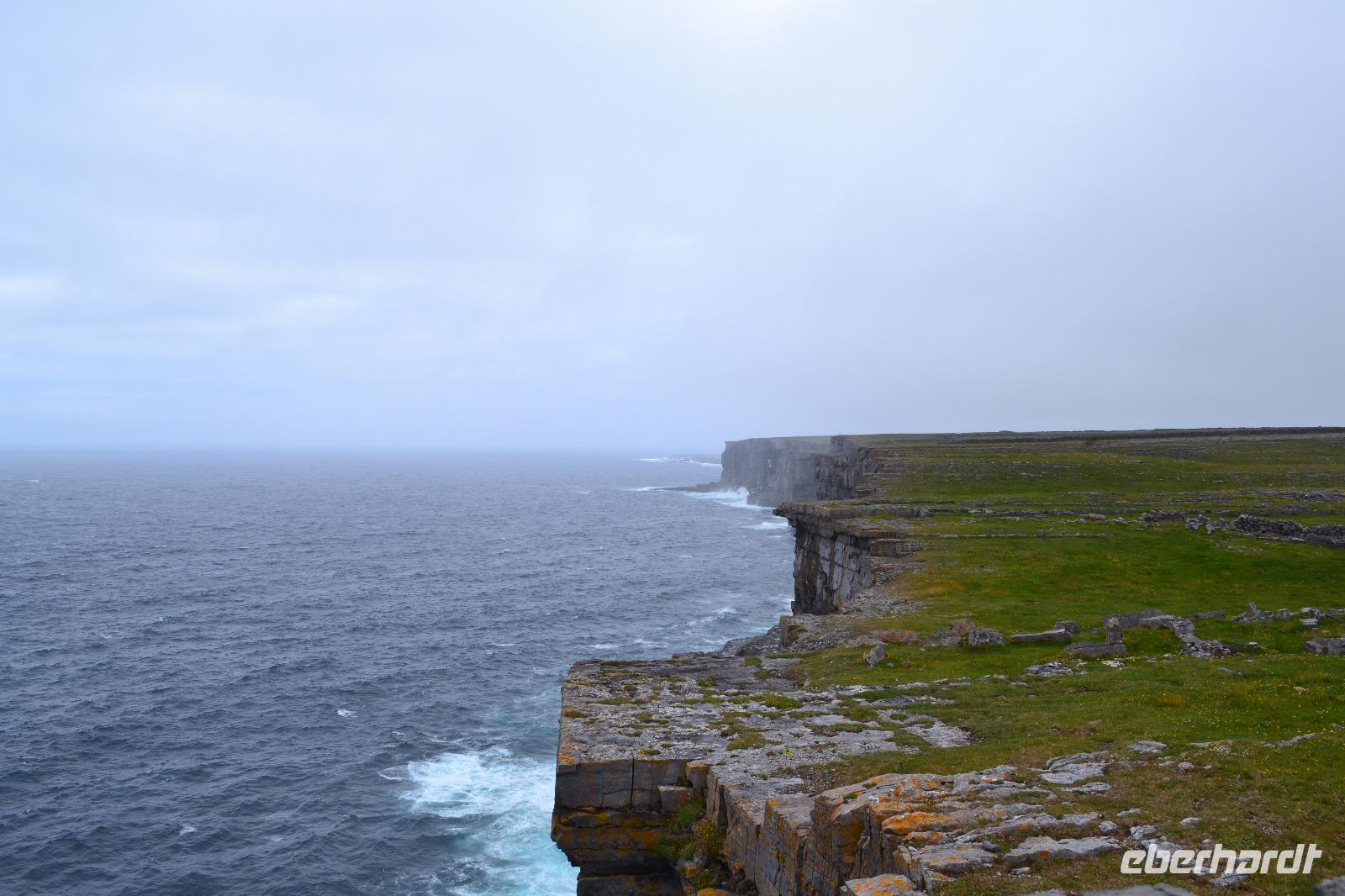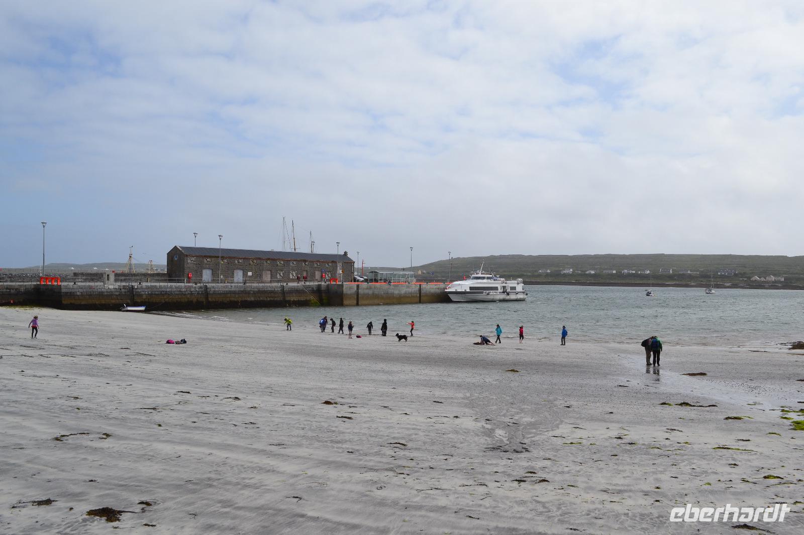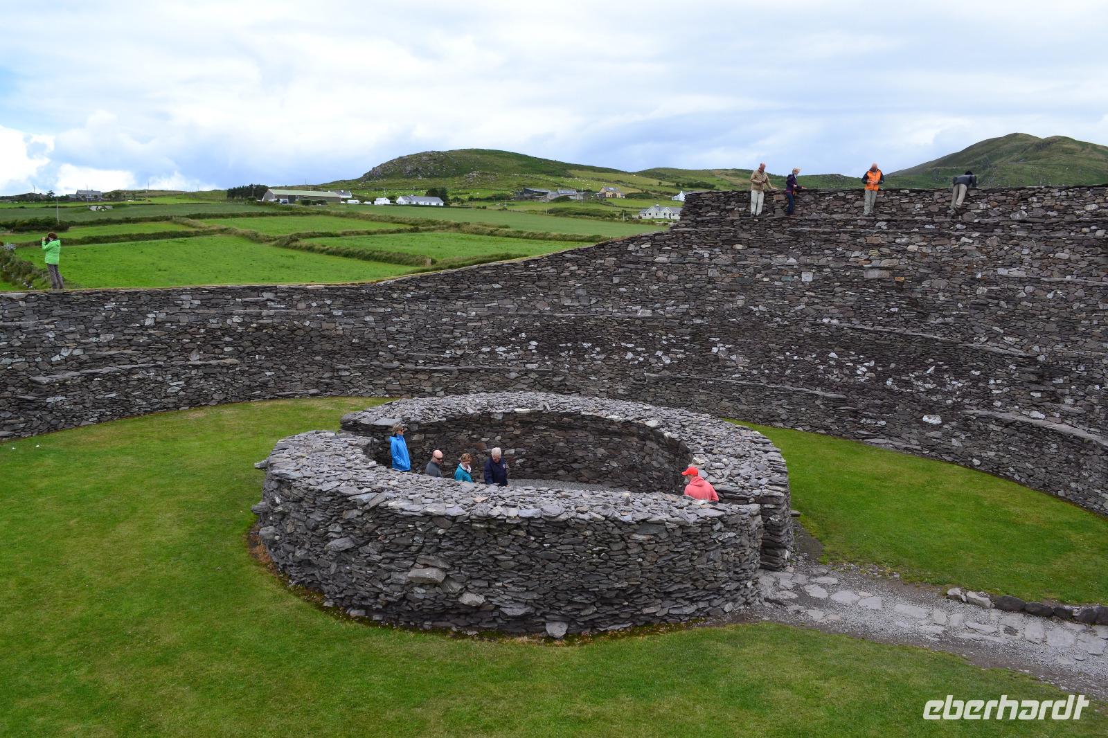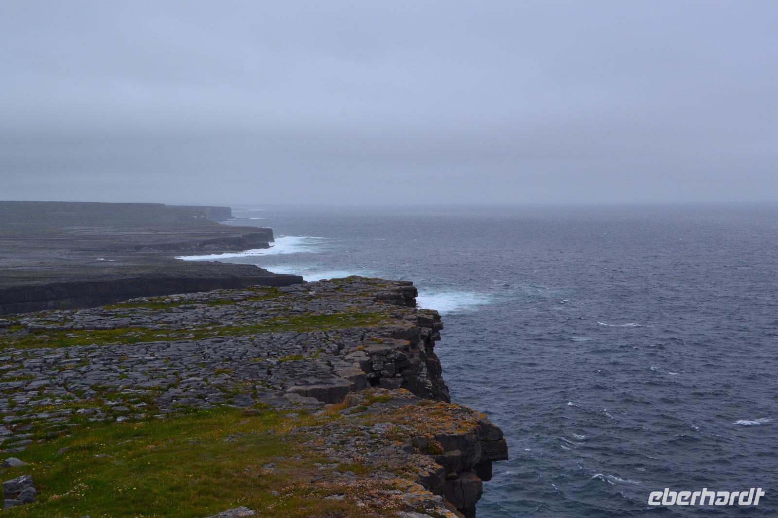 In der Bucht von Galway liegen die Aran Islands. Die größte der drei Inseln, Inishmore, ist unser heutiges Ausflugsziel. Wieder ein banger Blick auf den Wetterbericht: kein Regen. Wir starten nach dem Frühstück in Richtung Rossaveel, wo wir die Fähre nach Kilronan besteigen. 45 Minuten dauert die Überfahrt. Ein bisschen springt das Boot schon auf und ab auf den Wellen. Wir bleiben da lieber unter Deck. Unsere Wanderung führt entlang der Nordküste. Zunächst laufen wir entlang der kaum befahrenen Straße bis wir auf einen Feldweg abbiegen. Unterwegs besichtigen wir kurz Kirians Kapelle, die Überreste einer kleiner Kirche, welche St. Kirian, Gründer von Clonmacnoise, gestiftet haben soll. Die Mittagspause machen wir am Seal Viewpoint. Und tatsächlich: immer wieder tauchen die Köpfe von Seehunden aus dem Wasser auf und beäugen uns misstrauisch. Als das Wasser immer mehr zurückgeht, beginnt der geräuschvolle Kampf um die besten Liegeplätze auf den Felsen. Seehunde haben halt keine Handtücher. Wir setzen unsere Wanderung fort und erreichen schließlich unser Ziel: Dun Aengus. Wenig ist von den Erbauern des alten Ringforts bekannt. Wie lebten sie? Vor wem versuchten sie sich hier zu schützen? Auch der ursprüngliche Name des Bauwerks ist unbekannt. Dun Aengus heißt es erst seit dem 20. Jahrhundert. Das halbkreisförmige Fort wird an der offenen Seite nur vom Meer begrenzt. 100 m geht es in die Tiefe. Wer mutig genug ist, kann auf dem Bauch liegend hinunter in den Abgrund schauen und sehen, wie die tosenden Wellen gegen die Klippen schlagen. Vom Besucherzentrum werden wir mit zwei Kleinbussen zur Fähre gebracht und kehren über Rossaveel in unser Hotel in Leenane zurück, wo schon das Abendessen auf uns wartet.