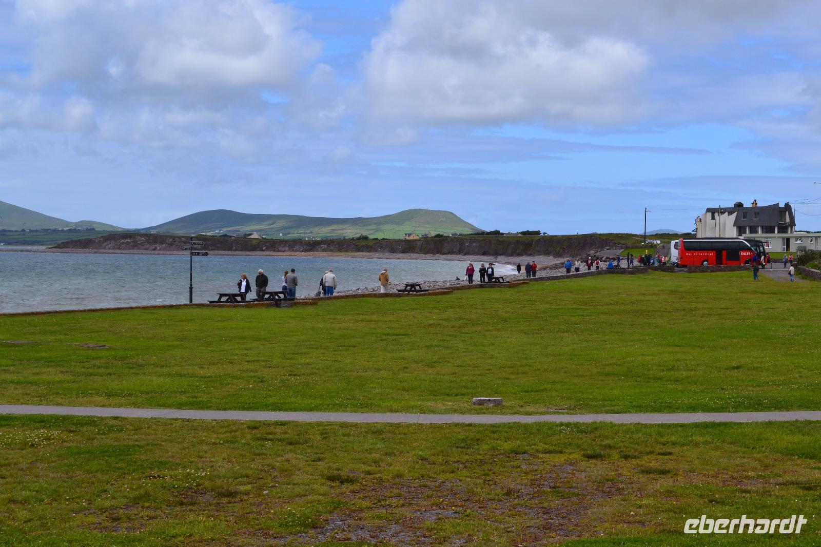 Das Wetter hält und so machen wir uns nach dem Frühstück frohen Mutes auf den Weg. Zunächst besichtigen wir den Muckross Park im Killarney Nation Park und bewundern die wunderschönen Bäume und Pflanzen. Vor allem das riesige Mammutblatt und die vielen Rhododendren haben es den Gästen angetan. Danach starten wir auf den „Ring of Kerry", d. h. wir werden die Iveragh-Halbinsel einmal komplett umrunden. Dabei genießen wir nicht nur die Aussicht auf das Meer, sondern auch auf den höchsten Berg Irlands, den 1041 m hohen Carrantuohill. In Killorglin ist unser erster Zwischenstopp. Jedes Jahr im August findet hier das Volksfest „King Puck Fair" statt, bei dem ein wild lebender Ziegenbock gefangen, auf dem Marktplatz in einen Käfig gesperrt und zum König des Festes erhoben wird. Er wird während der Feierlichkeiten fürstlich bewirtet und anschließend wieder in die Freiheit entlassen. Ob es jemals einen Ziegenbock gegeben hat, der sich im darauffolgenden Jahr freiwillig erneut hat fangen lassen, ist jedoch nicht bekannt. Wir durchqueren Cahersiveen und halten am Cahergall Ringfort, dessen mächtige Mauern wir sogar erklimmen können. In der Mittagspause in Waterville wandern wir auf den Spuren von Charlie Chaplin, der hier gerne seinen Urlaub verbrachte. Auf dem Weg zum Coomakista Pass können wir dank des herrlichen Wetters in der Ferne die hoch aufragenden Felsen von Skellig Michael sehen. Auf diese Insel hat sich Luke Skywalker ins Exil zurückgezogen. In der Nähe von Moll's Gap liegt die Kissane Sheep Farm. Bei einem Besuch beobachten und lernen wir nicht nur, wie ein Schäfer mit seinen Hunden die Herde zusammentreibt, sondern schauen auch beim Scheren eines Schafes zu. Unglaublich, wieviel Wolle so ein einzelnes Schaf mit sich herumträgt! Auf dem Rückweg machen wir noch einen Photostopp am Ladies View und können die Seen des Killarney National Park von oben betrachten. In Killarney schließt sich dann der Kreis und wir fahren zurück zu unserem Hotel in Tralee.