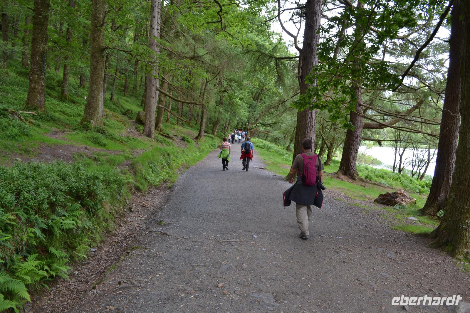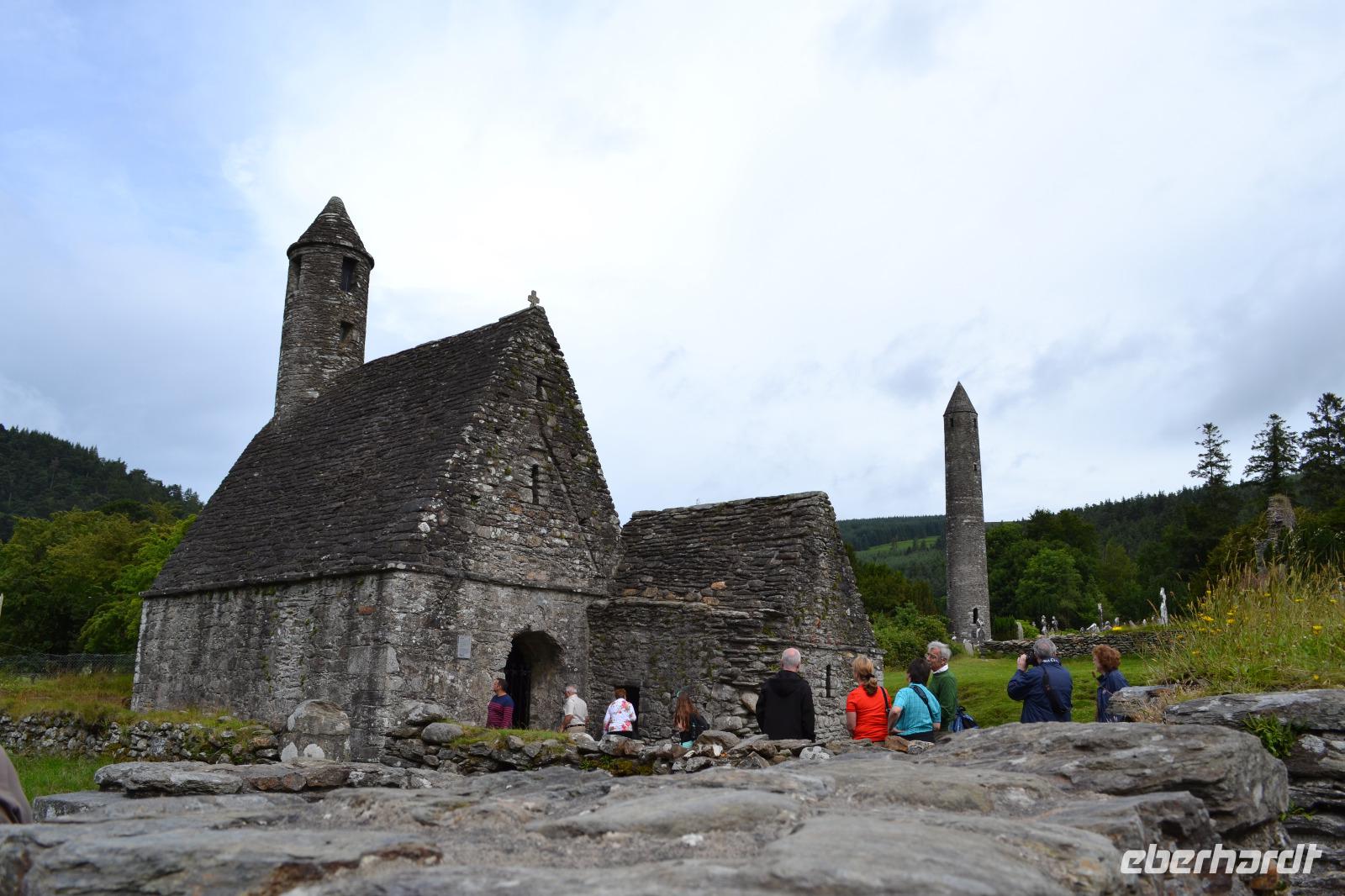 Der vorletzte Tag stellt in gewisser Weise noch einmal eine Zusammenfassung unserer Reise dar, sowohl was das Wetter als auch unsere Ausflugsziele anbelangt. Auf dem Programm stehen unsere letzte Wanderung, der Besuch einer alten Klostersiedlung und ein Spaziergang durch eine Parkanlage. Los geht es im Glendalough National Park. Von Fiona werden wir nach einer kurzen Filmvorführung durch die frühchristliche Anlage geführt, die im 6. Jh. von St. Kevin gegründet wurde. Wir sehen noch einmal einen Rundturm, die Ruinen der Kathedrale und die kleinere, zweistöckige Kirche, genannt Kevin's Kitchen. Hier dürfen wir sogar mit einer Gesangseinlage die Akustik testen. Die anschließende Wanderung entlang des Lower und des Upper Lake führt uns bis zum ehemaligen Miner's Village, den Überresten einer längst geschlossenen Bleimine. Nun hat uns auch der Regen wieder eingeholt, doch es lässt sich aushalten. Wir laufen am Ufer entlang zurück zum Upper Lake, wo wir bei Tee und Kaffee unsere Mittagspause einlegen. Am Nachmittag fahren wir zum Powerscourt Estate, dessen Geschichte bis ins 13. Jahrhundert zurückreicht, und besichtigen die Powerscourt Gardens, eine der schönsten Parkanlagen in Irland. Die Wolken verziehen sich sogar im Laufe unseres Aufenthalts und wir haben Gelegenheit die Anlagen bei strahlendem Sonnenschein zu bewundern.