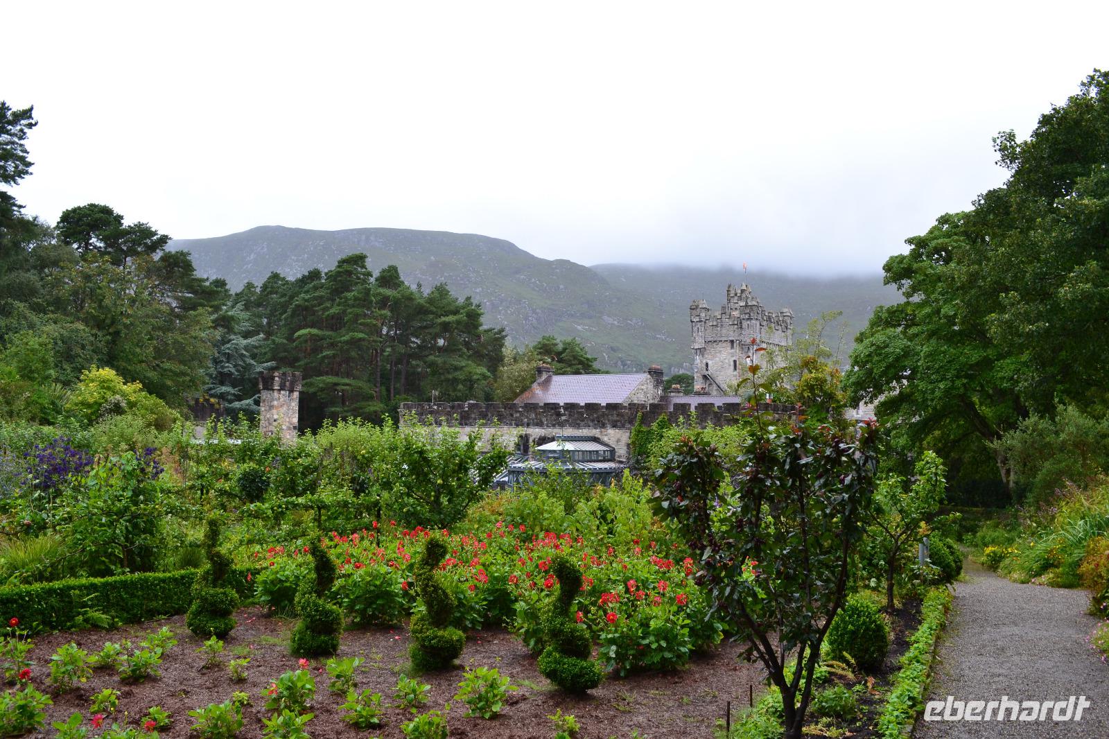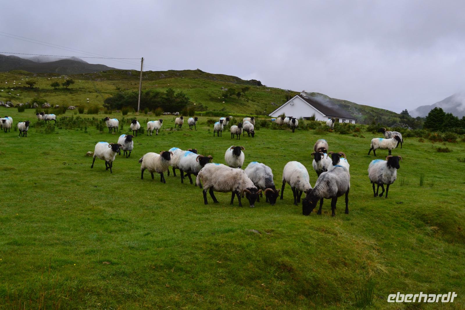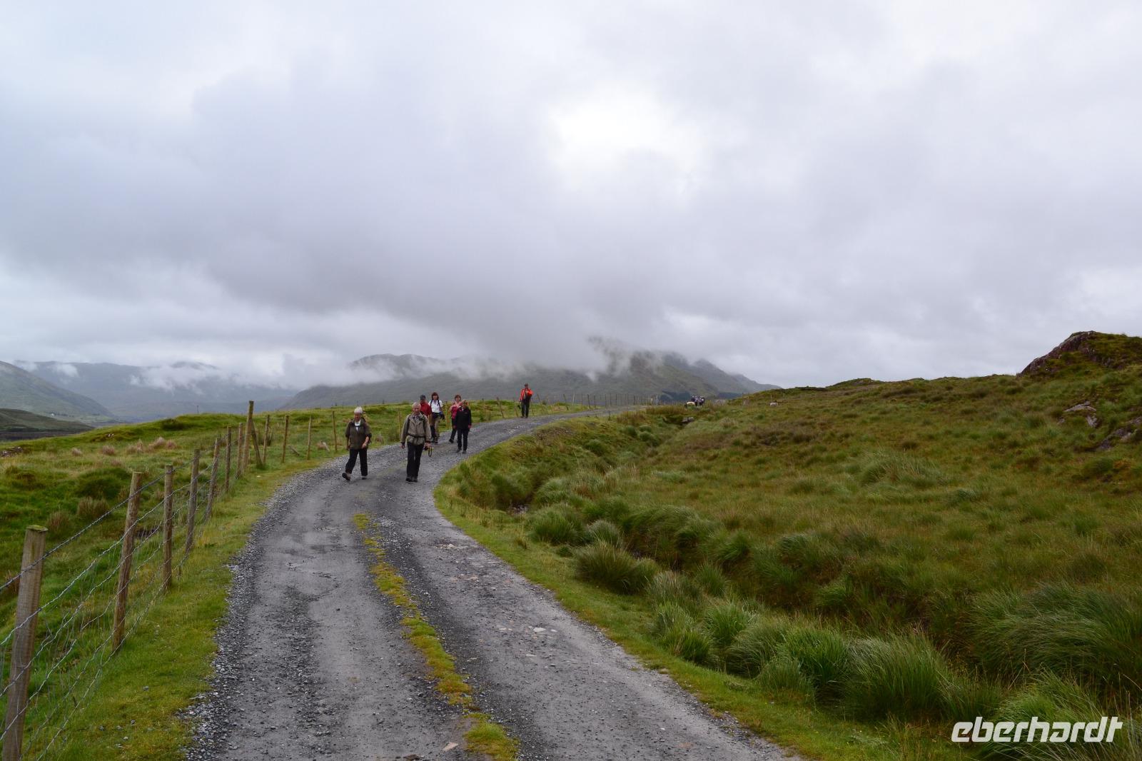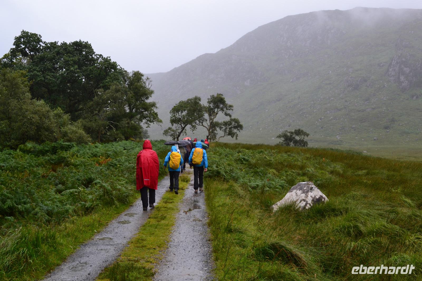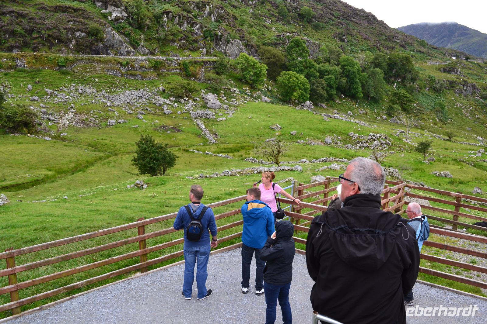 Nach dem Frühstück fahren wir nur ein paar Minuten mit dem Bus zum Ausgangspunkt unserer Wanderung mitten im Nirgendwo. Der Weg führt zunächst an einer Schaffarm vorbei entlang des Killary Harbour. Schon nach einer halben Stunde wähnen wir uns nicht mehr in Irland, sondern in Norwegen. Wir müssen uns ein bisschen durch Pfützen und die Midges hindurchkämpfen, werden aber mit einer atemberaubenden Landschaft belohnt. An der Mündung zum Atlantik wartet unser Bus auf uns. Im Connemara National Park machen wir Mittagspause und besichtigen das Torfmuseum. Es vermittelt sehr anschaulich das beschwerliche Leben der Bauern in Connemara im 19. Jahrhundert. Dann geht es auch schon zur Kylemore Abbey, der wahrscheinlich bekanntesten Sehenswürdigkeit Connemaras. Ursprünglich ab 1867 von der Familie Henry als Schloss erbaut, kauften die Benediktinerinnen 1920 das Gebäude und zogen mit ihrer Abtei aus dem Exil in Belgien hierher um. Das internationale Mädcheninternat der Abtei musste 2010 aus Kostengründen geschlossen werden und nun steht die Kylemore Abbey ganz im Zeichen des Tourismus. Die neugotische Kirche, das malerisch an einem See gelegenen Hauptgebäude und auch ein alter viktorianischer Garten können besichtigt werden. An Galway vorbei fahren wir am späten Nachmittag nach Gort und checken für zwei Nächte im Lady Gregory Hotel ein.