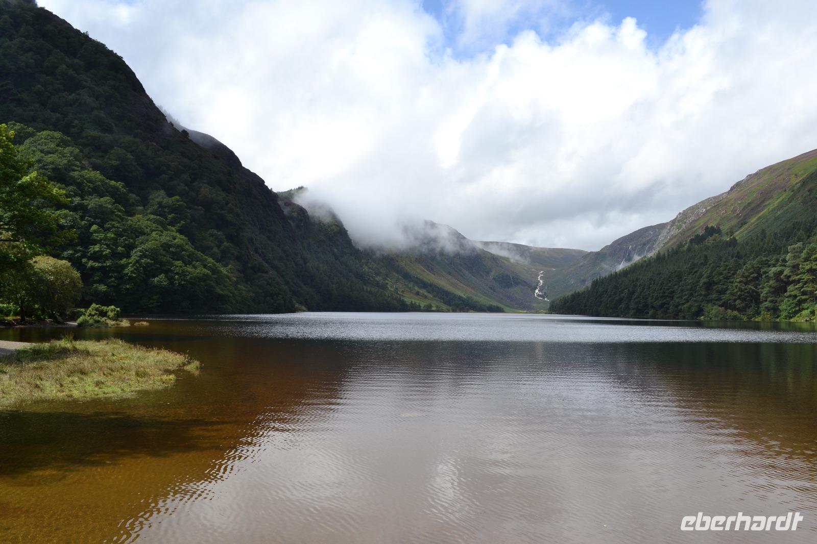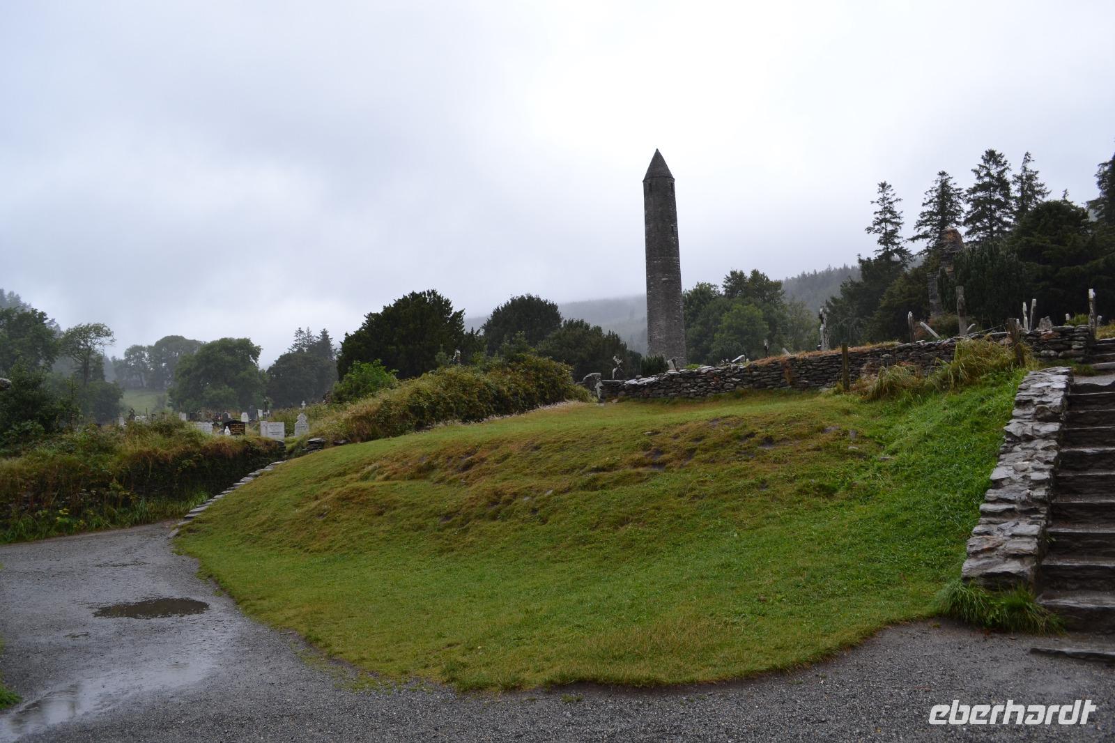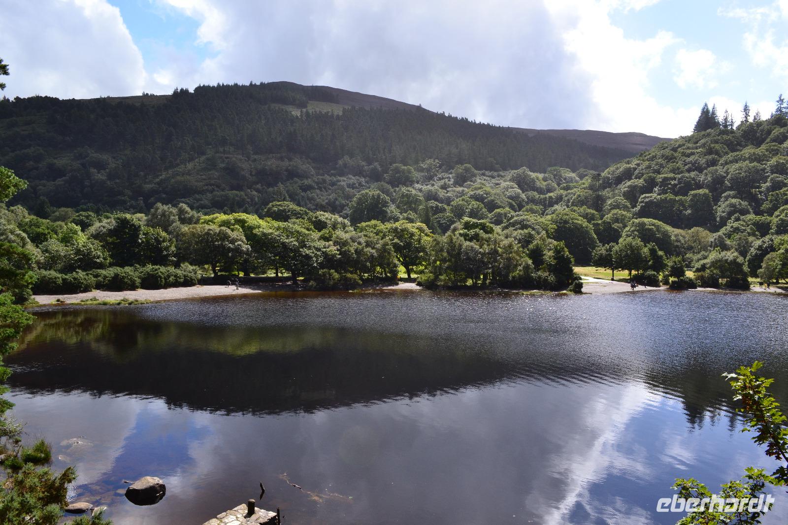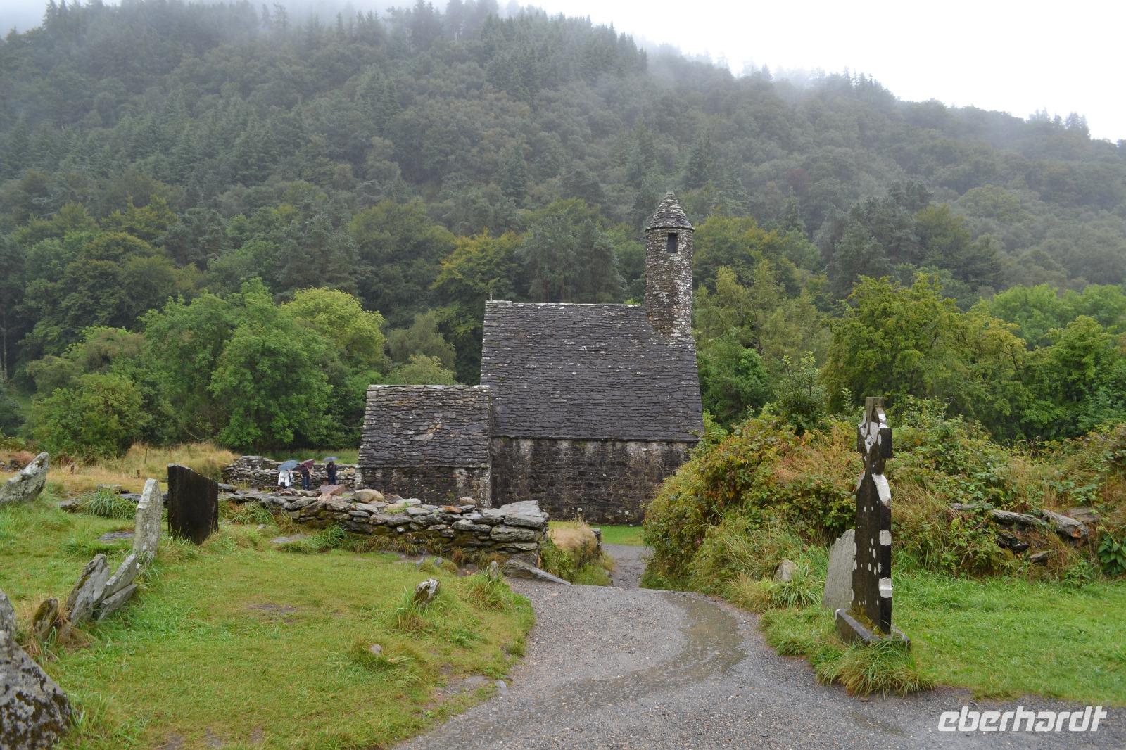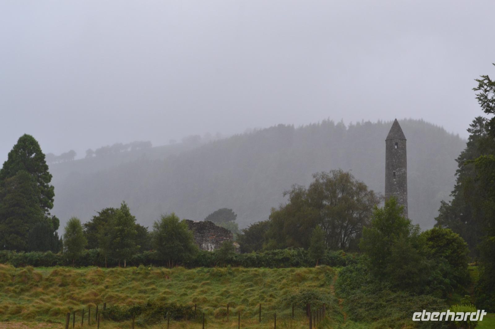 Unsere vorletzter Tag beginnt mit viel Regen, ganz so, als müsse uns der irische Wettergott noch einmal versichern, dass wir auch wirklich in Irland sind. Wir hätten es ihm auch so geglaubt. Die Stimmung ist zunächst dementsprechend verhalten, denn wir befürchten, dass unsere letzte Wanderung buchstäblich ins Wasser fällt. Gleichwohl starten wir nach Glendalough. Wir lassen uns viel Zeit mit dem Besuch des Besucherzentrums und schauen uns erstmal ganz in Ruhe einen Film über die Klosteranlagen in Glendalough an. Danach führt uns Fiona durch die frühchristliche Anlage, die im 6. Jh. vom heiligen Kevin gegründet wurde, der angeblich 120 Jahre alt geworden ist. Wir sehen noch einmal einen Rundturm, die Ruinen der Kathedrale und die kleinere, zweistöckige Kirche, genannt St Kevin's Kitchen. Es regnet immer noch. Wir ziehen uns noch einmal ins Besucherzentrum zurück und studieren aufmerksam das Modell der Klostersiedlung und des Rundturms. Ich entschließe mich trotz des Regens, wenigstens etwas mehr als die Hälfte der Strecke zu wandern. Als alle am Treffpunkt erscheinen, regnet es auch schon nicht mehr ganz so stark, und als wir den Upper Lake erreichen hört der Regen ganz auf und wie durch ein Wunder kommt die Sonne hervor und badet das Tal der zwei Seen in einem goldenen Licht. Ob dies doch ein heiliger Ort ist? Zum Abschluss des Tages und des offiziellen Programms fahren wir zum Powerscourt Estate, dessen Geschichte bis ins 13. Jahrhundert zurückreicht, und besichtigen die Powerscourt Gardens, eine der wohl schönsten Parkanlagen in Irland.