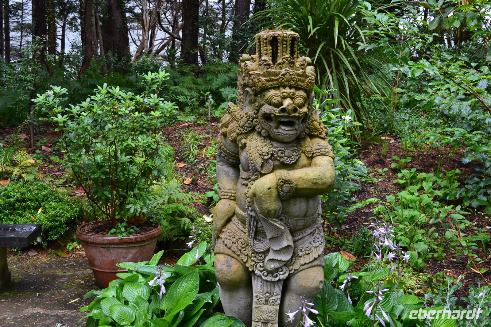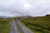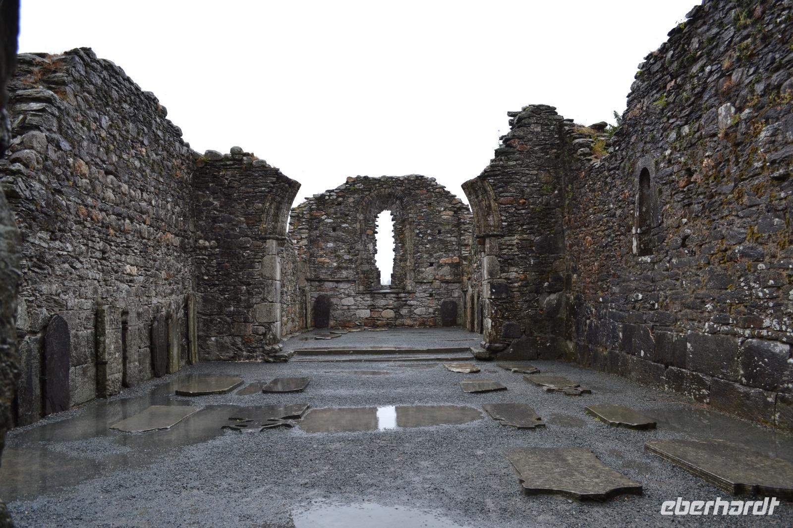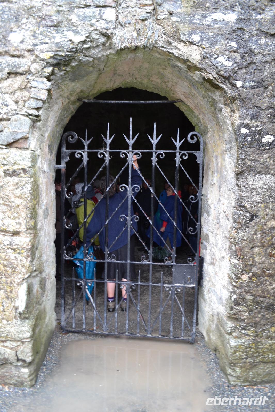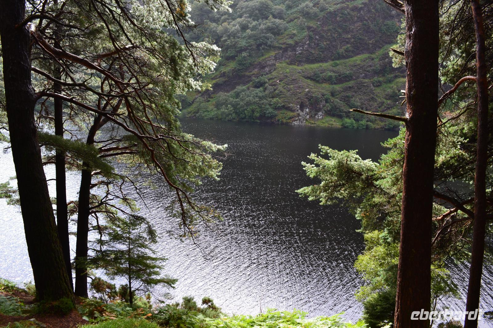 Unsere vorletzter Tag beginnt mit viel Regen, ganz so, als müsse uns der irische Wettergott noch einmal versichern, dass wir auch wirklich in Irland sind. Wir hätten es ihm auch so geglaubt. Die Stimmung ist zunächst dementsprechend verhalten, denn wir befürchten, dass unsere letzte Wanderung buchstäblich ins Wasser fällt. Gleichwohl starten wir nach Glendalough. Wir lassen uns viel Zeit mit dem Besuch des Besucherzentrums und schauen uns erstmal ganz in Ruhe einen Film über die Klosteranlagen in Glendalough an. Danach führt uns Fiona durch die frühchristliche Anlage, die im 6. Jh. vom heiligen Kevin gegründet wurde, der angeblich 120 Jahre alt geworden ist. Wir sehen noch einmal einen Rundturm, die Ruinen der Kathedrale und die kleinere, zweistöckige Kirche, genannt St Kevin's Kitchen. Es regnet immer noch. Wir ziehen uns noch einmal ins Besucherzentrum zurück und studieren aufmerksam das Modell der Klostersiedlung und des Rundturms. Ich entschließe mich trotz des Regens, wenigstens etwas mehr als die Hälfte der Strecke zu wandern. Als alle am Treffpunkt erscheinen, regnet es auch schon nicht mehr ganz so stark, und als wir den Upper Lake erreichen hört der Regen ganz auf und wie durch ein Wunder kommt die Sonne hervor und badet das Tal der zwei Seen in einem goldenen Licht. Ob dies doch ein heiliger Ort ist? Zum Abschluss des Tages und des offiziellen Programms fahren wir zum Powerscourt Estate, dessen Geschichte bis ins 13. Jahrhundert zurückreicht, und besichtigen die Powerscourt Gardens, eine der wohl schönsten Parkanlagen in Irland.