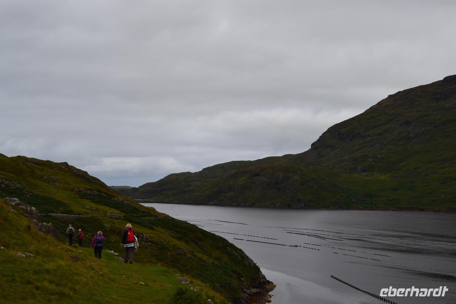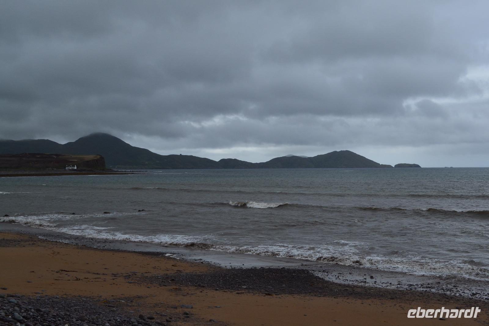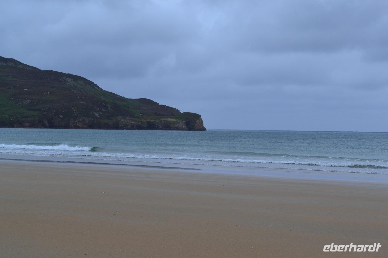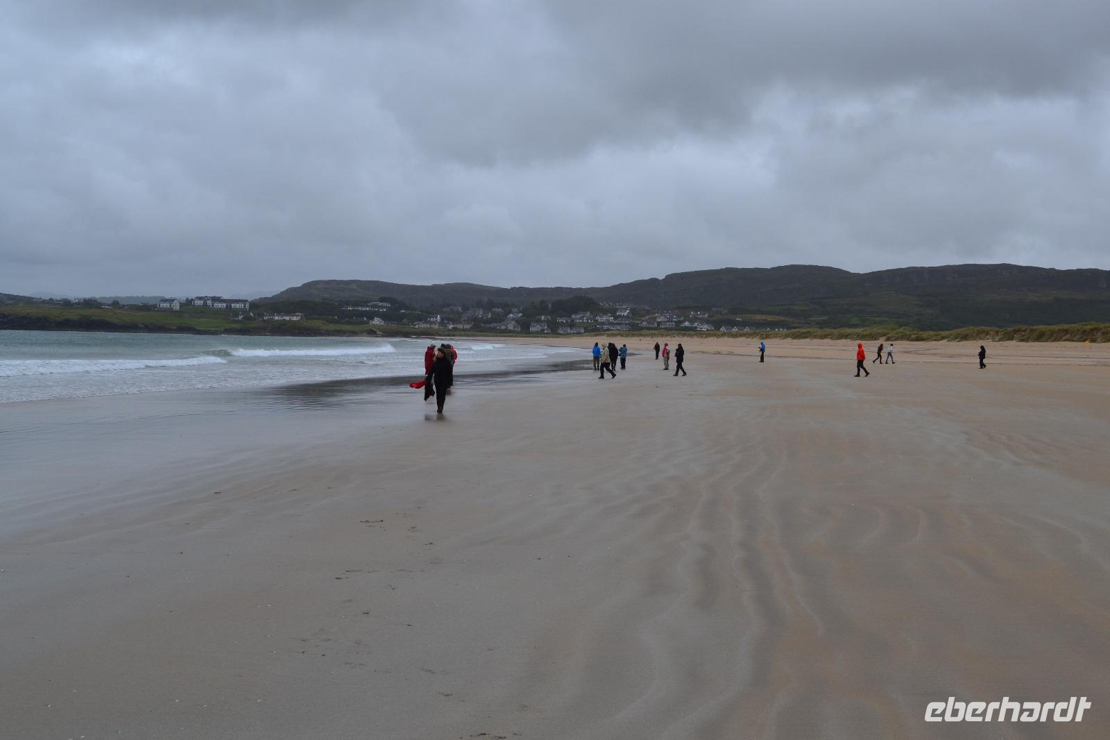 Nur 30 min dauert es mit unserem Bus, bis wir den Glenveagh National Park erreichen. Dort sind wir die ersten Besucher. Nach einer Filmvorführung über die Geschichte des Parks besichtigen wir zunächst das Glenveagh Castle, das in der Mitte des 18. Jahrhunderts von dem reichen irischen Geschäftsmann und Landspekulanten John George Adair im schottischen Baronialstil erbaut wurde. Auf einer kleinen Halbinsel gelegen hatten die Bewohner einen herrlichen Blick über den See. Sogar einen Pool gibt es hier! So wundert es nicht, dass sich hier im Laufe der Zeit viele bekannte Stars die Klinke in die Hand gaben, z. B. Greta Garbo und Yehudi Menuhin. Unsere Hoffnung auf einen Wetterumschwung während des Besuchs erfüllten sich nicht, und so müssen wir unsere erste Wanderung im Regen absolvieren. Das ist aber gar nicht so schlimm, denn so bleiben wir von den fiesen kleinen irischen Mücken, den Midges, verschont. Entlang des Sees wandern wir bis zu einer kleinen Hütte, wo wir unsere Mittagspause einlegen. Eigentlich fehlt dort nur ein Feuer im Kamin um es uns so richtig gemütlich zu machen. Während die meisten Gäste zurück am Schloss aufgrund des Regens in das sehr einladende Café flüchten, mache ich mit ein paar mutigen und ausdauernden Gästen noch einen Abstecher zum Aussichtspunkt. Unten im Garten des Schlosses gibt es heute sogar irische Live-Musik. Auf dem Rückweg nach Letterkenny machen wir noch einen kurzen Abstecher in Richtung Norden. Und als wir an der Sheephaven Bay, an einem malerischen Sandstrand kurz hinter Dunfanaghy ankommen, hat sogar der Regen aufgehört! Ins Wasser hat sich aber trotzdem niemand getraut...