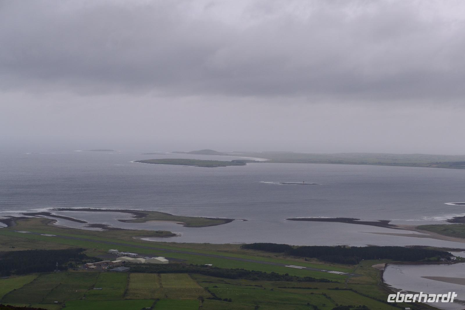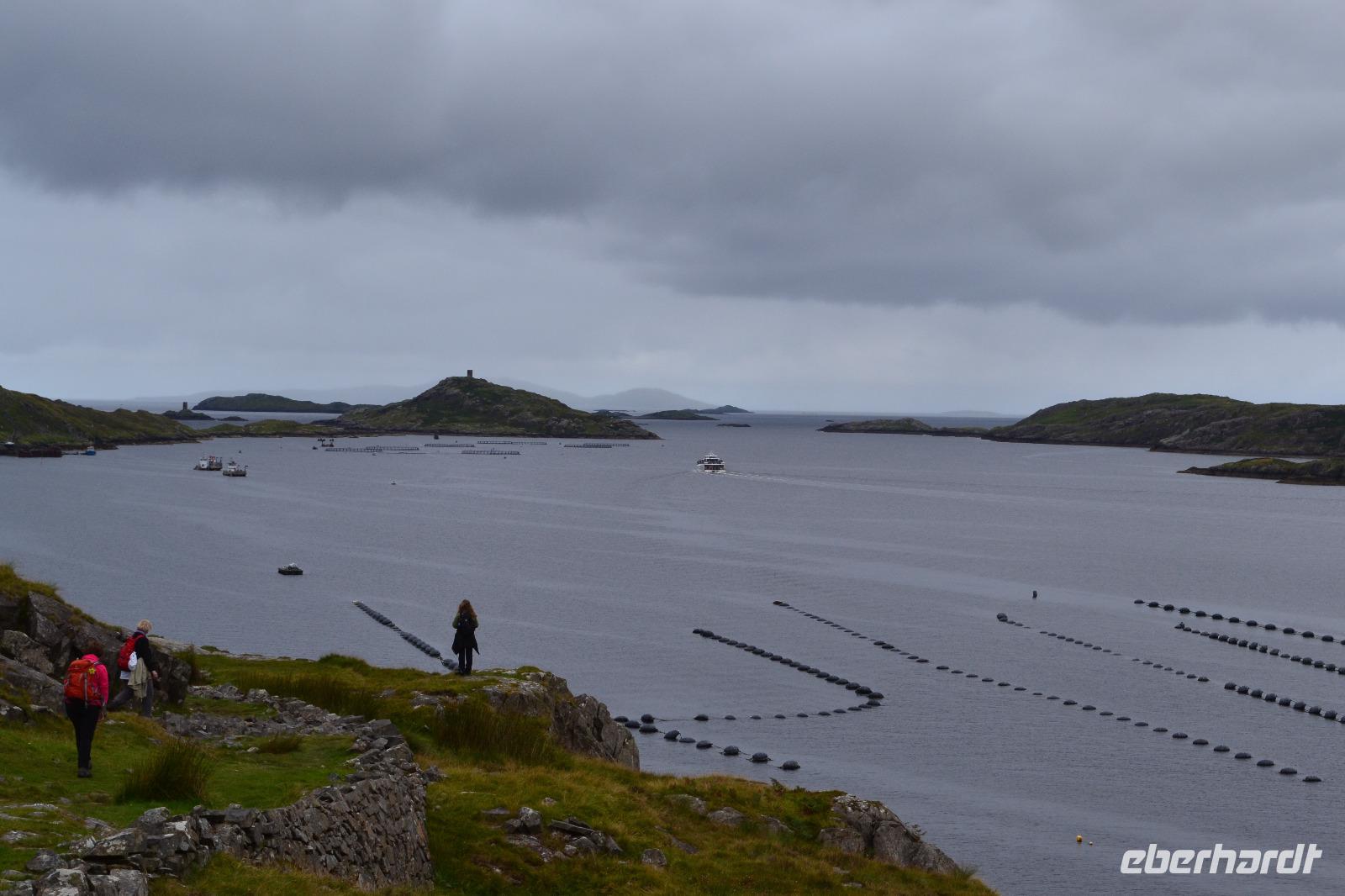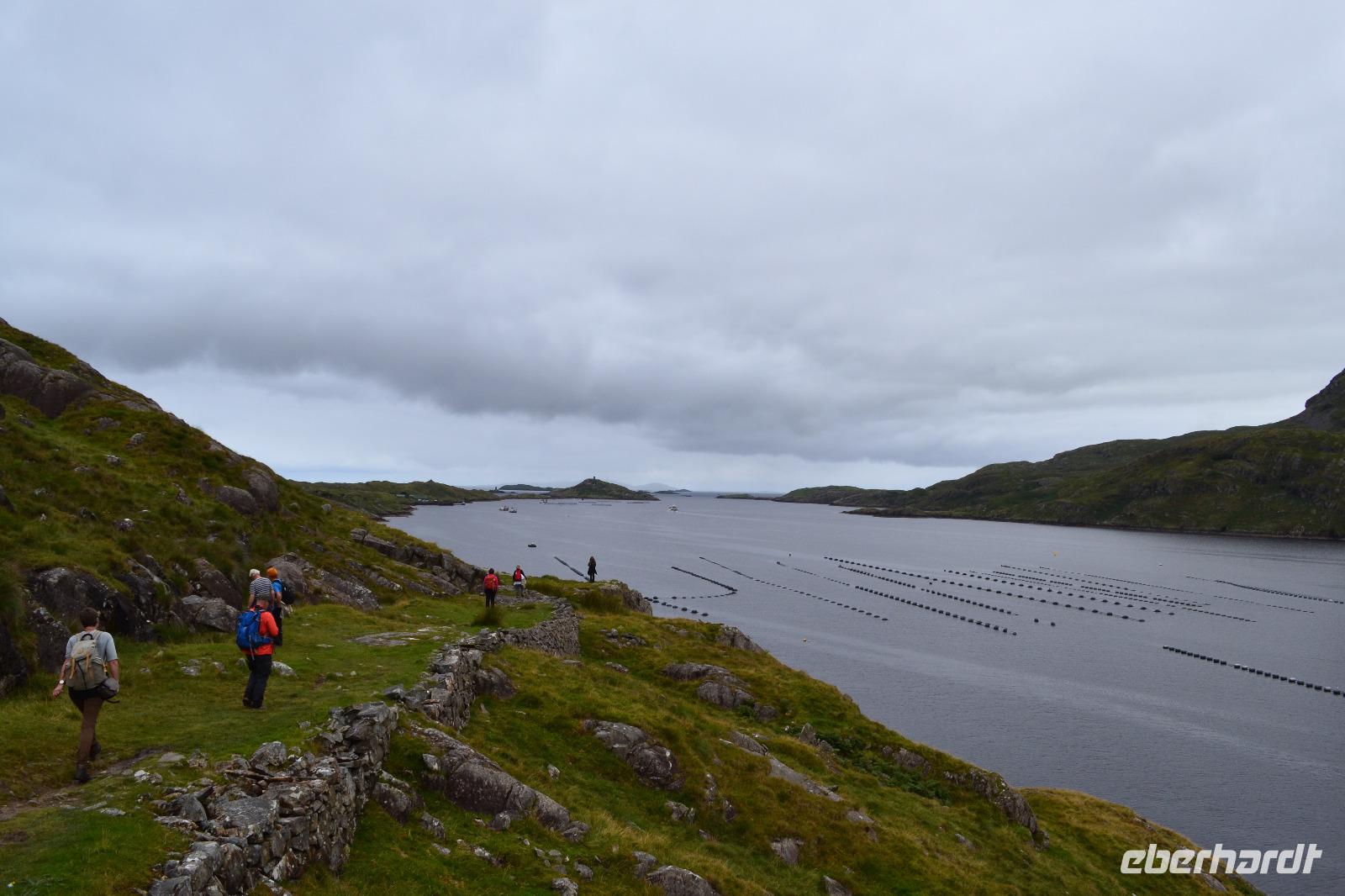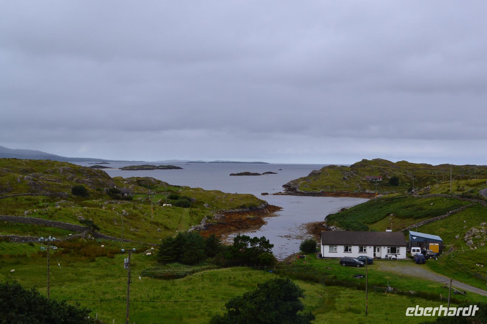 Nur 30 min dauert es mit unserem Bus, bis wir den Glenveagh National Park erreichen. Dort sind wir die ersten Besucher. Nach einer Filmvorführung über die Geschichte des Parks besichtigen wir zunächst das Glenveagh Castle, das in der Mitte des 18. Jahrhunderts von dem reichen irischen Geschäftsmann und Landspekulanten John George Adair im schottischen Baronialstil erbaut wurde. Auf einer kleinen Halbinsel gelegen hatten die Bewohner einen herrlichen Blick über den See. Sogar einen Pool gibt es hier! So wundert es nicht, dass sich hier im Laufe der Zeit viele bekannte Stars die Klinke in die Hand gaben, z. B. Greta Garbo und Yehudi Menuhin. Unsere Hoffnung auf einen Wetterumschwung während des Besuchs erfüllten sich nicht, und so müssen wir unsere erste Wanderung im Regen absolvieren. Das ist aber gar nicht so schlimm, denn so bleiben wir von den fiesen kleinen irischen Mücken, den Midges, verschont. Entlang des Sees wandern wir bis zu einer kleinen Hütte, wo wir unsere Mittagspause einlegen. Eigentlich fehlt dort nur ein Feuer im Kamin um es uns so richtig gemütlich zu machen. Während die meisten Gäste zurück am Schloss aufgrund des Regens in das sehr einladende Café flüchten, mache ich mit ein paar mutigen und ausdauernden Gästen noch einen Abstecher zum Aussichtspunkt. Unten im Garten des Schlosses gibt es heute sogar irische Live-Musik. Auf dem Rückweg nach Letterkenny machen wir noch einen kurzen Abstecher in Richtung Norden. Und als wir an der Sheephaven Bay, an einem malerischen Sandstrand kurz hinter Dunfanaghy ankommen, hat sogar der Regen aufgehört! Ins Wasser hat sich aber trotzdem niemand getraut...