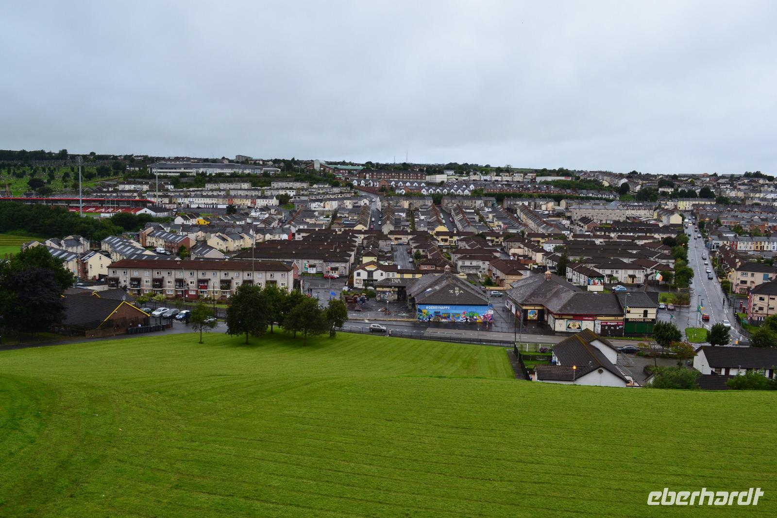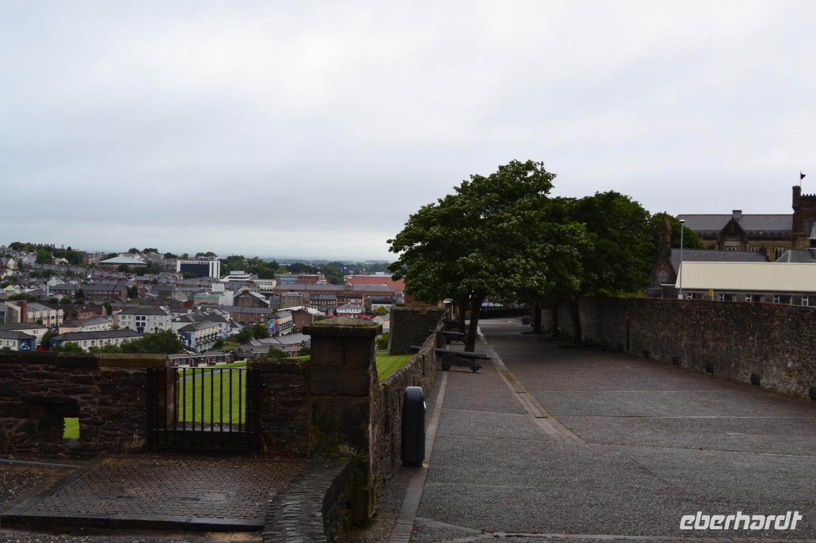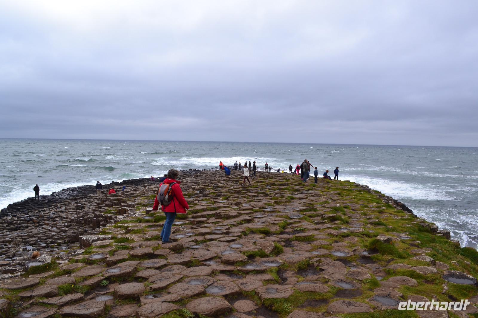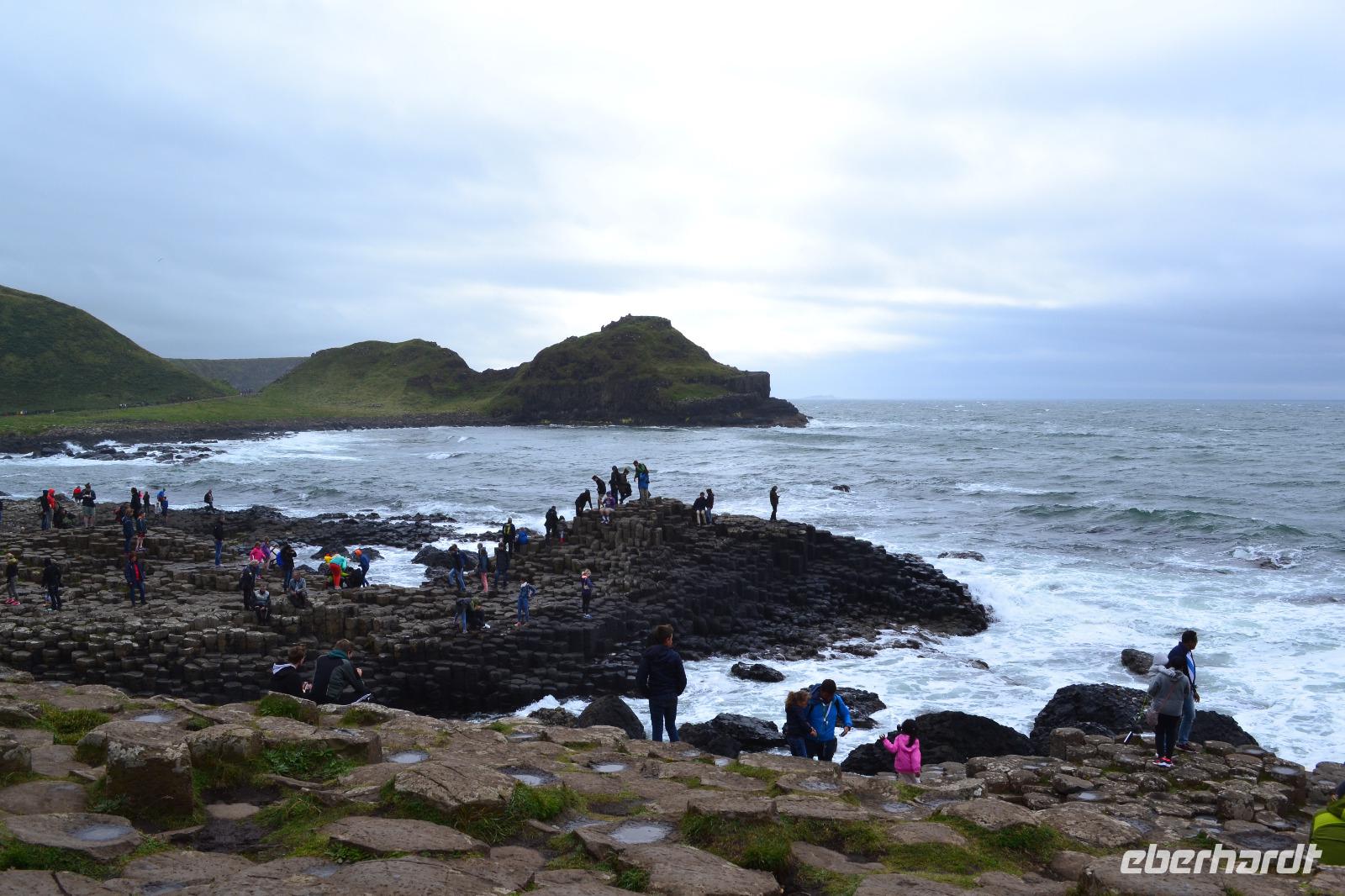 Unseren vierten Tag verbringen wir in Nordirland. Ein Spaziergang auf der Stadtmauer in Derry lässt uns zunächst tief in die irisch-nordirische Geschichte eintauchen. Es waren vor allem zwei Ereignisse, die das kulturelle Gedächtnis der Stadtbewohner nachhaltig geprägt haben und noch heute das Zusammenleben der teils protestantischen, teils katholischen Bevölkerung bestimmen: einerseits die erfolglose Belagerung durch die Truppen Jakobs II. 1689, andererseits die Zeit der euphemistisch als "Troubles" bezeichneten Periode des Nordirlandkonflikts, der erst 1998 mit dem Karfreitagsabkommen offiziell beigelegt wurde, aber natürlich unter der Oberfläche weiterbesteht. Es bleibt z. B. abzuwarten, welche Folgen der Brexit in Nordirland haben wird. Nachdem ich dann auch den richtigen, leicht versteckten Ausgang aus dem Shopping Centre gefunden habe, können wir unsere Fahrt durch Nordirland fortsetzen. Ein echtes Kleinod ist unser nächstes Ziel: der Mussenden Temple, vom Bischof von Derry, Frederick Hervey, zunächst als Bibliothek des naheliegenden Bischofspalastes errichtet. Gleichzeitig sollte er als Rückzugsort für die verheiratete Schwester seines Cousins, Frideswide Mussenden, dienen, mit welcher der Bischof angeblich ein Verhältnis unterhielt. Leider verstarb sie mit nur 22 Jahren, so dass der Tempel später ihrem Andenken gewidmet wurde. Vom Palast sind heute nur noch die Grundmauern zu besichtigen, doch vom Tempel aus hat man einen atemberaubenden Ausblick auf den Strand und die Klippen. Nun haben wir uns aber eine Pause verdient und vor allem eine Whiskey-Verkostung! Deshalb fahren wir als nächstes die Old Bushmills Distillery an. Deren Eigentümer brennen auf der Grundlage der ältesten Lizenz Irlands, die bereits im Jahre 1608 vom König erteilt wurde. Vermutlich wurde sie an ein Vorgängerunternehmen ausgestellt, denn die heutige Brennerei in Bushmills existiert erst seit 1728. Wir müssen uns noch ein bisschen gedulden, denn bevor wir das Wasser des Lebens selbst probieren können, werden wir erst einmal ausführlich mit dessen Herstellungsprozess vertraut gemacht. Nicht weit von Bushmills entfernt befindet sich dann der Giant's Causeway. Der Riese Finn McCool erbaute ihn der Legende nach um einen Rivalen in Schottland erreichen zu können. In Wirklichkeit handelt es sich natürlich um Magma, das vor 60 Millionen Jahren durch Erdspalten nach oben gedrückt wurde und langsam abkühlte. Dabei entstanden die ca. 40.000 Basaltsäulen mit meist sechseckigem Querschnitt. Wir warten kurz ein paar Minuten im Bus und als wir dann den Eingangsbereich passieren, hat der kurze aber heftige Regenschauer auch schon wieder aufgehört, so dass wir das spektakuläre Panorama, das sich vor uns ausbreitet, ungetrübt geniessen können.