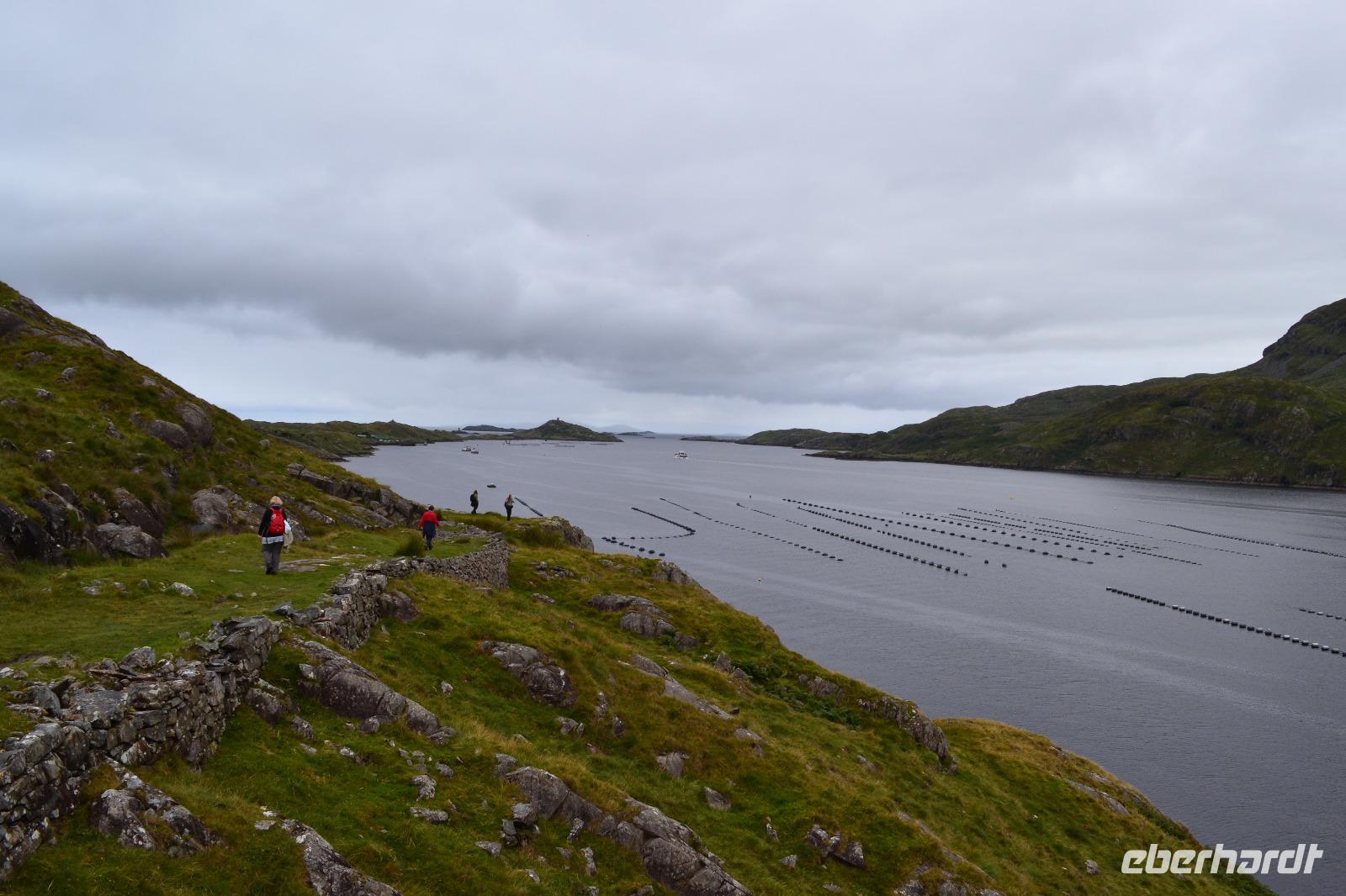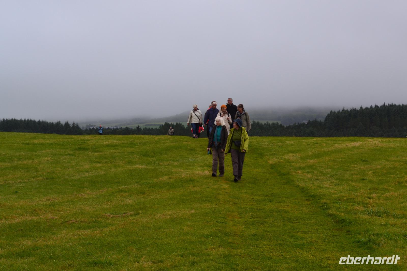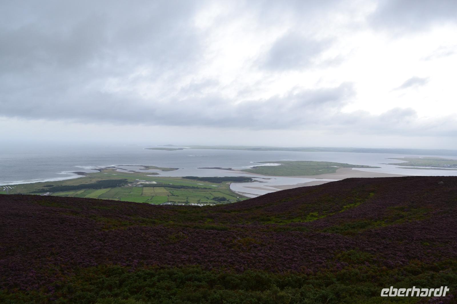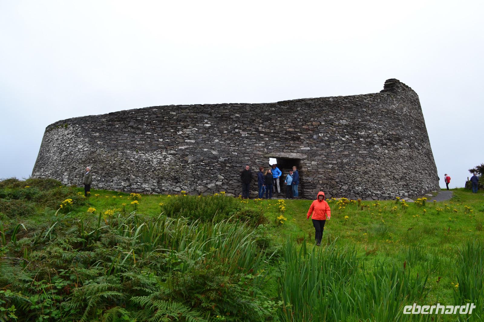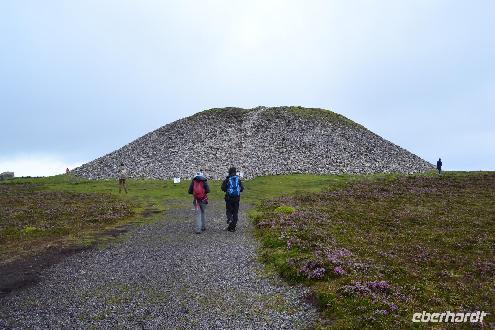 Doch so richtig beginnt unsere Reise erst am zweiten Tag, denn wir wollen schließlich hinaus in die Natur und vor allem auch wandern! Also verlassen wir Dublin in Richtung Norden, nachdem wir unsere Fahrerin Diane begrüßt haben, die uns bis zum Ende als Fahrerin immer sicher ans Ziel bringen und auch unsere Wanderungen begleiten wird. Wir beginnen mit einem Stopp auf dem Hill of Slane. Hier hat der irische Nationalheilige St. Patrick das erste Osterfeuer Irlands entzündet um den Beginn eines neuen, christlichen Zeitalters einzuläuten. Dies erzürnte allerdings den in der Nähe residierenden Hochkönig von Tara sehr. Ob dies nicht sogar die eigentlich Absicht von Patrick gewesen war, bleibt unter Historikern umstritten. Glücklicherweise nahm die Episode für ihn ein friedliches Ende, denn der oberste Druide des Hochkönigs konvertierte nach vielen Gesprächen zum Christentum. Noch heute wird jedes Jahr zur Erinnerung an dieses Ereignis ein Osterfeuer auf dem Hill of Slane entzündet. Nächster Programmpunkt ist ein Besuch im Boyne Valley. 1690 fand in diesem Tal zwischen dem abgesetzten katholischen englischen König Jakob II. und seinem Schwiegersohn, dem protestantischen Wilhelm III. von Oranien, die Schlacht am River Boyne statt. Nach der erfolglosen Belagerung Derrys waren die Truppen Jakobs II. wieder nach Süden gezogen und wurden in diesem Tal nördlich von Dublin von der protestantischen Streitmacht gestellt und geschlagen. Damit wurden auch die Hoffnungen der mehrheitlich katholischen irischen Bevölkerung auf ein Ende der protestantischen Unterdrückung vernichtet. Unser Ziel sind allerdings die drei Ganggräber im Boyne Valley: Newgrange, Knowth and Dowth. Zunächst erhalten wir im Brú na Bóinne Visitor Centre beim Besuch des Museums und im Rahmen einer Filmvorführung einen Einblick in das Leben der steinzeitlichen Bewohner und Erbauer dieser Anlagen. Vieles bleibt allerdings Spekulation, denn Aufzeichnungen oder gar ein Handbuch zur Entschlüsselung der kunstvoll in die Megalithen gemeißelten Symbole gibt es nicht. Dann fahren wir mit zwei Shuttlebussen nach Knowth, zum größten der Dolmen, den wir ganz für uns allein haben. Bei einer Führung können wir einen Blick in das Innere eines Ganggrabes werfen und später dann den Dolmen auch ersteigen, auf dem sich im 14. Jh. auch eine kleine Ansiedlung befand. Schließlich halten wir noch an den Ruinen von Monasterboice, einer alten Klostersiedlung. Monasterboice ist vor allem für die drei Hochkreuze und die Ruine des Rundturms bekannt. Mit 7,10 m ist das sog. Westkreuz sogar das höchste Kreuz in Irland. Diese Kreuze dienten nicht der Verzierung von Grabstätten, sondern den Klosterbewohnern vor allem als Sammelpunkt und Altar. Mit Hilfe der eingemeißelten bildhaften Darstellungen erklärten die Mönche der des Lesens und Schreibens unkundigen Bevölkerung die biblischen Geschichten. Die Friedhöfe der längst verfallenen alten Klöster werden übrigens immer noch genutzt, solange die Familien noch existieren. Über Monaghan fahren wir anschließend in das County Donegal, ganz im Norden von Irland, wo wir im „Station House Hotel" in Letterkenny für die nächsten drei Nächte Quartier beziehen.