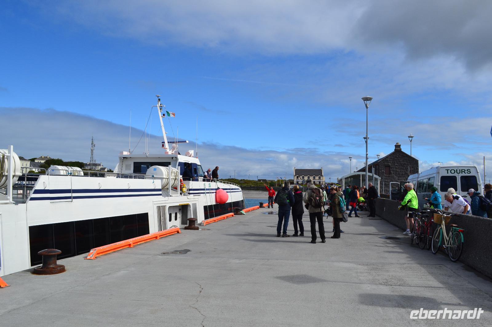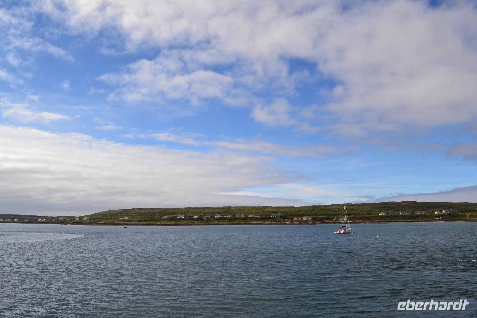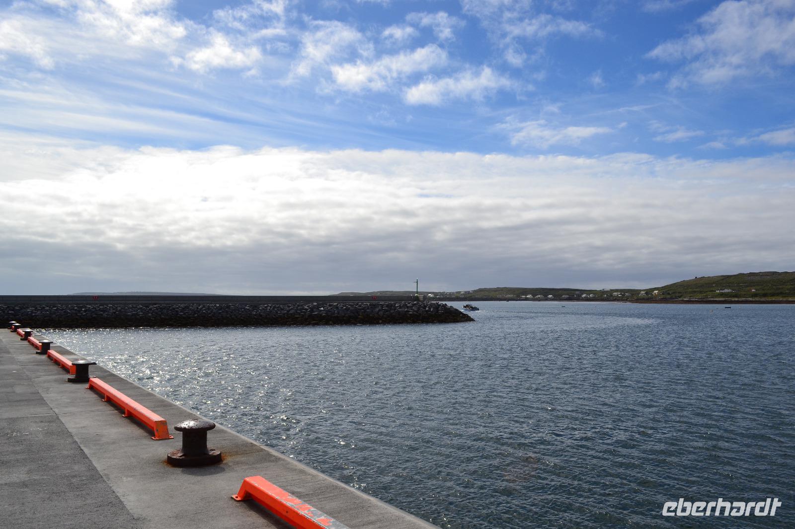 Wir werden den ganzen Tag auf Inishmore verbringen, der größten der drei Aran Islands in der Bucht von Galway. Nach dem Frühstück fahren wir nach Rossaveel, wo wir die Fähre nach Inishmore besteigen. Ungefähr 45 Minuten dauert die Überfahrt. Ankunft in Kilronan. Die Sonne lacht und ich bin viel zu warm angezogen. Sind wir noch in Irland? Ein paar ganz mutige Touristen (oder doch Einheimische?) springen sogar in Badehose in das Hafenbecken. Entlang einer kaum befahrenen Straße führt unsere heutige Wanderung entlang der Nordküste. In der Ferne können wir die Berge Connemaras sehen. Während unserer Mittagspause dann doch ein kurzer Schauer. Aber als wir die Regensachen ausgepackt haben ist schon wieder alles vorbei. Neugierig werden wir vom Wasser aus von ein paar Seehunden beäugt. Nach einer halben Stunde Pause setzen wir dann gestärkt unsere Wanderung auf einem Feldweg fort. Unser Ziel ist das alte Steinfort Dun Aenghus, das weithin sichtbar hoch auf den Klippen thront. Über die ursprünglichen Erbauer ist wie so oft in Irland wenig bekannt. Wie lebten sie? Vor wem versuchten sie sich hier oben in der Abgeschiedenheit der Insel zu schützen? Das halbkreisförmige Fort wird an der offenen Seite nur vom Meer begrenzt. An der höchsten Stelle geht es 100 m in die Tiefe. Die mutigen unter uns legen sich auf den Bauch und krabbeln bis ganz an den Rand um einen Blick hinunterzuwerfen. Diesmal kann auch ich mich überwinden und schaue hinab auf die tosenden Wellen, die unten gegen die Felsen schlagen. Nach zwei Stunden Aufenthalt werden wir vom Besucherzentrum mit zwei Kleinbussen zur Fähre gebracht und kehren über Rossaveel in unser Hotel in Leenane zurück, wo schon das Abendessen auf uns wartet.