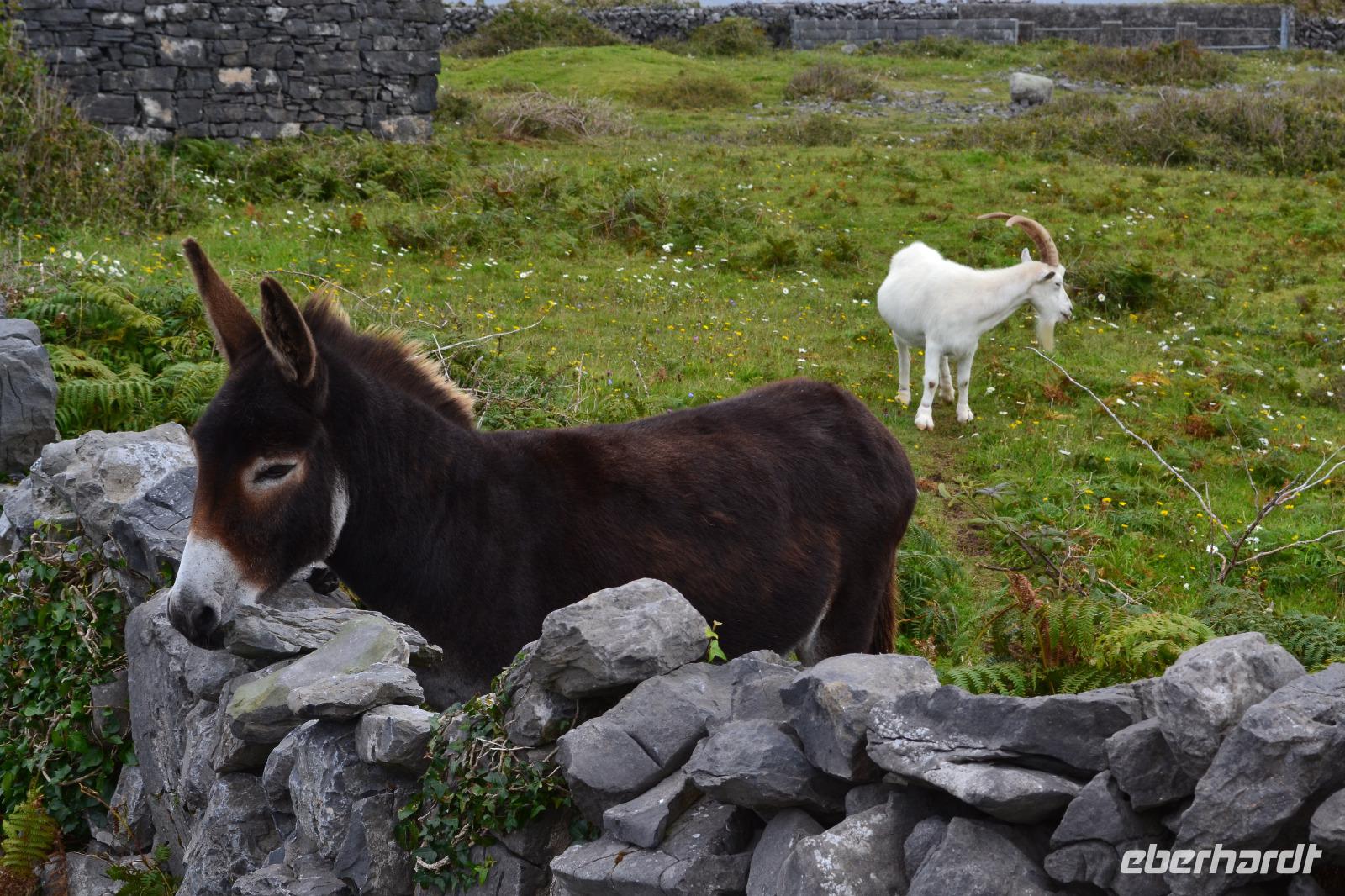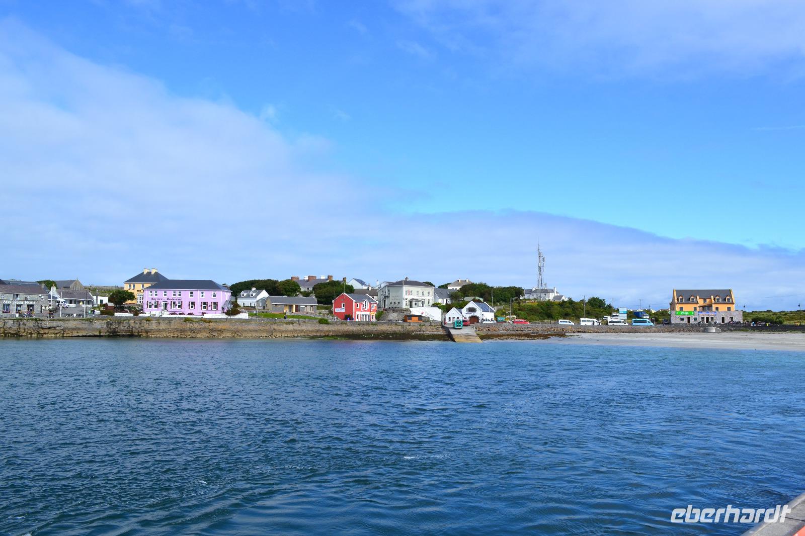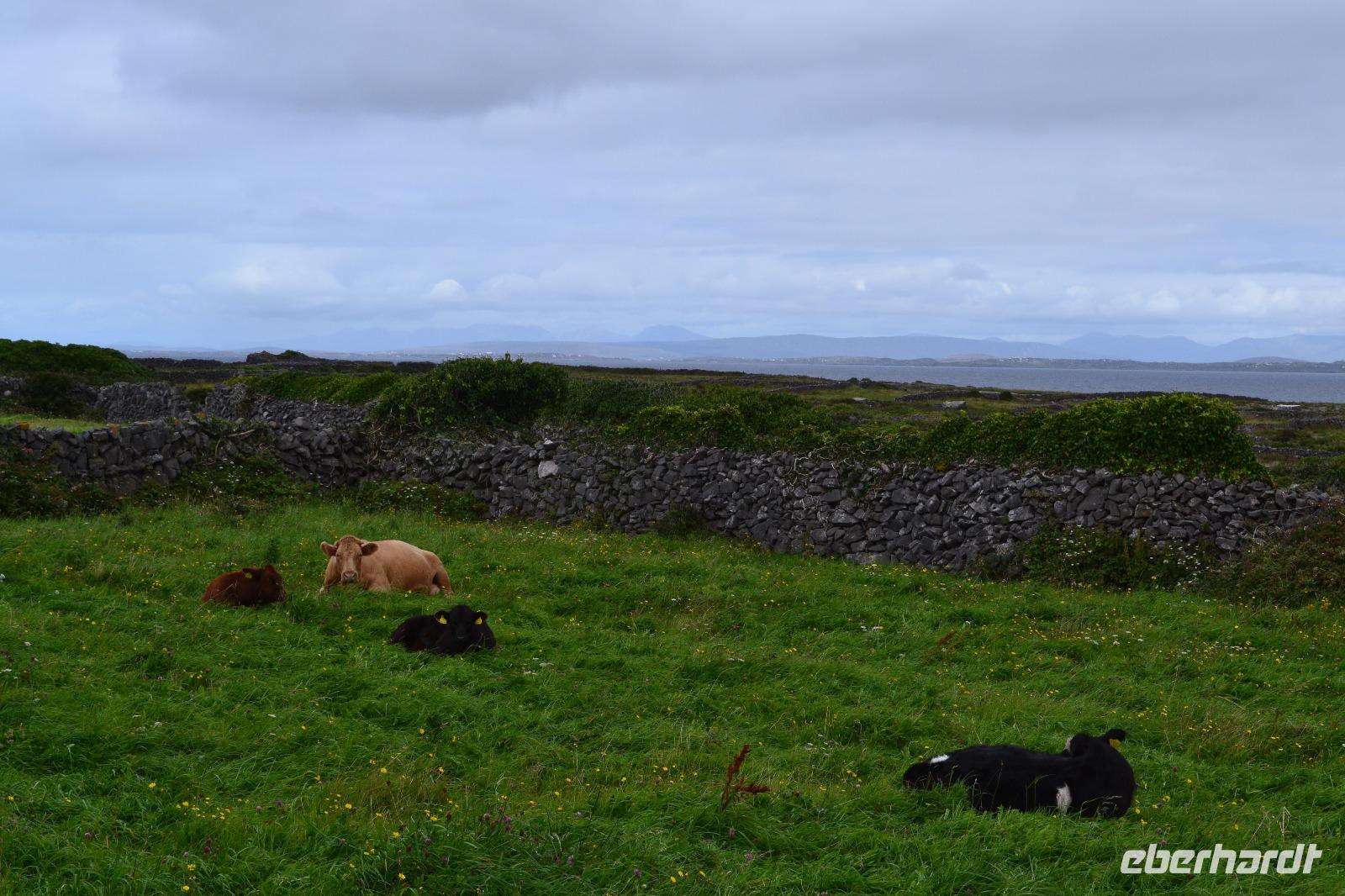 Wir werden den ganzen Tag auf Inishmore verbringen, der größten der drei Aran Islands in der Bucht von Galway. Nach dem Frühstück fahren wir nach Rossaveel, wo wir die Fähre nach Inishmore besteigen. Ungefähr 45 Minuten dauert die Überfahrt. Ankunft in Kilronan. Die Sonne lacht und ich bin viel zu warm angezogen. Sind wir noch in Irland? Ein paar ganz mutige Touristen (oder doch Einheimische?) springen sogar in Badehose in das Hafenbecken. Entlang einer kaum befahrenen Straße führt unsere heutige Wanderung entlang der Nordküste. In der Ferne können wir die Berge Connemaras sehen. Während unserer Mittagspause dann doch ein kurzer Schauer. Aber als wir die Regensachen ausgepackt haben ist schon wieder alles vorbei. Neugierig werden wir vom Wasser aus von ein paar Seehunden beäugt. Nach einer halben Stunde Pause setzen wir dann gestärkt unsere Wanderung auf einem Feldweg fort. Unser Ziel ist das alte Steinfort Dun Aenghus, das weithin sichtbar hoch auf den Klippen thront. Über die ursprünglichen Erbauer ist wie so oft in Irland wenig bekannt. Wie lebten sie? Vor wem versuchten sie sich hier oben in der Abgeschiedenheit der Insel zu schützen? Das halbkreisförmige Fort wird an der offenen Seite nur vom Meer begrenzt. An der höchsten Stelle geht es 100 m in die Tiefe. Die mutigen unter uns legen sich auf den Bauch und krabbeln bis ganz an den Rand um einen Blick hinunterzuwerfen. Diesmal kann auch ich mich überwinden und schaue hinab auf die tosenden Wellen, die unten gegen die Felsen schlagen. Nach zwei Stunden Aufenthalt werden wir vom Besucherzentrum mit zwei Kleinbussen zur Fähre gebracht und kehren über Rossaveel in unser Hotel in Leenane zurück, wo schon das Abendessen auf uns wartet.