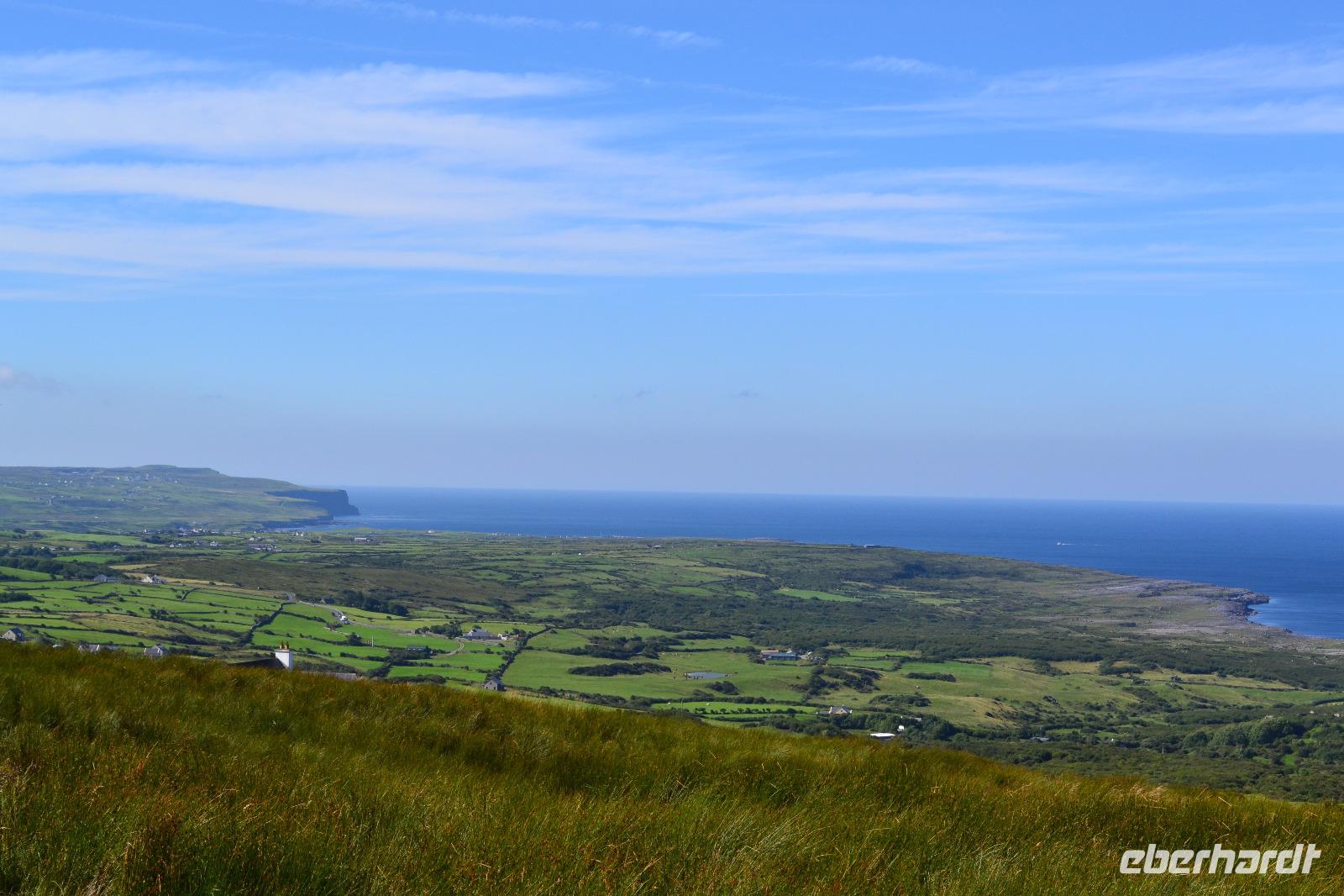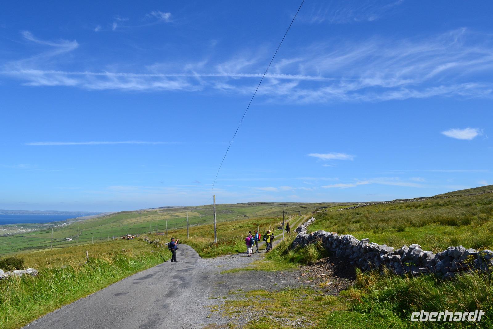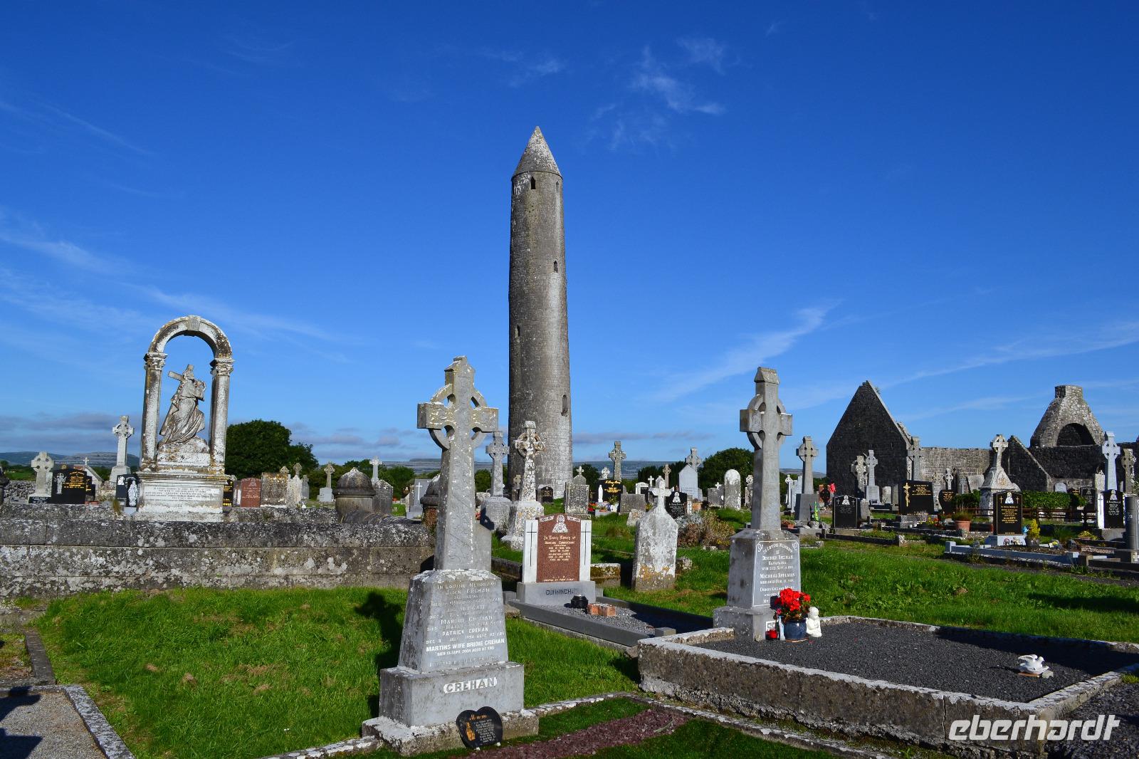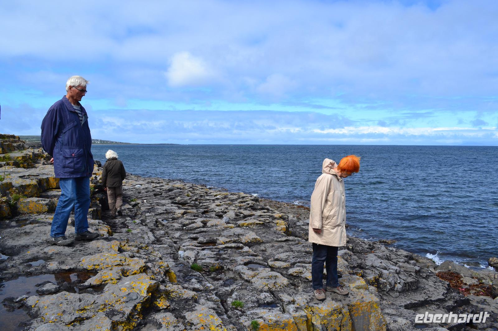Heute werden wir ausnahmsweise von Tommy gefahren, da Diane ihren gesetzlich vorgeschriebenen Driver's Rest Day einlegen muss. Unser erster Stopp ist der schiefe Turm von Irland, der Rundturm der Kilmacduagh Abbey. Seine Höhe beträgt mehr als 30 m und der Eingang befindet sich 7 m über dem Boden. Die Spitze des Turmes ist ca. 60 cm ausser Lot und merkwürdigerweise besitzt der Glockenturm an der Spitze sechs statt der üblichen vier Fenster. Von der Abtei selbst existieren nur noch Ruinen, aber der Friedhof wird auch hier weiter genutzt. Ueber Kilfenora nähern wir uns weiter dem Burren. In den Überresten der kleinen Kathedrale von Kilfenora finden sich noch einmal ein paar schöne Hochkreuze mit christlichen und alten keltischen Motiven. Hinter dem Ballinalacken Castle befindet sich der Ausgangspunkt unser heutigen Wanderung. Der Burren ist eine einzigartige Karstlandschaft, in der sich sowohl mediterrane als auch arktische Pflanzen wohlfühlen. Es weht ein kräftiger Wind, der uns das Wandern in der sengenden Hitze erträglich macht. Am Himmel ist kaum eine Wolke zu sehen. Und ja, wir sind tatsächlich immer noch in Irland. Man könnte fast meinen, wir machten tatsächlich Sommerurlaub. Die Aran Islands sind bei diesem Wetter natürlich deutlich zu sehen, ebenso die Bucht von Galway und in der Ferne die Cliffs auf Moher. Nach der Wanderung kehren wir in Doolin in einen urigen irischen Pub ein um einen original Irish Coffee zu trinken. Auf der Rückfahrt nach Gort halten wir noch am Lahinch Beach und geniessen bei 26 °C die Sonnenstrahlen, einige von uns sogar bei einem Eis.