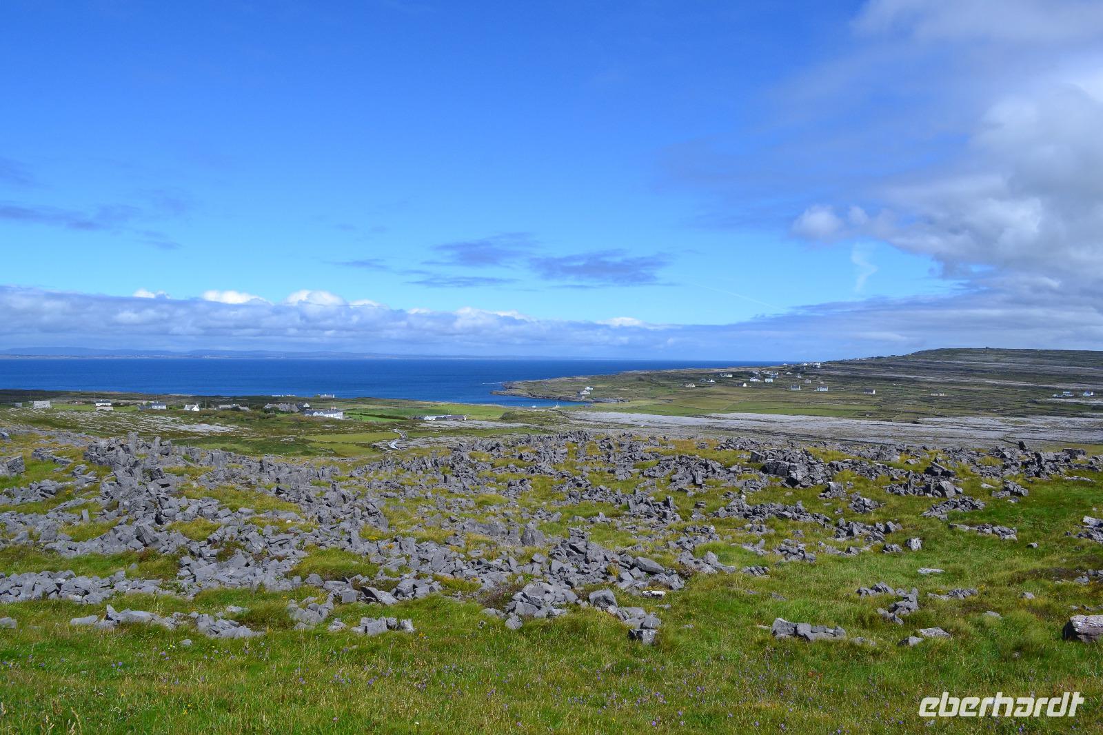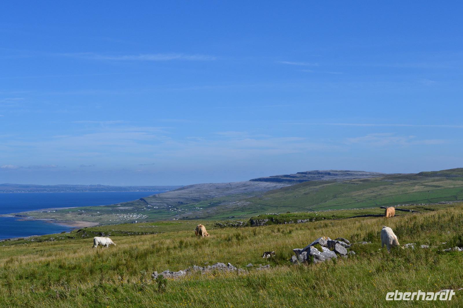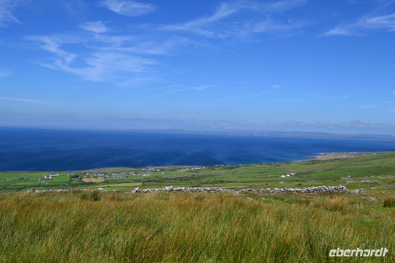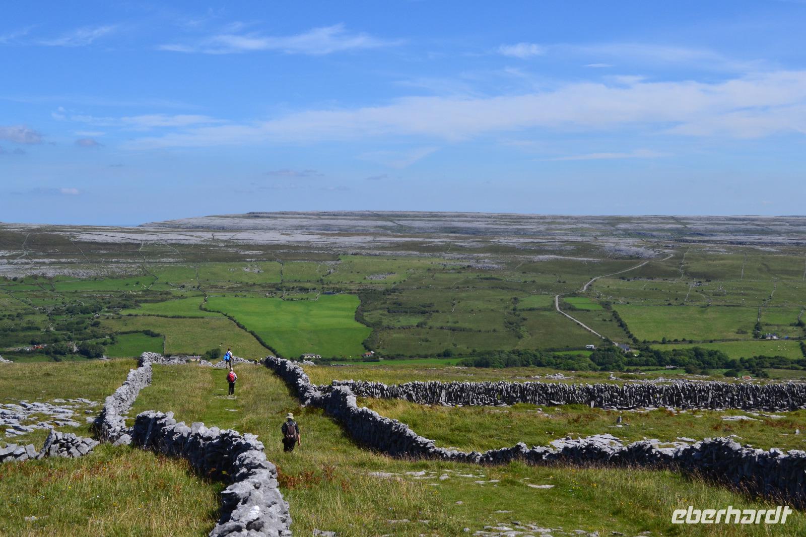 Heute werden wir ausnahmsweise von Tommy gefahren, da Diane ihren gesetzlich vorgeschriebenen Driver's Rest Day einlegen muss. Unser erster Stopp ist der schiefe Turm von Irland, der Rundturm der Kilmacduagh Abbey. Seine Höhe beträgt mehr als 30 m und der Eingang befindet sich 7 m über dem Boden. Die Spitze des Turmes ist ca. 60 cm ausser Lot und merkwürdigerweise besitzt der Glockenturm an der Spitze sechs statt der üblichen vier Fenster. Von der Abtei selbst existieren nur noch Ruinen, aber der Friedhof wird auch hier weiter genutzt. Ueber Kilfenora nähern wir uns weiter dem Burren. In den Überresten der kleinen Kathedrale von Kilfenora finden sich noch einmal ein paar schöne Hochkreuze mit christlichen und alten keltischen Motiven. Hinter dem Ballinalacken Castle befindet sich der Ausgangspunkt unser heutigen Wanderung. Der Burren ist eine einzigartige Karstlandschaft, in der sich sowohl mediterrane als auch arktische Pflanzen wohlfühlen. Es weht ein kräftiger Wind, der uns das Wandern in der sengenden Hitze erträglich macht. Am Himmel ist kaum eine Wolke zu sehen. Und ja, wir sind tatsächlich immer noch in Irland. Man könnte fast meinen, wir machten tatsächlich Sommerurlaub. Die Aran Islands sind bei diesem Wetter natürlich deutlich zu sehen, ebenso die Bucht von Galway und in der Ferne die Cliffs auf Moher. Nach der Wanderung kehren wir in Doolin in einen urigen irischen Pub ein um einen original Irish Coffee zu trinken. Auf der Rückfahrt nach Gort halten wir noch am Lahinch Beach und geniessen bei 26 °C die Sonnenstrahlen, einige von uns sogar bei einem Eis.