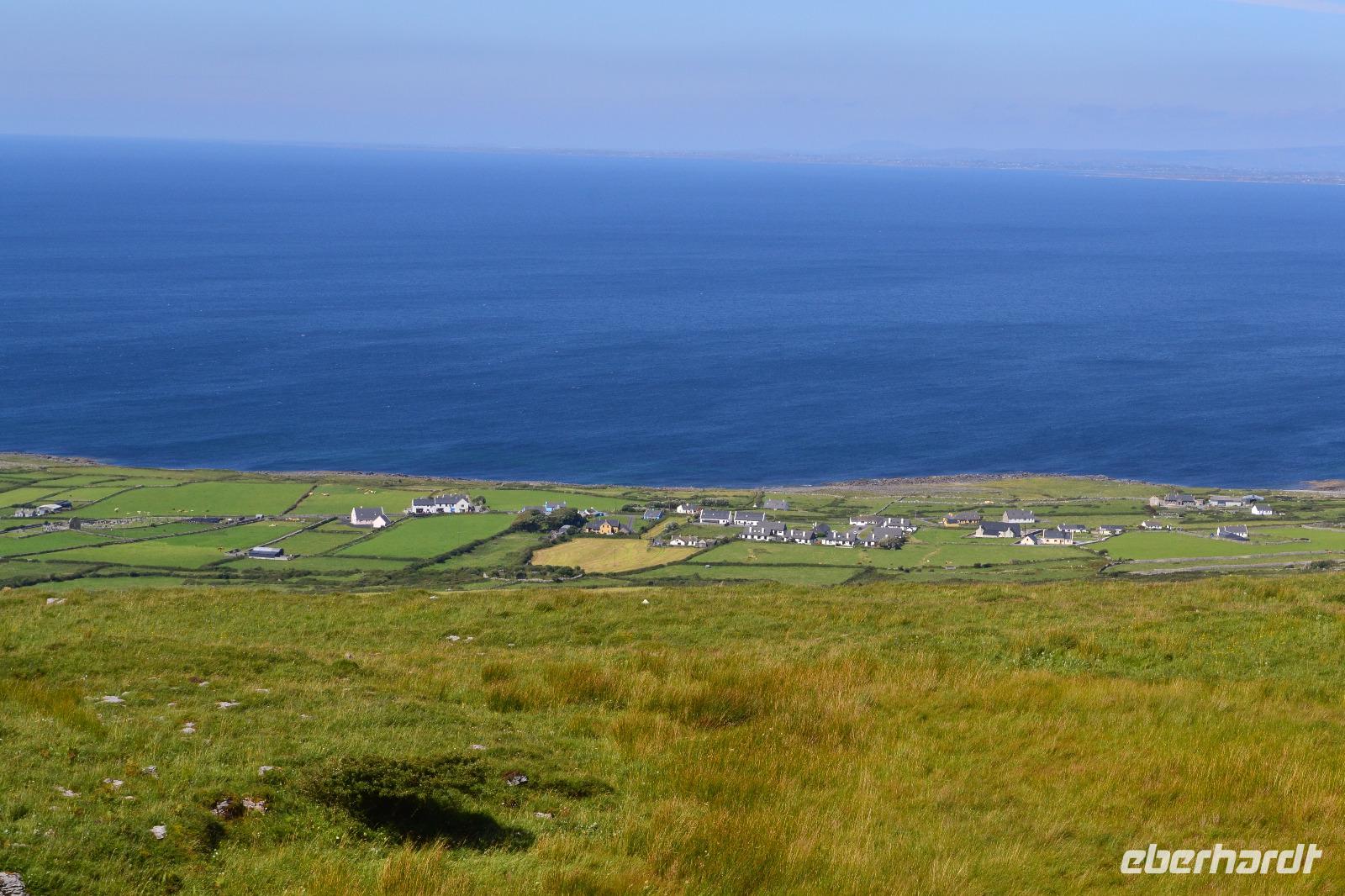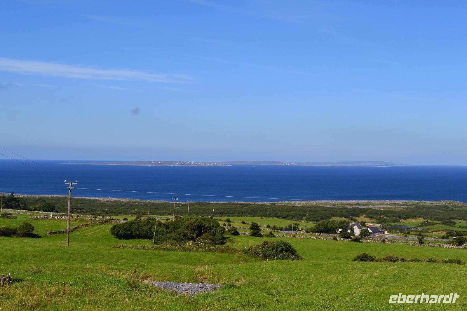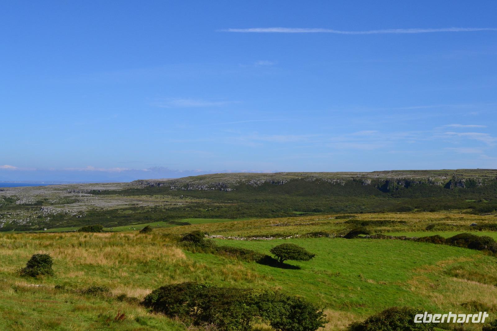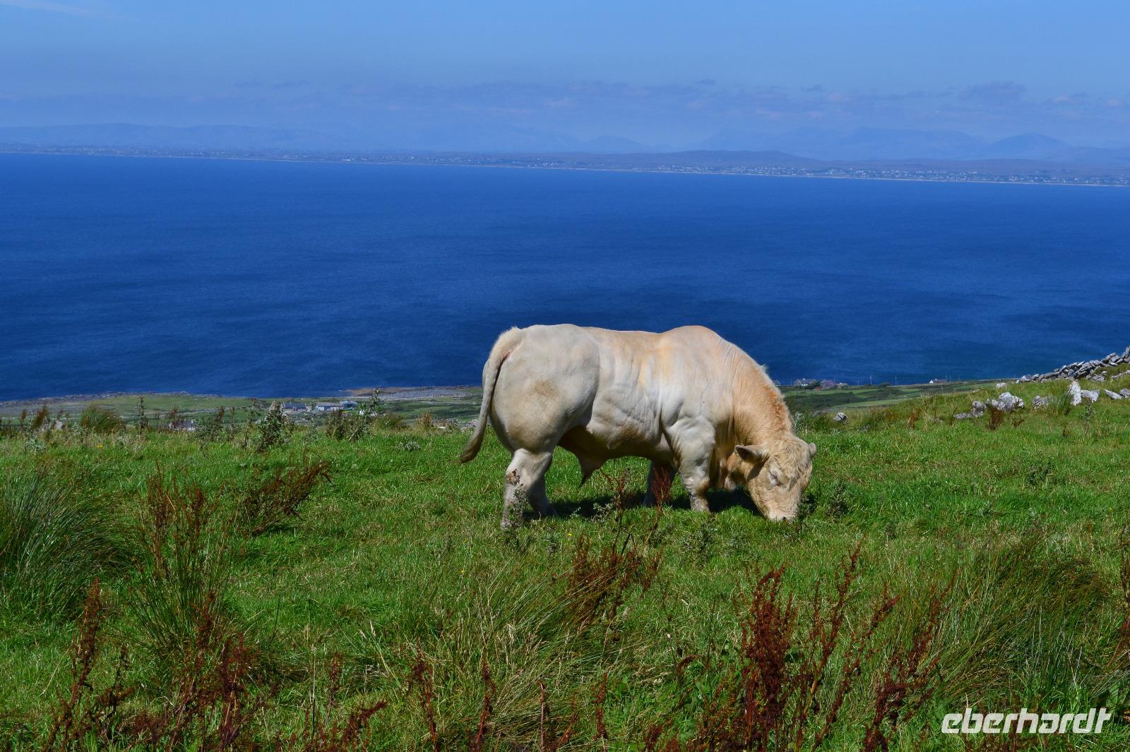 Heute werden wir ausnahmsweise von Tommy gefahren, da Diane ihren gesetzlich vorgeschriebenen Driver's Rest Day einlegen muss. Unser erster Stopp ist der schiefe Turm von Irland, der Rundturm der Kilmacduagh Abbey. Seine Höhe beträgt mehr als 30 m und der Eingang befindet sich 7 m über dem Boden. Die Spitze des Turmes ist ca. 60 cm ausser Lot und merkwürdigerweise besitzt der Glockenturm an der Spitze sechs statt der üblichen vier Fenster. Von der Abtei selbst existieren nur noch Ruinen, aber der Friedhof wird auch hier weiter genutzt. Ueber Kilfenora nähern wir uns weiter dem Burren. In den Überresten der kleinen Kathedrale von Kilfenora finden sich noch einmal ein paar schöne Hochkreuze mit christlichen und alten keltischen Motiven. Hinter dem Ballinalacken Castle befindet sich der Ausgangspunkt unser heutigen Wanderung. Der Burren ist eine einzigartige Karstlandschaft, in der sich sowohl mediterrane als auch arktische Pflanzen wohlfühlen. Es weht ein kräftiger Wind, der uns das Wandern in der sengenden Hitze erträglich macht. Am Himmel ist kaum eine Wolke zu sehen. Und ja, wir sind tatsächlich immer noch in Irland. Man könnte fast meinen, wir machten tatsächlich Sommerurlaub. Die Aran Islands sind bei diesem Wetter natürlich deutlich zu sehen, ebenso die Bucht von Galway und in der Ferne die Cliffs auf Moher. Nach der Wanderung kehren wir in Doolin in einen urigen irischen Pub ein um einen original Irish Coffee zu trinken. Auf der Rückfahrt nach Gort halten wir noch am Lahinch Beach und geniessen bei 26 °C die Sonnenstrahlen, einige von uns sogar bei einem Eis.