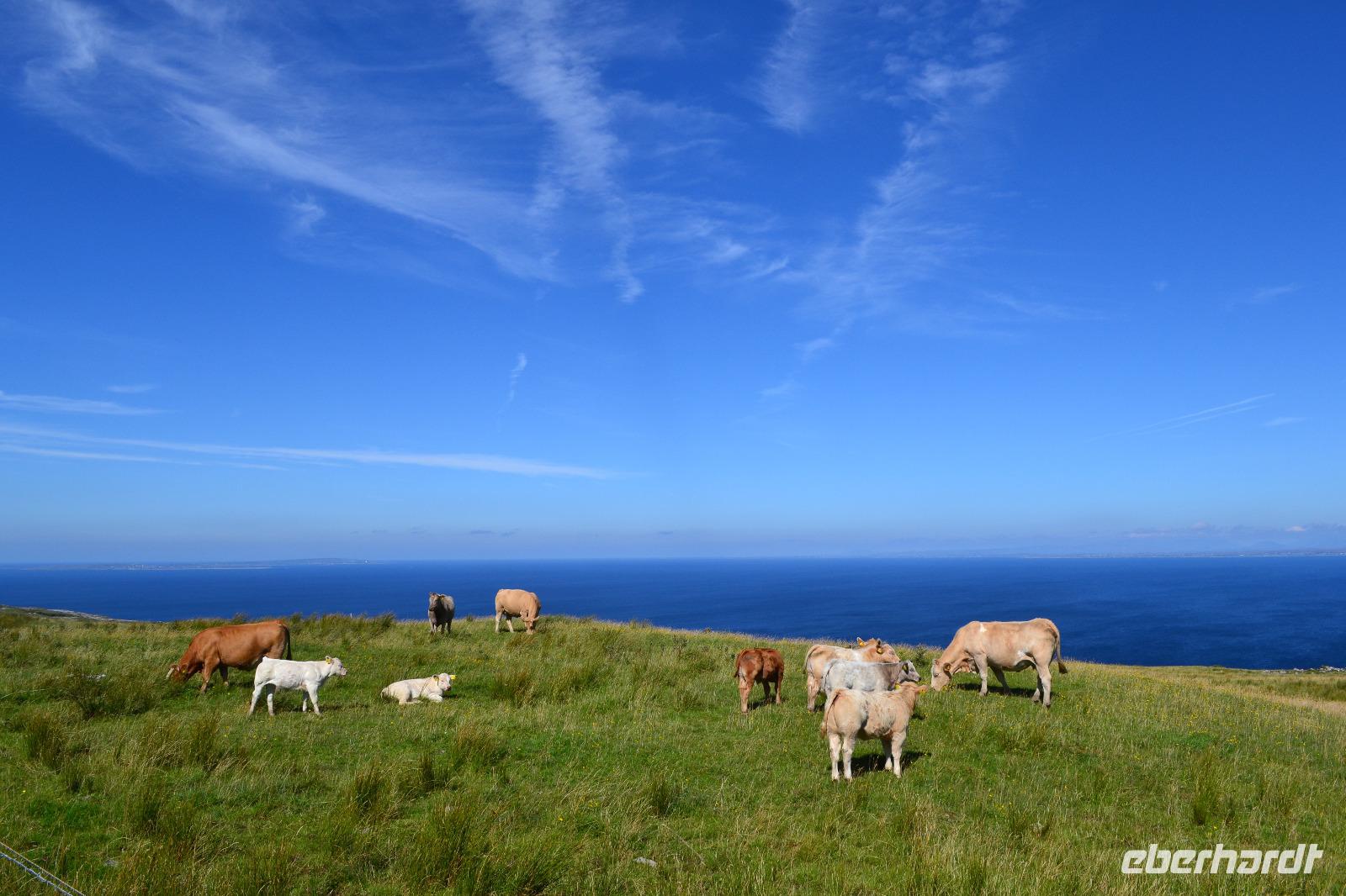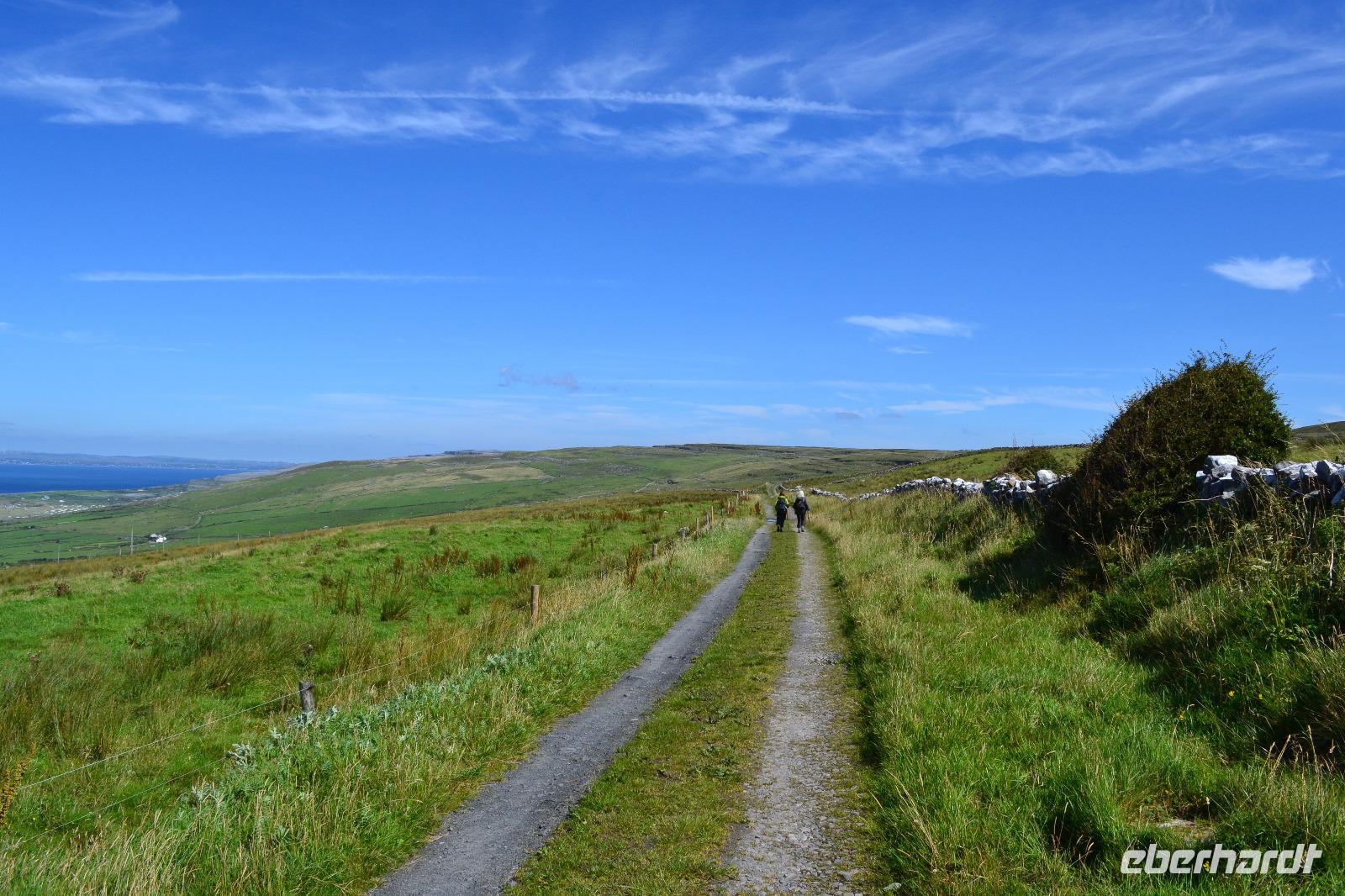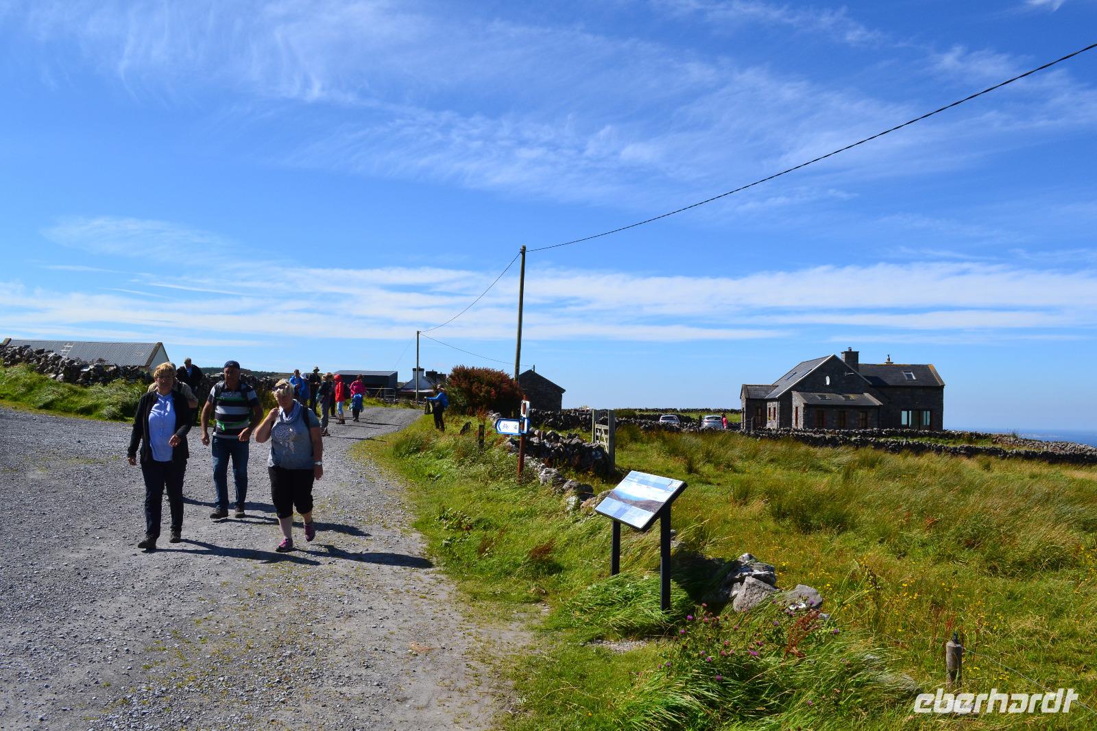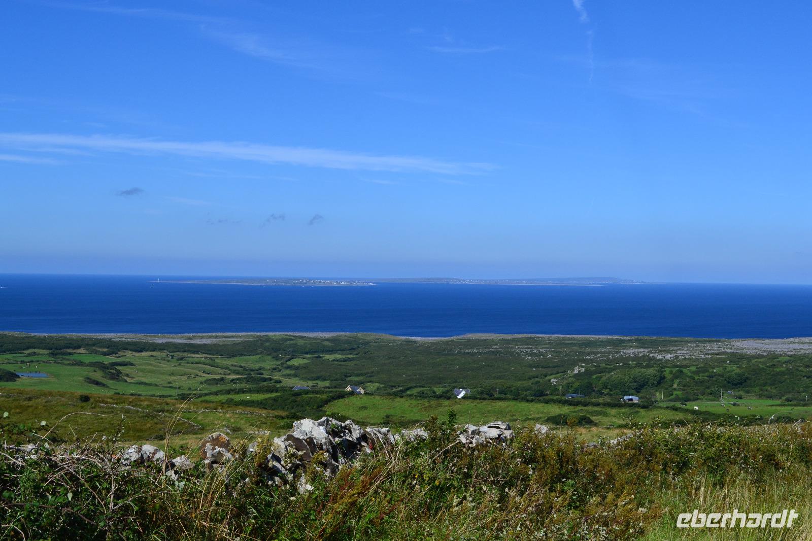 Heute werden wir ausnahmsweise von Tommy gefahren, da Diane ihren gesetzlich vorgeschriebenen Driver's Rest Day einlegen muss. Unser erster Stopp ist der schiefe Turm von Irland, der Rundturm der Kilmacduagh Abbey. Seine Höhe beträgt mehr als 30 m und der Eingang befindet sich 7 m über dem Boden. Die Spitze des Turmes ist ca. 60 cm ausser Lot und merkwürdigerweise besitzt der Glockenturm an der Spitze sechs statt der üblichen vier Fenster. Von der Abtei selbst existieren nur noch Ruinen, aber der Friedhof wird auch hier weiter genutzt. Ueber Kilfenora nähern wir uns weiter dem Burren. In den Überresten der kleinen Kathedrale von Kilfenora finden sich noch einmal ein paar schöne Hochkreuze mit christlichen und alten keltischen Motiven. Hinter dem Ballinalacken Castle befindet sich der Ausgangspunkt unser heutigen Wanderung. Der Burren ist eine einzigartige Karstlandschaft, in der sich sowohl mediterrane als auch arktische Pflanzen wohlfühlen. Es weht ein kräftiger Wind, der uns das Wandern in der sengenden Hitze erträglich macht. Am Himmel ist kaum eine Wolke zu sehen. Und ja, wir sind tatsächlich immer noch in Irland. Man könnte fast meinen, wir machten tatsächlich Sommerurlaub. Die Aran Islands sind bei diesem Wetter natürlich deutlich zu sehen, ebenso die Bucht von Galway und in der Ferne die Cliffs auf Moher. Nach der Wanderung kehren wir in Doolin in einen urigen irischen Pub ein um einen original Irish Coffee zu trinken. Auf der Rückfahrt nach Gort halten wir noch am Lahinch Beach und geniessen bei 26 °C die Sonnenstrahlen, einige von uns sogar bei einem Eis.
