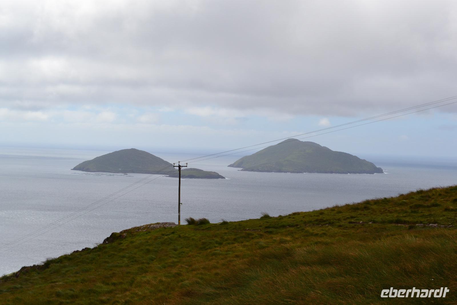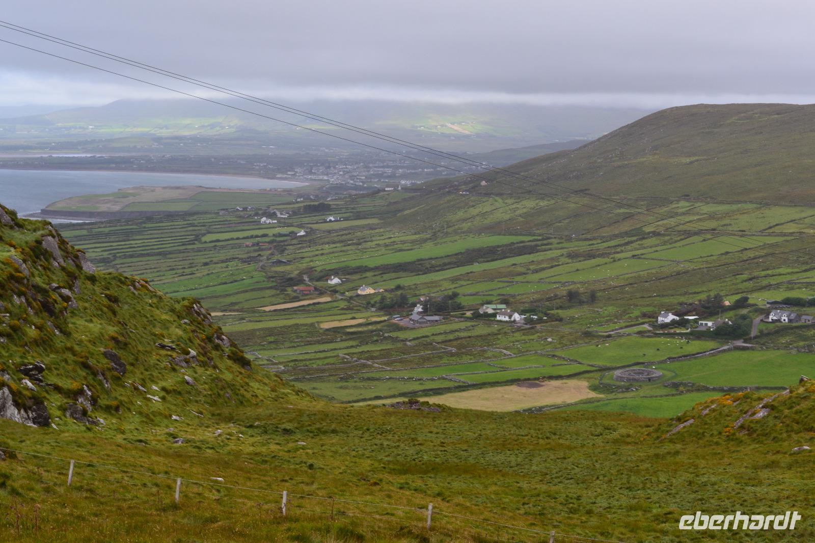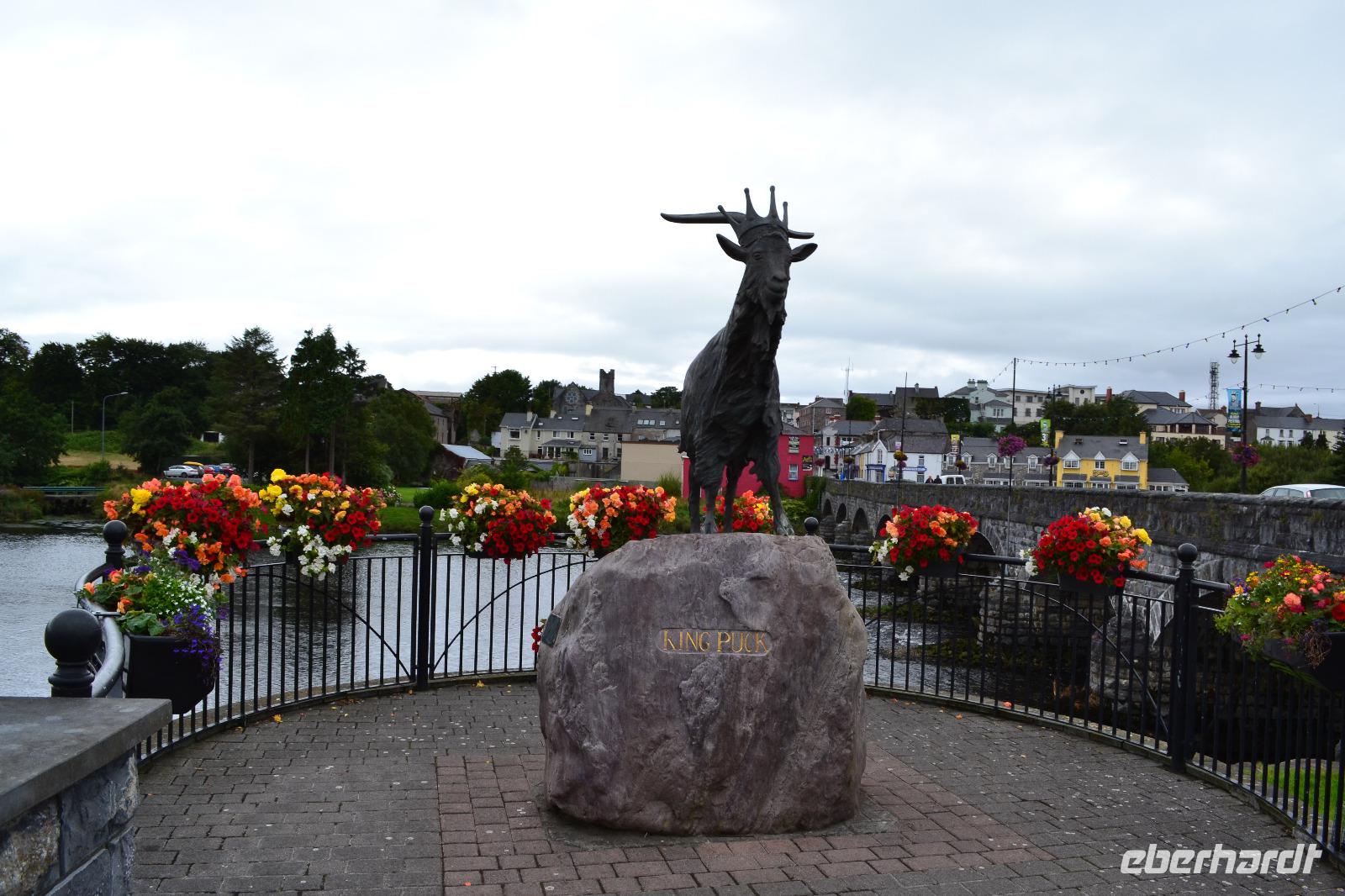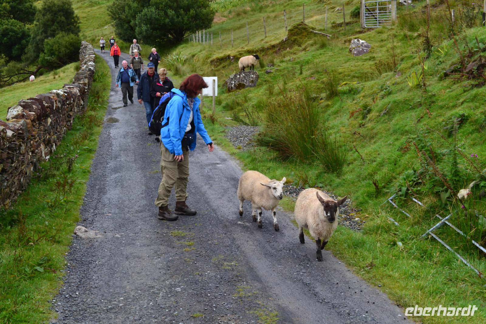 Von Tralee aus fahren wir in den Killarney National Park. Dieser soll Start- und Endpunkt unserer heutigen Reise sein, denn wir werden einmal um die Iveragh-Halbinsel herumfahren. Am frühen Morgen besichtigen wir also als erstes den Muckross Park und bewundern die wunderschönen Bäume und Pflanzen: das Mammutblatt, den Steingarten, den Rosengarten hinter dem Muckross House. Und dann geht es los mit dem sog. "Ring of Kerry". Wir halten kurz in Killorglin an der King-Puck-Statue. Sie erinnert an das Volksfest "King Puck Fair", bei dem ein wild lebender Ziegenbock gefangen, auf dem Marktplatz in einen Käfig gesperrt und zum König des Festes erhoben wird. Während der Feierlichkeiten wird er tatsächlich auch königlich versorgt und anschließend wieder in die Freiheit entlassen. Auf der Weiterfahrt nach Cahersiveen geraten wir in einen heftigen Regenschauer und ich befürchtete für den weiteren Tag das schlimmste. Doch als wir den Geburtsort des irischen Katholikenbefreiers Daniel O'Connell erreichen, hat der Regen merklich nachgelassen. So können wir auch das rekonstruierte Ringfort Cahergal anfahren und dessen mächtige Mauern besteigen. Die Mittagspause machen wir in Waterville, wo wir auf den Spuren Charlie Chaplins wandern, der hier am Atlantikstrand gern seinen Urlaub verbrachte. Auf dem Weg zum Coomakista Pass können wir dann sogar kurz in der Ferne die hoch aufragenden Felsen der beiden Skellig Inseln sehen. Auf Skellig Michael hat sich gerade der Jedi-Ritter Luke Skywalker ins Exil zurückgezogen. Beim Halt am Coomakista Pass haben wir zwar eine herrliche Aussicht, werden aber beim Photographieren vom stürmischen Wind fast emporgehoben und nach Amerika getrieben, und so weit wollten wir heute dann doch nicht reisen. Auf meine Gäste wartet dann noch eine Überraschung. Bei einem Besuch der Kissane Sheep Farm beobachten und lernen wir nicht nur, wie ein Schäfer mit seinen Hunden die Herde zusammentreibt, sondern schauen auch beim Scheren eines Schafes zu. Auf dem Weg zurück zum Killarney National Park machen wir noch einen Photostopp am Ladies View und können die Seen des Parks von oben betrachten. Dann schließt sich nach ein paar weiteren Kilometern der Kreis und wir fahren zurück zu unserem Hotel in Tralee.