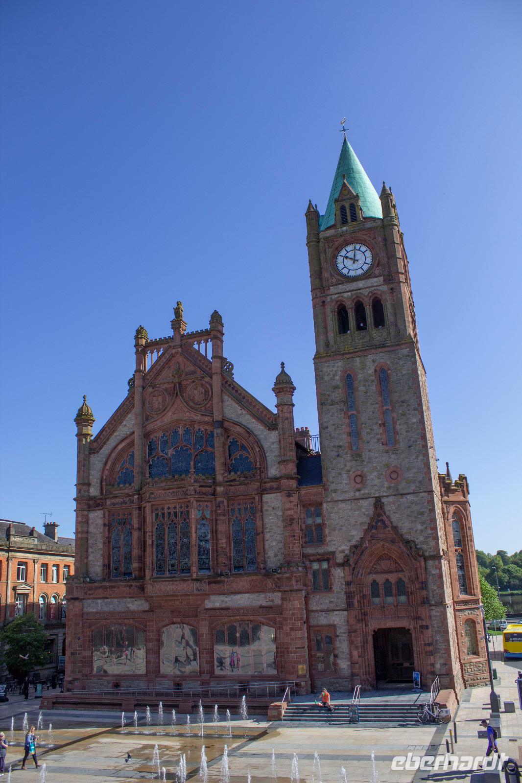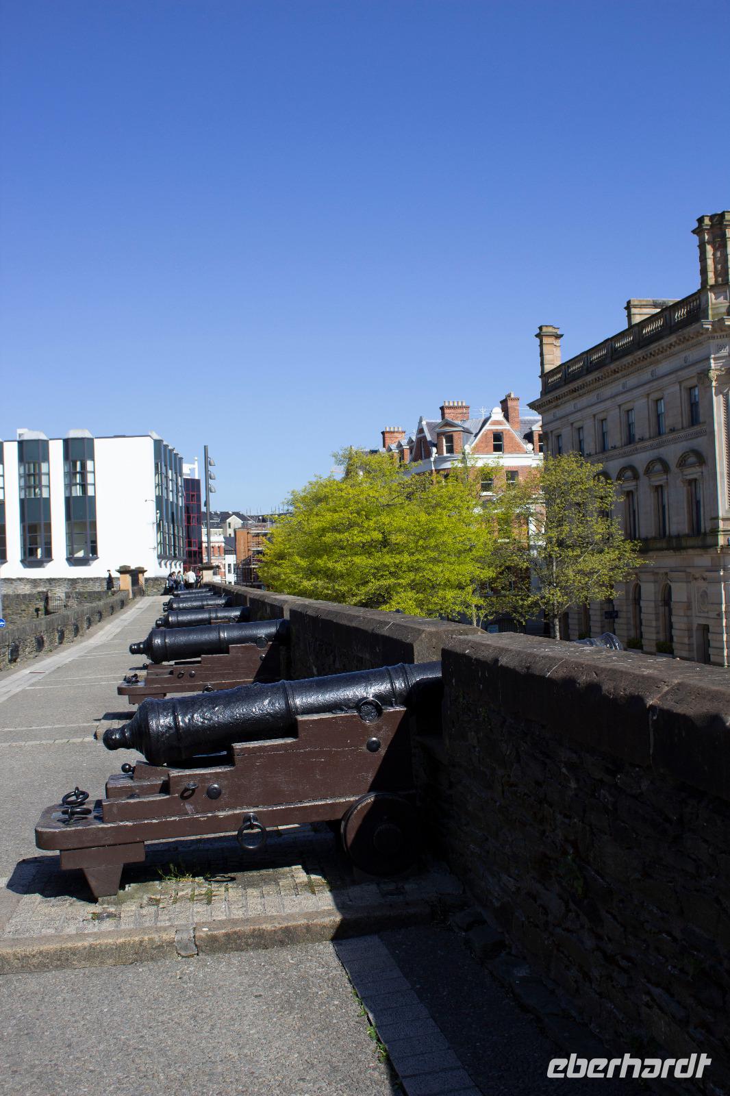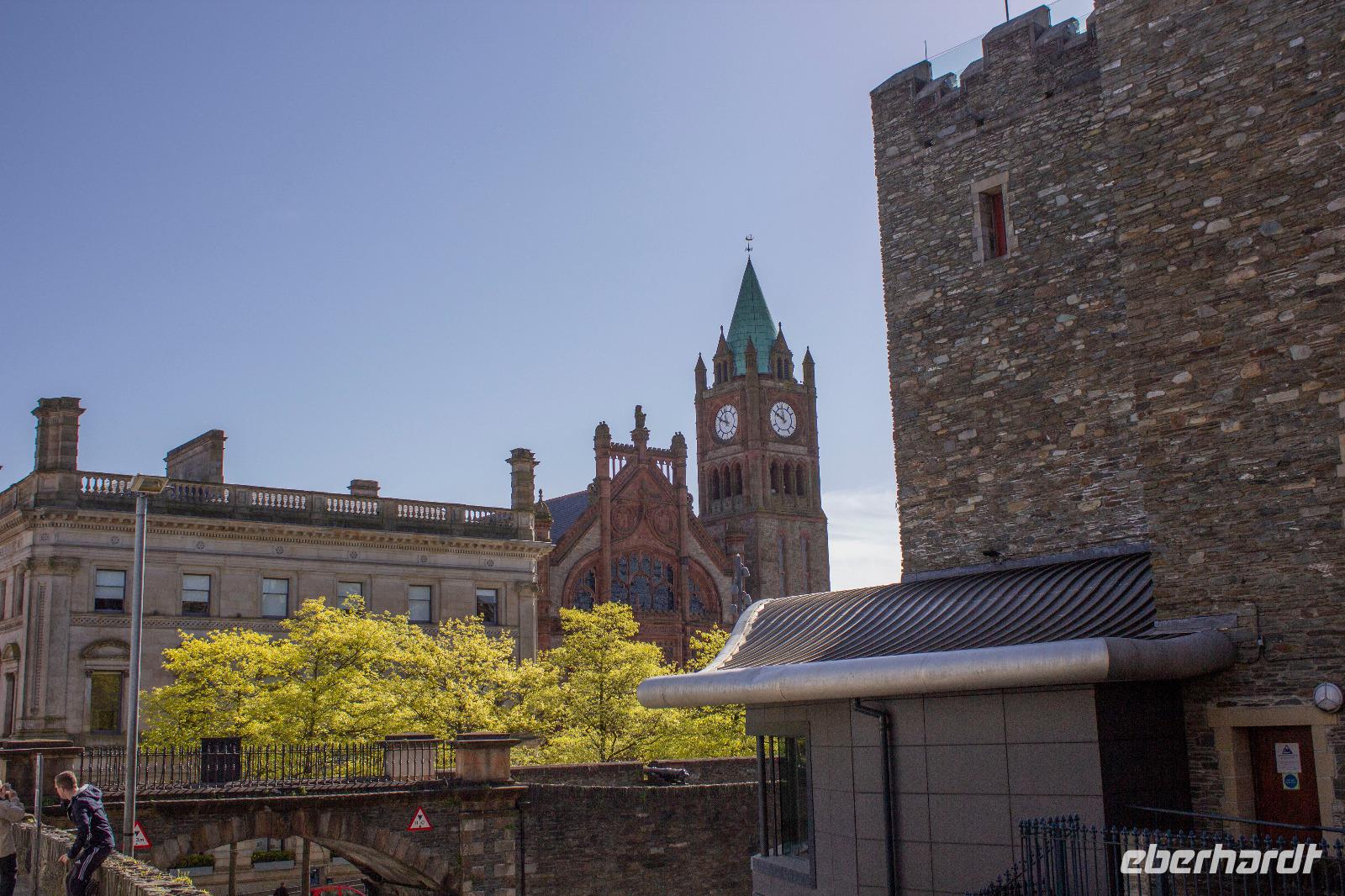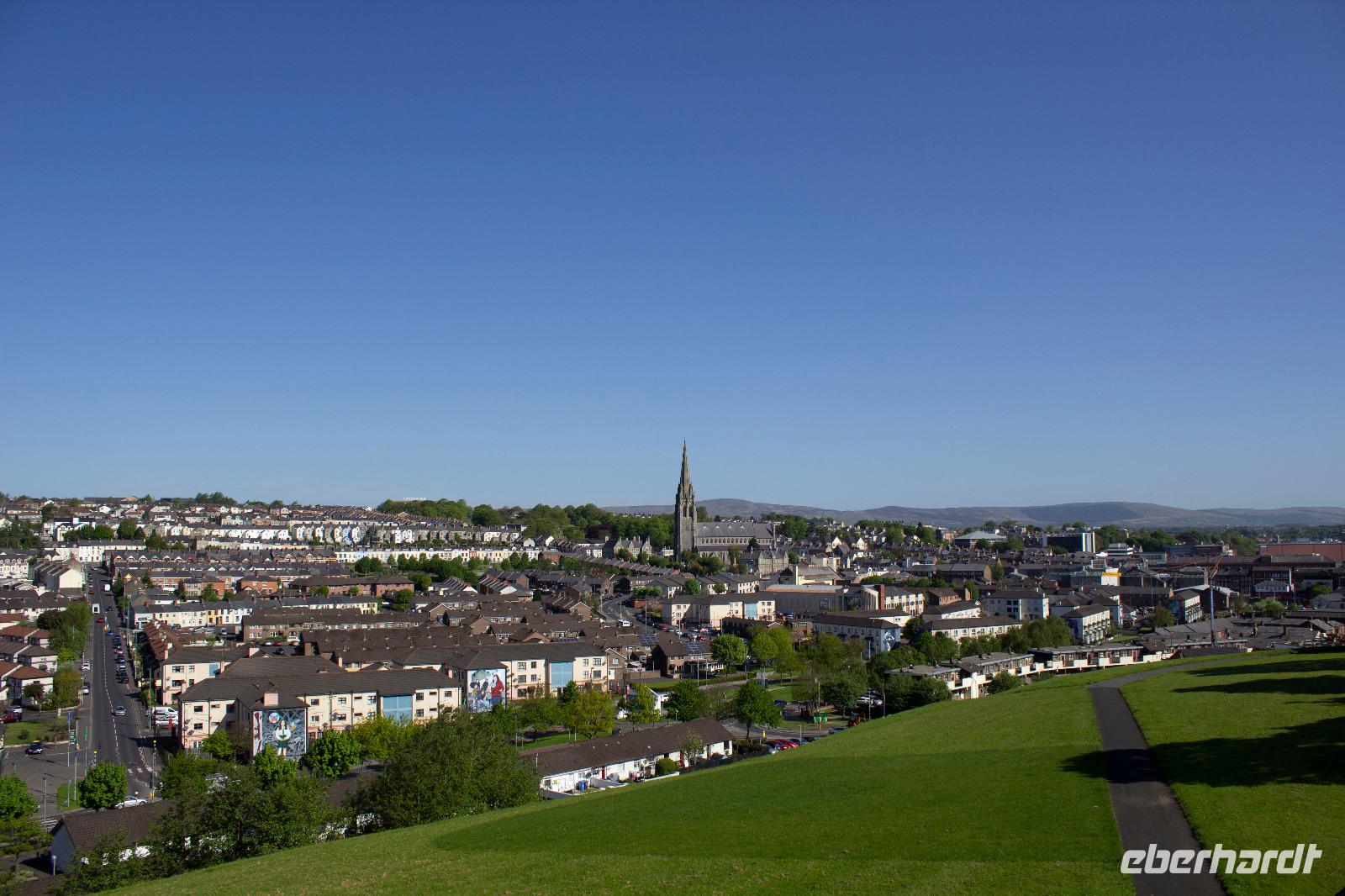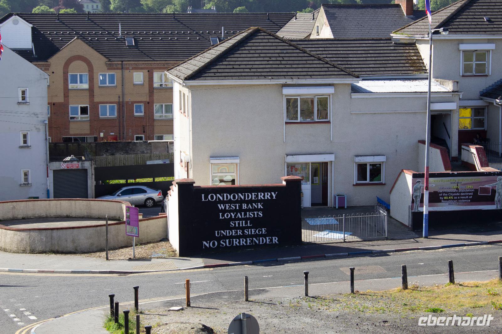An diesem Tag freuten wir uns auf unseren Ausflug nach Nordirland. Unsere erste Station war Derry-Londonderry. Die Stadt steht immer noch als Synonym für die „troubles", die Auseinandersetzungen zwischen Katholiken und Protestanten und für den „Bloody Sunday", dem „Blutigen Sonntag", an dem am 30.Januar 1972 ein Fallschirmjäger-Regiment der britischen Armee das Feuer auf eine friedlich demonstrierende Menschenmenge eröffnete. 14 Menschen kamen dabei ums Leben. Bis zum heutigen Tag sind die Wohnviertel nach Religionszugehörigkeit getrennt.