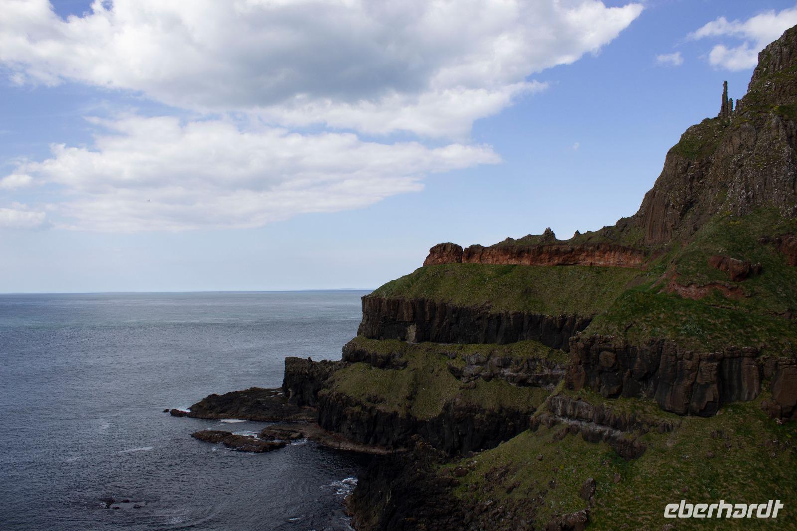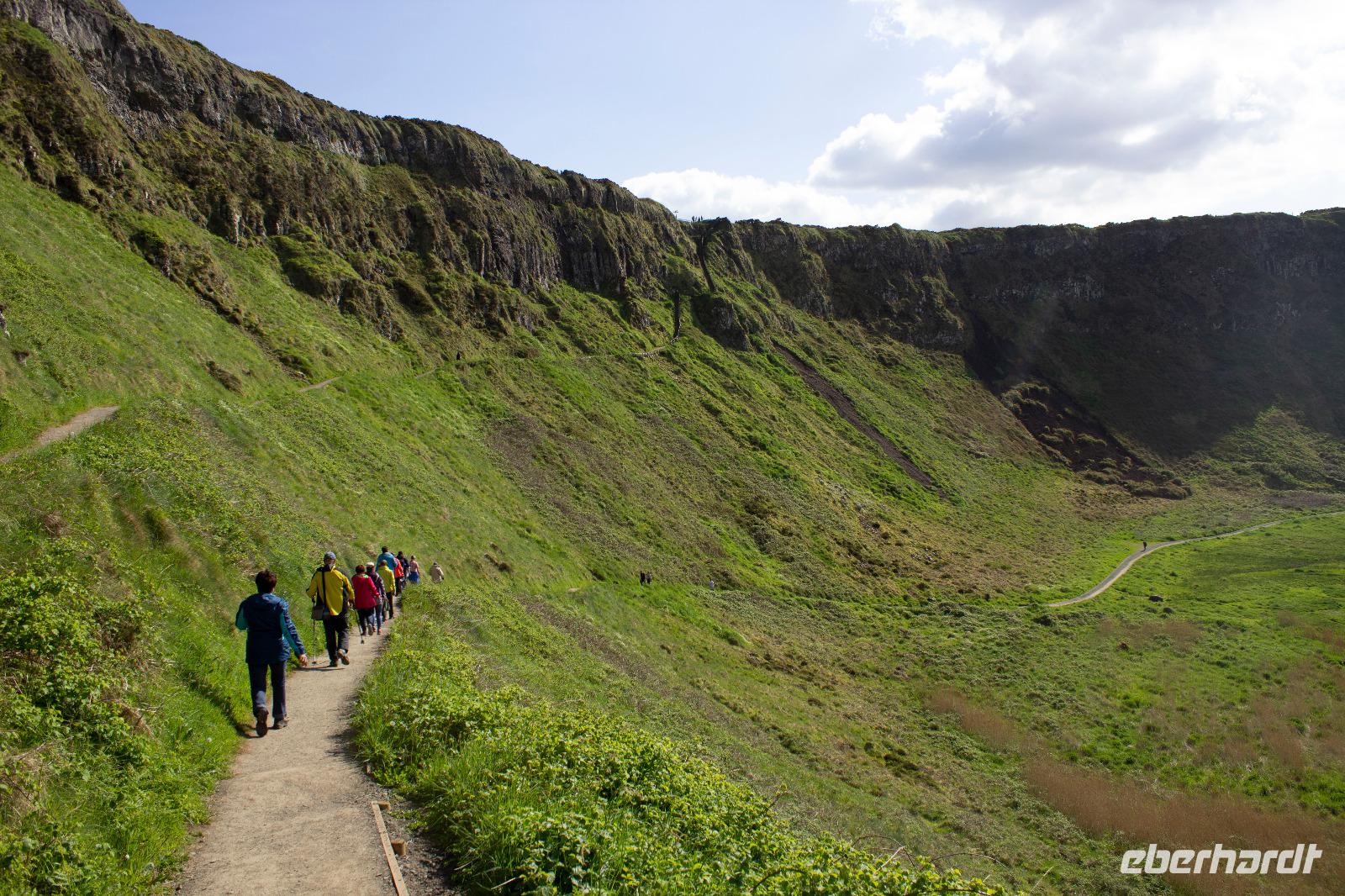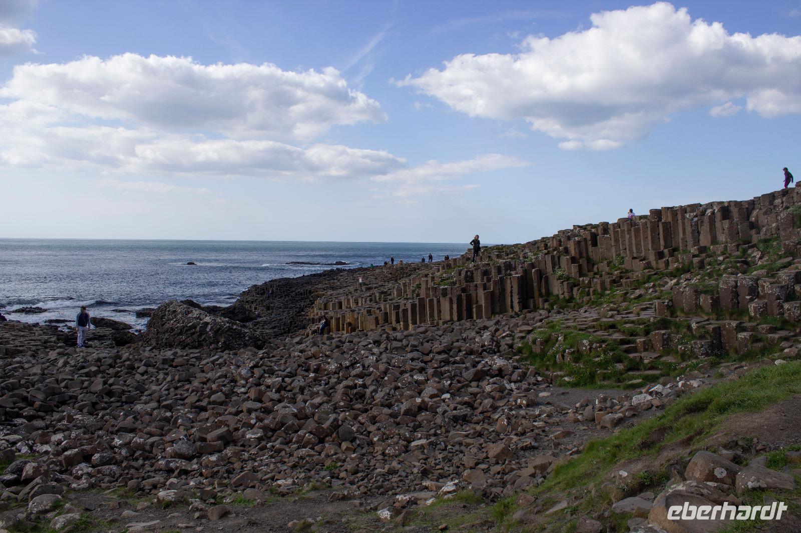 Wir umrundeten das historische Zentrum auf der gewaltigen Stadtmauer. Nach wie vor gedenken die Unionisten jedes Jahr mit einer Festwoche der 105tägigen Verteidigung Londonderrys und des sich anschließenden Sieges über die Truppen Jakobs des II. im Jahre 1689. Von Derry / Londonderry ging es anschließend zum Mussenden Temple. Er liegt oberhalb des Downhill Beach und wurde Ende des 18.Jh. direkt an den Klippen errichtet. Das runde Gebäude widmete der Bischoff von Derry seiner Cousine Frideswide Mussenden. Heutzutage wird der Rundbau für besondere Anlässe, wie zum Beispiel Hochzeiten, vermietet. Bei unserem Besuch war das Innere des Tempels nicht zugänglich, doch auch so war der Blick auf den Downhill-Strand atemberaubend! Mit dem Bus ging es danach zur Whiskey-Distillerie in Bushmills. Bei einem Rundgang erfuhren wir die wichtigsten Dinge über die Whiskey-Herstellung und anschließend stand einer kleinen Kostprobe nichts mehr im Weg. Von Bushmills aus fuhren wir wieder ans Meer zum Besucherzentrum „Giant's Causeway". Der Name heißt übersetzt „Damm des Riesen" und geht auf eine irische Heldensage zurück. Von dort aus wanderten wir oberhalb der Klippen entlang der „roten" Route und fanden viele Gelegenheiten für fantastische Fotoaufnahmen. Danach stiegen wir zum unteren Weg hinab und bestaunten Basaltsäulen, die vor ca. 60 Millionen Jahren entstanden, als austretende Lava aus dem Erdinneren an die Oberfläche drang, abkühlte und erstarrte. Übrig blieben zumeist sechseckige, aneinandergereihte Basaltsäulen. Am Besucherzentrum endete dann unsere Wanderung. Hier hatten wir Zeit für den Besuch der Ausstellung oder für eine kleine Kaffeepause. Von „Giant's Causeway" fuhren wir anschließend zu unserem Hotel in Letterkenny zurück.
