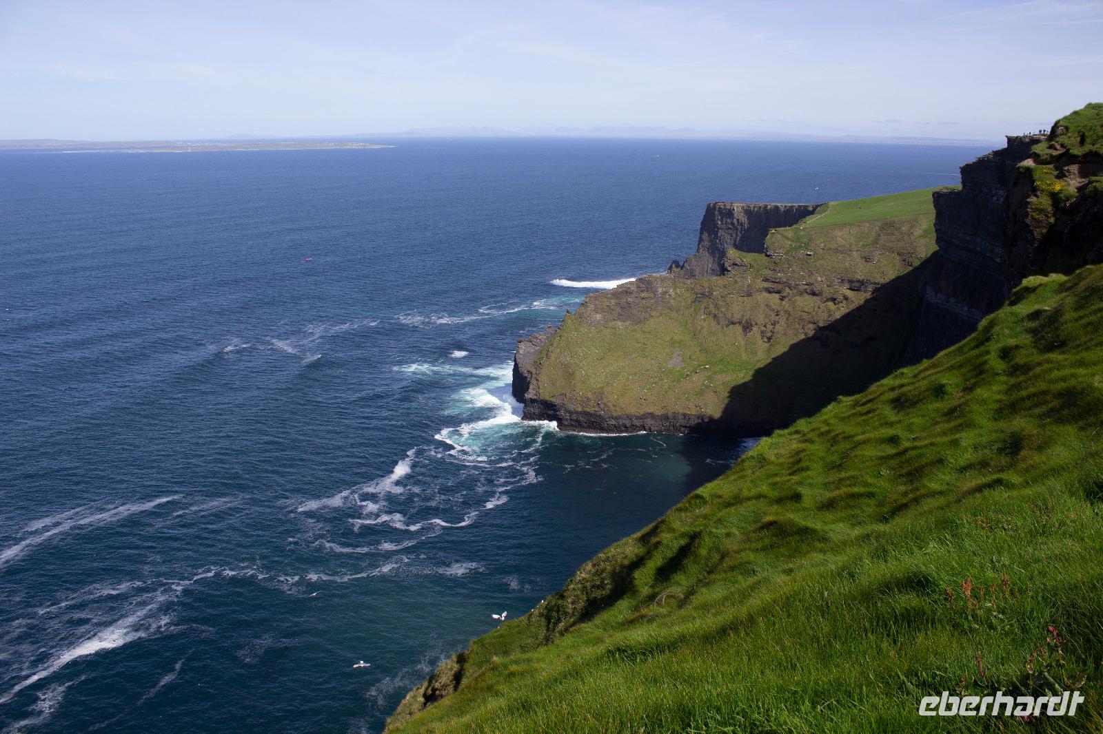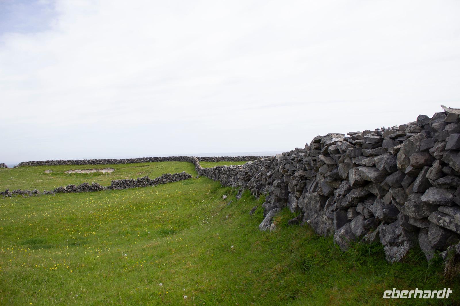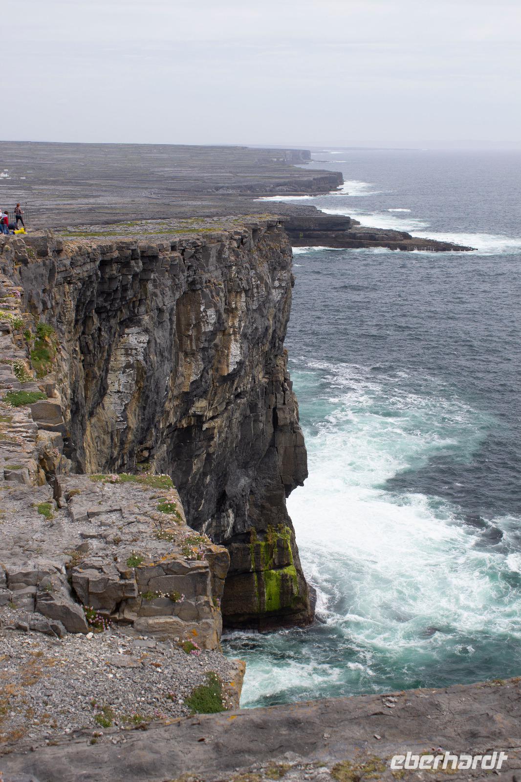 Wir fuhren durch das wunderschöne Joyce Country auf die Südseite der Connemara-Halbinsel, zum Hafen von Rossaveel. Von dort brachte uns die Fähre auf die Aran-Insel Inishmore. Nach circa einer Stunde kamen wir am Hafen von Kilronan an und wanderten nach einer kurzen Pause los. Die Wegstrecke führte uns entlang der Nordküste in westliche Richtung, vorbei an unzähligen Steinmauern, Kirchenruinen und Weideflächen. An der Bucht der Seehundkolonie legten wir unsere Picknickpause ein. Es war ein Erlebnis, die Seehunde in der Sonne liegen zu sehen und hin und wieder hörten wir auch deren lautes Heulen. Nach der Pause ging es weiter bis zum winzigen Örtchen Kilmurvey.und von dort hinauf zum Fort „Dun Aonghasa", ein Steinfort, welches auf beinahe 90 Metern Höhe am Rand senkrecht abfallender Klippen steht. Drei halbkreisförmige, zum Meer hin offene Steinkreise schützten einst die Bewohner vor Angriffen. Die prähistorische Anlage entstand vor ca. 3000 Jahren und bietet aufgrund der landschaftlich exponierten Lage atemberaubende Ausblicke auf die südliche Steilküste. Das Schlagen der Meter hohen Gischt an die senkrechten Felswände ist Hunderte Meter weit zu hören.