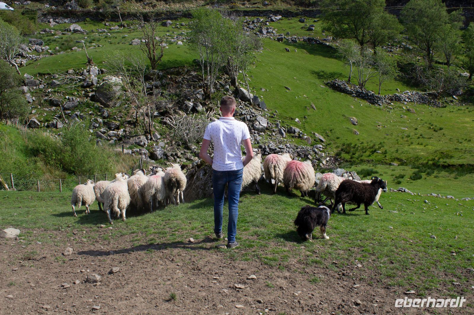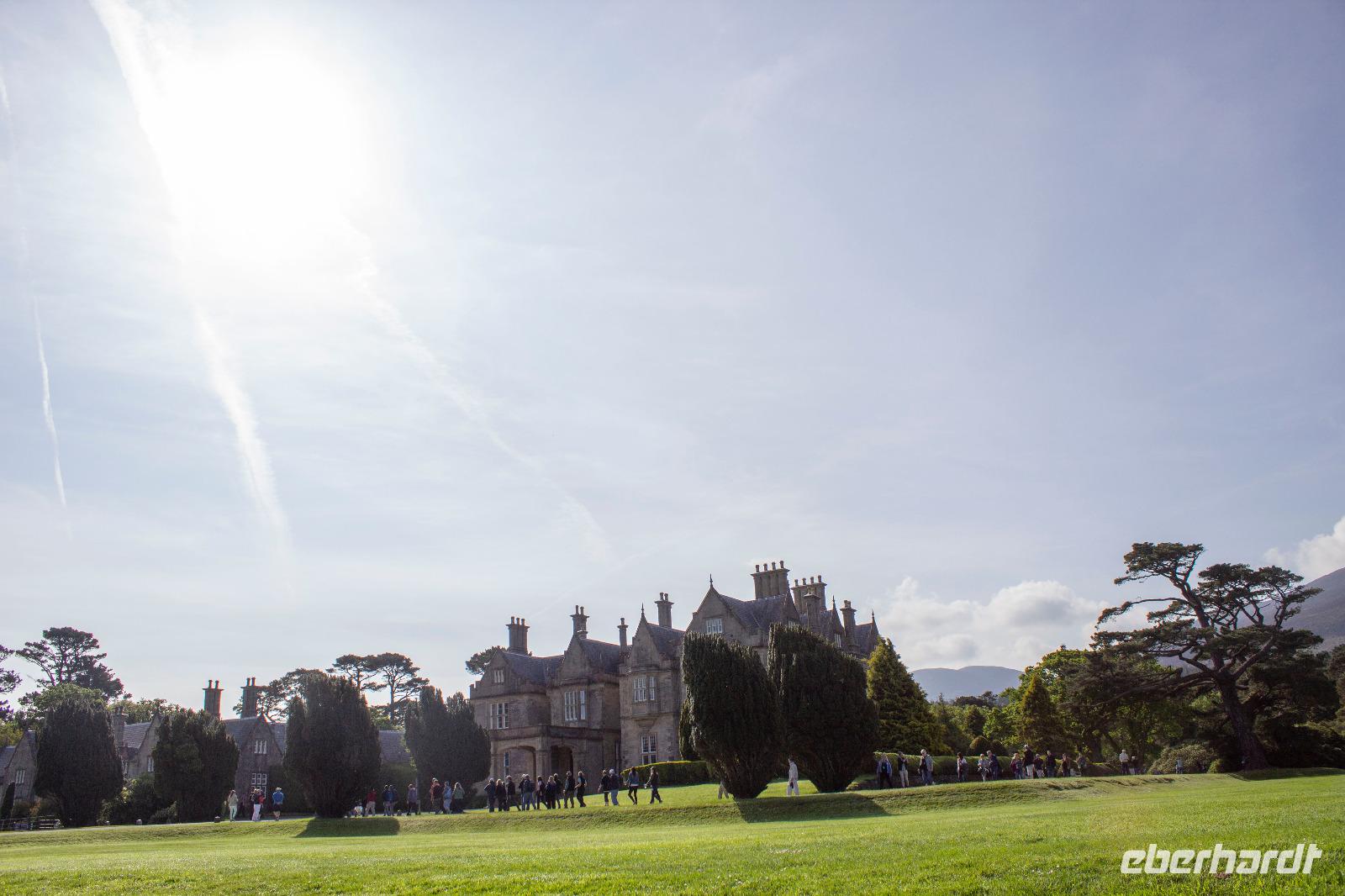 Von Letterkenny aus fuhren wir in den Glenveagh Nationalpark. Im dortigen Informationszentrum sahen wir uns zunächst einen Film über den Park sowie die Schlossanlage an und fuhren anschließend mit Minibussen zum vier Kilometer entfernten Schloss. Während einer Führung erfuhren wir, dass die letzten beiden Besitzer, die Amerikaner Arthur Kingsley Porter und Henry McIlhenny, sehr gern Künstler und Prominente empfangen haben. Auch Greta Garbo hat sich in Glenveagh mehrmals aufgehalten. McIlhenny ließ die Gartenanlage in ihrer heutigen Form gestalten und schenkte Garten und Schloss 1981 der Nationalparkverwaltung. Nach der Besichtigung spazierten wir durch den Schlosspark und besuchten anschließend den ummauerten Schloßgarten. Bis zum Beginn unserer Wanderung blieb Freizeit für eine Kaffeepause.