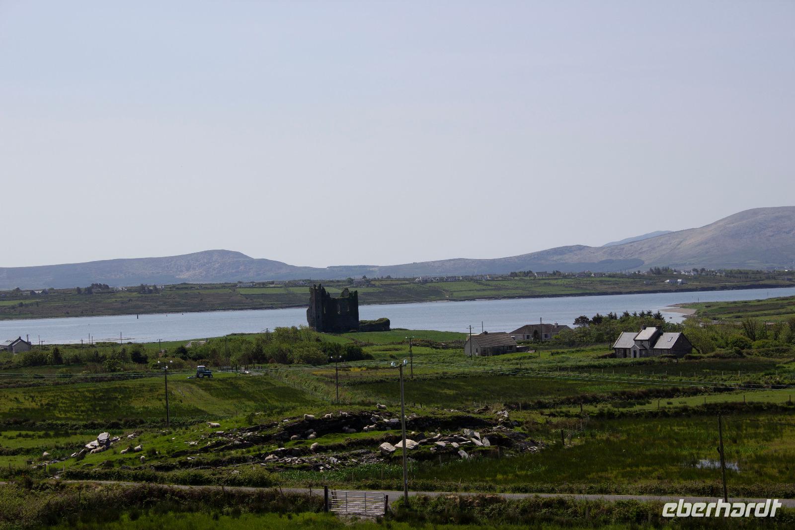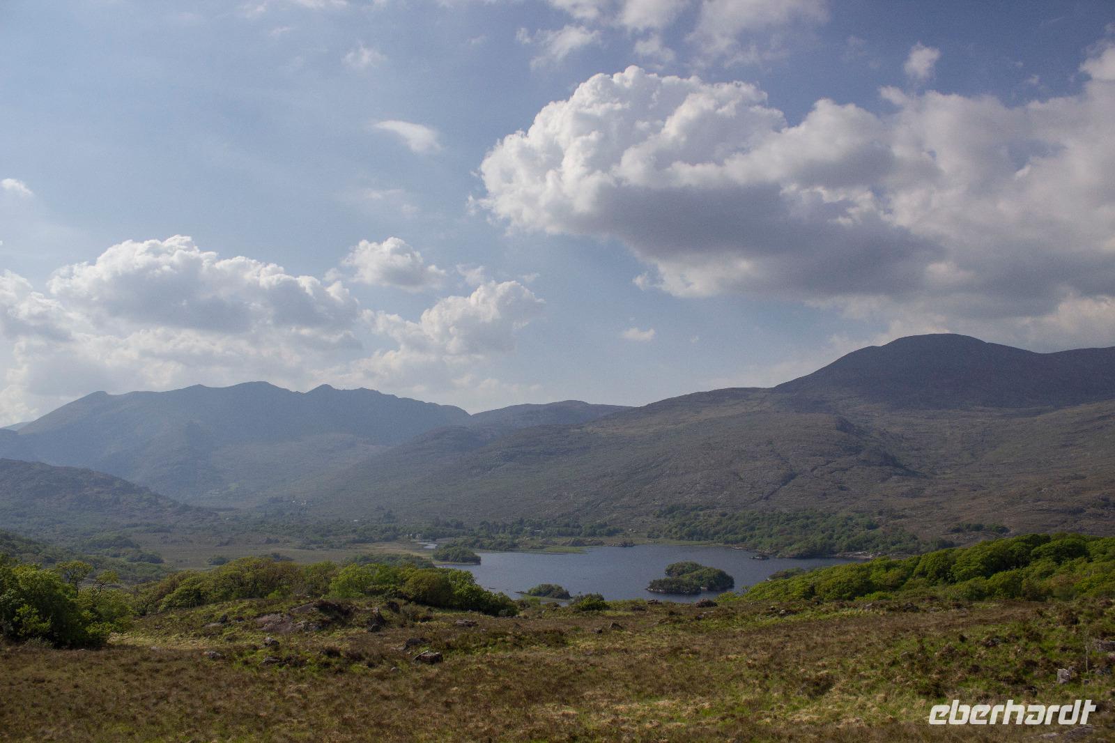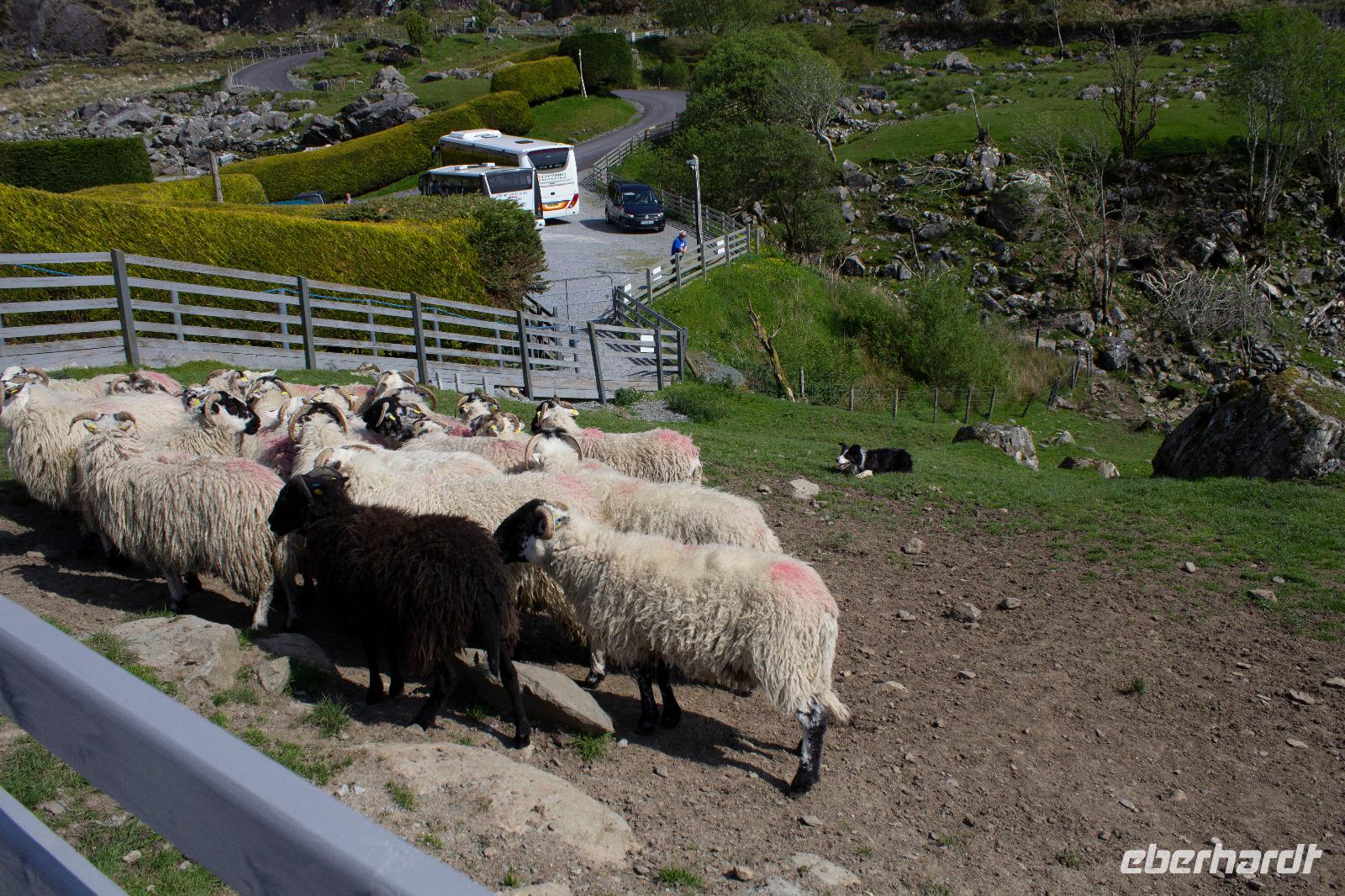 Nach dem Frühstück starteten wir zu unserer Rundfahrt auf dem Ring of Kerry, der einmal um die Halbinsel Iveragh herum führt. Zuerst ging es zum Muckross House, einem stattlichen Anwesen inmitten einer fantastischen Parkanlage. Die Landschaftsgestalter hatten bei der Bepflanzung des Anwesens ein wirklich gutes Gespür. Wir spazierten zum Muckross-See und von dort durch eine englische Parklandschaft zum Besucherzentrum. Anschließend fuhren wir beim Städtchen Killorglin auf die Iveragh-Halbinsel und machten wenige Kilometer nach der Stadt eine Kaffee-Pause am Red-Fox-Inn. Von dort ging es zur alten Eisenbahnstrecke der Western Railway, wo die Fotomodelle „Paddy", der Esel, und auf seinem Rücken „Rose", der Hund, bereits auf uns warteten. Anschließend fuhren wir nach Cahersiveen, der Geburtsstadt Daniel O'Connells. Außerhalb der Stadt, auf der anderen Seite des Flusses, liegt das Cahergall Stone Fort (Cathair Geal). Einige dieser Steinforts sind bis zu 2500 Jahre alt, dieses ca. 1000. Es war beeindruckend zu sehen, wie massiv das Fort errichtet wurde und wie akkurat die Steine aufgeschichtet worden sind. Vom Cahergall Stone Fort ging es weiter nach Waterville. Hier legten wir auch unsere Mittagspause ein und hatten Zeit für einen Spaziergang am steinigen Strand. Danach ging es zum Coomakesta Pass auf 210 m Höhe und nach einem weiteren kurzen Fotostopp oberhalb des Kenmare-Rivers nach Sneem, einem wegen seiner Sauberkeit mehrfach ausgezeichneten Städtchen. Hier fand jedes Jahr der nationale Wettbewerb im Woman-Carrying (Frauentragen) statt. Anschließend ging es über Molls Gap zum Aussichtspunkt „Ladys View" im Killarney-Nationalpark und danach zurück zu unserem Hotel in Tralee.