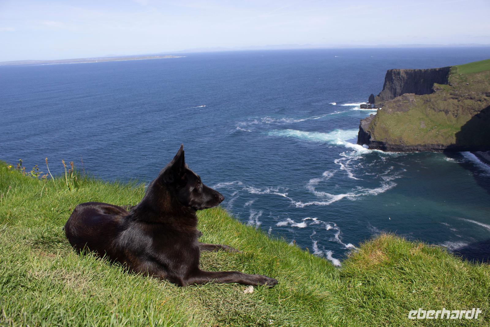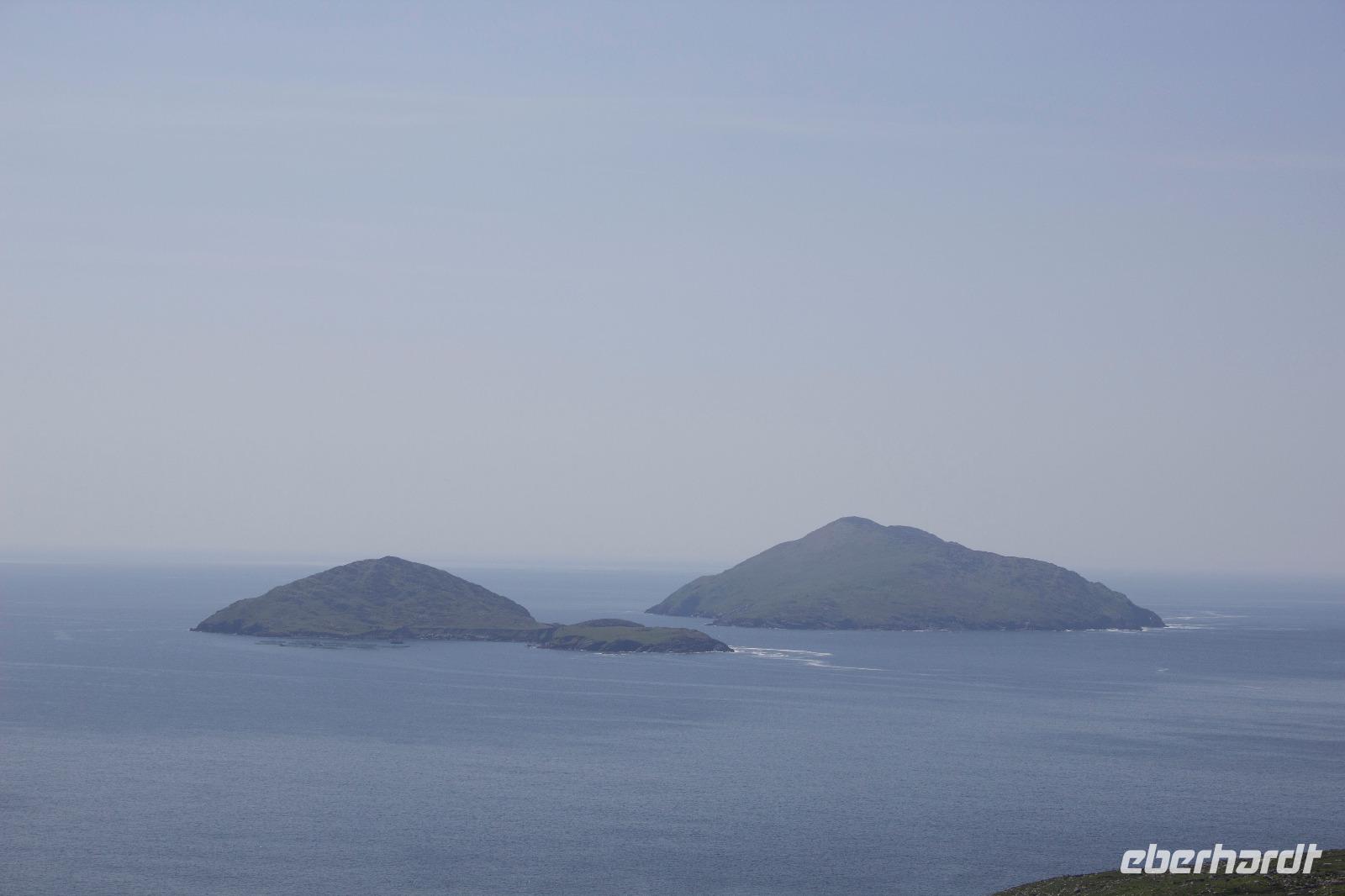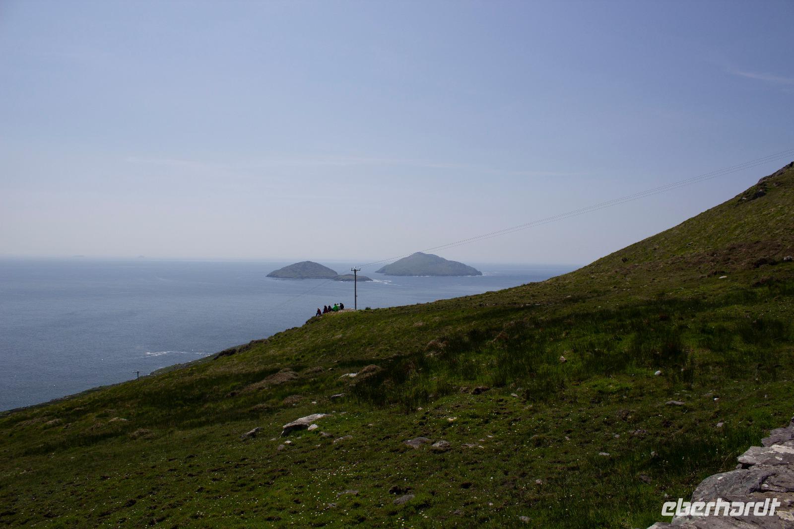 Nach dem Frühstück starteten wir zu unserer Rundfahrt auf dem Ring of Kerry, der einmal um die Halbinsel Iveragh herum führt. Zuerst ging es zum Muckross House, einem stattlichen Anwesen inmitten einer fantastischen Parkanlage. Die Landschaftsgestalter hatten bei der Bepflanzung des Anwesens ein wirklich gutes Gespür. Wir spazierten zum Muckross-See und von dort durch eine englische Parklandschaft zum Besucherzentrum. Anschließend fuhren wir beim Städtchen Killorglin auf die Iveragh-Halbinsel und machten wenige Kilometer nach der Stadt eine Kaffee-Pause am Red-Fox-Inn. Von dort ging es zur alten Eisenbahnstrecke der Western Railway, wo die Fotomodelle „Paddy", der Esel, und auf seinem Rücken „Rose", der Hund, bereits auf uns warteten. Anschließend fuhren wir nach Cahersiveen, der Geburtsstadt Daniel O'Connells. Außerhalb der Stadt, auf der anderen Seite des Flusses, liegt das Cahergall Stone Fort (Cathair Geal). Einige dieser Steinforts sind bis zu 2500 Jahre alt, dieses ca. 1000. Es war beeindruckend zu sehen, wie massiv das Fort errichtet wurde und wie akkurat die Steine aufgeschichtet worden sind. Vom Cahergall Stone Fort ging es weiter nach Waterville. Hier legten wir auch unsere Mittagspause ein und hatten Zeit für einen Spaziergang am steinigen Strand. Danach ging es zum Coomakesta Pass auf 210 m Höhe und nach einem weiteren kurzen Fotostopp oberhalb des Kenmare-Rivers nach Sneem, einem wegen seiner Sauberkeit mehrfach ausgezeichneten Städtchen. Hier fand jedes Jahr der nationale Wettbewerb im Woman-Carrying (Frauentragen) statt. Anschließend ging es über Molls Gap zum Aussichtspunkt „Ladys View" im Killarney-Nationalpark und danach zurück zu unserem Hotel in Tralee.