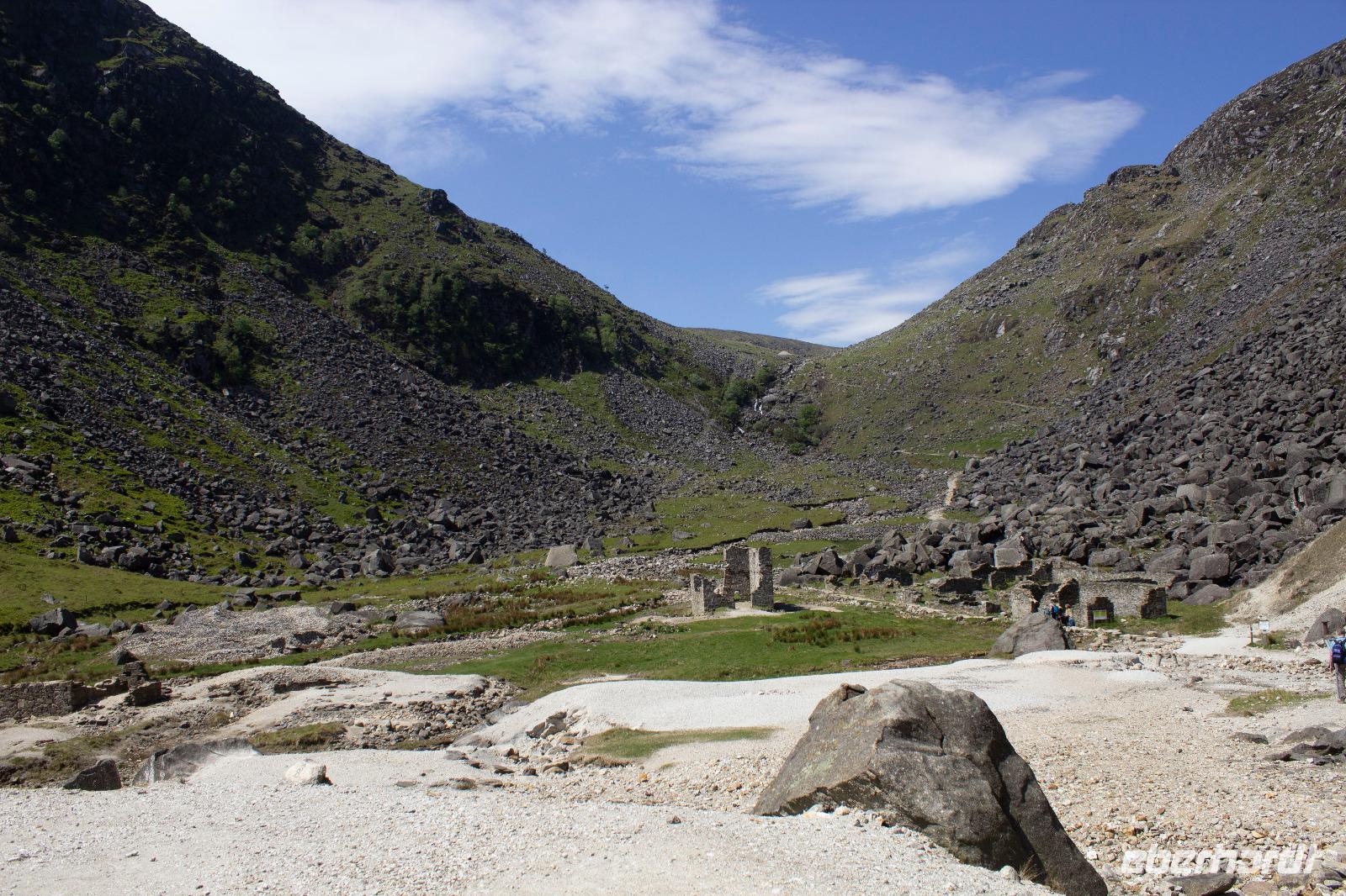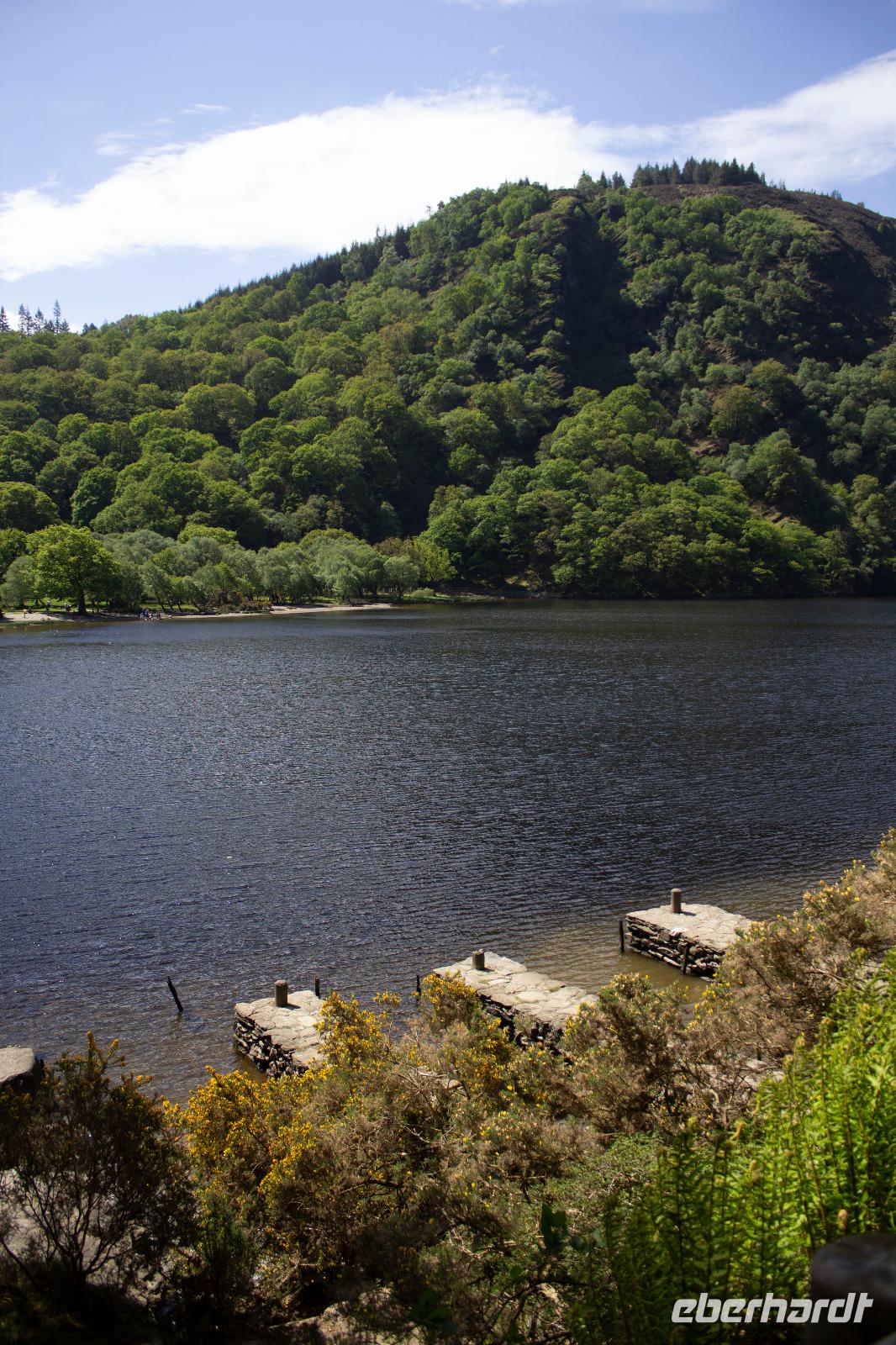 Von der Klostersiedlung wanderten wir bis zum Oberen See. Wer einen kleinen Wasserfall sehen wollte, der konnte über Treppen zu ihm gelangen. Anschließend wanderten wir am See entlang. Ein Hinweisschild am Wegesrand wies auf das Bett des heiligen Kevin, einer Felsnische am gegenüberliegenden Ufer. Er lebte hier als Eremit und war der Gründer des Klosters. Am Ende des oberen Sees begann ein stillgelegtes Bergbaugebiet, in dem früher Blei und Silber abgebaut wurden. Wir gingen bis zu den Ruinen des Bergarbeiterdorfes und machten dort eine Pause. Einige von uns liefen noch ein Stück weiter den Berg hinauf, um die Aussicht auf das Tal und den See von oben zu genießen. Wieder unten angekommen, machten wir gemeinsam Picknick und wanderten danach zurück zum Besucherzentrum.