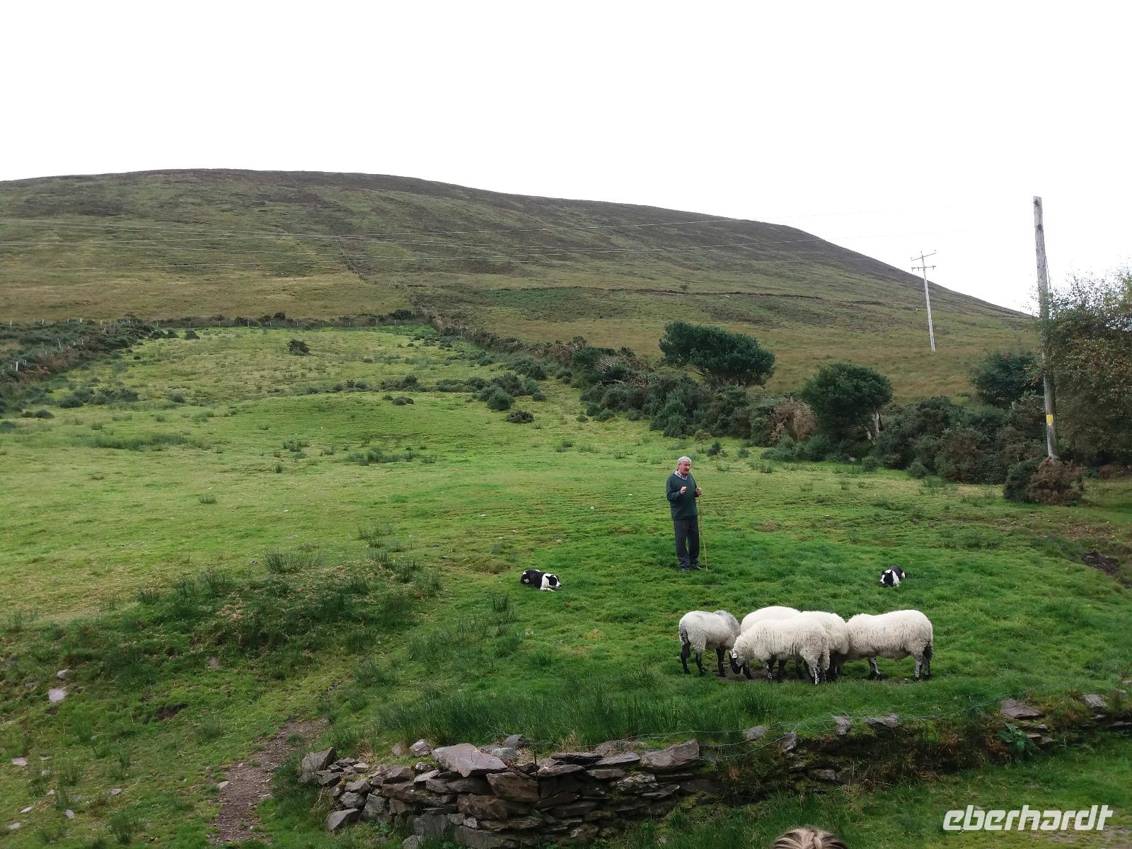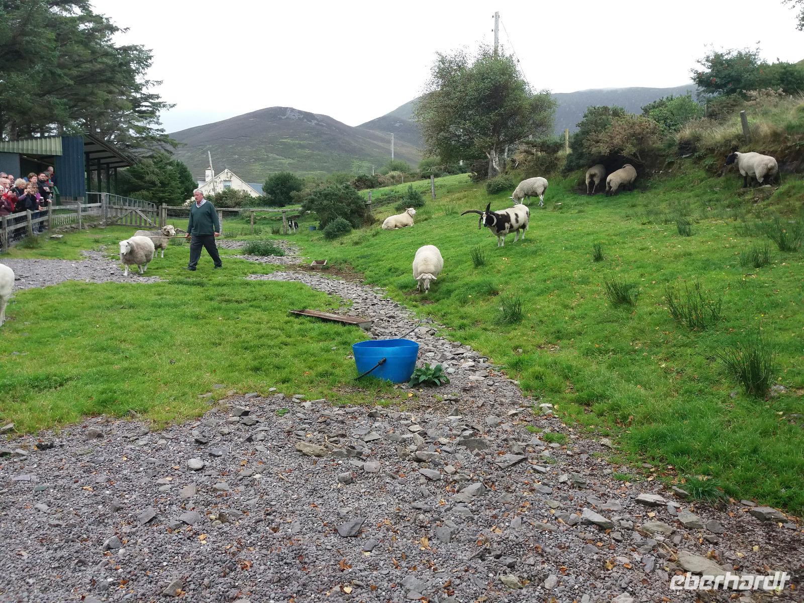 Heute erwartet uns der Ring of Kerry, eine Panoramaküstenstraße in der Grafschaft Kerry welche uns einmal um die Halbinsel Iveragh führt. Unser örtlicher Reiseleiter Jan erwartet uns schon an unserem Treffpunkt in Farranfore und gemeinsam machen wir uns auf den Weg zu unserer ersten Aktivität des Tages: die Brendan Ferris Schaffarm. Hier sehen wir die verschiedenen Schafrassen von Irland und erfahren welche Wolle wie weiterverarbeitet wird. Und natürlich bekommen wir auch eine beeindruckende Vorführung mit zwei Border Collies welche die Schafe von A nach B treiben. Im dazugehörigen Laden kann man noch ein bisschen Geld loswerden (auch ich kann den tollen Jacken nicht wiederstehen!) und ein bisschen schlauer als zuvor geht es für uns weiter. Als nächstes schauen wir uns das Steinfort Cahergall an. Während Jan uns interessante Informationen zur Entstehung und dem Nutzen eines solchen Steinforts gibt, können wir auf den hohen Mauern einen tollen Ausblick genießen. Unsere heutige Mittagspause verbringen wir damit in Waterville unsere Kräfte zu sammeln. Unsere anschließende Wanderung führt uns über ein paar Zäune hinweg und am Strand entlang. Bevor uns die Piraten am Derrynane House auf die Schliche kommen geht es im Bus weiter zu dem bekannten Aussichtspunkt Ladies' View. Unser Aufenthalt wird passenderweise von den Klängen eines Dudelsacks begleitet. Der letzte Stopp an diesem ereignisreichen Tag ist das Muckross House im Killarney-Nationalpark. Das schlossgleiche Herrenhaus wurde 1843 fertig gestellt und befindet sich direkt am Ufer des Muckross Lake.