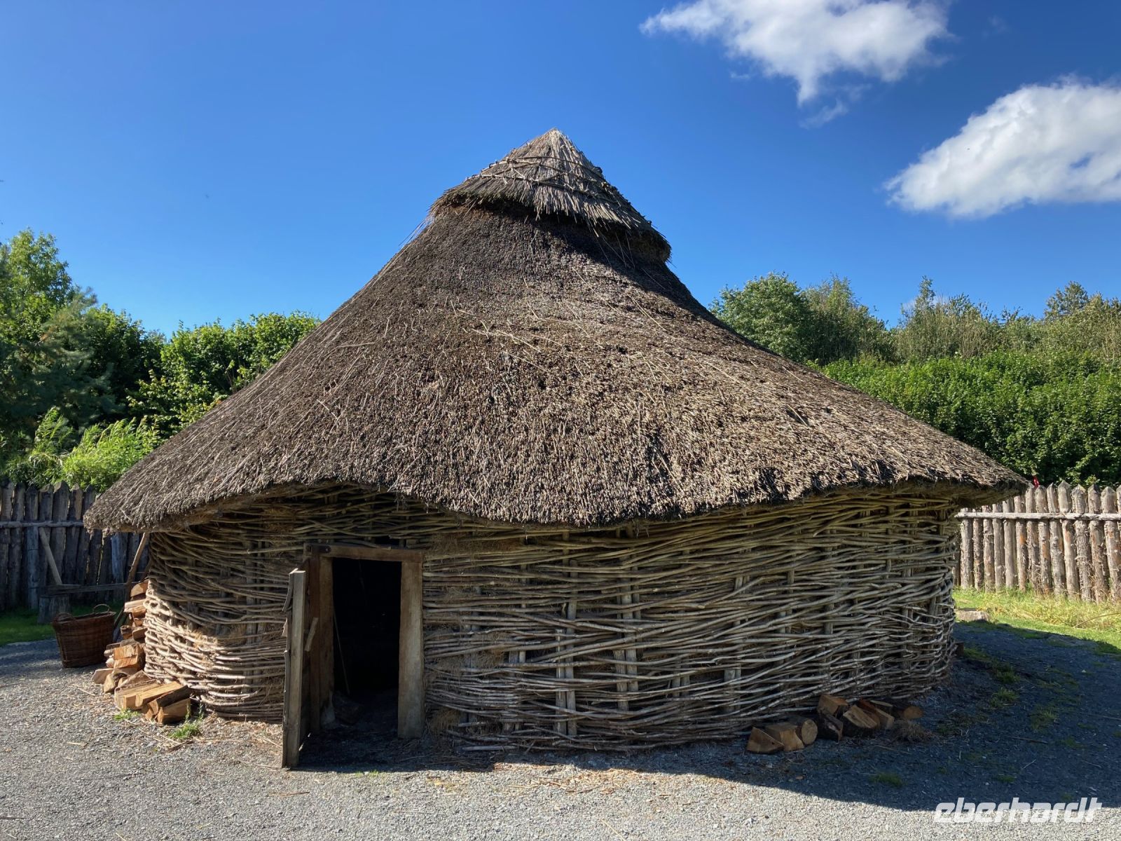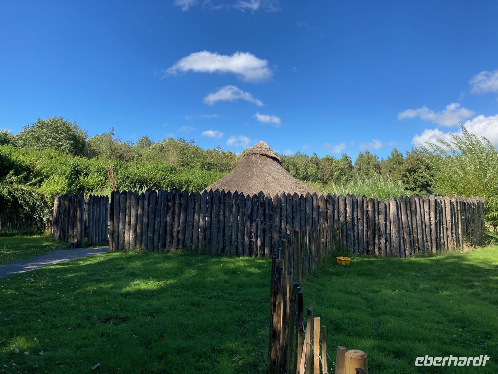 Unser Stammfahrer Donal übernimmt heute das Kommando und die Kontrolle hinter dem Steuer. Es geht hinaus aus Dublin Richtung Norden. Nach einer Stunde Fahrt erreichen wir den Hill of Slane, auf dem der Heilige Patrick 433 das erste Osterfeuer Irlands entfacht hat. Auch heute ist das Wetter besser als erwartet und wir können bei strahlendem Sonnenschein weit ins grüne Land blicken. Von den Nachfolgern des Nationalheiligen wurden viele Klöster gegründet, darunter auch das Kloster Monasterboice, von dem heute nur noch die Ruinen des Rundturms und mehrerer kleiner Kirchen zeugen. Gleichwohl finden sich hier die am besten erhaltenen Hochkreuze, die sinnbildlich als Symbol für das frühchristliche Irland stehen. Es geht noch weiter nach Norden, denn unser Ziel ist am Ende des Tages die Stadt Letterkenny im County Donegal. Nach einer Kaffee- und Tankpause bei Dundalk fahren wir frisch gestärkt zum Navan Fort. Die Energie brauchen wir auch dringend, denn nach einer feierlichen Begrüßung mit Met und Brot im Nachbau eines Familienhauses aus dem Jahr 65 n. Chr. und einer Einführung in die keltischen Sitten und Gebräuche werden wir zu waschechten Ulster-Kriegern ausgebildet. Nun können wir uns mit Speer, Schwert und Kampfgebrüll auf die vielen Feinde in den südlichen Provinzen stürzen — oder in die Schlacht am Frühstücksbuffet! Ein Aufstieg auf den großen Hügel aus Kalksteinen, die einst aus ganz Ulster zusammengetragen wurden, eine Filmvorführung im Kino und eine Kaffeepause runden den interessanten und amüsanten Besuch dieser kulturhistorisch bedeutsamen Stätte ab. Der angekündigte Regen wartet höflicherweise bis zum Ende unseres Besuchs. Quer durch Nordirland fährt Donal unsere Busladung Wetterengel anschließend bis zum Station House Hotel in Letterkenny.