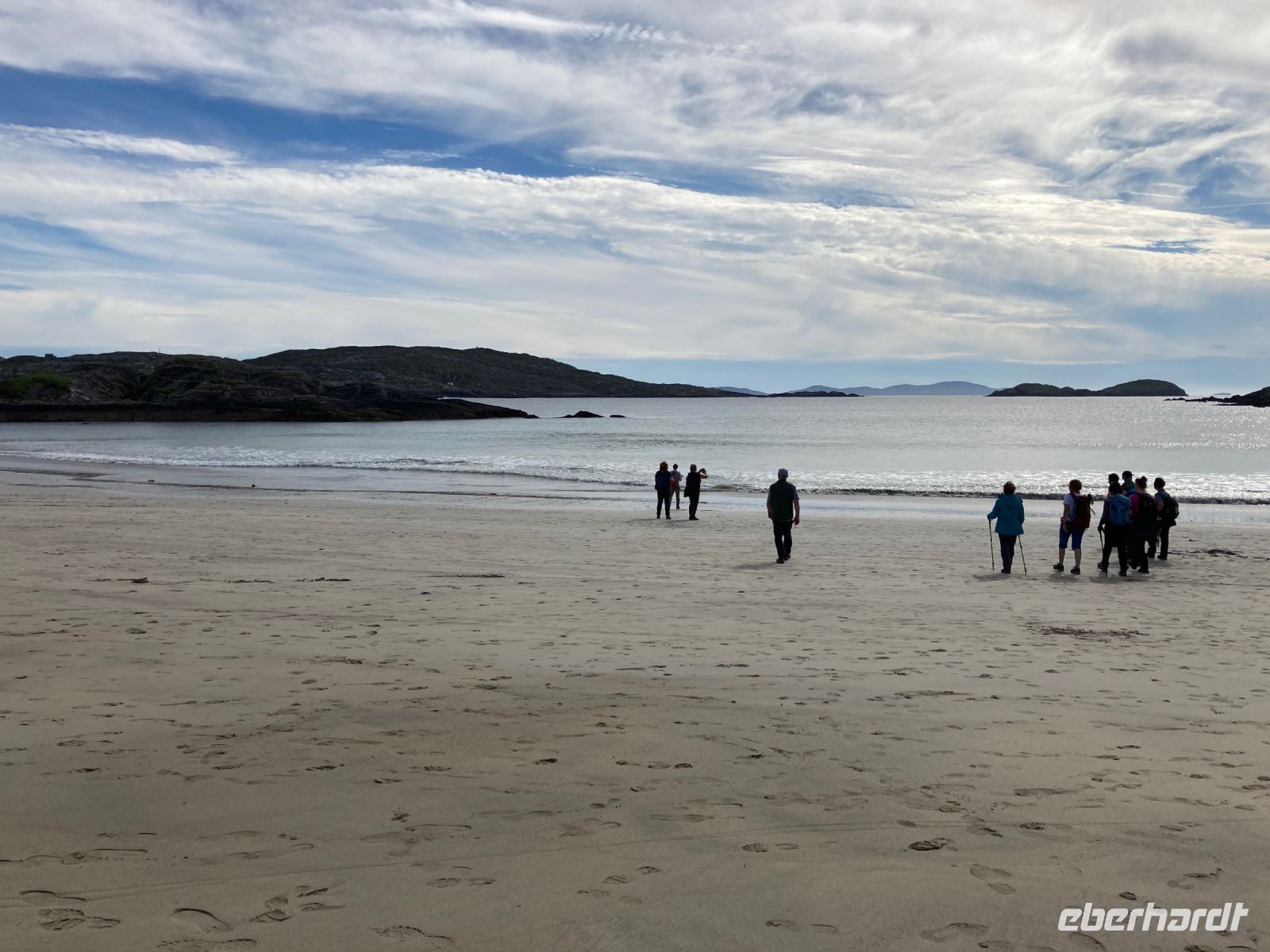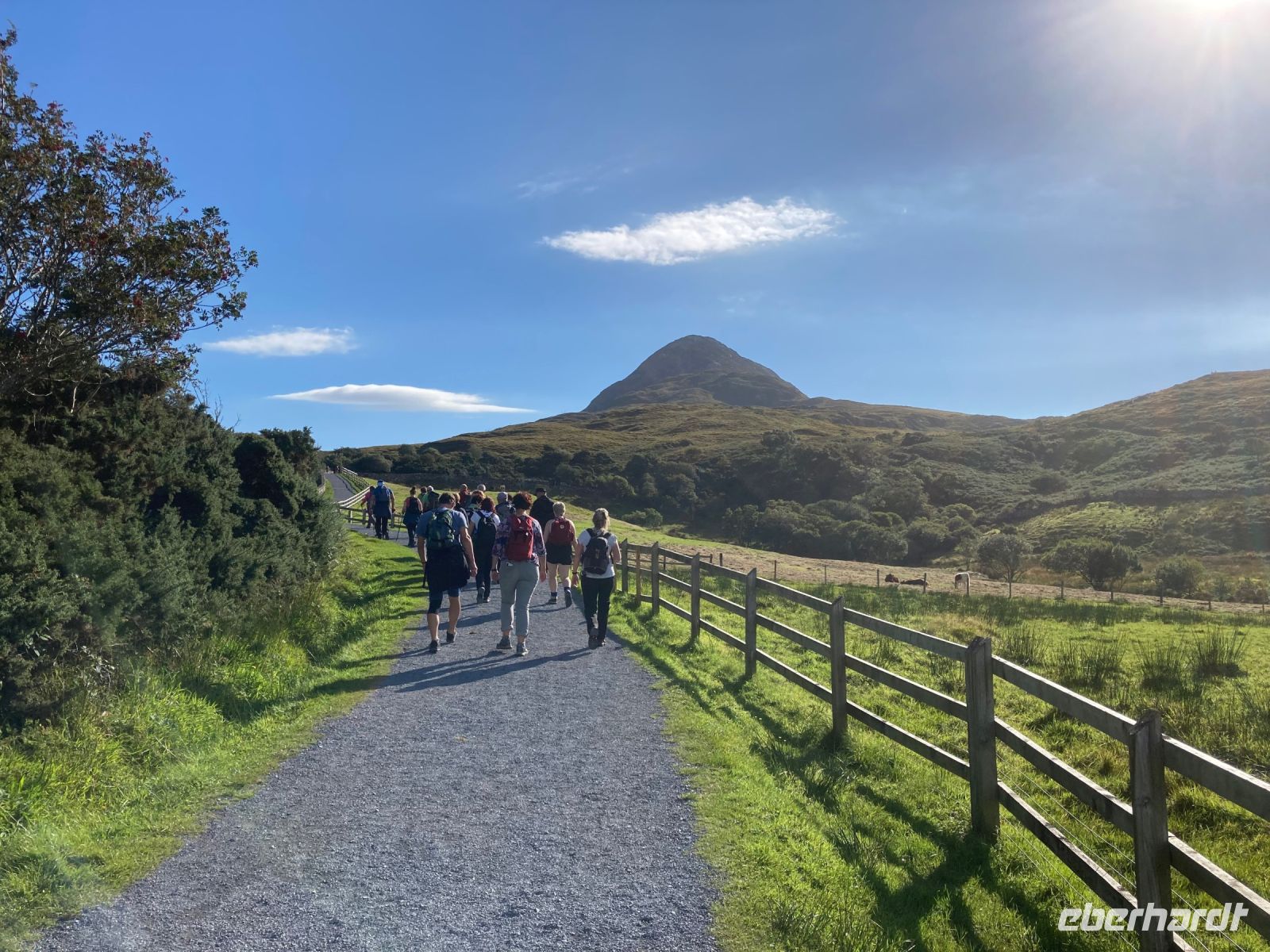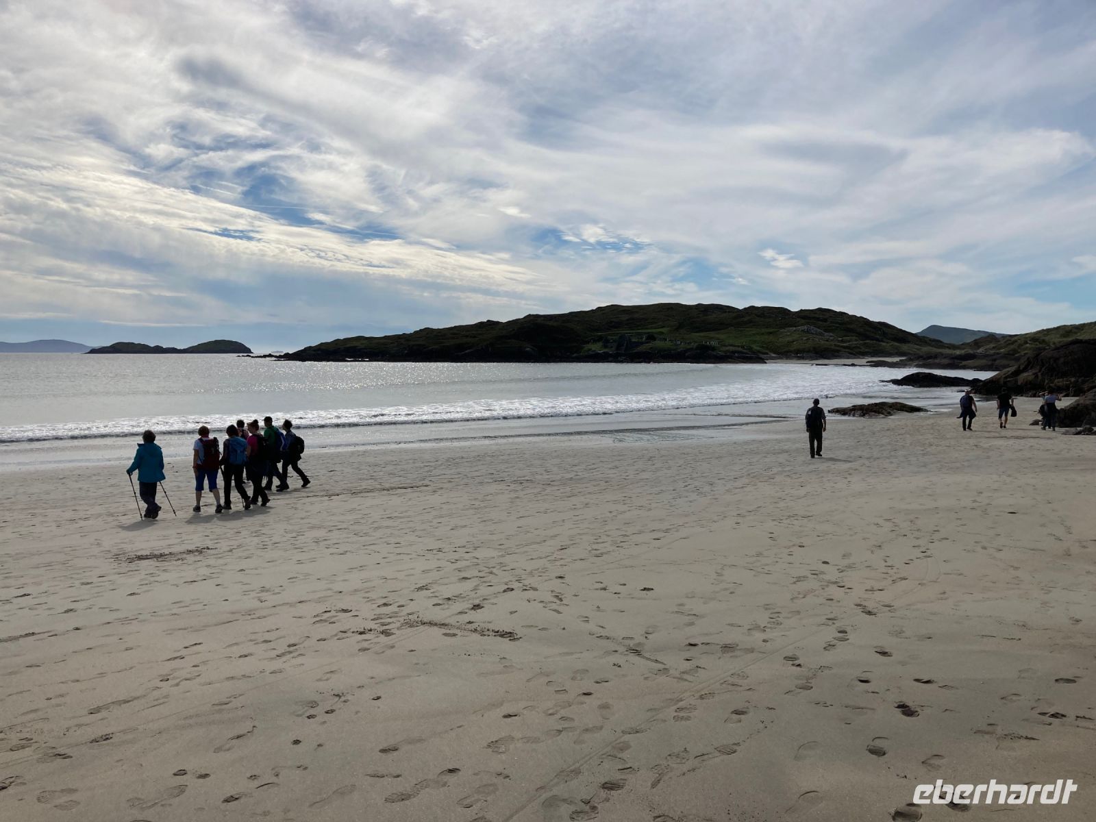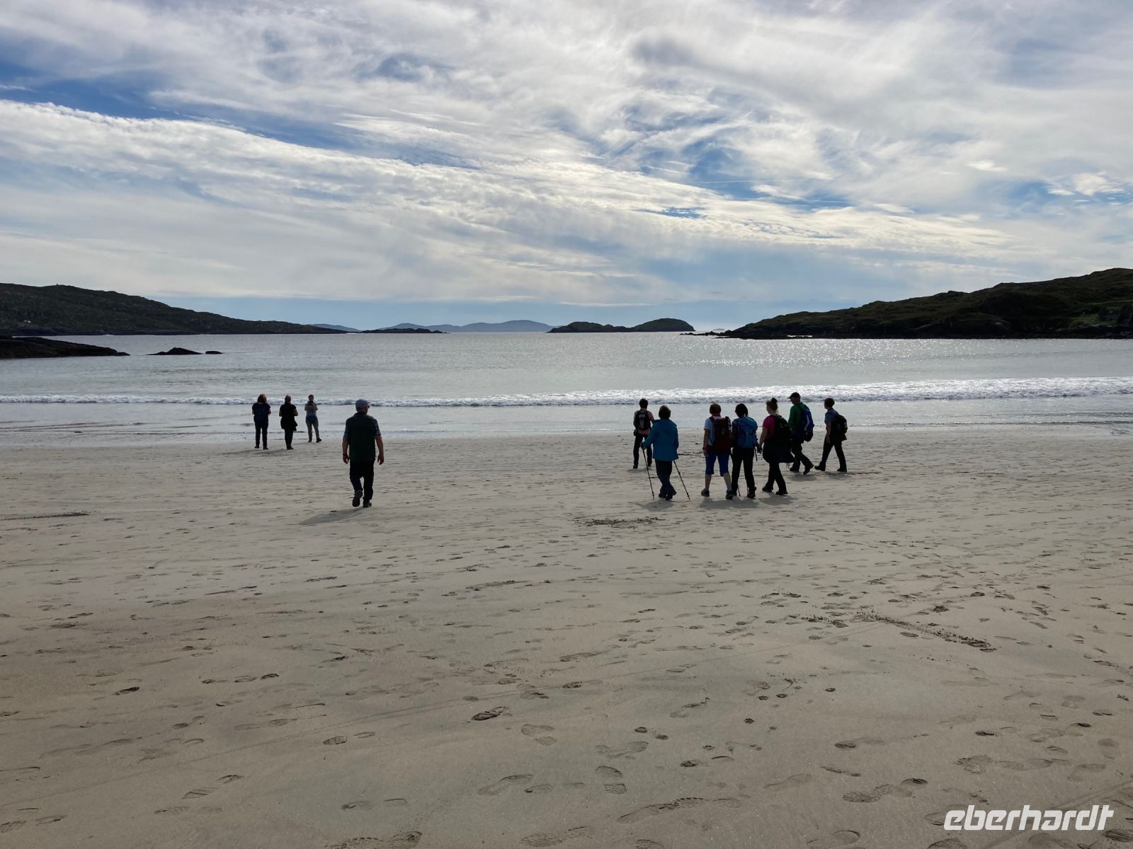 Gleich zwei Geburtstagskinder habe ich heute in meiner Reisegruppe. Sie bekommen natürlich zum Ehrentag eine kleine Aufmerksamkeit — und auch ein kleines Ständchen vom Eberhardt-Reisechor. Wie schön, dass heute auch unsere erste Wanderung ansteht. Dazu fahren wir in den wunderschönen Glenveagh-Nationalpark im Herzen Donegals. Ein moderner elektrischer Shuttlebus bringt uns zum kleinen Schlösschen, an dem unsere Wanderung beginnt. Sie führt entlang des Sees durch ein kleines Stückchen Urwald bis zu einer ehemaligen Fischerhütte, in der die Eigentümer des Glenveagh Castle früher ihrer Angelausrüstung verstauten. Nach einer kurzen Stärkungspause laufen wir zurück, warten unter dem Dach einer Schutzhütte kurz den kleinen Nieselregenschauer ab und wagen dann den Aufstieg zum Aussichtspunkt. Die Anstrengung wird mit Sonnenschein und einer fantastischen Aussicht über das ganze Tal belohnt. Wir sehen sogar einen Regenbogen! Der Abstieg führt uns dann direkt in den viktorianischen Garten. Wer möchte, kann vier weitere Kilometer zurück zum Besucherzentrum laufen, oder sich im Café ein Stück Schokoladenkuchen gönnen und dann den Shuttlebus nehmen. Auf dem Rückweg nach Letterkenny fahren wir einen Umweg, der uns am Mount Errigal vorbei bis zum wunderschönen Strand von Dunfanaghy an der Sheephaven Bay führt, den wir fast ganz für uns allein haben. Einige besonders mutige Gäste stürzen sich sogar in die Fluten des Nordatlantiks. Nachdem wir alle bei diesem Strandbesuch neue Energie getankt haben, fährt uns Donal durch den einsetzenden irischen Regen zurück nach Letterkenny. Wieder einmal haben wir Glück gehabt, dass der Regen bis zum Ende des Programms gewartet hat.