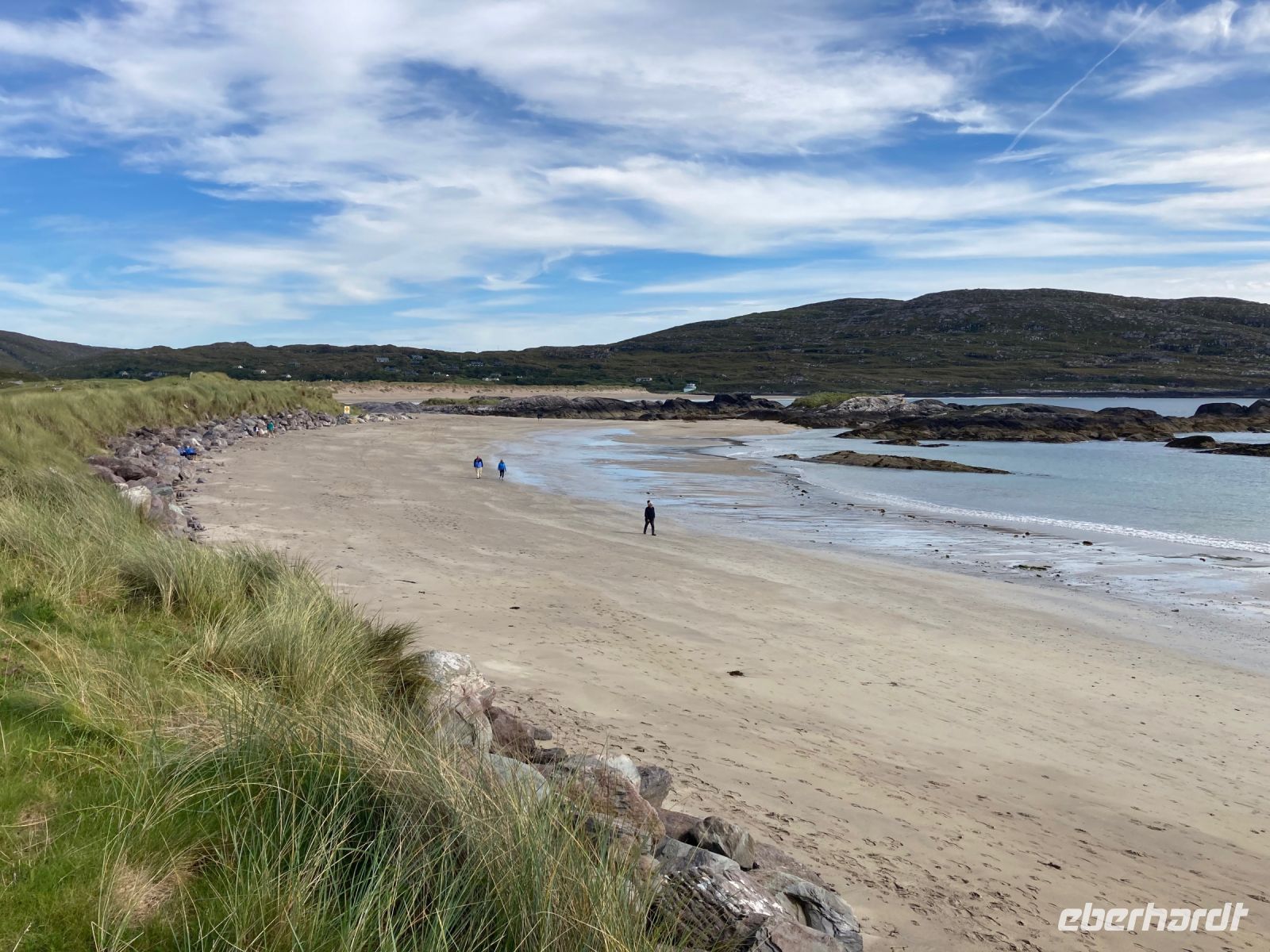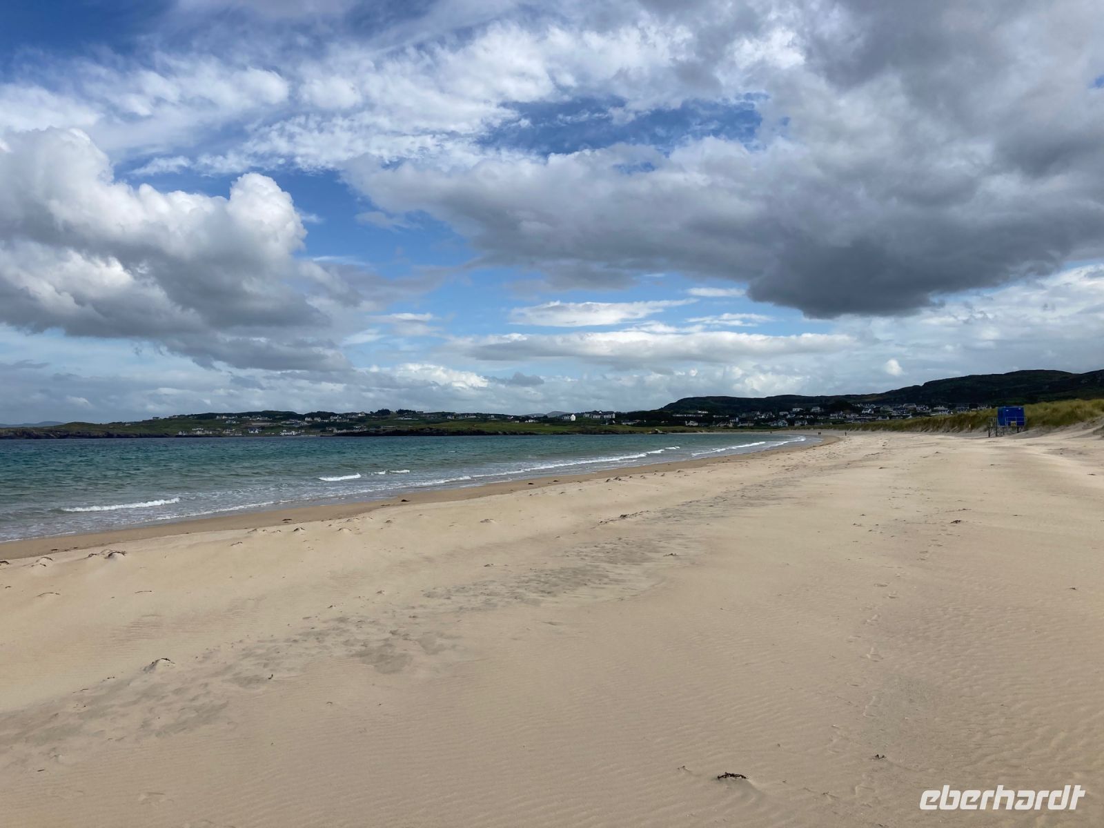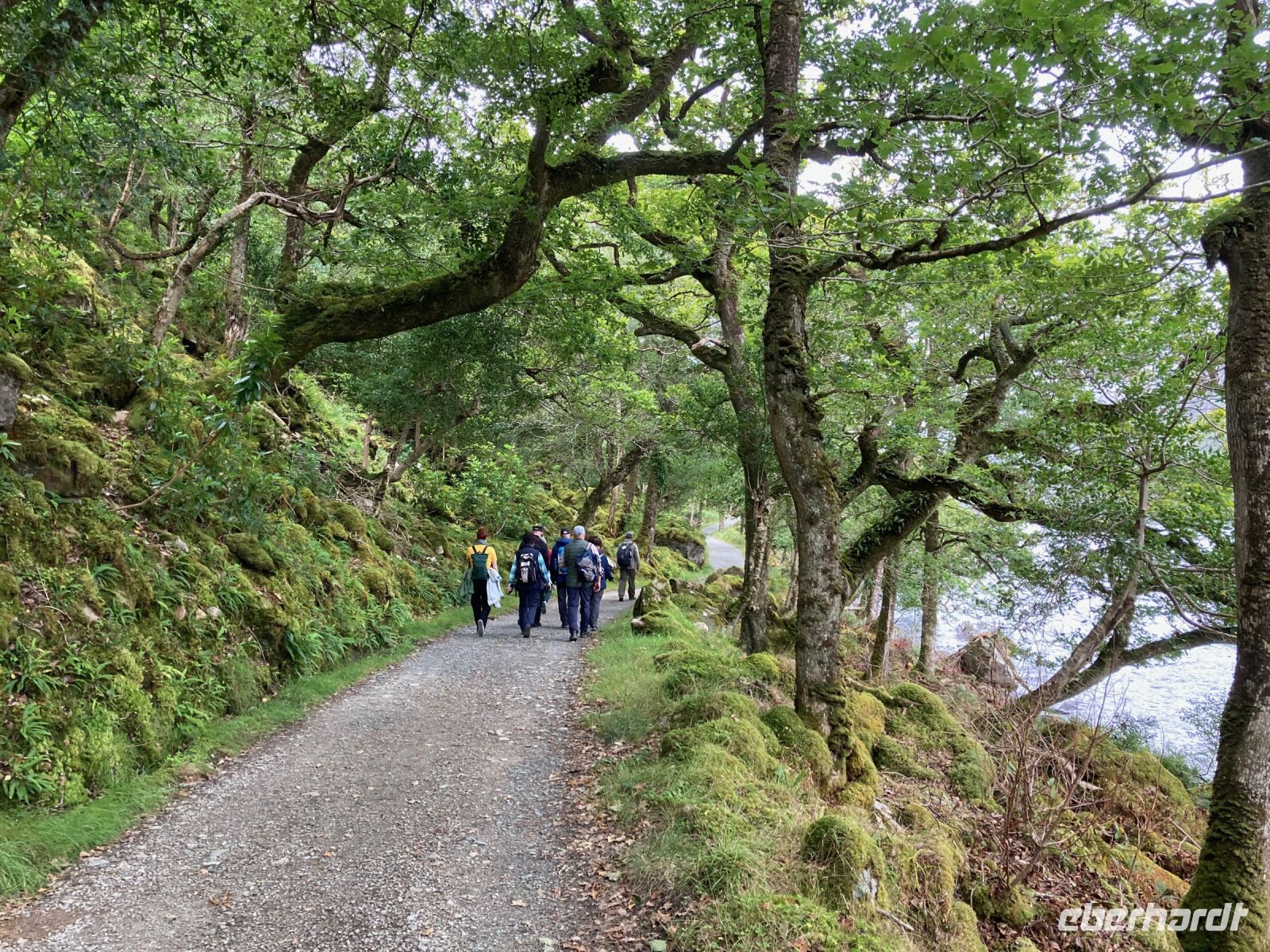 Gleich zwei Geburtstagskinder habe ich heute in meiner Reisegruppe. Sie bekommen natürlich zum Ehrentag eine kleine Aufmerksamkeit — und auch ein kleines Ständchen vom Eberhardt-Reisechor. Wie schön, dass heute auch unsere erste Wanderung ansteht. Dazu fahren wir in den wunderschönen Glenveagh-Nationalpark im Herzen Donegals. Ein moderner elektrischer Shuttlebus bringt uns zum kleinen Schlösschen, an dem unsere Wanderung beginnt. Sie führt entlang des Sees durch ein kleines Stückchen Urwald bis zu einer ehemaligen Fischerhütte, in der die Eigentümer des Glenveagh Castle früher ihrer Angelausrüstung verstauten. Nach einer kurzen Stärkungspause laufen wir zurück, warten unter dem Dach einer Schutzhütte kurz den kleinen Nieselregenschauer ab und wagen dann den Aufstieg zum Aussichtspunkt. Die Anstrengung wird mit Sonnenschein und einer fantastischen Aussicht über das ganze Tal belohnt. Wir sehen sogar einen Regenbogen! Der Abstieg führt uns dann direkt in den viktorianischen Garten. Wer möchte, kann vier weitere Kilometer zurück zum Besucherzentrum laufen, oder sich im Café ein Stück Schokoladenkuchen gönnen und dann den Shuttlebus nehmen. Auf dem Rückweg nach Letterkenny fahren wir einen Umweg, der uns am Mount Errigal vorbei bis zum wunderschönen Strand von Dunfanaghy an der Sheephaven Bay führt, den wir fast ganz für uns allein haben. Einige besonders mutige Gäste stürzen sich sogar in die Fluten des Nordatlantiks. Nachdem wir alle bei diesem Strandbesuch neue Energie getankt haben, fährt uns Donal durch den einsetzenden irischen Regen zurück nach Letterkenny. Wieder einmal haben wir Glück gehabt, dass der Regen bis zum Ende des Programms gewartet hat.