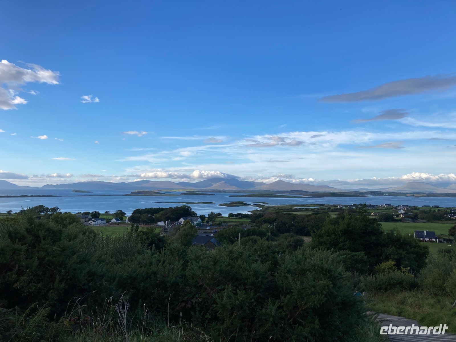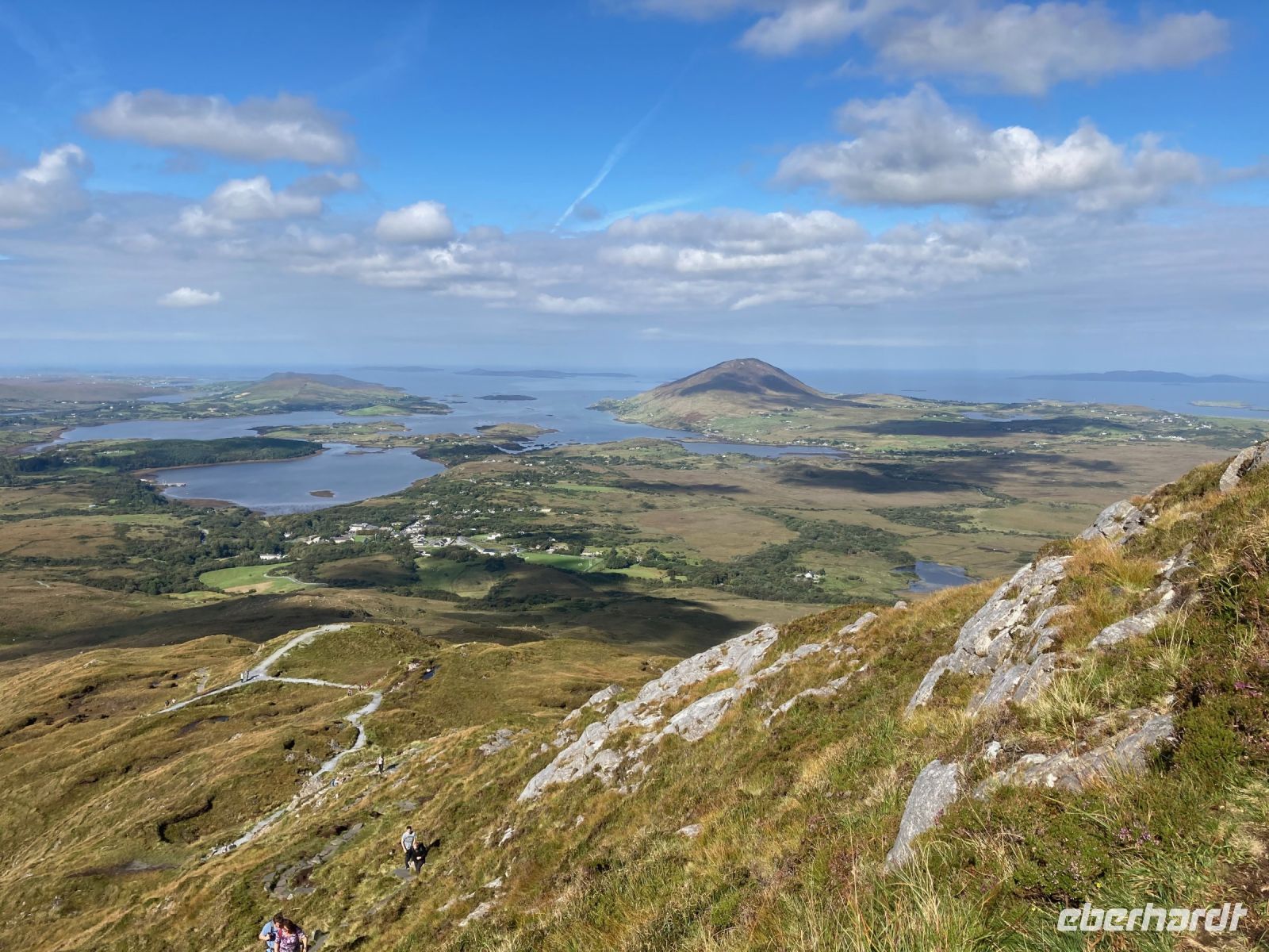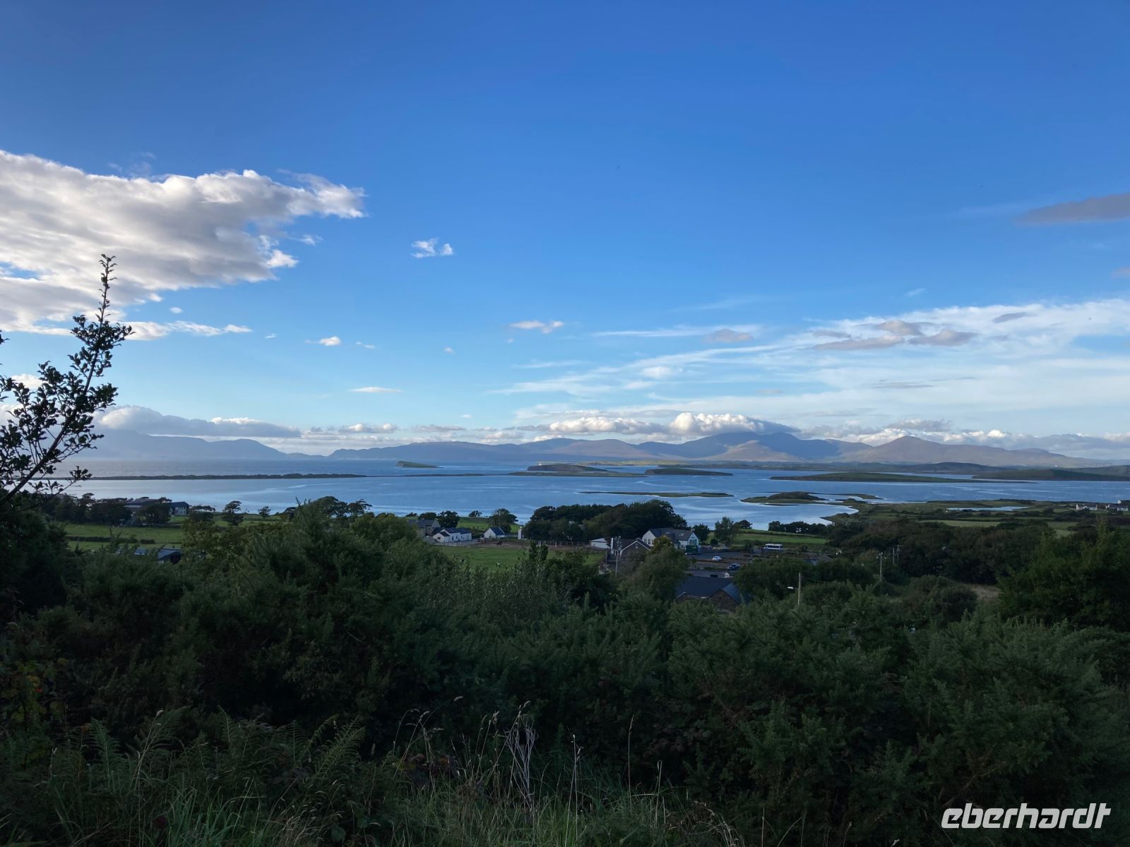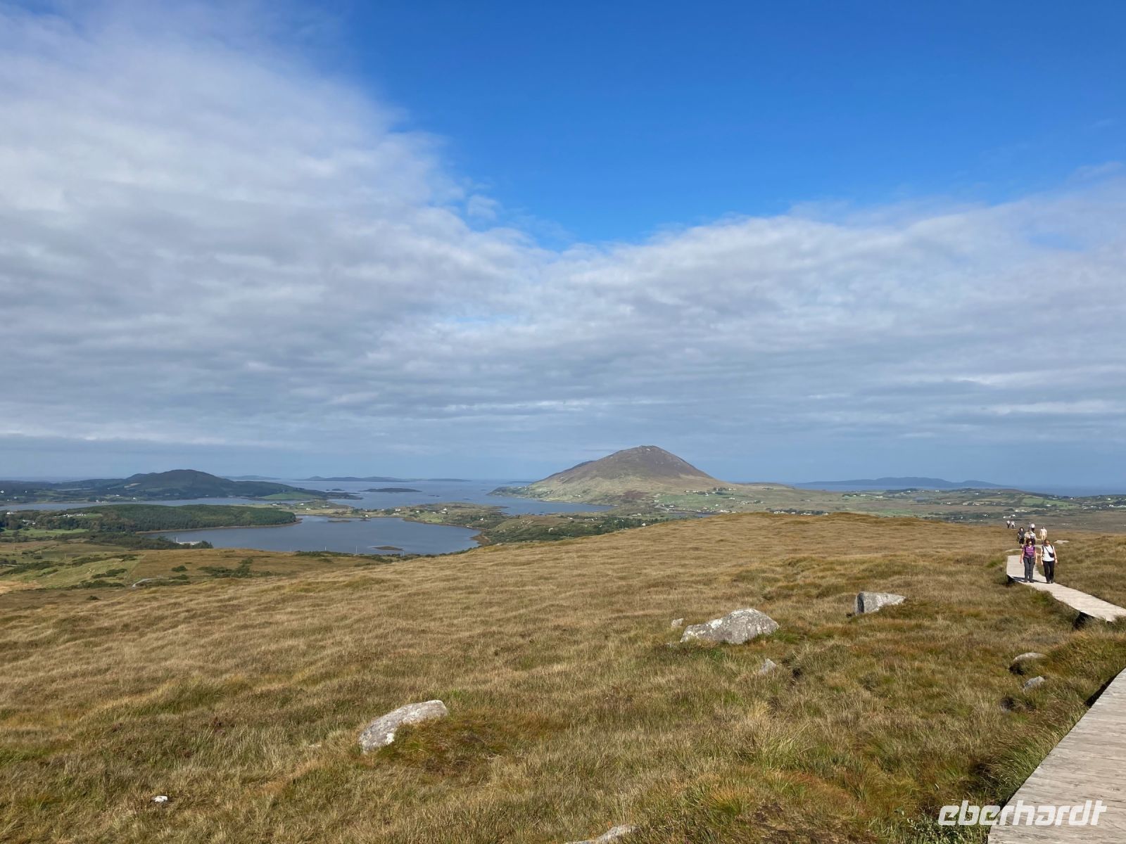 Am fünften Tag unserer Reise verlassen wir Letterkenny am Morgen mit unserem Gepäck und beginnen unsere Reise in den Süden. In Donegal machen wir die erste Pause und begucken das beschauliche Städtchen mit seinem Hauptplatz “The Diamond”. Zudem kaufen wir Verpflegung für die Mittagspause ein. War es anfangs noch bewölkt, klart der Himmel im Laufe des Tages immer weiter auf. Perfekte Bedingungen also für unsere Wanderung um die Halbinsel von Mullaghmore. Sie führt uns unterhalb des Classiebawn Castle an der Küstenstraße entlang, mit Ausblicken auf den Ben Bulben und die Klippen von Slieve League am Horizont, und endet am alten Hafen. Da wir auf der Reise leider die Ganggräber am Boyne Valley nicht besuchen konnten, habe ich uns stattdessen spontan einen Besichtigungstermin für das Gräberfeld von Carrowmore in der Nähe von Sligo buchen lassen. Es liegt unweit des Hügels Knocknarea, auf dem deutlich das angebliche Grab der Kriegerkönigin Maeve zu sehen ist. Wer mag wohl unter den vielen Grabhügeln aus der Jungsteinzeit beerdigt worden sein? Priester? Die herrschende Elite? Könige? Wir wissen nur wenig über die Menschen, die zu jener Zeit auf der Insel siedelten. Bei der Rückkehr zum Bus wartet leider Donal mit einer schlechten Nachricht auf uns. Das bereits seit dem Morgen aufgetretene Kühlwasserproblem hat sich verschlimmert, der Motor überhitzt. Mit diesem Bus können wir heute nicht weiterfahren. (Später wird sich herausstellen, dass die Kühlwasserpumpe kaputt ist.) Doch Willy, der Chef des Busunternehmens, lässt uns nicht hängen. Eine Stunde später kommt schon ein Ersatzbus. Es ist zwar „nur“ ein mittelgroßer Linienbus und wir müssen mit dem Gepäck ein bisschen improvisieren, aber wenigstens kommen wir weiter. Und für einen Bummel in der hübschen kleinen ehemaligen Hafenstadt Westport bleibt am Nachmittag auch noch Zeit. Auch den Croagh Patrick besuchen wir noch und laufen hinauf bis zum Aussichtspunkt mit Blick über die Clew Bay mit ihren vielen kleinen Inseln. Und dann erreichen wir unser Hotel am Fjord inmitten der Berge Connemaras. Ein Anblick, der mein Herz zum Hüpfen bringt. Das leckere Abendessen, vielleicht das beste der ganzen Reise, entschädigt zudem für alle Strapazen.