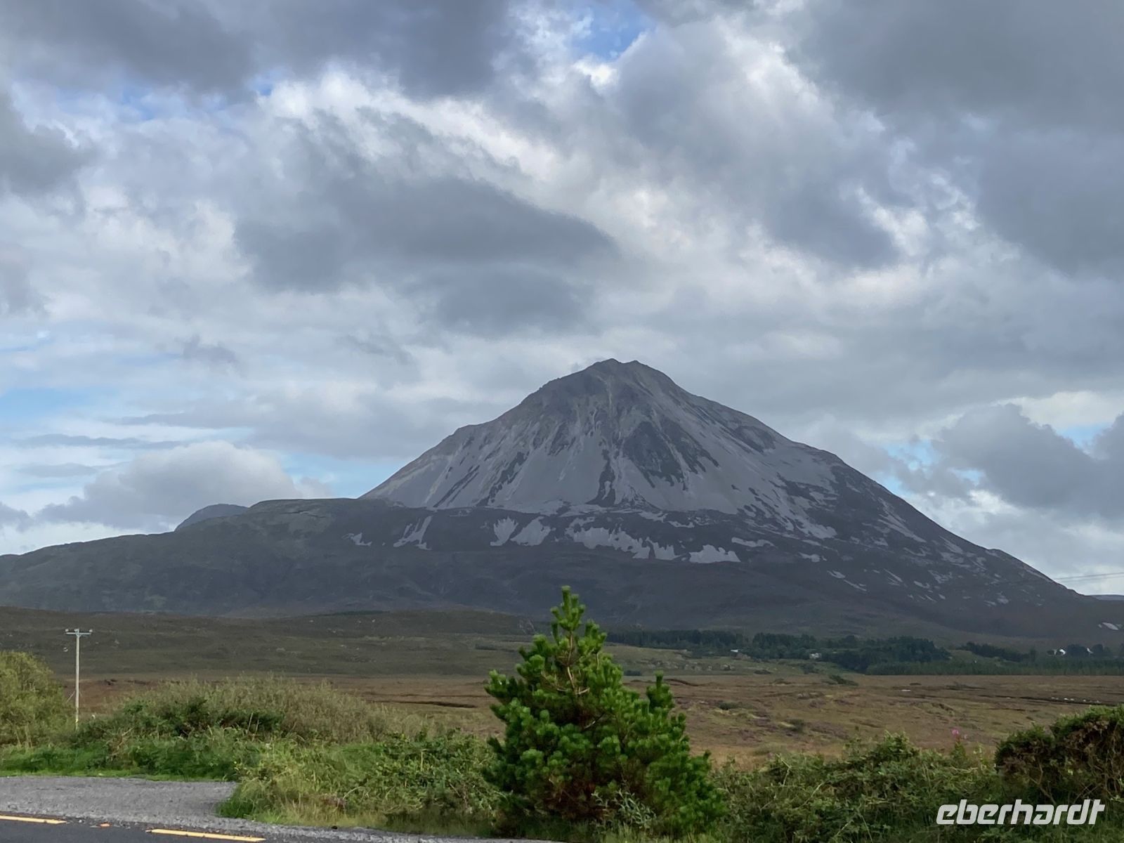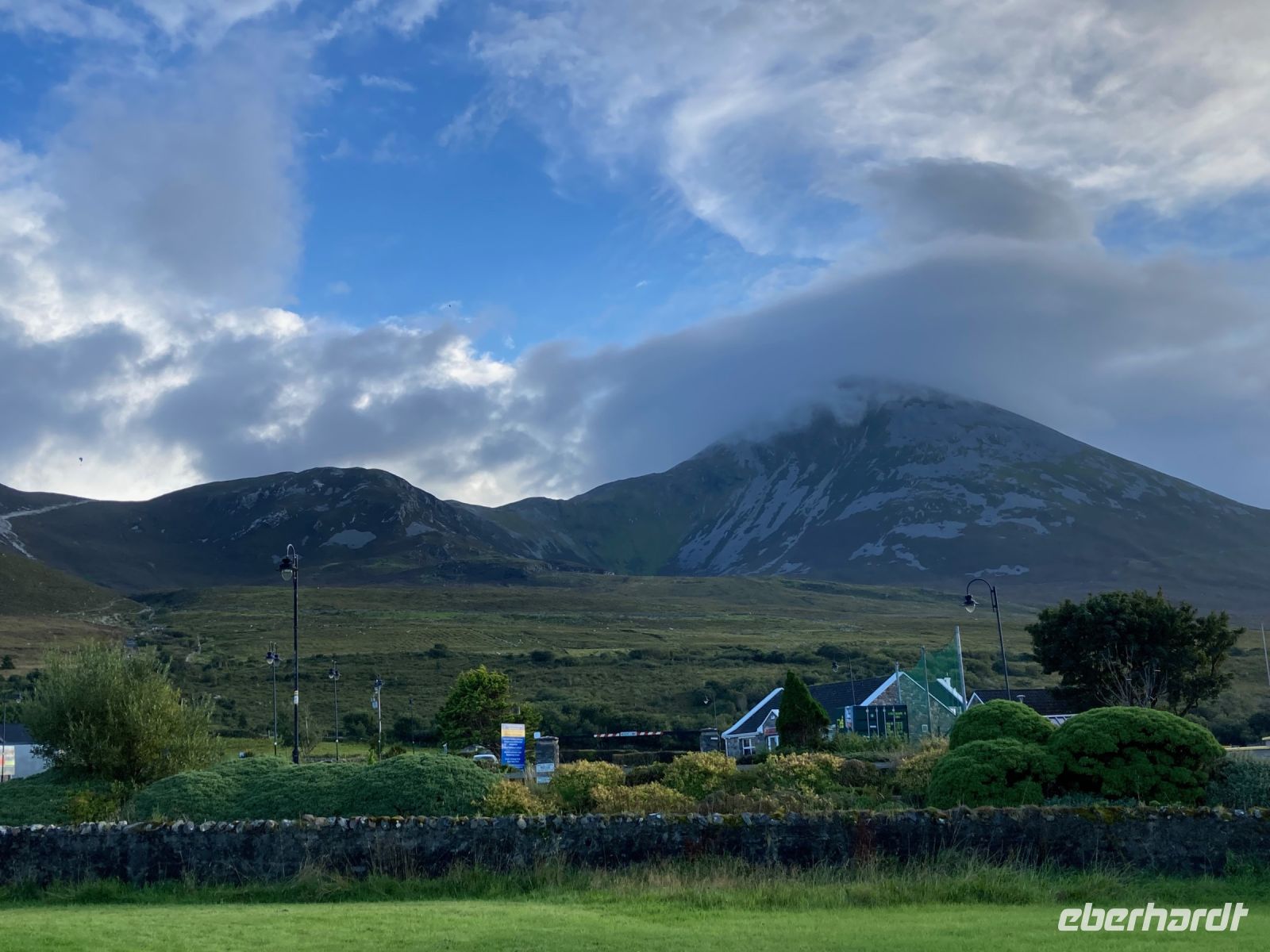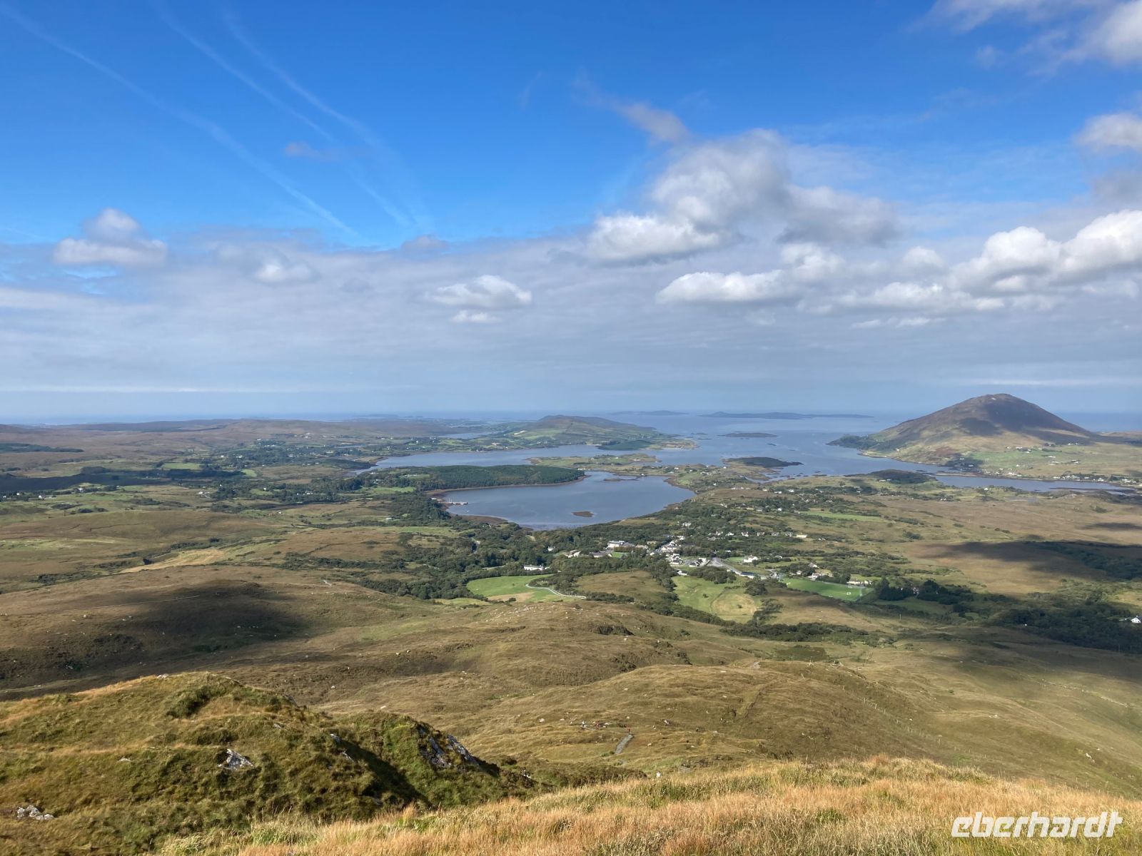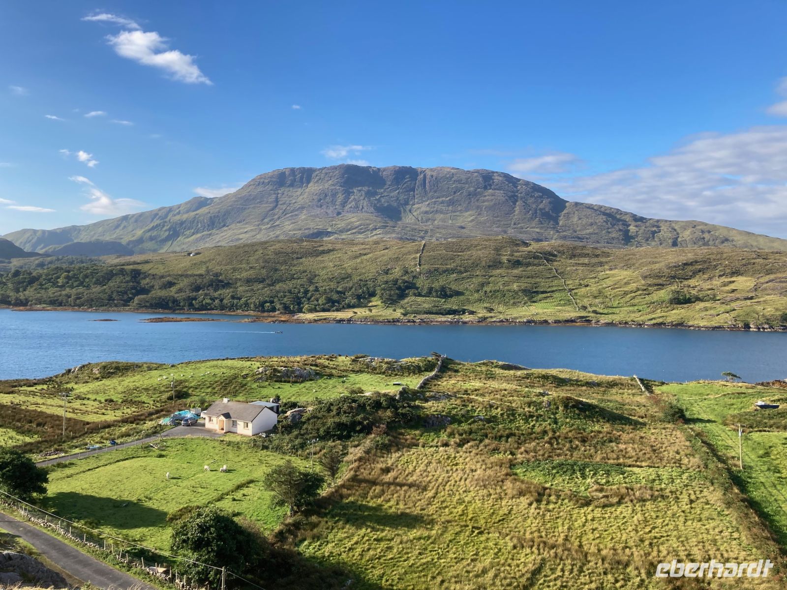 Am fünften Tag unserer Reise verlassen wir Letterkenny am Morgen mit unserem Gepäck und beginnen unsere Reise in den Süden. In Donegal machen wir die erste Pause und begucken das beschauliche Städtchen mit seinem Hauptplatz “The Diamond”. Zudem kaufen wir Verpflegung für die Mittagspause ein. War es anfangs noch bewölkt, klart der Himmel im Laufe des Tages immer weiter auf. Perfekte Bedingungen also für unsere Wanderung um die Halbinsel von Mullaghmore. Sie führt uns unterhalb des Classiebawn Castle an der Küstenstraße entlang, mit Ausblicken auf den Ben Bulben und die Klippen von Slieve League am Horizont, und endet am alten Hafen. Da wir auf der Reise leider die Ganggräber am Boyne Valley nicht besuchen konnten, habe ich uns stattdessen spontan einen Besichtigungstermin für das Gräberfeld von Carrowmore in der Nähe von Sligo buchen lassen. Es liegt unweit des Hügels Knocknarea, auf dem deutlich das angebliche Grab der Kriegerkönigin Maeve zu sehen ist. Wer mag wohl unter den vielen Grabhügeln aus der Jungsteinzeit beerdigt worden sein? Priester? Die herrschende Elite? Könige? Wir wissen nur wenig über die Menschen, die zu jener Zeit auf der Insel siedelten. Bei der Rückkehr zum Bus wartet leider Donal mit einer schlechten Nachricht auf uns. Das bereits seit dem Morgen aufgetretene Kühlwasserproblem hat sich verschlimmert, der Motor überhitzt. Mit diesem Bus können wir heute nicht weiterfahren. (Später wird sich herausstellen, dass die Kühlwasserpumpe kaputt ist.) Doch Willy, der Chef des Busunternehmens, lässt uns nicht hängen. Eine Stunde später kommt schon ein Ersatzbus. Es ist zwar „nur“ ein mittelgroßer Linienbus und wir müssen mit dem Gepäck ein bisschen improvisieren, aber wenigstens kommen wir weiter. Und für einen Bummel in der hübschen kleinen ehemaligen Hafenstadt Westport bleibt am Nachmittag auch noch Zeit. Auch den Croagh Patrick besuchen wir noch und laufen hinauf bis zum Aussichtspunkt mit Blick über die Clew Bay mit ihren vielen kleinen Inseln. Und dann erreichen wir unser Hotel am Fjord inmitten der Berge Connemaras. Ein Anblick, der mein Herz zum Hüpfen bringt. Das leckere Abendessen, vielleicht das beste der ganzen Reise, entschädigt zudem für alle Strapazen.