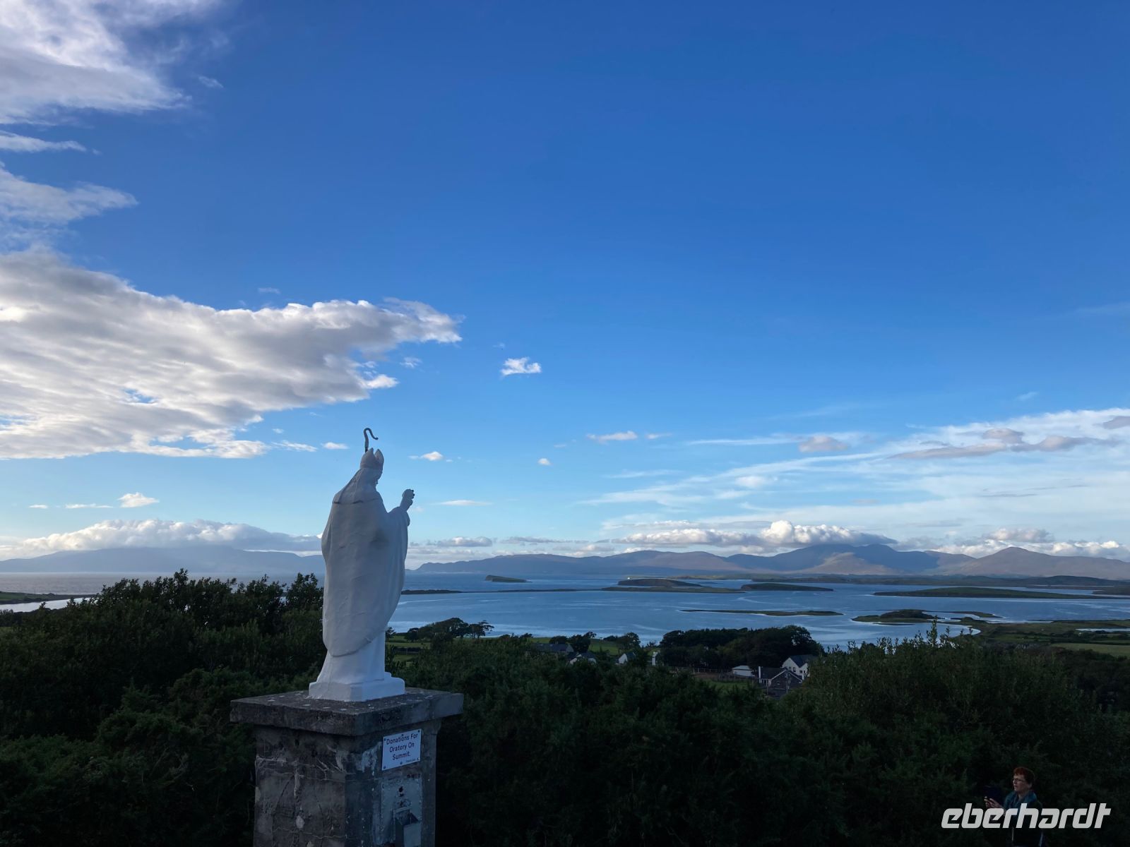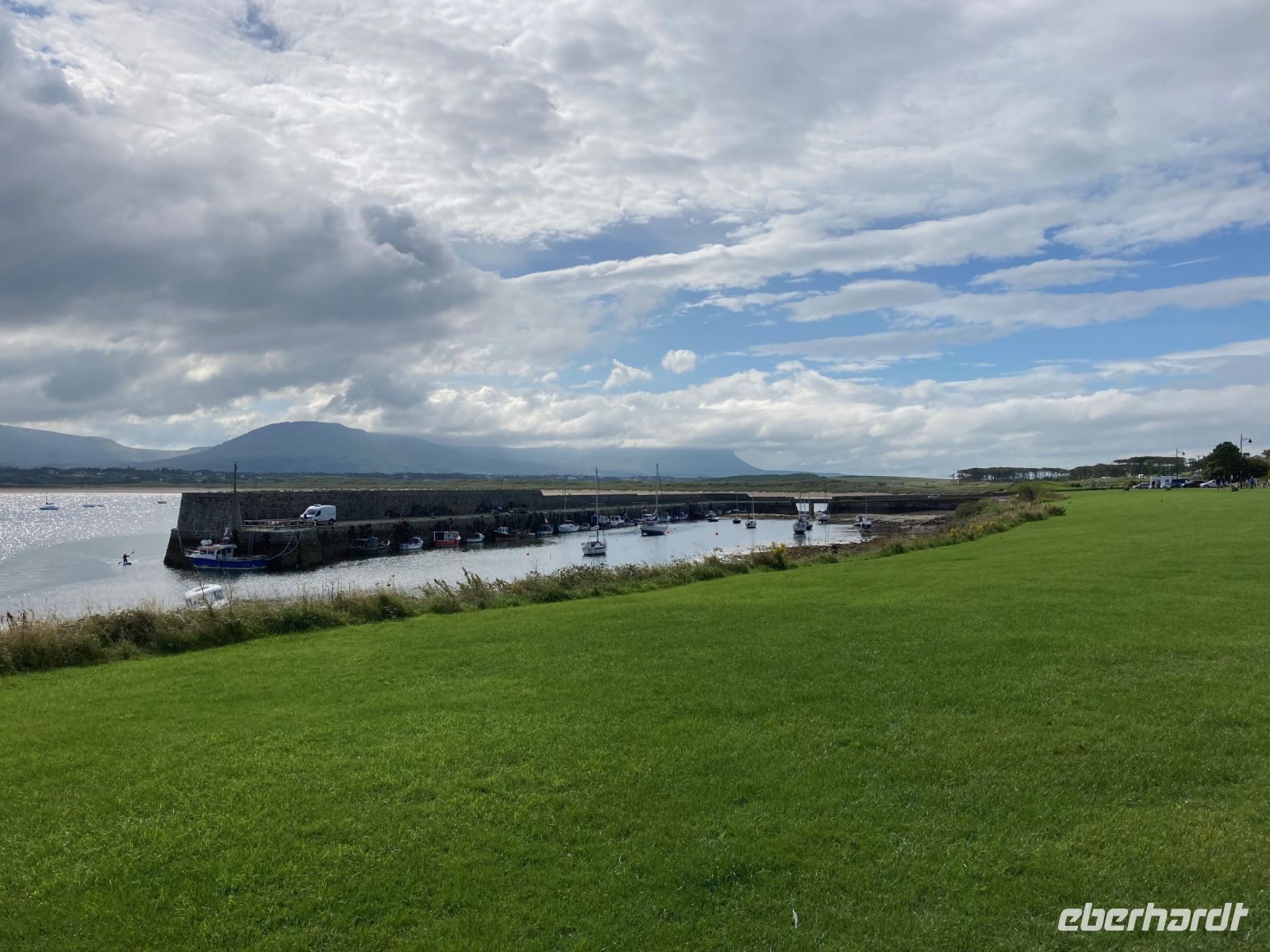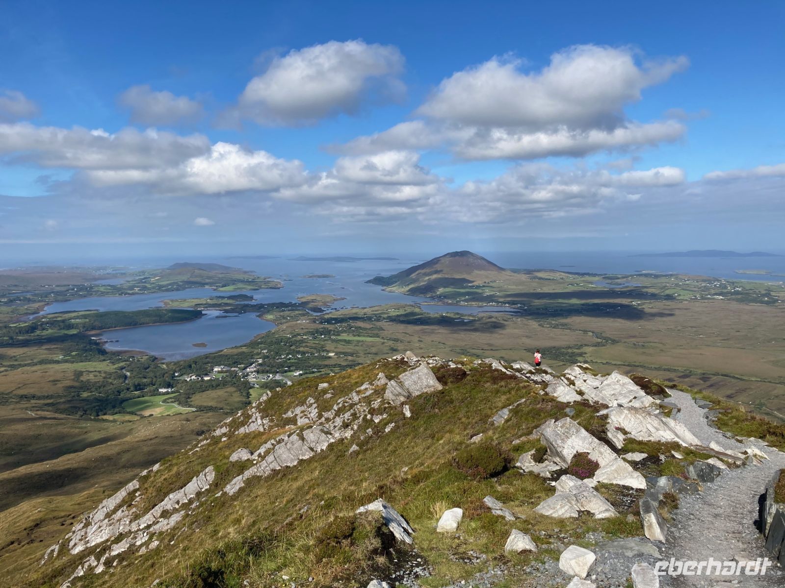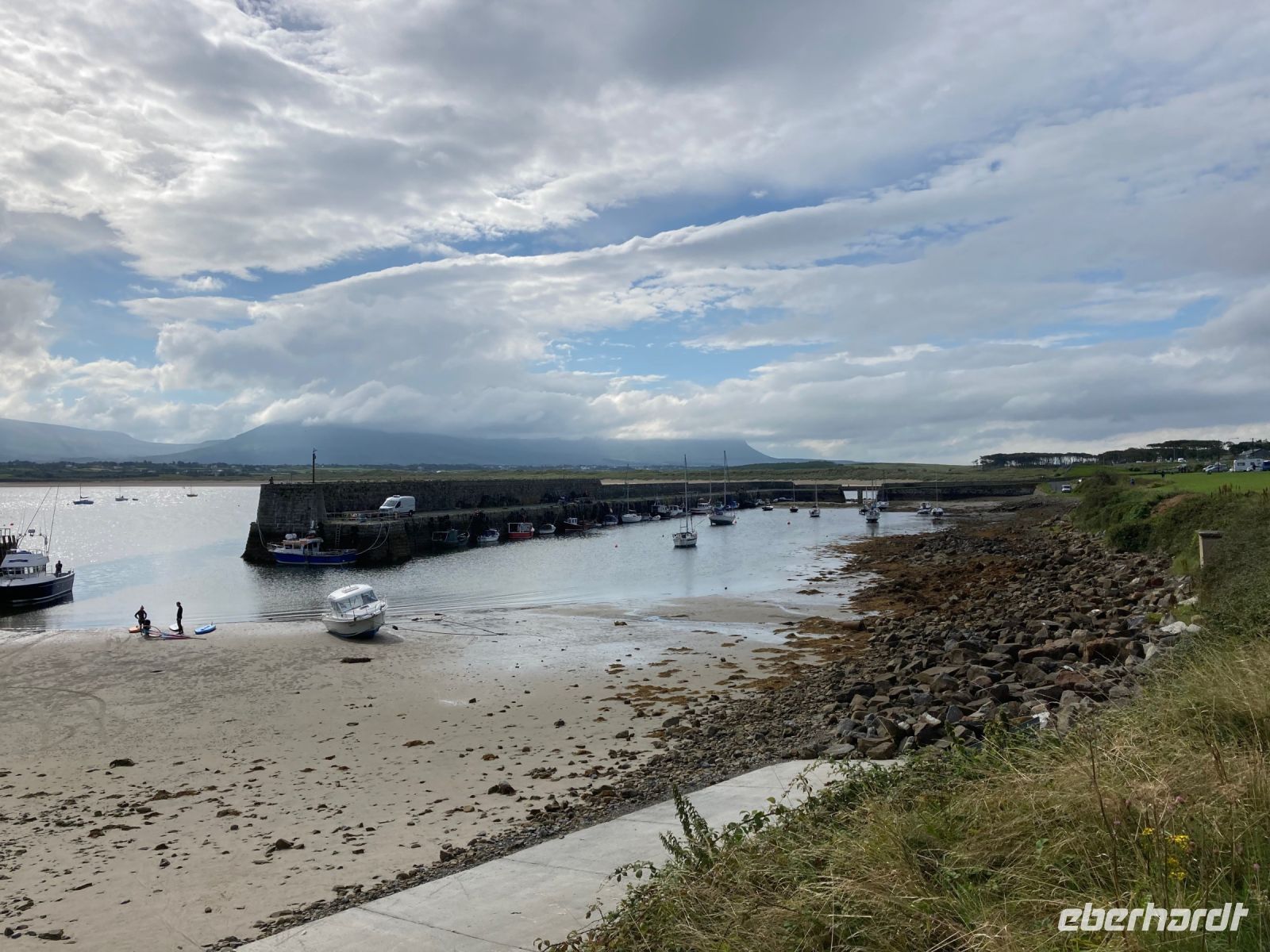 Am fünften Tag unserer Reise verlassen wir Letterkenny am Morgen mit unserem Gepäck und beginnen unsere Reise in den Süden. In Donegal machen wir die erste Pause und begucken das beschauliche Städtchen mit seinem Hauptplatz “The Diamond”. Zudem kaufen wir Verpflegung für die Mittagspause ein. War es anfangs noch bewölkt, klart der Himmel im Laufe des Tages immer weiter auf. Perfekte Bedingungen also für unsere Wanderung um die Halbinsel von Mullaghmore. Sie führt uns unterhalb des Classiebawn Castle an der Küstenstraße entlang, mit Ausblicken auf den Ben Bulben und die Klippen von Slieve League am Horizont, und endet am alten Hafen. Da wir auf der Reise leider die Ganggräber am Boyne Valley nicht besuchen konnten, habe ich uns stattdessen spontan einen Besichtigungstermin für das Gräberfeld von Carrowmore in der Nähe von Sligo buchen lassen. Es liegt unweit des Hügels Knocknarea, auf dem deutlich das angebliche Grab der Kriegerkönigin Maeve zu sehen ist. Wer mag wohl unter den vielen Grabhügeln aus der Jungsteinzeit beerdigt worden sein? Priester? Die herrschende Elite? Könige? Wir wissen nur wenig über die Menschen, die zu jener Zeit auf der Insel siedelten. Bei der Rückkehr zum Bus wartet leider Donal mit einer schlechten Nachricht auf uns. Das bereits seit dem Morgen aufgetretene Kühlwasserproblem hat sich verschlimmert, der Motor überhitzt. Mit diesem Bus können wir heute nicht weiterfahren. (Später wird sich herausstellen, dass die Kühlwasserpumpe kaputt ist.) Doch Willy, der Chef des Busunternehmens, lässt uns nicht hängen. Eine Stunde später kommt schon ein Ersatzbus. Es ist zwar „nur“ ein mittelgroßer Linienbus und wir müssen mit dem Gepäck ein bisschen improvisieren, aber wenigstens kommen wir weiter. Und für einen Bummel in der hübschen kleinen ehemaligen Hafenstadt Westport bleibt am Nachmittag auch noch Zeit. Auch den Croagh Patrick besuchen wir noch und laufen hinauf bis zum Aussichtspunkt mit Blick über die Clew Bay mit ihren vielen kleinen Inseln. Und dann erreichen wir unser Hotel am Fjord inmitten der Berge Connemaras. Ein Anblick, der mein Herz zum Hüpfen bringt. Das leckere Abendessen, vielleicht das beste der ganzen Reise, entschädigt zudem für alle Strapazen.