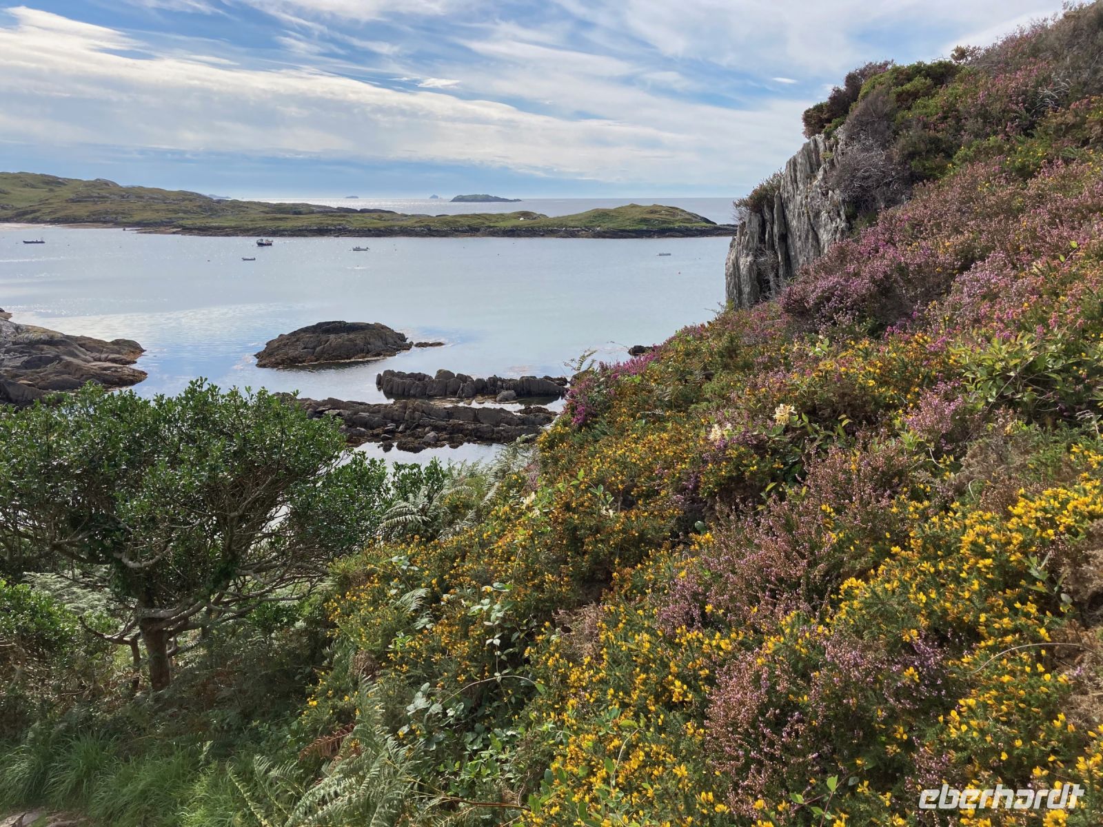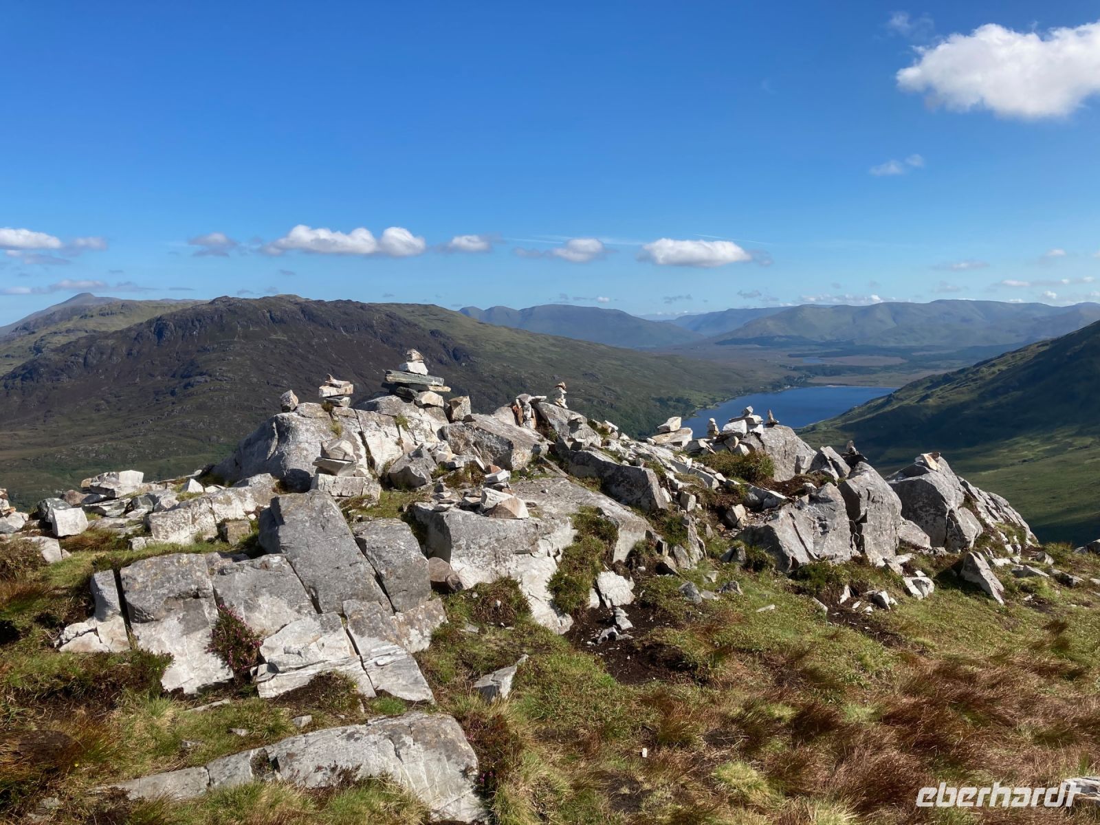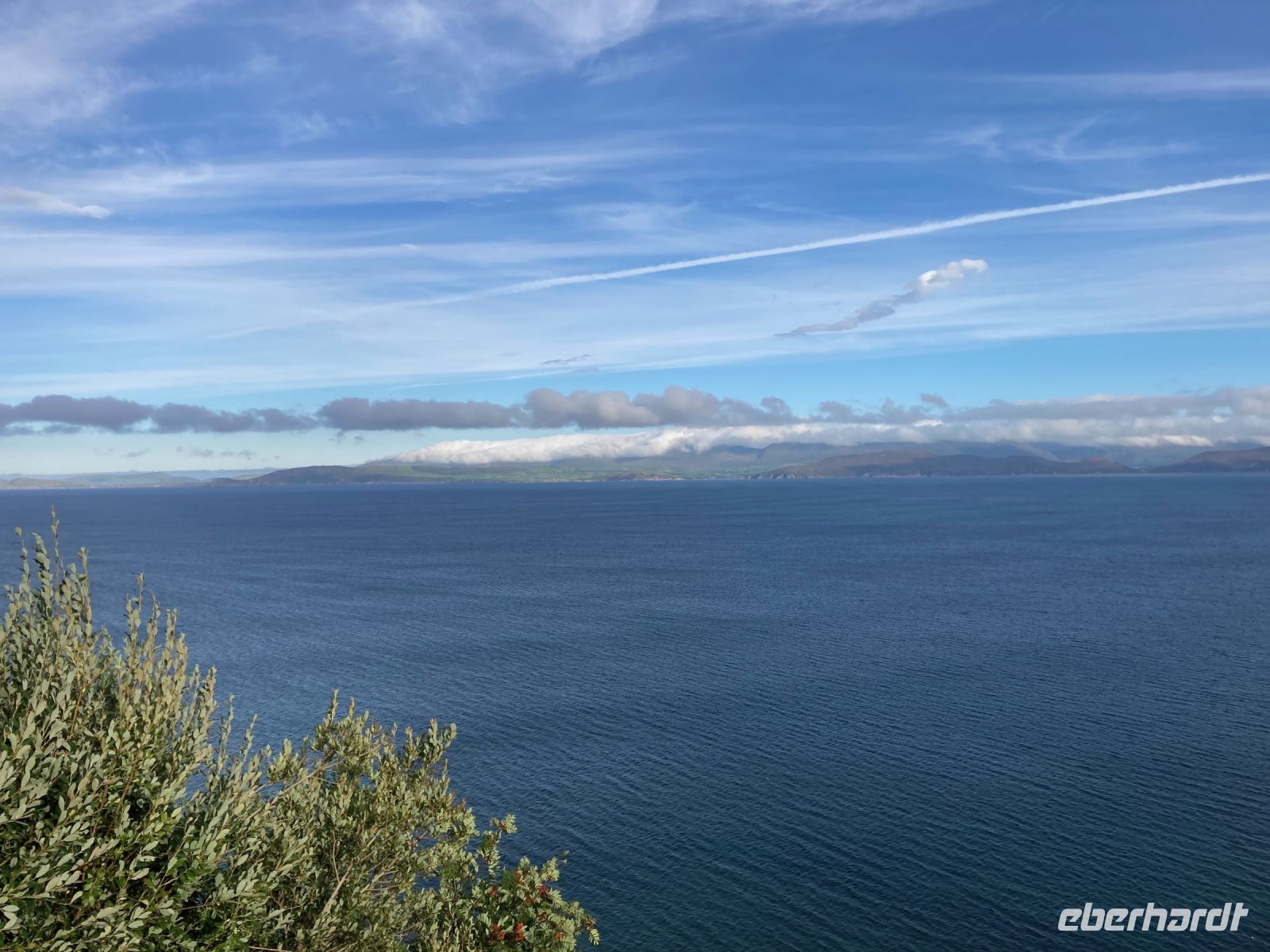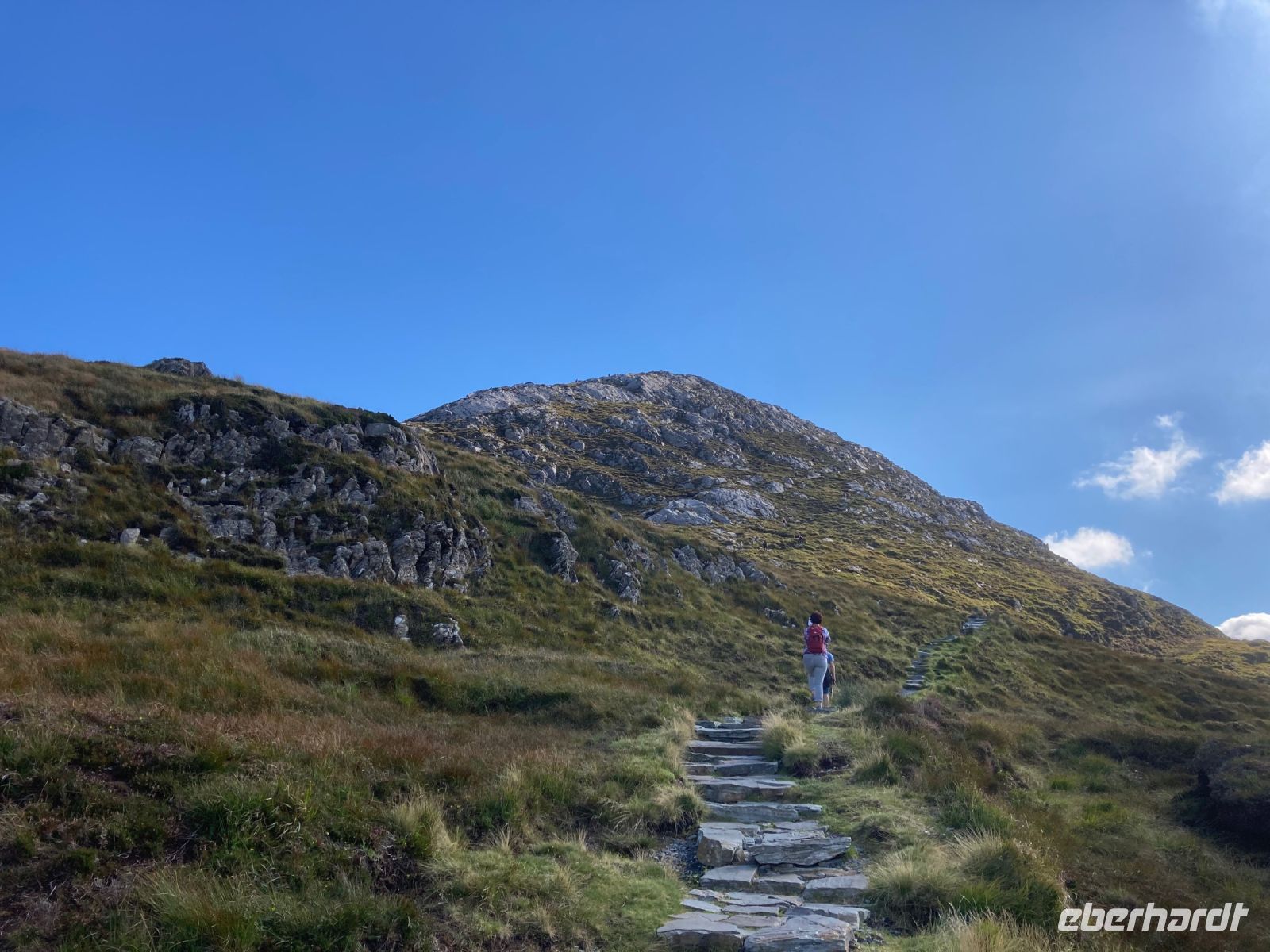 Am fünften Tag unserer Reise verlassen wir Letterkenny am Morgen mit unserem Gepäck und beginnen unsere Reise in den Süden. In Donegal machen wir die erste Pause und begucken das beschauliche Städtchen mit seinem Hauptplatz “The Diamond”. Zudem kaufen wir Verpflegung für die Mittagspause ein. War es anfangs noch bewölkt, klart der Himmel im Laufe des Tages immer weiter auf. Perfekte Bedingungen also für unsere Wanderung um die Halbinsel von Mullaghmore. Sie führt uns unterhalb des Classiebawn Castle an der Küstenstraße entlang, mit Ausblicken auf den Ben Bulben und die Klippen von Slieve League am Horizont, und endet am alten Hafen. Da wir auf der Reise leider die Ganggräber am Boyne Valley nicht besuchen konnten, habe ich uns stattdessen spontan einen Besichtigungstermin für das Gräberfeld von Carrowmore in der Nähe von Sligo buchen lassen. Es liegt unweit des Hügels Knocknarea, auf dem deutlich das angebliche Grab der Kriegerkönigin Maeve zu sehen ist. Wer mag wohl unter den vielen Grabhügeln aus der Jungsteinzeit beerdigt worden sein? Priester? Die herrschende Elite? Könige? Wir wissen nur wenig über die Menschen, die zu jener Zeit auf der Insel siedelten. Bei der Rückkehr zum Bus wartet leider Donal mit einer schlechten Nachricht auf uns. Das bereits seit dem Morgen aufgetretene Kühlwasserproblem hat sich verschlimmert, der Motor überhitzt. Mit diesem Bus können wir heute nicht weiterfahren. (Später wird sich herausstellen, dass die Kühlwasserpumpe kaputt ist.) Doch Willy, der Chef des Busunternehmens, lässt uns nicht hängen. Eine Stunde später kommt schon ein Ersatzbus. Es ist zwar „nur“ ein mittelgroßer Linienbus und wir müssen mit dem Gepäck ein bisschen improvisieren, aber wenigstens kommen wir weiter. Und für einen Bummel in der hübschen kleinen ehemaligen Hafenstadt Westport bleibt am Nachmittag auch noch Zeit. Auch den Croagh Patrick besuchen wir noch und laufen hinauf bis zum Aussichtspunkt mit Blick über die Clew Bay mit ihren vielen kleinen Inseln. Und dann erreichen wir unser Hotel am Fjord inmitten der Berge Connemaras. Ein Anblick, der mein Herz zum Hüpfen bringt. Das leckere Abendessen, vielleicht das beste der ganzen Reise, entschädigt zudem für alle Strapazen.