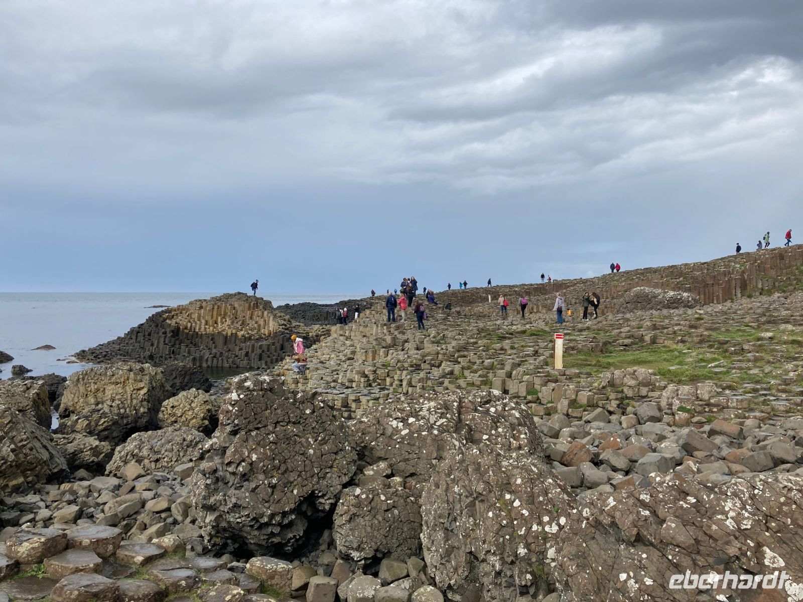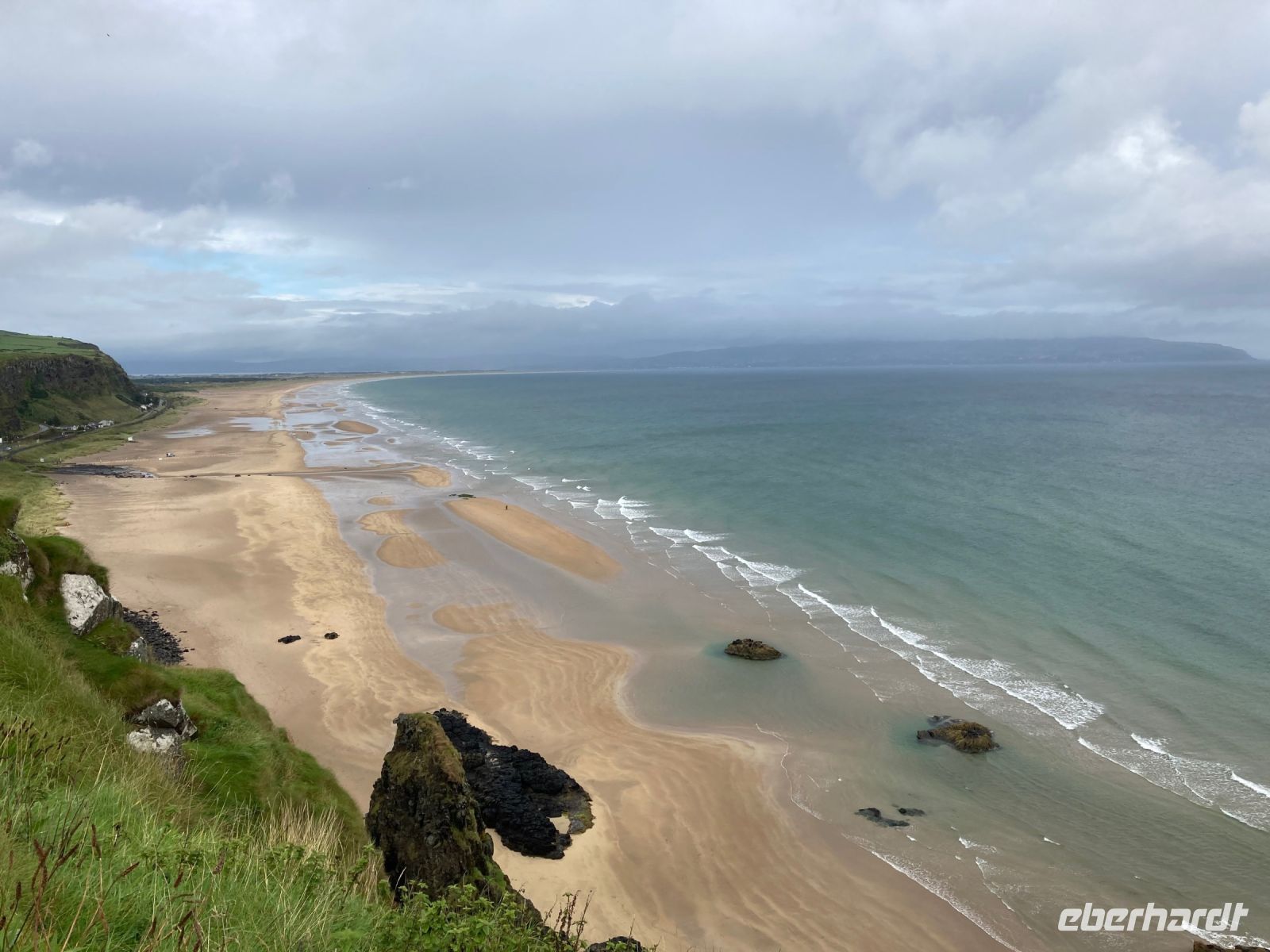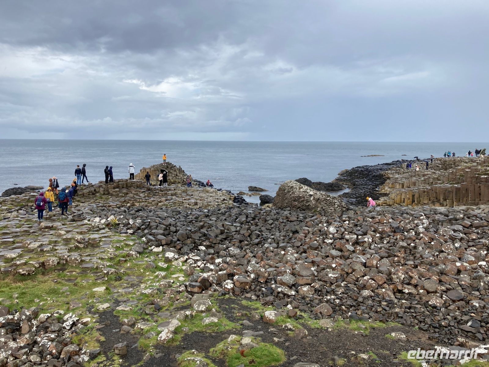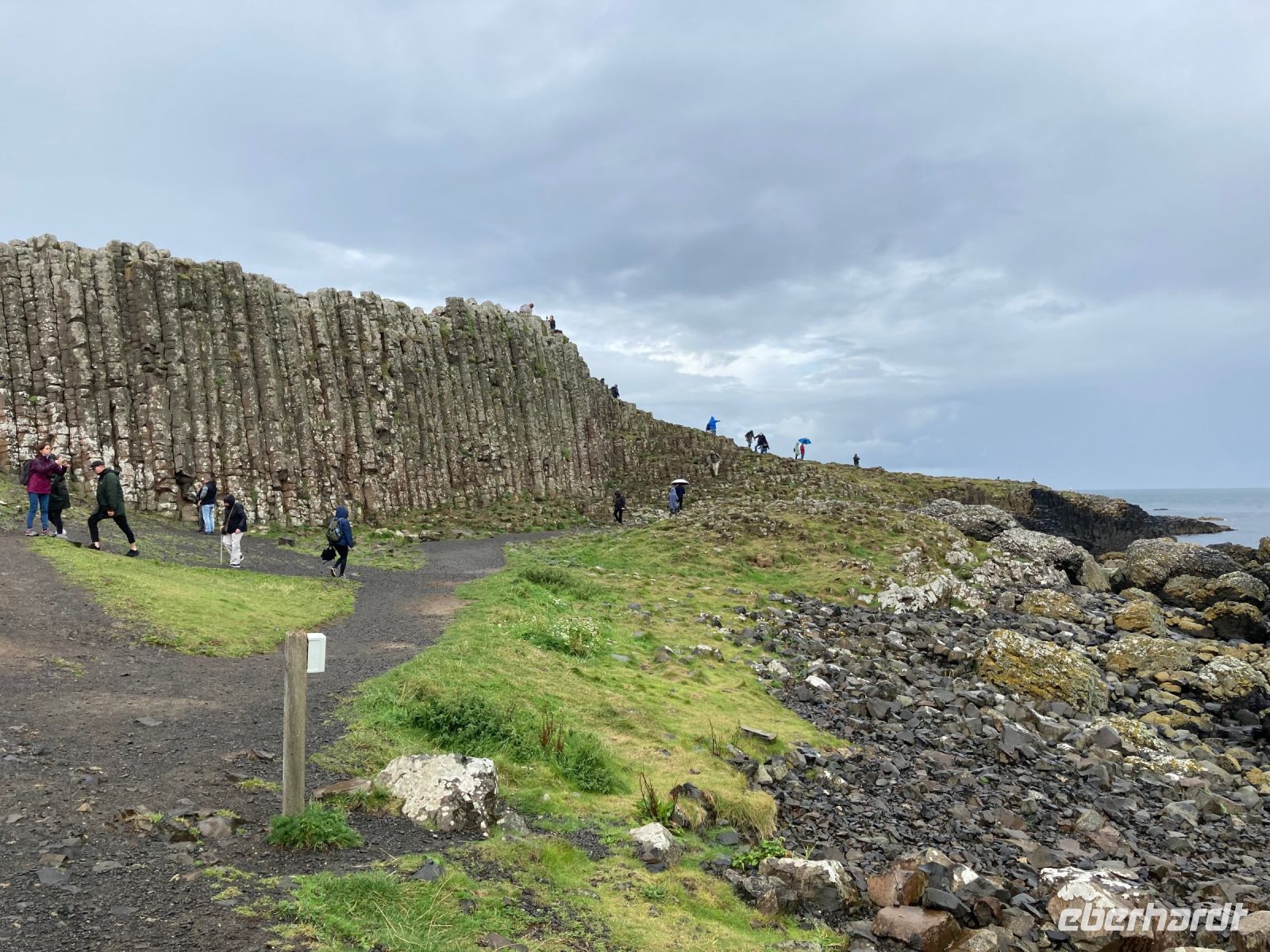 Wir kehren für einen Tagesausflug noch einmal nach Nordirland zurück und fahren an Derry vorbei auf der Causeway Coastal Route zum ehemaligen Anwesen des protestantischen Bischofs von Derry. Neben den Ruinen des Bischofspalastes befindet sich auf dem Gelände auch der Mussenden Temple, einst als Bibliothek des Palastes erbaut und der in jungen Jahren verstorbenen Cousine des Bischofs gewidmet. Hinein können wir als Besucher leider nicht mehr, doch wir genießen die Aussicht von seinem Standort oben auf den Klippen auf den kilometerlangen Strand von Downhill. Das Wetter ist heute typisch irisch: vier Jahreszeiten an einem Tag. Regen, Sonne, Regen, Sonne … Auf dem Weg zur Bushmills Distillery machen wir einen Fotostopp am Dunluce Castle, der wohl romantischsten Burgruine Irlands. Auch hier verschönert uns ein Regenbogen den Aufenthalt. In Bushmills angekommen füllen wir zunächst unsere Bäuche, damit der Whisky auf eine gute Grundlage trifft. Dann startet unsere Führung mit unserem Sean-Connery-Double Alan, der sich einen Spaß daraus macht, meine Grenzen als Übersetzer auszuloten. Ich scheine seinen Test bestanden zu haben, denn beim Einschenken der Whiskey-Kostprobe erweist er sich als großzügiger Barkeeper. Nur wenige Fahrminuten später wartet mit dem Giant’s Causeway schon der nächste Höhepunkt auf uns. Viele tausend Basaltsäulen hat der Riese Finn MacCool vor langer Zeit ins Meer geworfen, um sich in Schottland mit seinem Rivalen Benandonner zu prügeln. Die Überreste dieses Dammes können wir heute noch bestaunen. Sie führen vom Rand der Steilklippe bis weit ins Meer hinein. Ob es hier wirklich Riesen gab? Das ist vermutlich vor allem eine Glaubensfrage, ebenso wie der Nordirlandkonflikt, der bei unserem Spaziergang auf der Stadtmauer von Derry/Londonderry vor unseren Augen lebendig wird. Protestanten und Katholiken leben hier auch heute noch fein säuberlich voneinander getrennt, der Konflikt scheint in den Köpfen der Menschen eingefroren. Zäune zum Schutz vor Molotow-Cocktails erinnern an die Gewaltbereitschaft beider Seiten. Dabei hat die Altstadt mit der historischen Stadtmauer und der hübschen St Columb‘s Cathedral sowie der Gildenhalle durchaus ihren Charme. Als wir am Abend die Grenze zur Republik erreichen verfliegt langsam das mulmige Gefühl in der Magengegend und wir freuen uns lieber auf die schöne Landschaft an der Westküste.