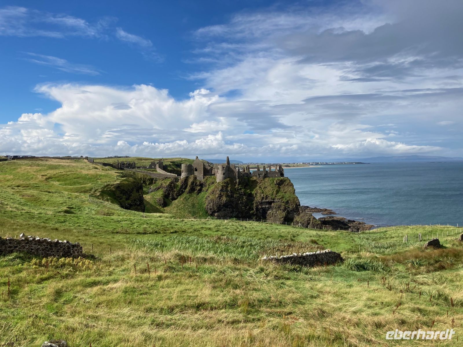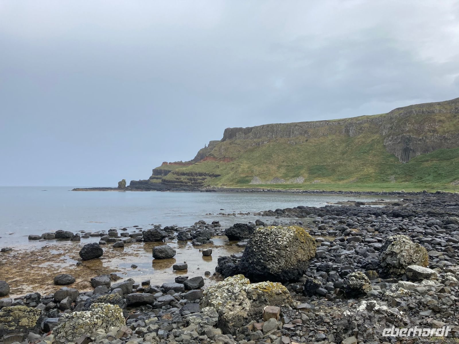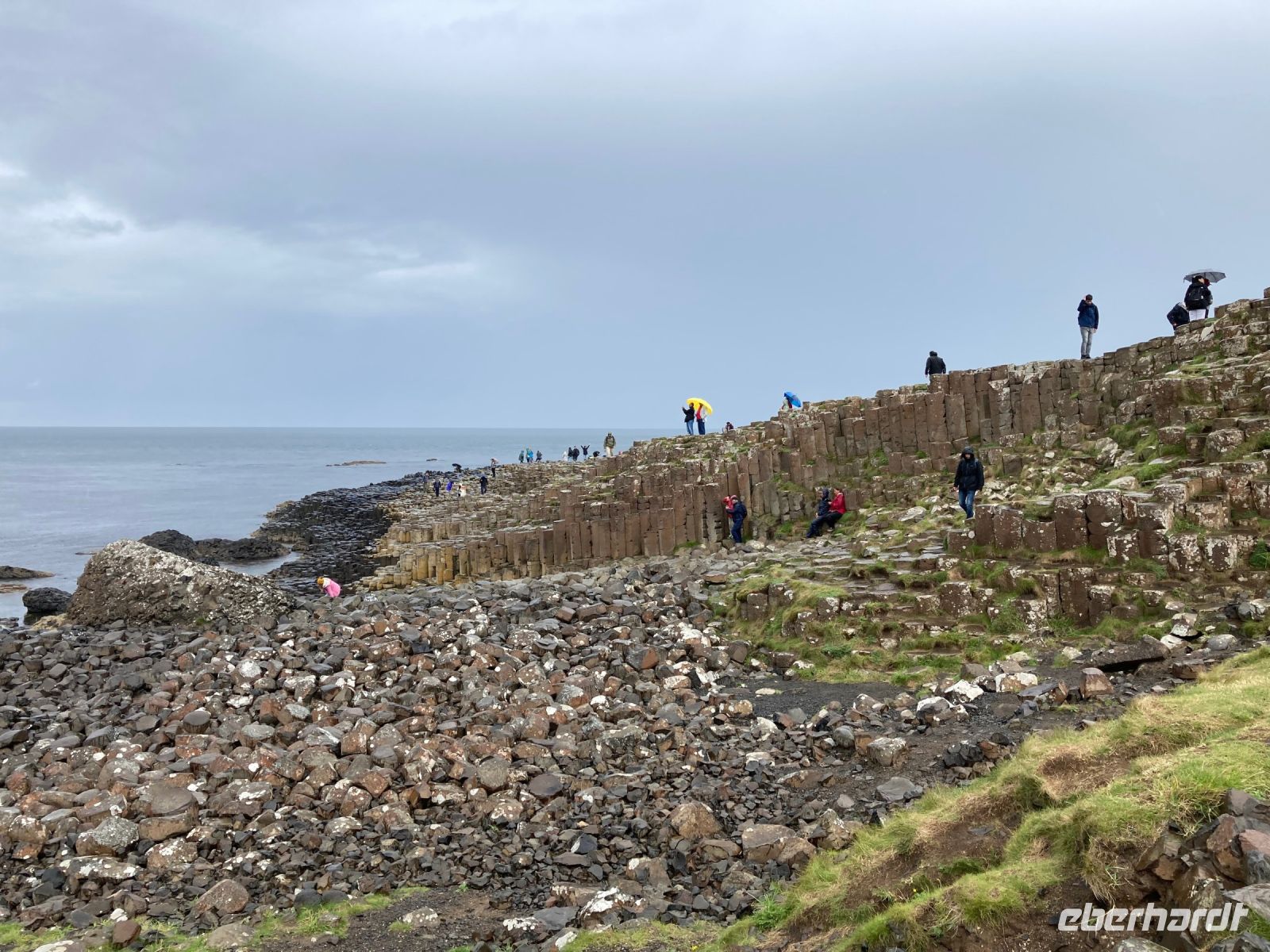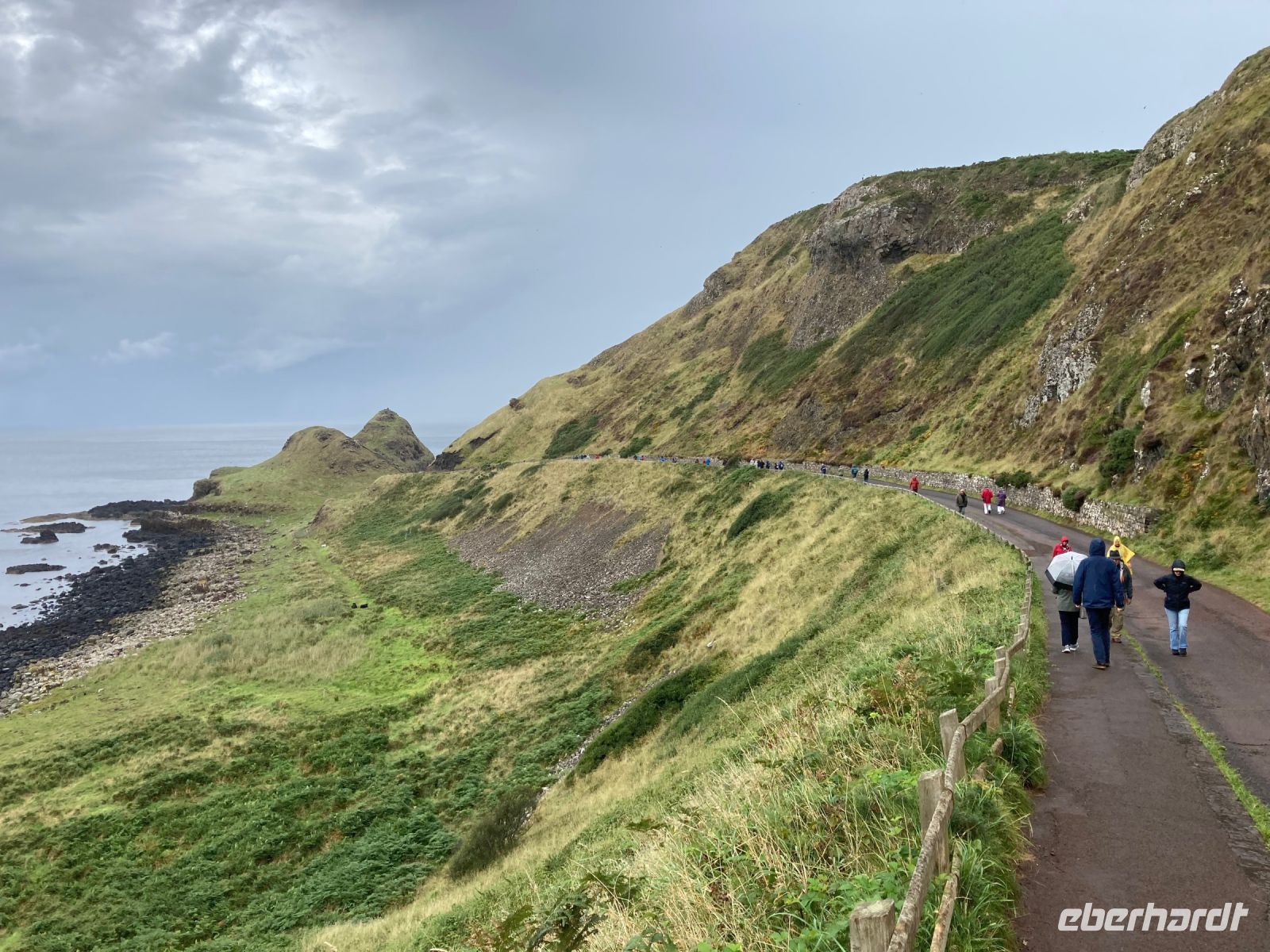 Wir kehren für einen Tagesausflug noch einmal nach Nordirland zurück und fahren an Derry vorbei auf der Causeway Coastal Route zum ehemaligen Anwesen des protestantischen Bischofs von Derry. Neben den Ruinen des Bischofspalastes befindet sich auf dem Gelände auch der Mussenden Temple, einst als Bibliothek des Palastes erbaut und der in jungen Jahren verstorbenen Cousine des Bischofs gewidmet. Hinein können wir als Besucher leider nicht mehr, doch wir genießen die Aussicht von seinem Standort oben auf den Klippen auf den kilometerlangen Strand von Downhill. Das Wetter ist heute typisch irisch: vier Jahreszeiten an einem Tag. Regen, Sonne, Regen, Sonne … Auf dem Weg zur Bushmills Distillery machen wir einen Fotostopp am Dunluce Castle, der wohl romantischsten Burgruine Irlands. Auch hier verschönert uns ein Regenbogen den Aufenthalt. In Bushmills angekommen füllen wir zunächst unsere Bäuche, damit der Whisky auf eine gute Grundlage trifft. Dann startet unsere Führung mit unserem Sean-Connery-Double Alan, der sich einen Spaß daraus macht, meine Grenzen als Übersetzer auszuloten. Ich scheine seinen Test bestanden zu haben, denn beim Einschenken der Whiskey-Kostprobe erweist er sich als großzügiger Barkeeper. Nur wenige Fahrminuten später wartet mit dem Giant’s Causeway schon der nächste Höhepunkt auf uns. Viele tausend Basaltsäulen hat der Riese Finn MacCool vor langer Zeit ins Meer geworfen, um sich in Schottland mit seinem Rivalen Benandonner zu prügeln. Die Überreste dieses Dammes können wir heute noch bestaunen. Sie führen vom Rand der Steilklippe bis weit ins Meer hinein. Ob es hier wirklich Riesen gab? Das ist vermutlich vor allem eine Glaubensfrage, ebenso wie der Nordirlandkonflikt, der bei unserem Spaziergang auf der Stadtmauer von Derry/Londonderry vor unseren Augen lebendig wird. Protestanten und Katholiken leben hier auch heute noch fein säuberlich voneinander getrennt, der Konflikt scheint in den Köpfen der Menschen eingefroren. Zäune zum Schutz vor Molotow-Cocktails erinnern an die Gewaltbereitschaft beider Seiten. Dabei hat die Altstadt mit der historischen Stadtmauer und der hübschen St Columb‘s Cathedral sowie der Gildenhalle durchaus ihren Charme. Als wir am Abend die Grenze zur Republik erreichen verfliegt langsam das mulmige Gefühl in der Magengegend und wir freuen uns lieber auf die schöne Landschaft an der Westküste.