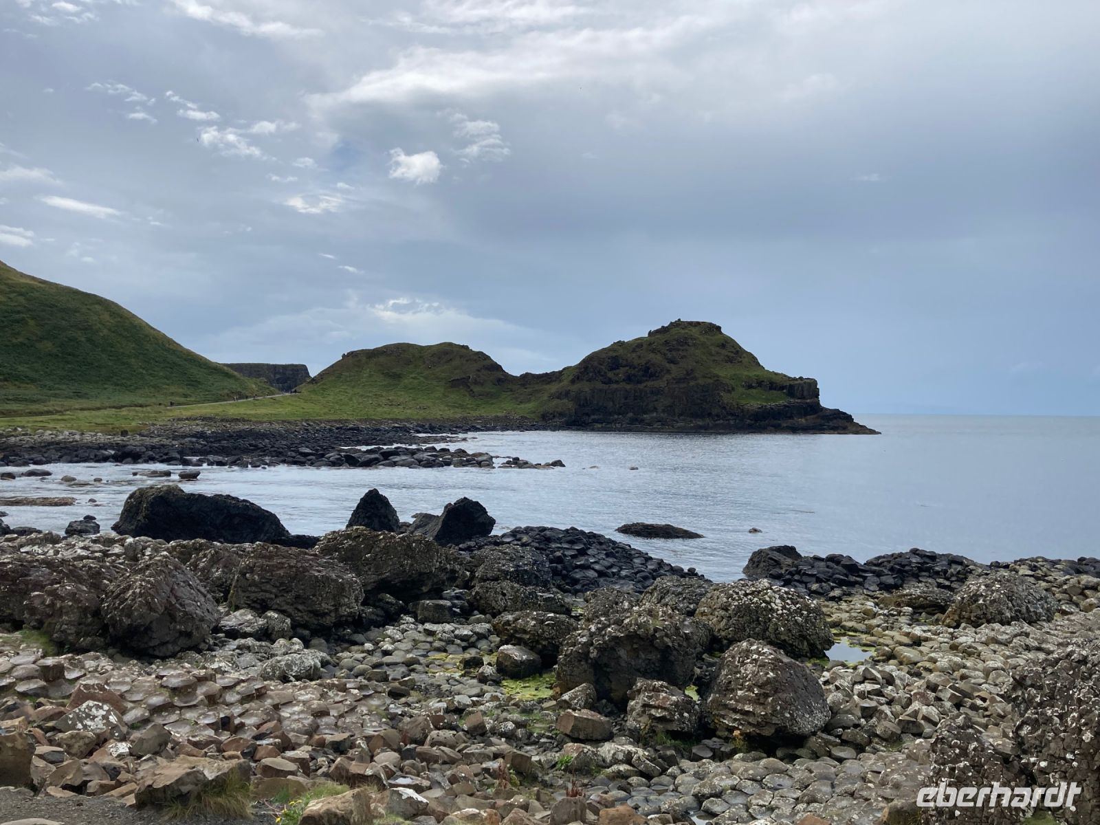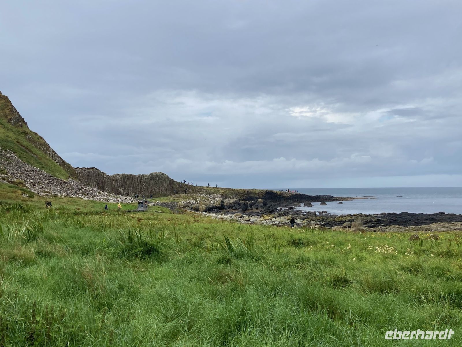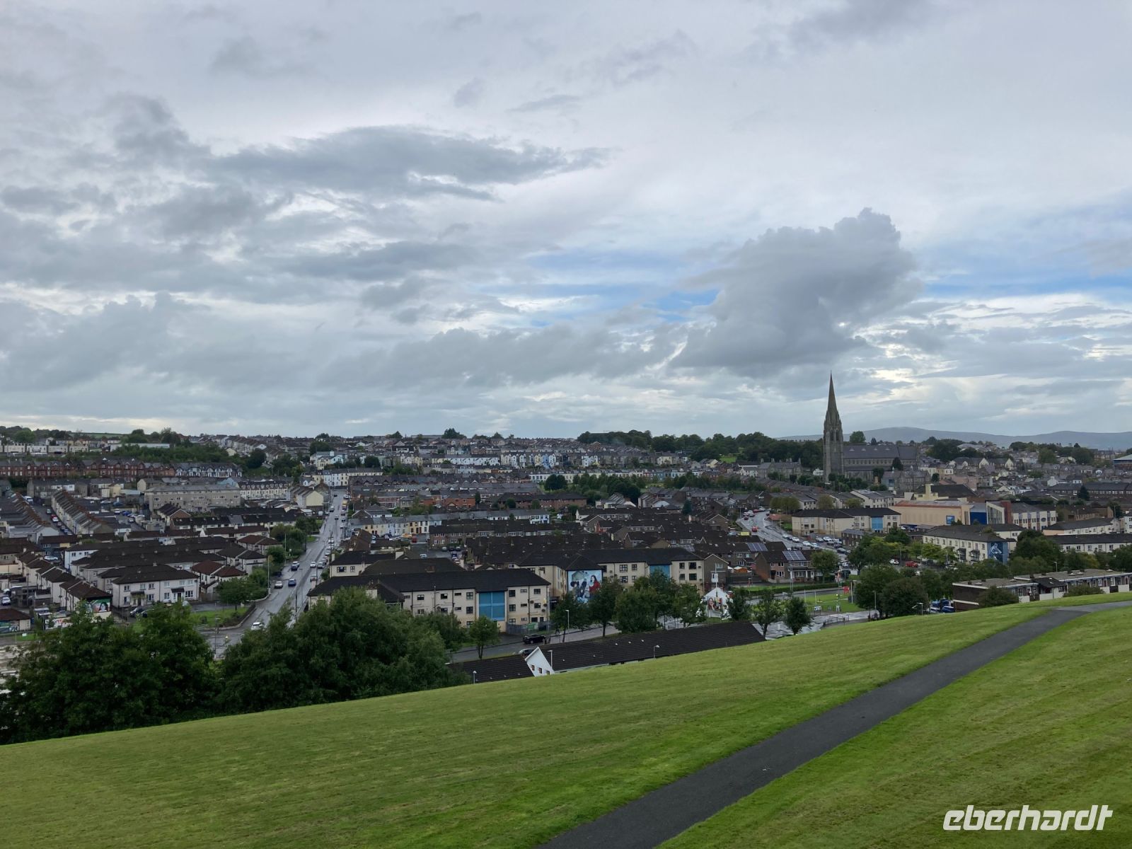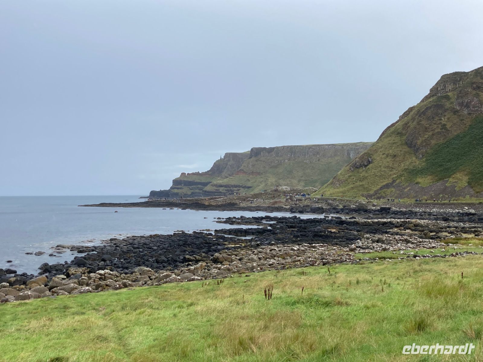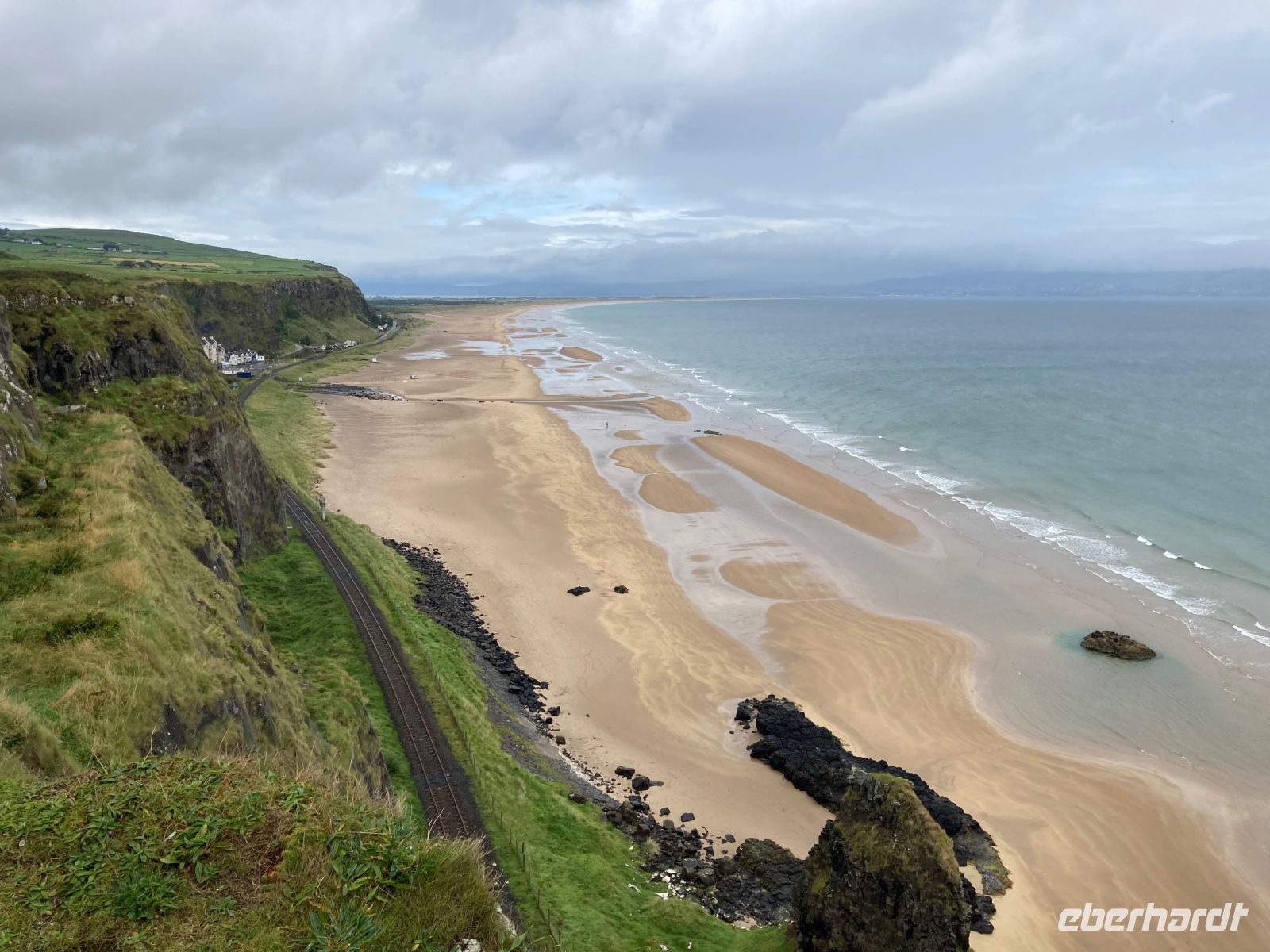 Wir kehren für einen Tagesausflug noch einmal nach Nordirland zurück und fahren an Derry vorbei auf der Causeway Coastal Route zum ehemaligen Anwesen des protestantischen Bischofs von Derry. Neben den Ruinen des Bischofspalastes befindet sich auf dem Gelände auch der Mussenden Temple, einst als Bibliothek des Palastes erbaut und der in jungen Jahren verstorbenen Cousine des Bischofs gewidmet. Hinein können wir als Besucher leider nicht mehr, doch wir genießen die Aussicht von seinem Standort oben auf den Klippen auf den kilometerlangen Strand von Downhill. Das Wetter ist heute typisch irisch: vier Jahreszeiten an einem Tag. Regen, Sonne, Regen, Sonne … Auf dem Weg zur Bushmills Distillery machen wir einen Fotostopp am Dunluce Castle, der wohl romantischsten Burgruine Irlands. Auch hier verschönert uns ein Regenbogen den Aufenthalt. In Bushmills angekommen füllen wir zunächst unsere Bäuche, damit der Whisky auf eine gute Grundlage trifft. Dann startet unsere Führung mit unserem Sean-Connery-Double Alan, der sich einen Spaß daraus macht, meine Grenzen als Übersetzer auszuloten. Ich scheine seinen Test bestanden zu haben, denn beim Einschenken der Whiskey-Kostprobe erweist er sich als großzügiger Barkeeper. Nur wenige Fahrminuten später wartet mit dem Giant’s Causeway schon der nächste Höhepunkt auf uns. Viele tausend Basaltsäulen hat der Riese Finn MacCool vor langer Zeit ins Meer geworfen, um sich in Schottland mit seinem Rivalen Benandonner zu prügeln. Die Überreste dieses Dammes können wir heute noch bestaunen. Sie führen vom Rand der Steilklippe bis weit ins Meer hinein. Ob es hier wirklich Riesen gab? Das ist vermutlich vor allem eine Glaubensfrage, ebenso wie der Nordirlandkonflikt, der bei unserem Spaziergang auf der Stadtmauer von Derry/Londonderry vor unseren Augen lebendig wird. Protestanten und Katholiken leben hier auch heute noch fein säuberlich voneinander getrennt, der Konflikt scheint in den Köpfen der Menschen eingefroren. Zäune zum Schutz vor Molotow-Cocktails erinnern an die Gewaltbereitschaft beider Seiten. Dabei hat die Altstadt mit der historischen Stadtmauer und der hübschen St Columb‘s Cathedral sowie der Gildenhalle durchaus ihren Charme. Als wir am Abend die Grenze zur Republik erreichen verfliegt langsam das mulmige Gefühl in der Magengegend und wir freuen uns lieber auf die schöne Landschaft an der Westküste.