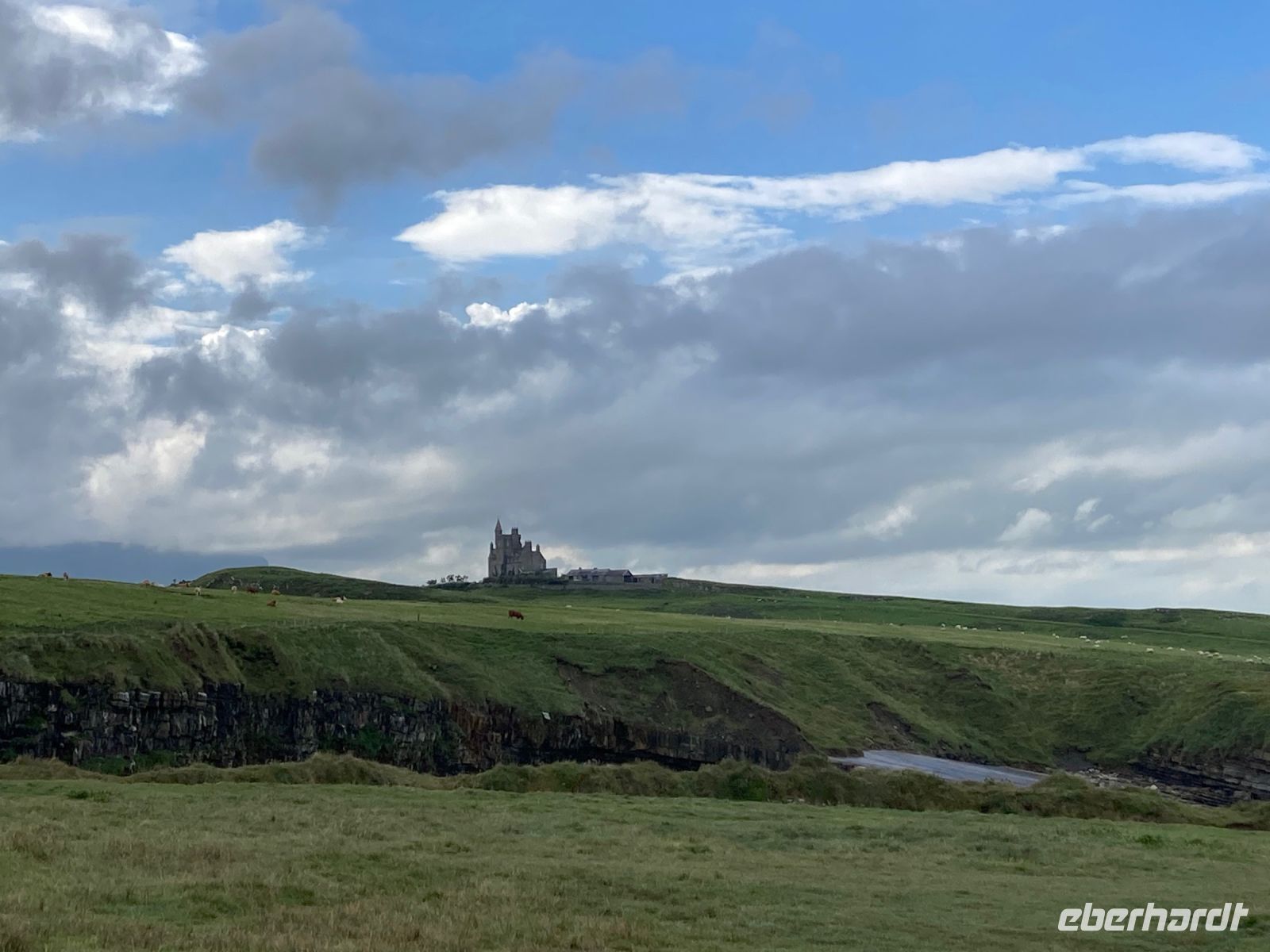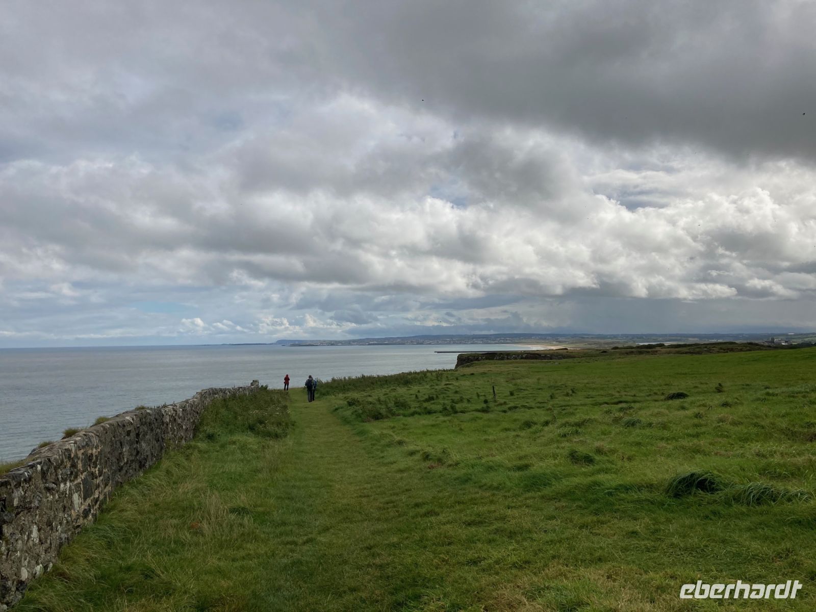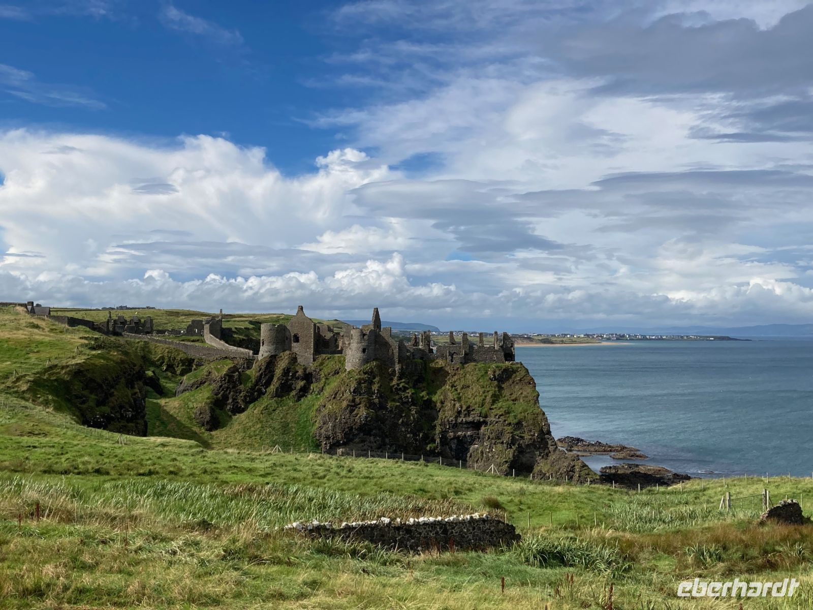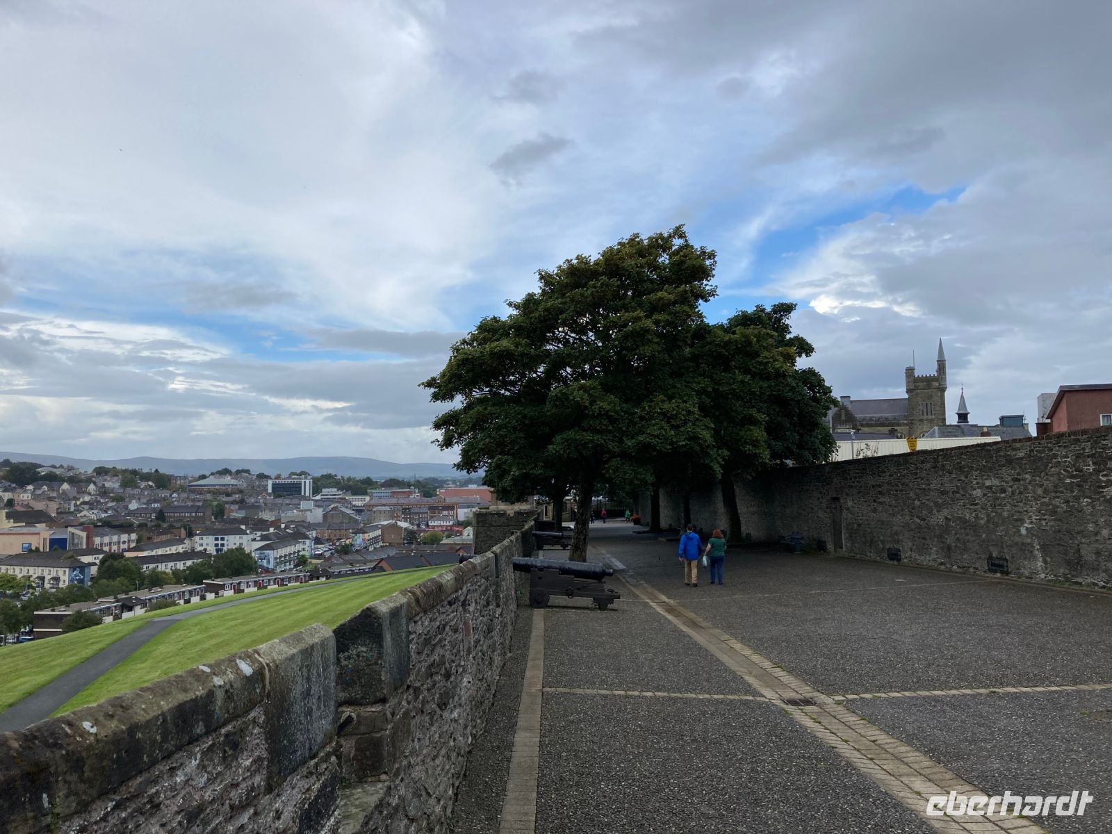 Wir kehren für einen Tagesausflug noch einmal nach Nordirland zurück und fahren an Derry vorbei auf der Causeway Coastal Route zum ehemaligen Anwesen des protestantischen Bischofs von Derry. Neben den Ruinen des Bischofspalastes befindet sich auf dem Gelände auch der Mussenden Temple, einst als Bibliothek des Palastes erbaut und der in jungen Jahren verstorbenen Cousine des Bischofs gewidmet. Hinein können wir als Besucher leider nicht mehr, doch wir genießen die Aussicht von seinem Standort oben auf den Klippen auf den kilometerlangen Strand von Downhill. Das Wetter ist heute typisch irisch: vier Jahreszeiten an einem Tag. Regen, Sonne, Regen, Sonne … Auf dem Weg zur Bushmills Distillery machen wir einen Fotostopp am Dunluce Castle, der wohl romantischsten Burgruine Irlands. Auch hier verschönert uns ein Regenbogen den Aufenthalt. In Bushmills angekommen füllen wir zunächst unsere Bäuche, damit der Whisky auf eine gute Grundlage trifft. Dann startet unsere Führung mit unserem Sean-Connery-Double Alan, der sich einen Spaß daraus macht, meine Grenzen als Übersetzer auszuloten. Ich scheine seinen Test bestanden zu haben, denn beim Einschenken der Whiskey-Kostprobe erweist er sich als großzügiger Barkeeper. Nur wenige Fahrminuten später wartet mit dem Giant’s Causeway schon der nächste Höhepunkt auf uns. Viele tausend Basaltsäulen hat der Riese Finn MacCool vor langer Zeit ins Meer geworfen, um sich in Schottland mit seinem Rivalen Benandonner zu prügeln. Die Überreste dieses Dammes können wir heute noch bestaunen. Sie führen vom Rand der Steilklippe bis weit ins Meer hinein. Ob es hier wirklich Riesen gab? Das ist vermutlich vor allem eine Glaubensfrage, ebenso wie der Nordirlandkonflikt, der bei unserem Spaziergang auf der Stadtmauer von Derry/Londonderry vor unseren Augen lebendig wird. Protestanten und Katholiken leben hier auch heute noch fein säuberlich voneinander getrennt, der Konflikt scheint in den Köpfen der Menschen eingefroren. Zäune zum Schutz vor Molotow-Cocktails erinnern an die Gewaltbereitschaft beider Seiten. Dabei hat die Altstadt mit der historischen Stadtmauer und der hübschen St Columb‘s Cathedral sowie der Gildenhalle durchaus ihren Charme. Als wir am Abend die Grenze zur Republik erreichen verfliegt langsam das mulmige Gefühl in der Magengegend und wir freuen uns lieber auf die schöne Landschaft an der Westküste.