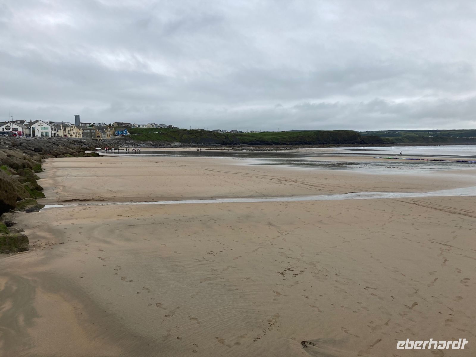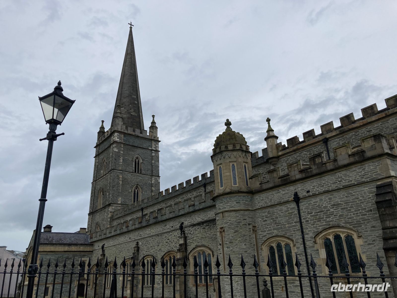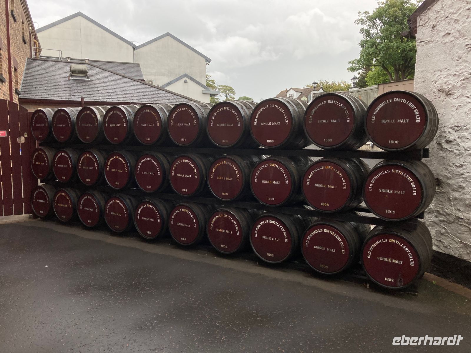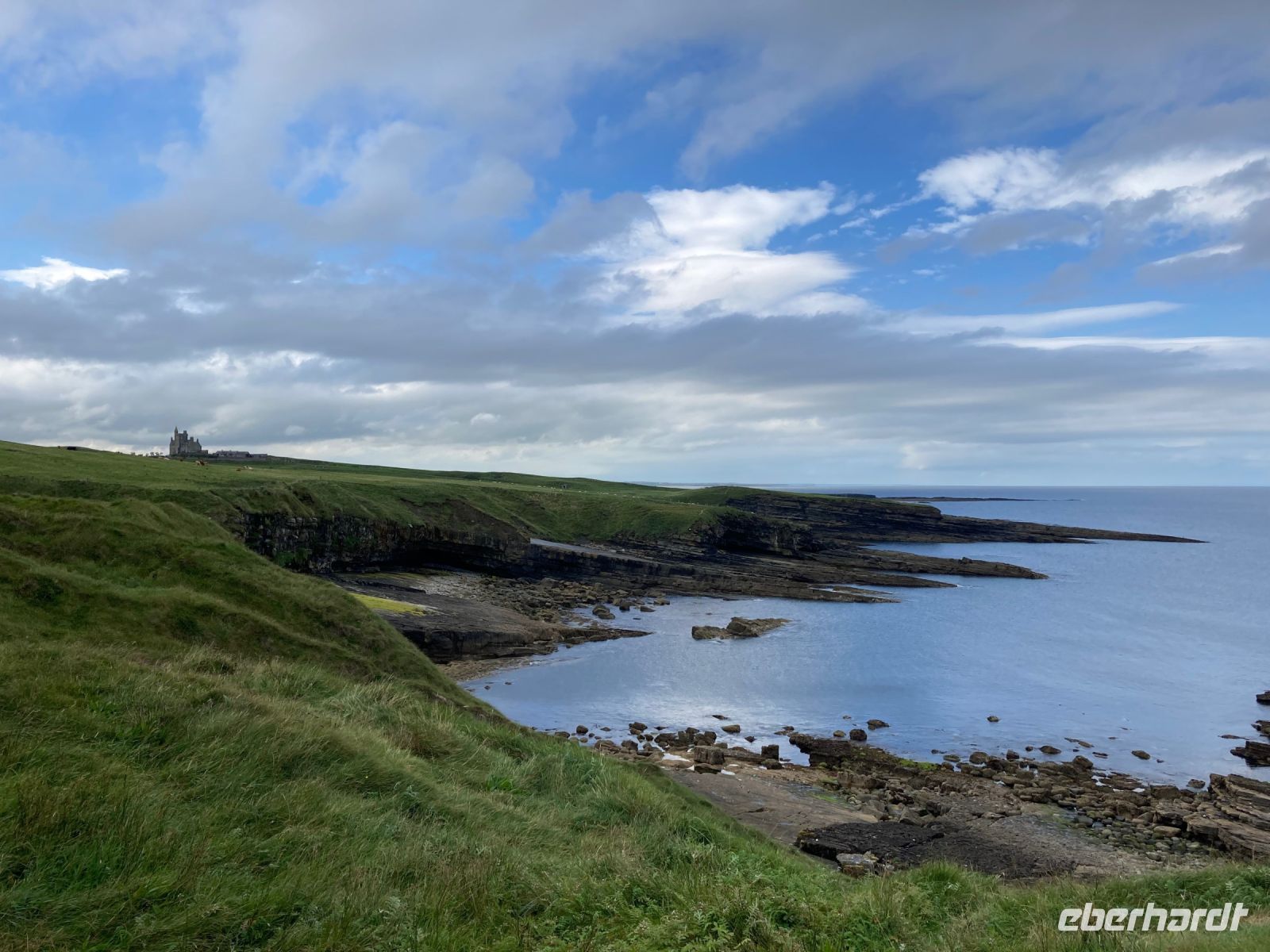 Wir kehren für einen Tagesausflug noch einmal nach Nordirland zurück und fahren an Derry vorbei auf der Causeway Coastal Route zum ehemaligen Anwesen des protestantischen Bischofs von Derry. Neben den Ruinen des Bischofspalastes befindet sich auf dem Gelände auch der Mussenden Temple, einst als Bibliothek des Palastes erbaut und der in jungen Jahren verstorbenen Cousine des Bischofs gewidmet. Hinein können wir als Besucher leider nicht mehr, doch wir genießen die Aussicht von seinem Standort oben auf den Klippen auf den kilometerlangen Strand von Downhill. Das Wetter ist heute typisch irisch: vier Jahreszeiten an einem Tag. Regen, Sonne, Regen, Sonne … Auf dem Weg zur Bushmills Distillery machen wir einen Fotostopp am Dunluce Castle, der wohl romantischsten Burgruine Irlands. Auch hier verschönert uns ein Regenbogen den Aufenthalt. In Bushmills angekommen füllen wir zunächst unsere Bäuche, damit der Whisky auf eine gute Grundlage trifft. Dann startet unsere Führung mit unserem Sean-Connery-Double Alan, der sich einen Spaß daraus macht, meine Grenzen als Übersetzer auszuloten. Ich scheine seinen Test bestanden zu haben, denn beim Einschenken der Whiskey-Kostprobe erweist er sich als großzügiger Barkeeper. Nur wenige Fahrminuten später wartet mit dem Giant’s Causeway schon der nächste Höhepunkt auf uns. Viele tausend Basaltsäulen hat der Riese Finn MacCool vor langer Zeit ins Meer geworfen, um sich in Schottland mit seinem Rivalen Benandonner zu prügeln. Die Überreste dieses Dammes können wir heute noch bestaunen. Sie führen vom Rand der Steilklippe bis weit ins Meer hinein. Ob es hier wirklich Riesen gab? Das ist vermutlich vor allem eine Glaubensfrage, ebenso wie der Nordirlandkonflikt, der bei unserem Spaziergang auf der Stadtmauer von Derry/Londonderry vor unseren Augen lebendig wird. Protestanten und Katholiken leben hier auch heute noch fein säuberlich voneinander getrennt, der Konflikt scheint in den Köpfen der Menschen eingefroren. Zäune zum Schutz vor Molotow-Cocktails erinnern an die Gewaltbereitschaft beider Seiten. Dabei hat die Altstadt mit der historischen Stadtmauer und der hübschen St Columb‘s Cathedral sowie der Gildenhalle durchaus ihren Charme. Als wir am Abend die Grenze zur Republik erreichen verfliegt langsam das mulmige Gefühl in der Magengegend und wir freuen uns lieber auf die schöne Landschaft an der Westküste.
