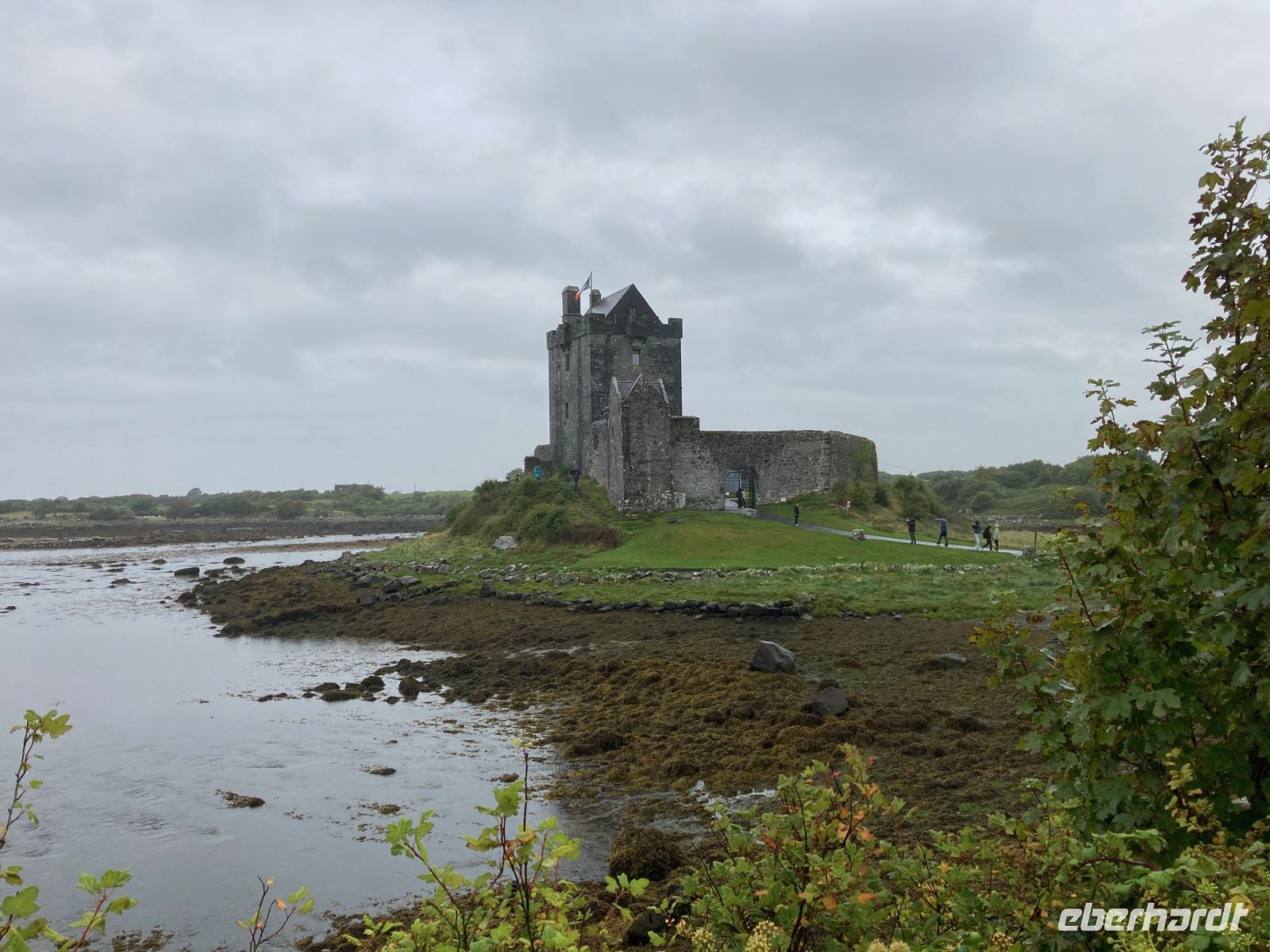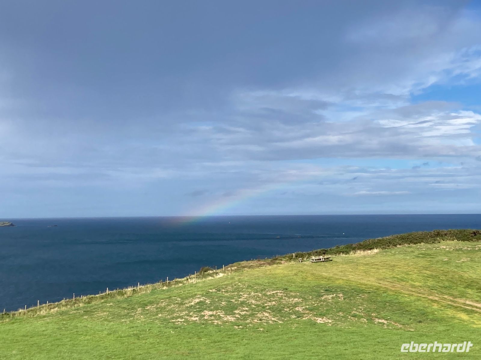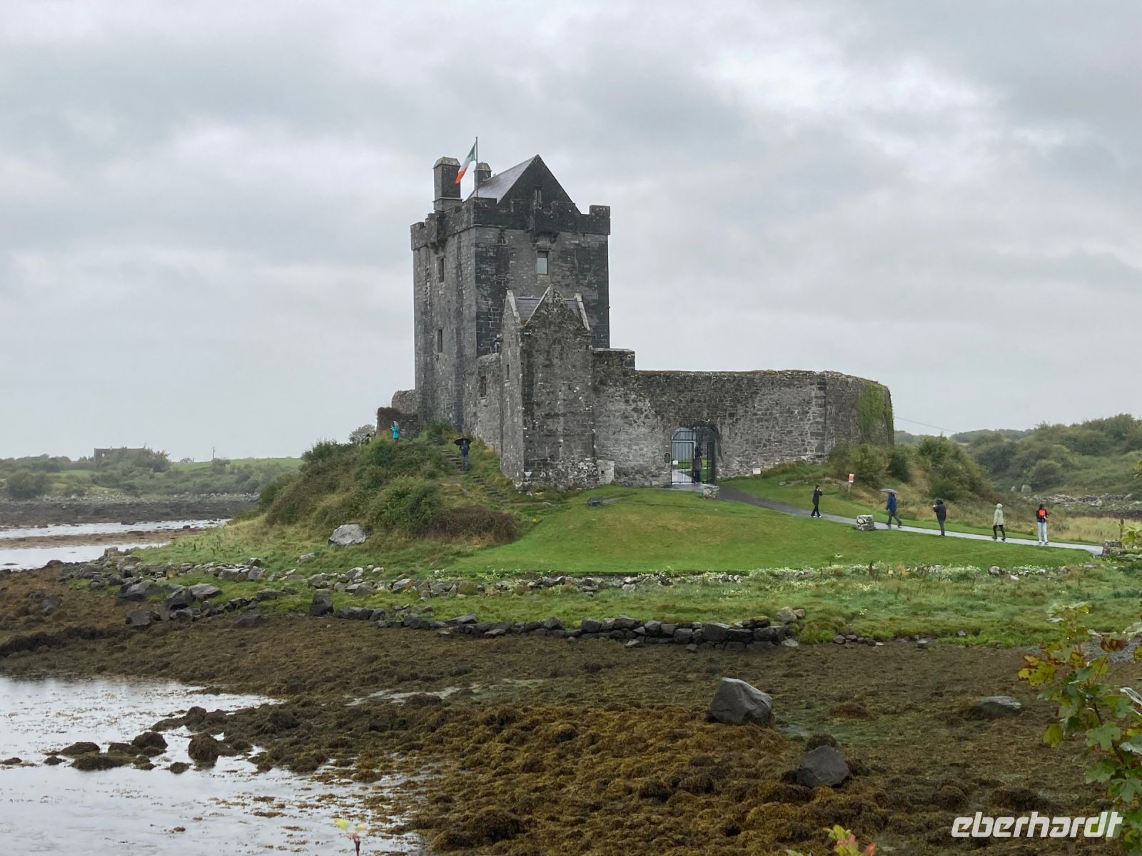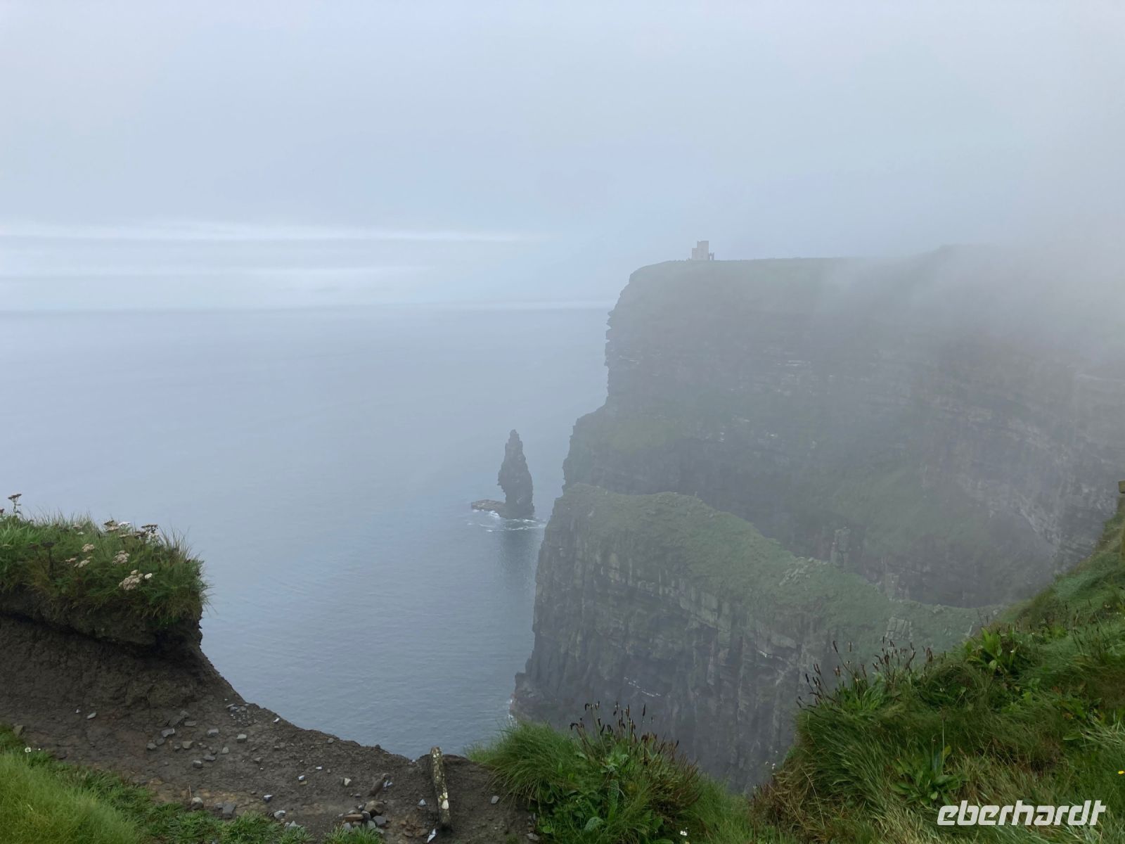 Unser Wetterglück hat uns heute leider zumindest vorerst verlassen. Der für die letzten Tage angekündigte Regen, der dann aber doch nicht kam, oder zumindest nicht so schlimm wie befürchtet, wird heute nachgeholt. Anders ausgedrückt: es schüttet fast den ganzen Tag. Donal ist froh, dass er heute nicht fahren muss. Stattdessen quäle ich unseren Ersatzfahrer Seamus durch den Regen und enge irische Straßen. Unsere Wanderung im Burren fällt damit leider auch ins Wasser und ich improvisiere ein Ersatzprogramm. Doch zunächst fahren wir noch planmäßig zum „Schiefen Turm von Irland”, dem Rundturm der Kilmacduagh Abbey. Für ein Foto wagen wir uns hinaus in den Regen, während Seamus den Bus wendet. Über Gort fahren wir dann nach Kinvara an der Bucht von Galway und machen einen weiteren Fotostopp am Dunghaire Castle, einem rekonstruierten typischen Wohnturm aus dem 16. Jahrhundert. Nächster Stopp ist dann Andreas’ Lieblingsort im gesamten Burren: die Hazel Mountain Chocolate Factory, wo wir sogar eine kleine Führung samt Kostprobe erhalten. Der Poulnabrone Dolmen ist eine Grabstätte aus der Jungsteinzeit mitten im Burren und der Weg dorthin erfordert Seamus ganze Fahrkünste, vor allem, wenn uns ein Auto entgegenkommt. Aber wir schaffen es dank Baucheinziehen und können hier einen weiteren Fotostopp einlegen. Nun bekommen wir aber langsam Hunger und Durst, vor allem auch, weil uns der Reiseleiter vom Irish Coffee und leckeren Fish & Chips vorschwärmt. Deshalb ist das Pub O’Donohue’s Bar in Fanore unser nächster Anlaufpunkt. Gut gestärkt und gut gelaunt ziehen wir weiter zu den Cliffs of Moher, die zum Glück am heutigen Nachmittag nicht so voller Menschen sind, wie im Hochsommer. Und zum Glück reißt auch die Wolkendecke gerade bei unserer Ankunft für eine halbe Stunde auf, sodass wir die Klippen sehen und Fotos machen können. Ich kann außerdem gut beobachten, wie der Westwind die Feuchtigkeit und die Wolken regelrecht über die Klippen nach oben saugt. Und plötzlich sind die Klippen auch wieder im dichten Nebel verschwunden. Wieder Glück gehabt! Auf der Rückfahrt nach Gort über Lahinch und Ennistymon sehen wir einen ganz tollen, kräftigen Regenbogen.