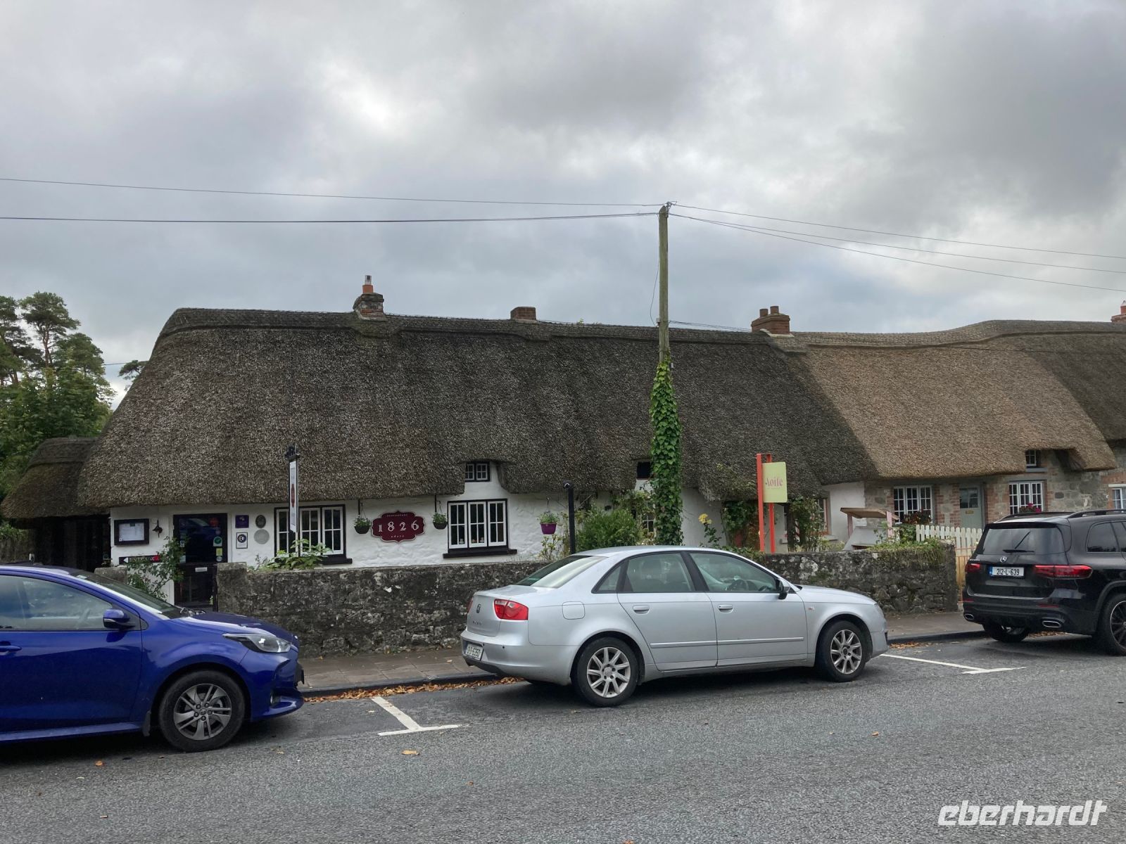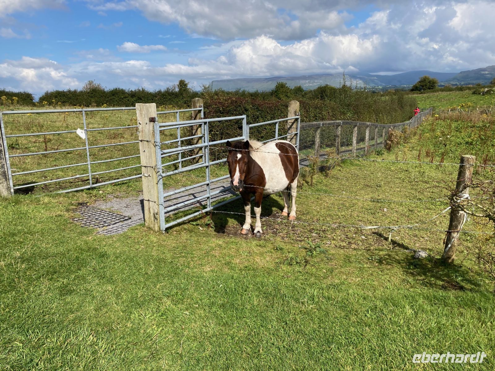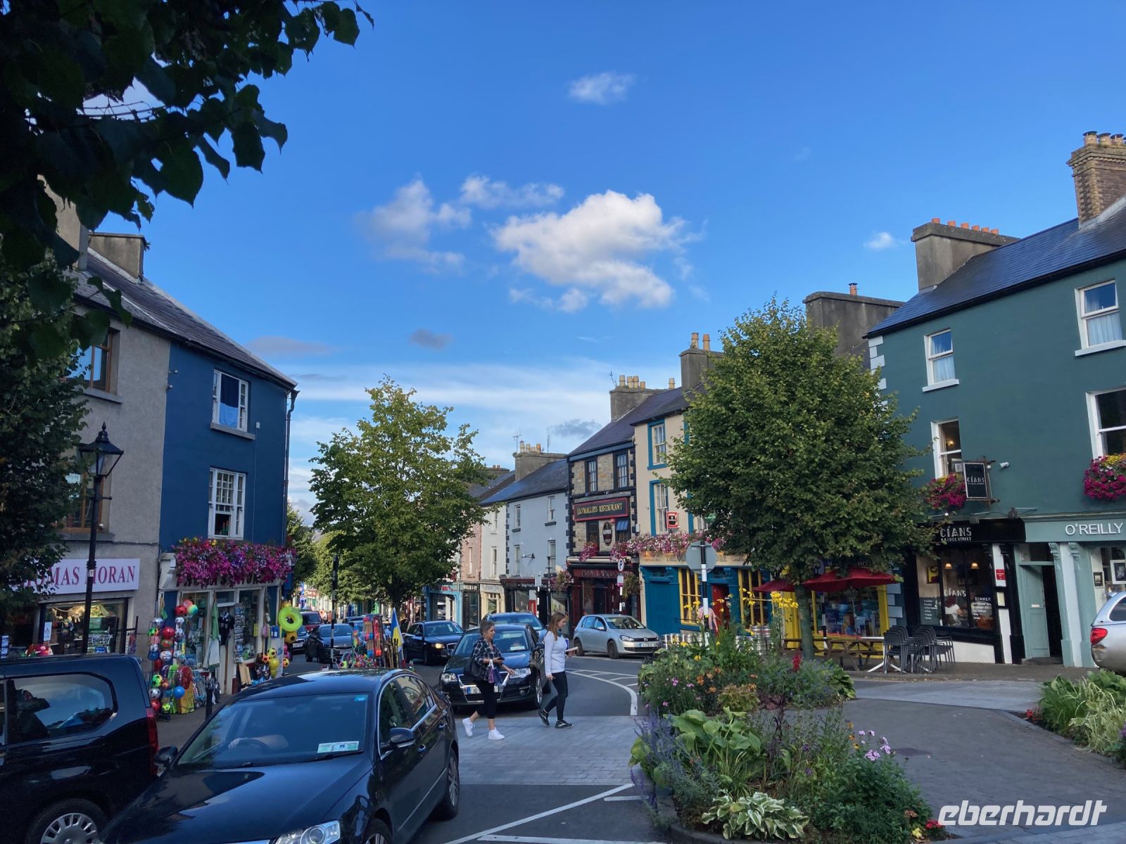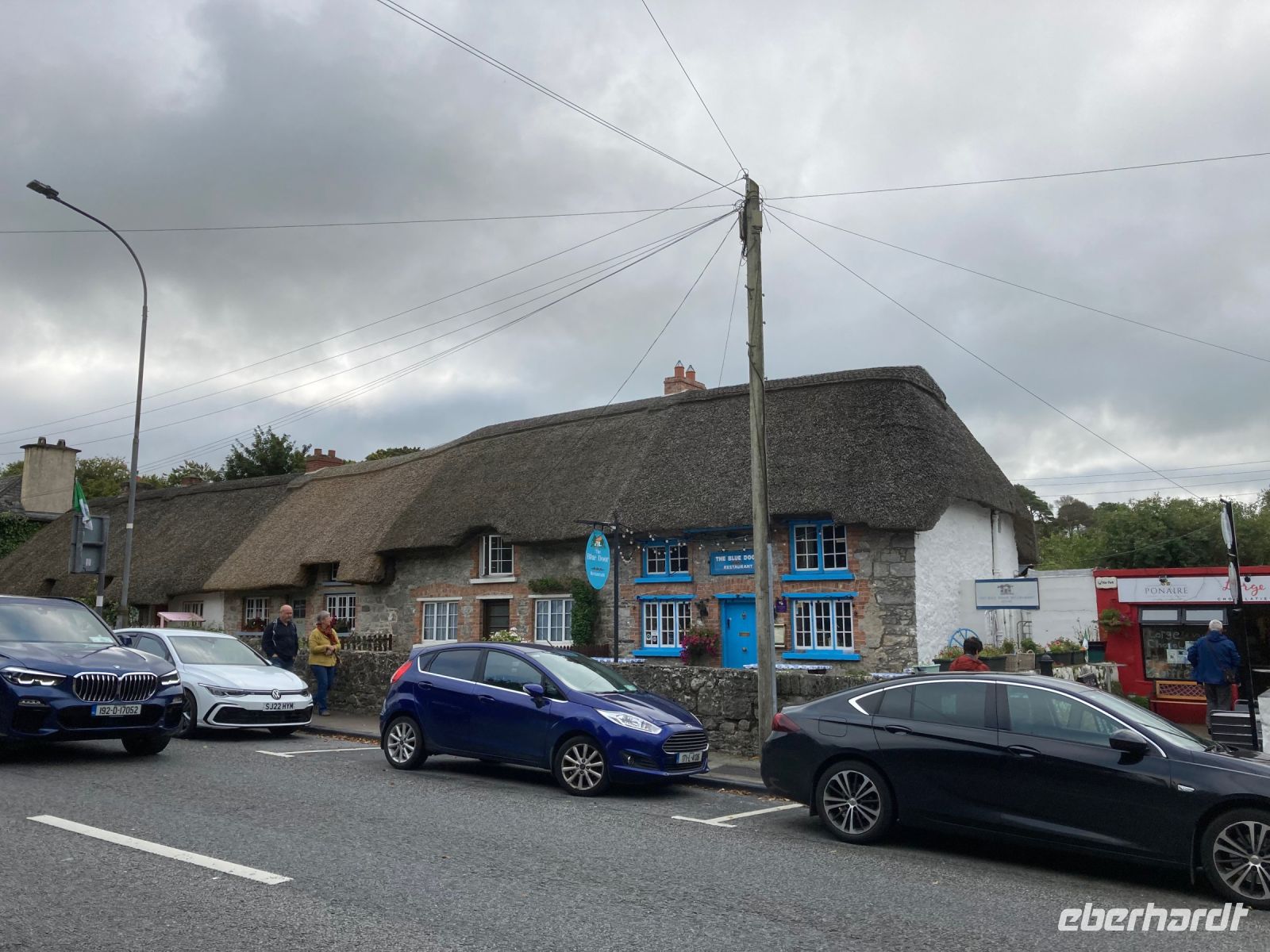 Der Wechsel von der West- zurück an die Ostküste läutet langsam das Ende unserer Reise ein. Die für diese Reise vergleichsweise lange Fahrstrecke wird durch zwei interessante Stopps unterbrochen und damit gut erträglich. Adare ist einerseits ein hübsches kleines Örtchen mit alten Cottages aus dem frühen 19. Jahrhundert und beherbergt andererseits die Ruinen des Desmond Castle. Es war mit zwei Burggräben sowie einer äußeren und inneren Burg eine der größten normannischen Burgen Irlands und sogar Europas. Gemeinsam mit unserer Führerin Mary erkunden wir die Ruinen und erfahren viel über das Leben in einer Burg im 13. Jahrhundert. In Adare bleibt noch etwas Freizeit bis zur Abfahrt, um entlang der Hauptstraße zu schlendern. Auch auf dem Nationalgestüt bei Kildare erhalten wir dann am Nachmittag eine Führung und tauchen in die Hobbywelt der Superreichen ein, für die 60.000 € Deckgeld Peanuts sind. Wir sehen sogar den Superstar unter den Zuchthengsten, der gerade geduscht und anschließend zurück in seine Box geführt wird. Viel zutraulicher sind die lebenden Legenden, die auf dem Gestüt ihren Ruhestand genießen, sowie die kleinen Fohlen. Bei ihrer Fütterung stürzt sich plötzlich eine ganze Schar Enten aus dem Garten hervor und kämpft laut schnatternd um ihren Anteil. Fast wie auf einer Kreuzfahrt am Kuchenbuffet! Nach der Führung drehen wir noch eine Runde über das Gestüt und statten auch den anderen Hengsten einen Besuch ab. Auch zwei Connemara-Ponys von der Kylemore Abbey wohnen gerade hier. Eine weitere Attraktion des Gestüts ist der japanische Garten, den sich der Gründer des Gestüts vor über 100 Jahren anlegen ließ. Und der Kuchen im Café sieht ebenfalls sehr interessant aus … Donal hat sich schon die ganze Reise auf seinen Banoffee Pie gefreut. Durch den Feierabendverkehr um Dublin kommen wir vergleichsweise gut durch, sodass wir nach nur etwas mehr als einer Stunde unser letztes Hotel in den Wicklow Mountains erreichen. Im erst kürzlich renovierten, sehr schicken Restaurant erwartet uns wieder ein leckeres 3-Gänge-Menü — sogar mit ausreichend Soße!