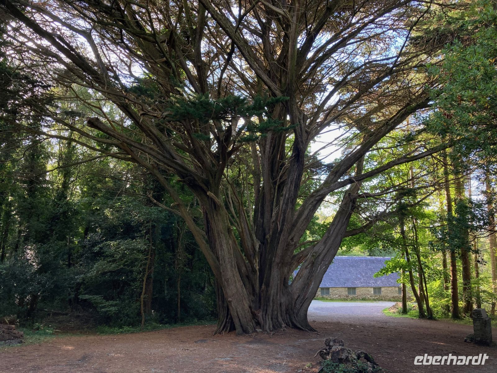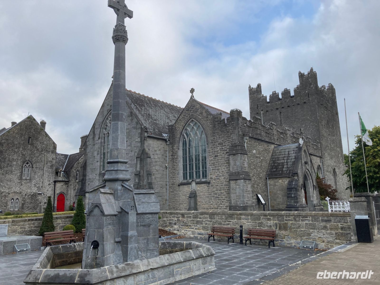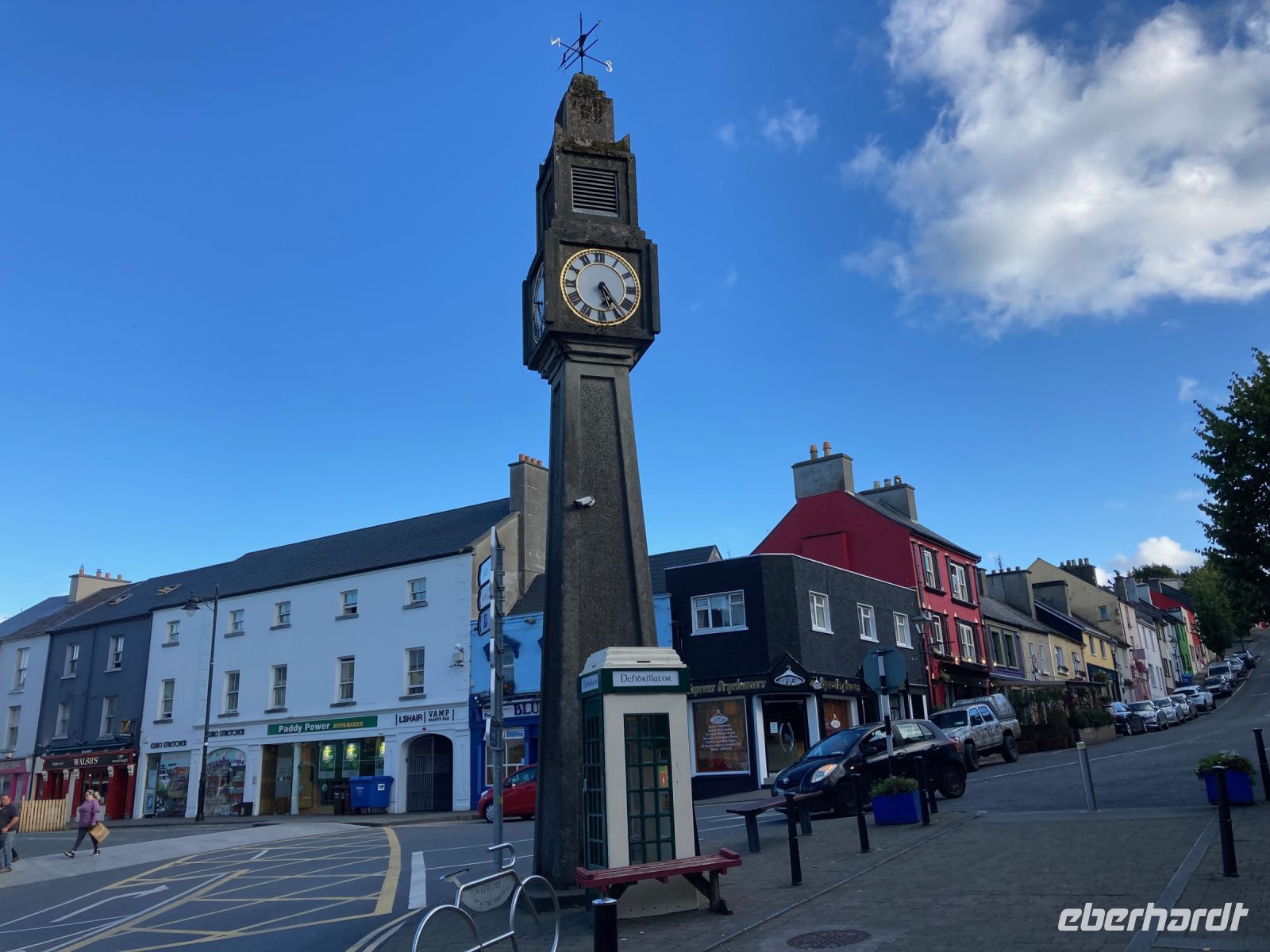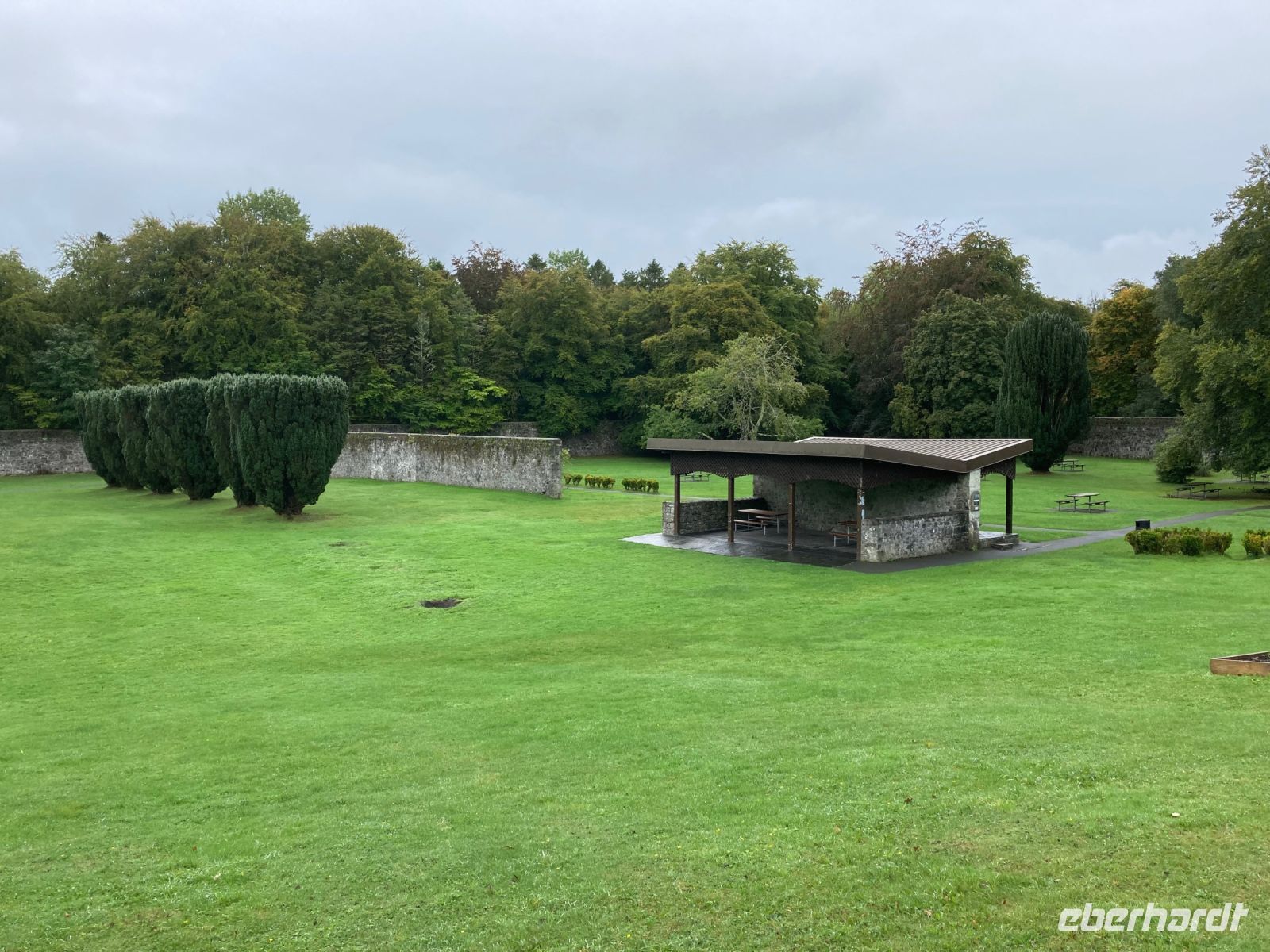 Der Wechsel von der West- zurück an die Ostküste läutet langsam das Ende unserer Reise ein. Die für diese Reise vergleichsweise lange Fahrstrecke wird durch zwei interessante Stopps unterbrochen und damit gut erträglich. Adare ist einerseits ein hübsches kleines Örtchen mit alten Cottages aus dem frühen 19. Jahrhundert und beherbergt andererseits die Ruinen des Desmond Castle. Es war mit zwei Burggräben sowie einer äußeren und inneren Burg eine der größten normannischen Burgen Irlands und sogar Europas. Gemeinsam mit unserer Führerin Mary erkunden wir die Ruinen und erfahren viel über das Leben in einer Burg im 13. Jahrhundert. In Adare bleibt noch etwas Freizeit bis zur Abfahrt, um entlang der Hauptstraße zu schlendern. Auch auf dem Nationalgestüt bei Kildare erhalten wir dann am Nachmittag eine Führung und tauchen in die Hobbywelt der Superreichen ein, für die 60.000 € Deckgeld Peanuts sind. Wir sehen sogar den Superstar unter den Zuchthengsten, der gerade geduscht und anschließend zurück in seine Box geführt wird. Viel zutraulicher sind die lebenden Legenden, die auf dem Gestüt ihren Ruhestand genießen, sowie die kleinen Fohlen. Bei ihrer Fütterung stürzt sich plötzlich eine ganze Schar Enten aus dem Garten hervor und kämpft laut schnatternd um ihren Anteil. Fast wie auf einer Kreuzfahrt am Kuchenbuffet! Nach der Führung drehen wir noch eine Runde über das Gestüt und statten auch den anderen Hengsten einen Besuch ab. Auch zwei Connemara-Ponys von der Kylemore Abbey wohnen gerade hier. Eine weitere Attraktion des Gestüts ist der japanische Garten, den sich der Gründer des Gestüts vor über 100 Jahren anlegen ließ. Und der Kuchen im Café sieht ebenfalls sehr interessant aus … Donal hat sich schon die ganze Reise auf seinen Banoffee Pie gefreut. Durch den Feierabendverkehr um Dublin kommen wir vergleichsweise gut durch, sodass wir nach nur etwas mehr als einer Stunde unser letztes Hotel in den Wicklow Mountains erreichen. Im erst kürzlich renovierten, sehr schicken Restaurant erwartet uns wieder ein leckeres 3-Gänge-Menü — sogar mit ausreichend Soße!