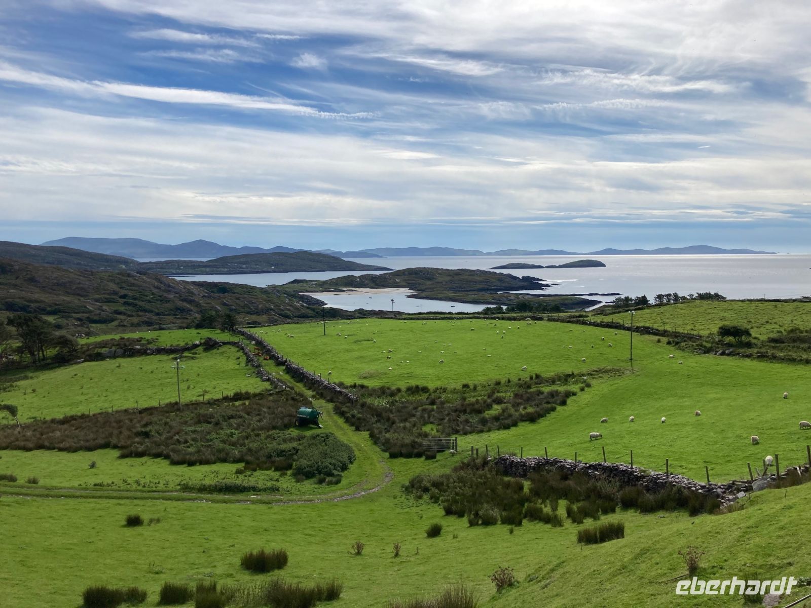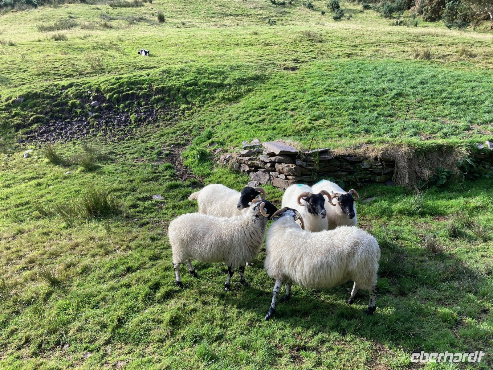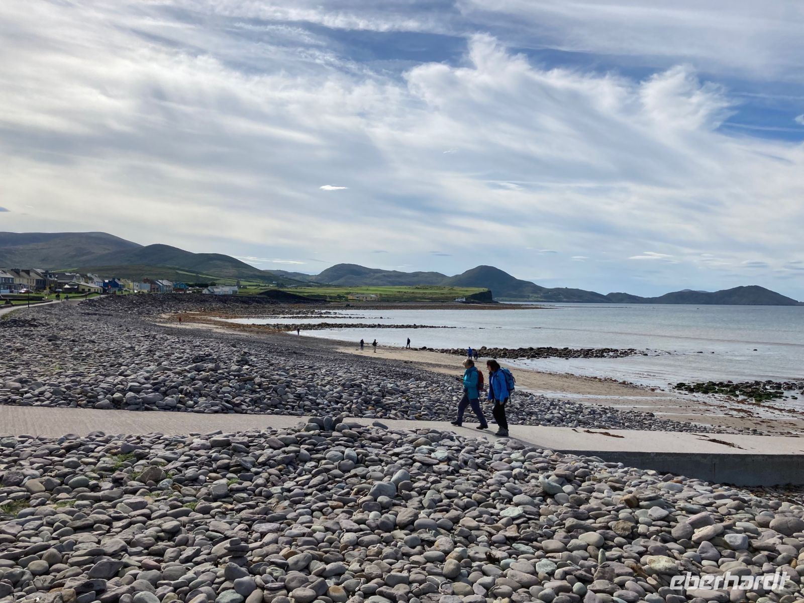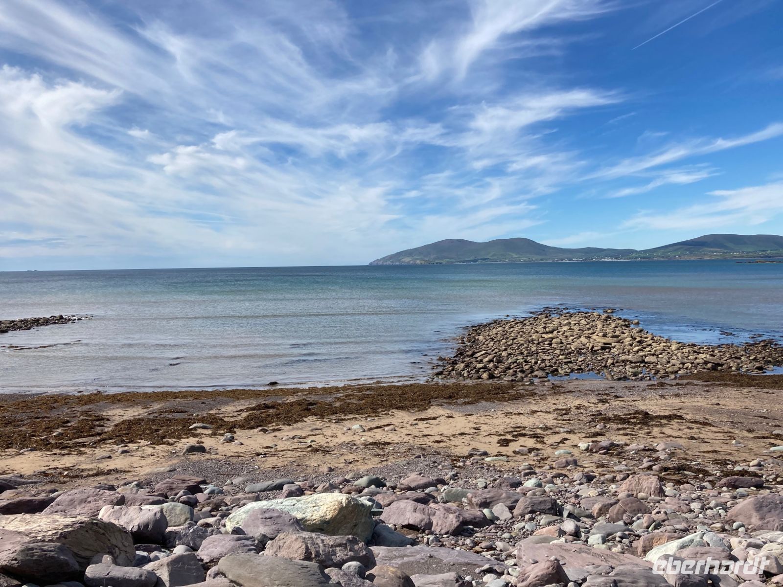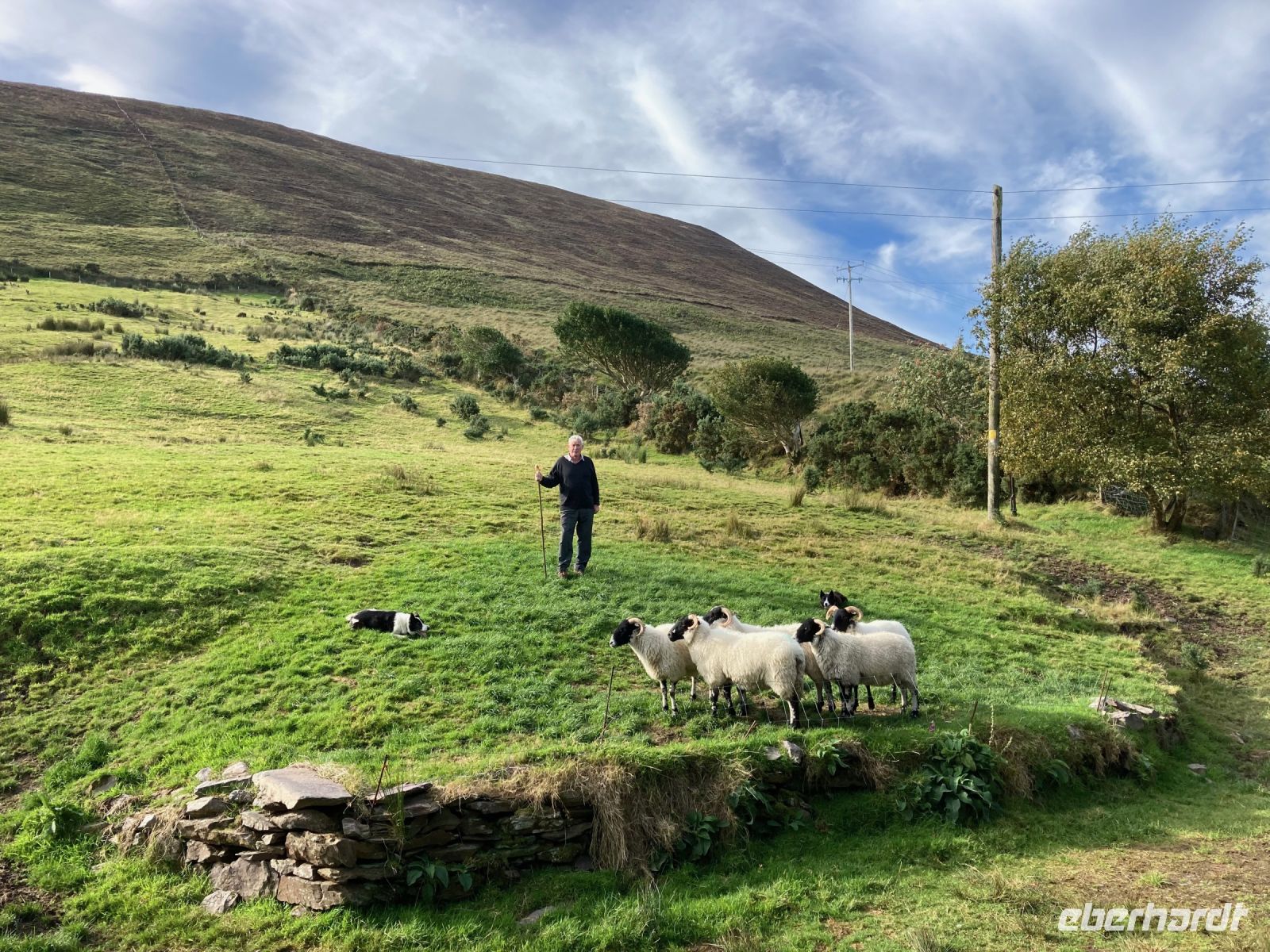 Das schöne Wetter ist zurück! Und genau zum richtigen Zeitpunkt! So können wir nämlich heute auf dem Ring of Kerry eine zusätzliche Wanderung machen. Doch zunächst wartet in Kells eine weitere Überraschung auf meine Gäste. Nach einem ersten Fotostopp mit Blick auf die Bucht von Dingle halten wir nämlich beim Schäfer Brendan mit seinen beiden treuen Border Collies, die uns nicht nur eine eindrucksvolle Demonstration ihres Könnens geben, sondern auch verschiedene, teils seltene Schafrassen vorstellen. Anschließend klettern wir in der Nähe von Cahersiveen auf den Mauern des Ringforts Cahergall herum und versetzen uns gedanklich noch einmal in die Zeit der Kelten zurück. Am Ende der Hauptsaison haben wir es sogar ganz für uns. In Waterville stärken wir uns während der Mittagspause für unsere anschließende Wanderung. Bei diesem schönen Wetter können wir uns gut vorstellen, warum es der Lieblingsferienort von Charlie Chaplin in Irland war. Dann geht es hinauf auf den Coomakista Pass, wo uns die vielleicht beste Aussicht des heutigen Tages erwartet. Diese bleibt uns auf der Wanderung hinunter zum Strand am Derrynane House erhalten. Wir fühlen uns eher wie am Mittelmeer, als im angeblich so verregneten Irland. Sogar die Skellig Islands tauchen während der Wanderung noch einmal am Horizont auf. Der traumhaft schöne Strand lädt dann zum Baden ein, während im Café am Derrynane House Eis und Kaffee locken. Hier könnten wir wieder länger verweilen, doch auf dem Ring of Kerry gibt es noch mehr zu sehen. Am Aussichtspunkt „Ladies‘ View“ können wir einen ersten Blick auf die Seen des Killarney-Nationalparks werfen. Beim Spaziergang durch den inzwischen angenehm ruhigen Park vom Torc-Wasserfall zum Muckross House sehen wir das altehrwürdige Herrenhaus mit seiner wunderschönen Gartenanlage im Licht der Abendsonne glänzen. Auf der Rückfahrt nach Tralee über Killarney sichten wir unsere vielen Fotos und schwelgen bereits in ersten Erinnerungen an diesen eindrucksreichen und sonnigen Tag.