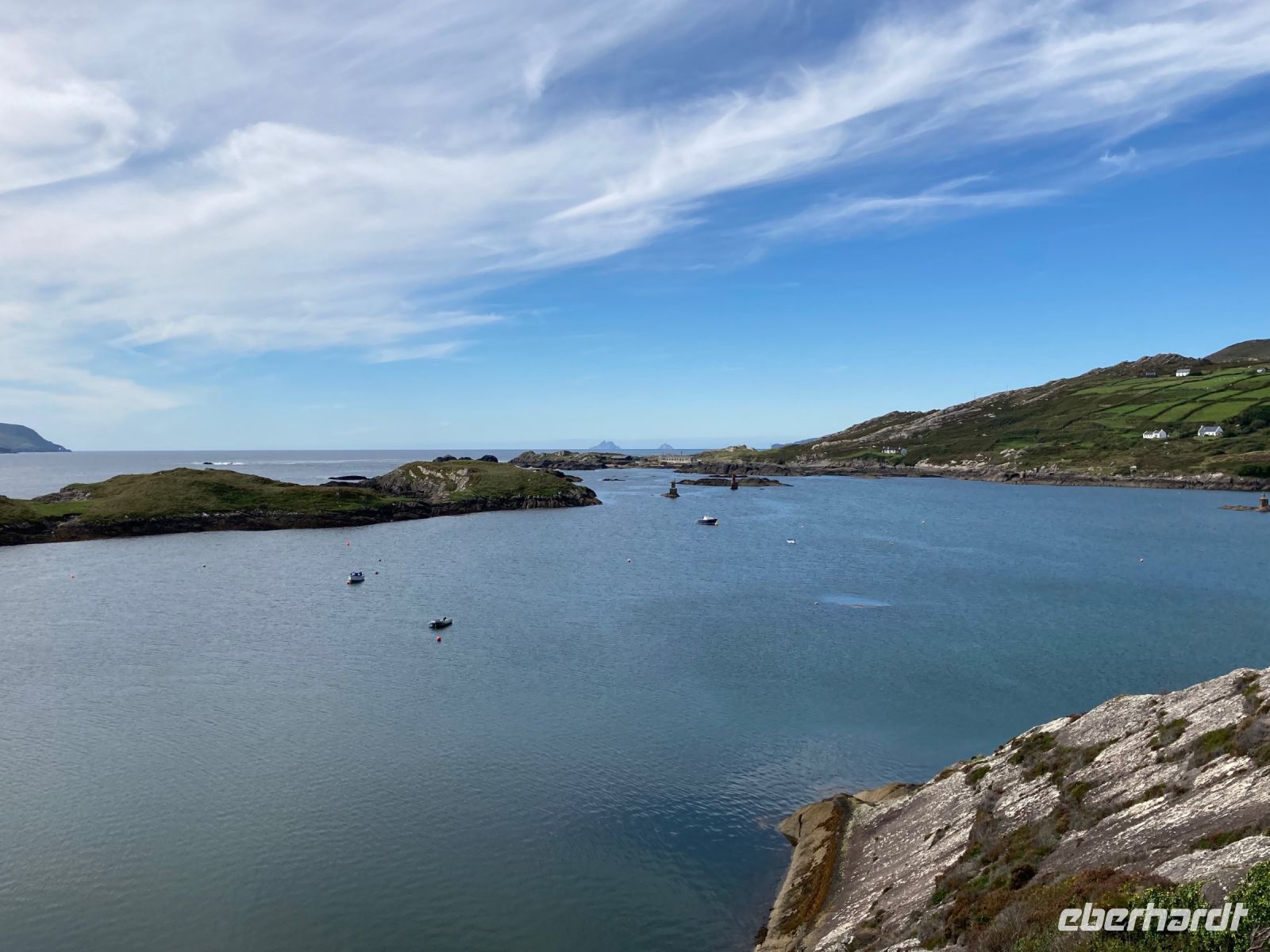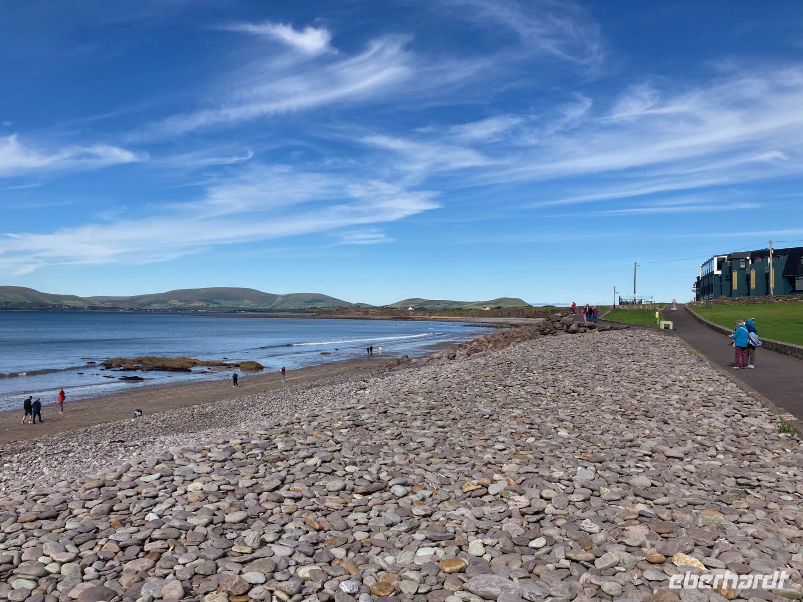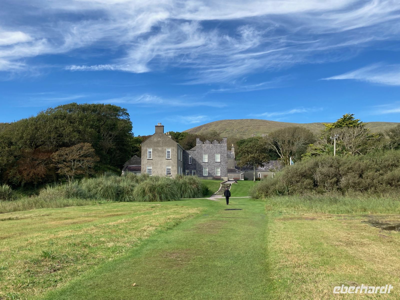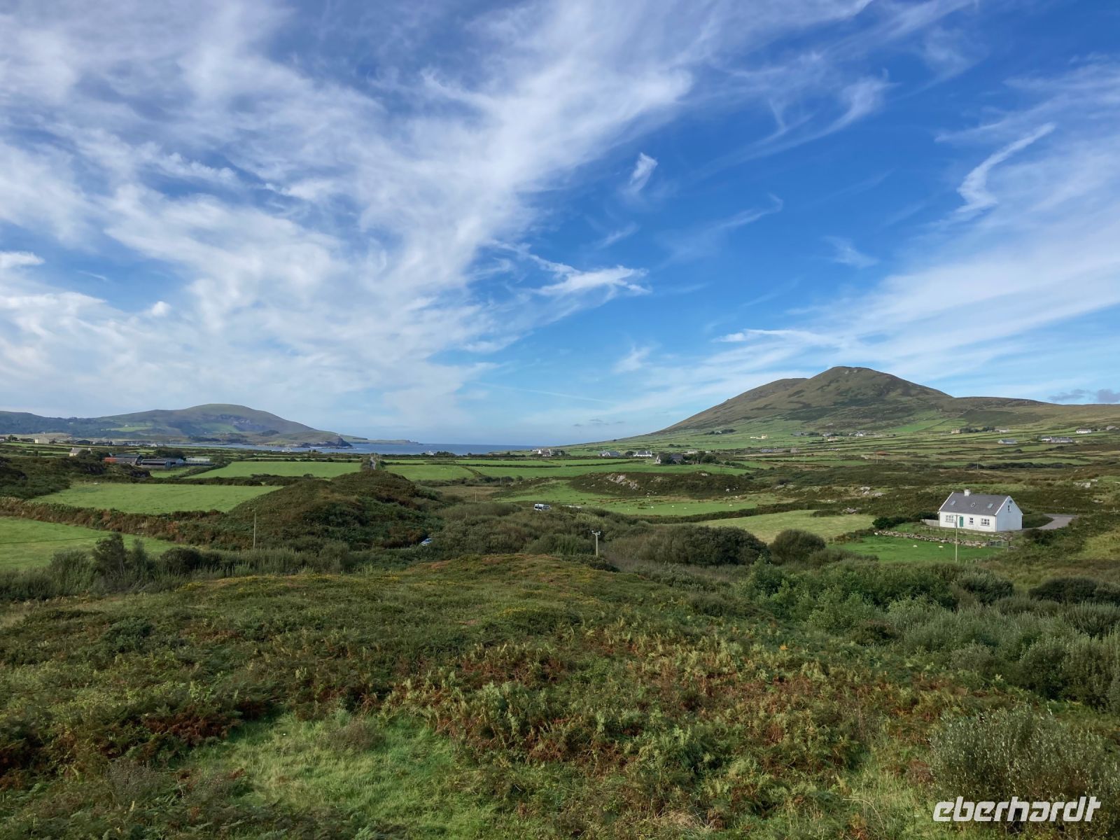 Das schöne Wetter ist zurück! Und genau zum richtigen Zeitpunkt! So können wir nämlich heute auf dem Ring of Kerry eine zusätzliche Wanderung machen. Doch zunächst wartet in Kells eine weitere Überraschung auf meine Gäste. Nach einem ersten Fotostopp mit Blick auf die Bucht von Dingle halten wir nämlich beim Schäfer Brendan mit seinen beiden treuen Border Collies, die uns nicht nur eine eindrucksvolle Demonstration ihres Könnens geben, sondern auch verschiedene, teils seltene Schafrassen vorstellen. Anschließend klettern wir in der Nähe von Cahersiveen auf den Mauern des Ringforts Cahergall herum und versetzen uns gedanklich noch einmal in die Zeit der Kelten zurück. Am Ende der Hauptsaison haben wir es sogar ganz für uns. In Waterville stärken wir uns während der Mittagspause für unsere anschließende Wanderung. Bei diesem schönen Wetter können wir uns gut vorstellen, warum es der Lieblingsferienort von Charlie Chaplin in Irland war. Dann geht es hinauf auf den Coomakista Pass, wo uns die vielleicht beste Aussicht des heutigen Tages erwartet. Diese bleibt uns auf der Wanderung hinunter zum Strand am Derrynane House erhalten. Wir fühlen uns eher wie am Mittelmeer, als im angeblich so verregneten Irland. Sogar die Skellig Islands tauchen während der Wanderung noch einmal am Horizont auf. Der traumhaft schöne Strand lädt dann zum Baden ein, während im Café am Derrynane House Eis und Kaffee locken. Hier könnten wir wieder länger verweilen, doch auf dem Ring of Kerry gibt es noch mehr zu sehen. Am Aussichtspunkt „Ladies‘ View“ können wir einen ersten Blick auf die Seen des Killarney-Nationalparks werfen. Beim Spaziergang durch den inzwischen angenehm ruhigen Park vom Torc-Wasserfall zum Muckross House sehen wir das altehrwürdige Herrenhaus mit seiner wunderschönen Gartenanlage im Licht der Abendsonne glänzen. Auf der Rückfahrt nach Tralee über Killarney sichten wir unsere vielen Fotos und schwelgen bereits in ersten Erinnerungen an diesen eindrucksreichen und sonnigen Tag.