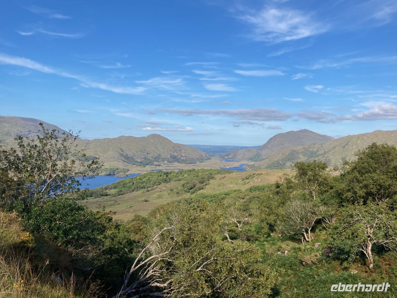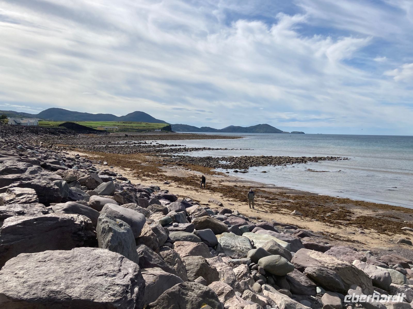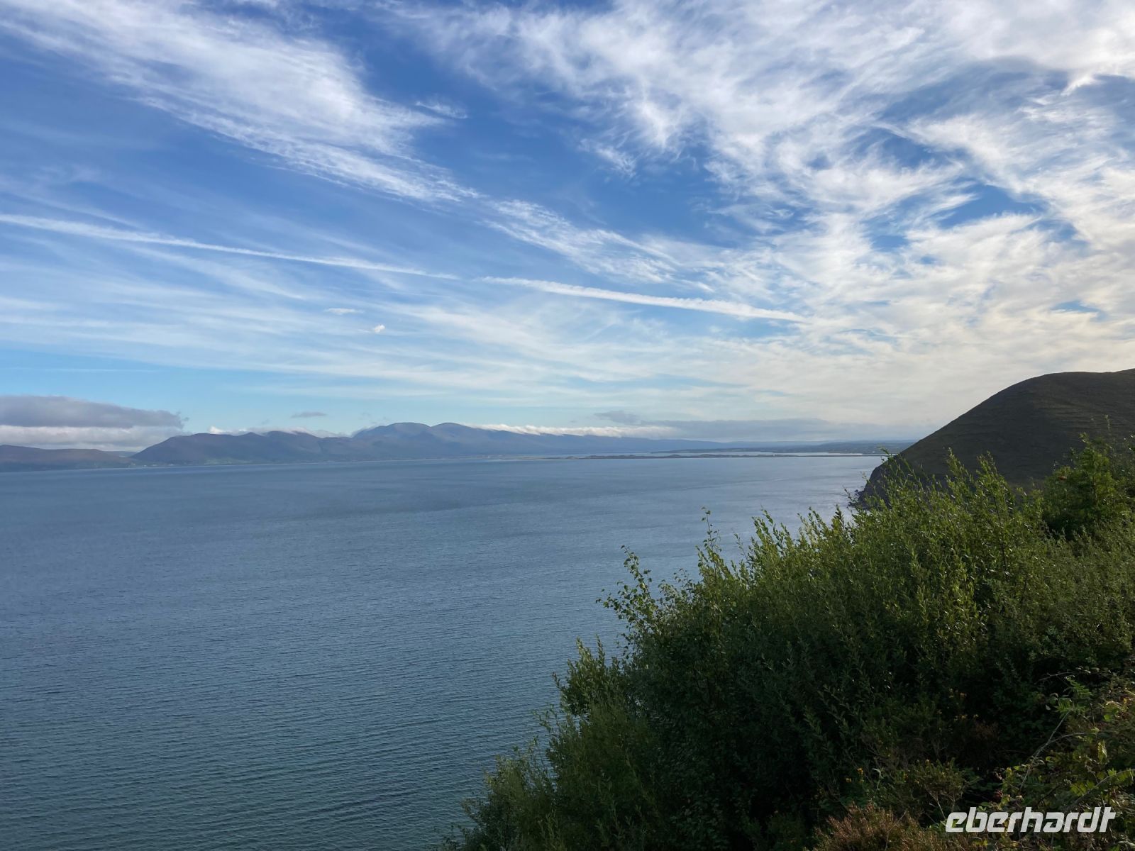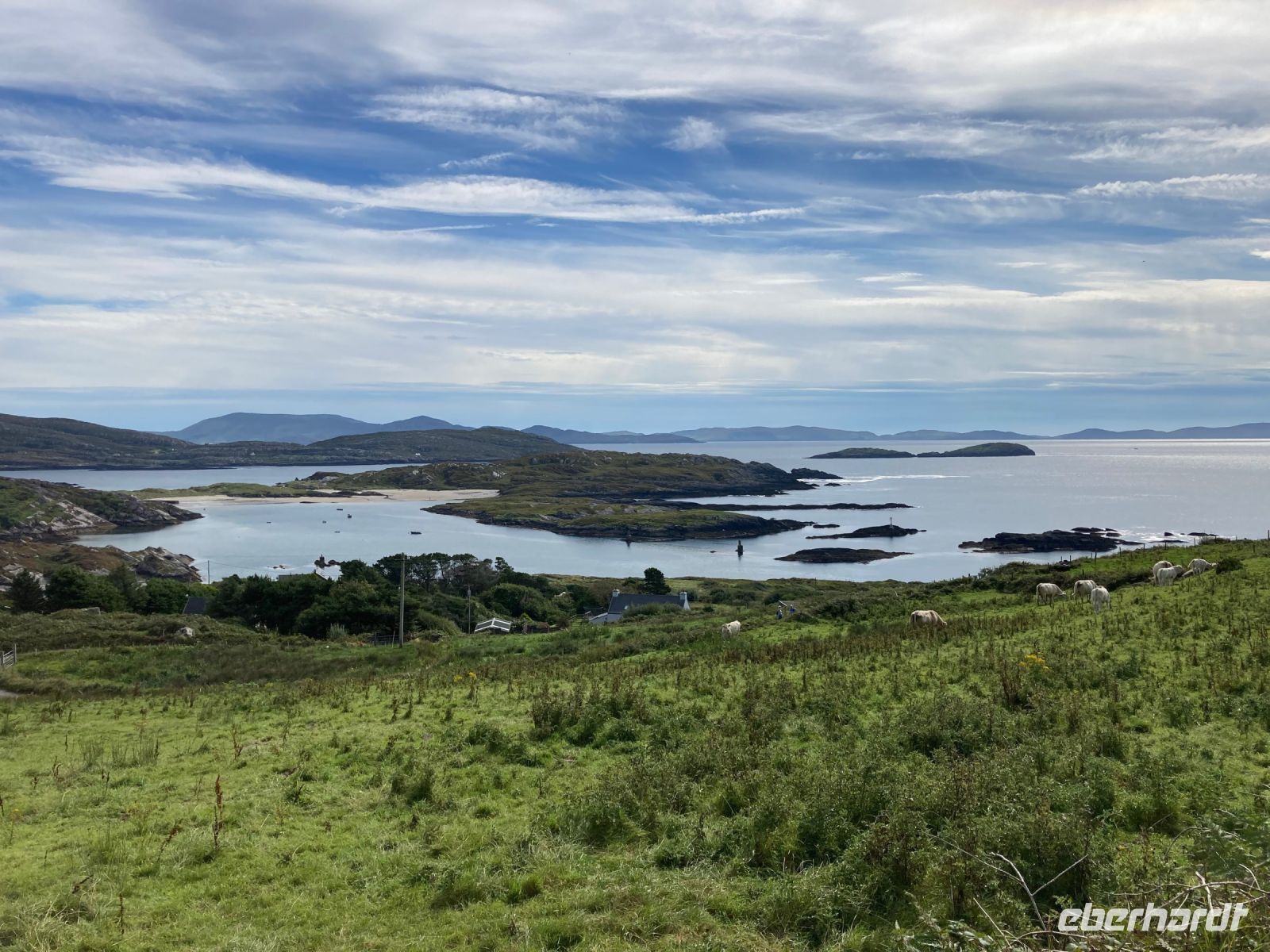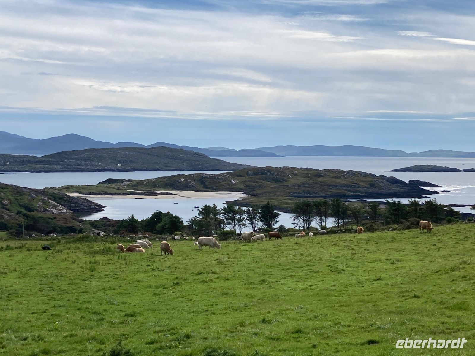 Das schöne Wetter ist zurück! Und genau zum richtigen Zeitpunkt! So können wir nämlich heute auf dem Ring of Kerry eine zusätzliche Wanderung machen. Doch zunächst wartet in Kells eine weitere Überraschung auf meine Gäste. Nach einem ersten Fotostopp mit Blick auf die Bucht von Dingle halten wir nämlich beim Schäfer Brendan mit seinen beiden treuen Border Collies, die uns nicht nur eine eindrucksvolle Demonstration ihres Könnens geben, sondern auch verschiedene, teils seltene Schafrassen vorstellen. Anschließend klettern wir in der Nähe von Cahersiveen auf den Mauern des Ringforts Cahergall herum und versetzen uns gedanklich noch einmal in die Zeit der Kelten zurück. Am Ende der Hauptsaison haben wir es sogar ganz für uns. In Waterville stärken wir uns während der Mittagspause für unsere anschließende Wanderung. Bei diesem schönen Wetter können wir uns gut vorstellen, warum es der Lieblingsferienort von Charlie Chaplin in Irland war. Dann geht es hinauf auf den Coomakista Pass, wo uns die vielleicht beste Aussicht des heutigen Tages erwartet. Diese bleibt uns auf der Wanderung hinunter zum Strand am Derrynane House erhalten. Wir fühlen uns eher wie am Mittelmeer, als im angeblich so verregneten Irland. Sogar die Skellig Islands tauchen während der Wanderung noch einmal am Horizont auf. Der traumhaft schöne Strand lädt dann zum Baden ein, während im Café am Derrynane House Eis und Kaffee locken. Hier könnten wir wieder länger verweilen, doch auf dem Ring of Kerry gibt es noch mehr zu sehen. Am Aussichtspunkt „Ladies‘ View“ können wir einen ersten Blick auf die Seen des Killarney-Nationalparks werfen. Beim Spaziergang durch den inzwischen angenehm ruhigen Park vom Torc-Wasserfall zum Muckross House sehen wir das altehrwürdige Herrenhaus mit seiner wunderschönen Gartenanlage im Licht der Abendsonne glänzen. Auf der Rückfahrt nach Tralee über Killarney sichten wir unsere vielen Fotos und schwelgen bereits in ersten Erinnerungen an diesen eindrucksreichen und sonnigen Tag.