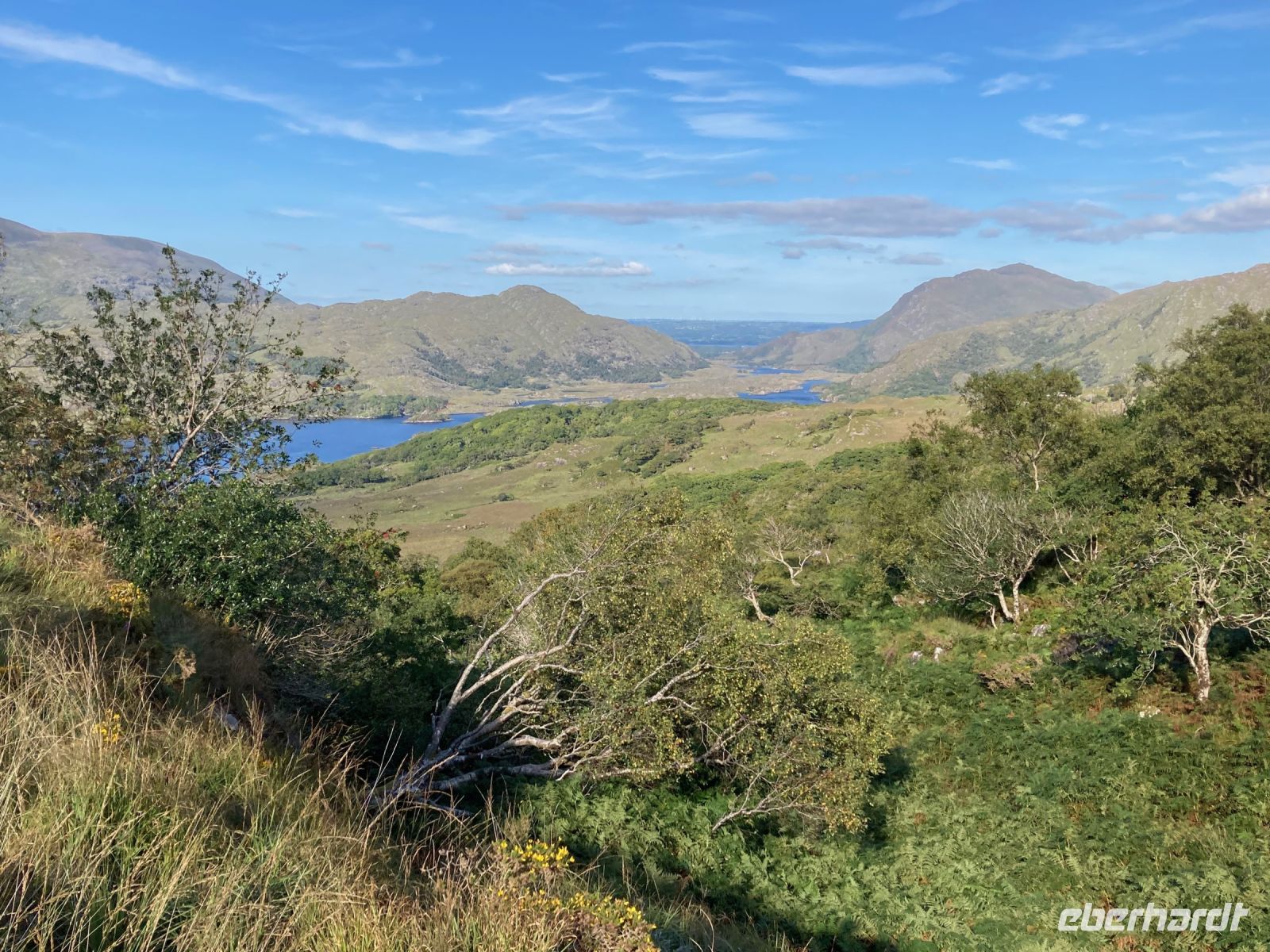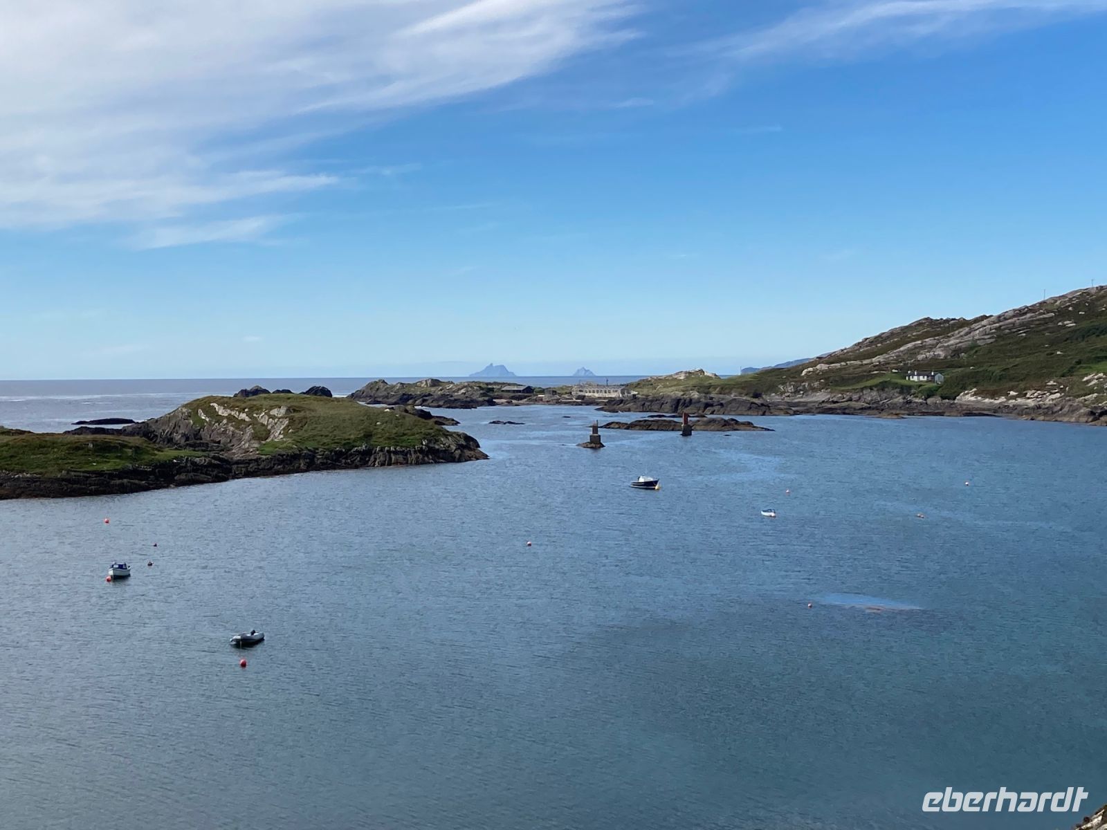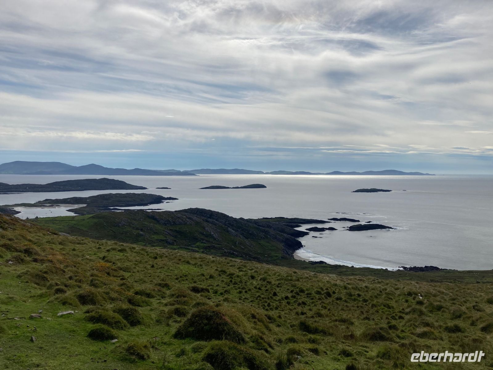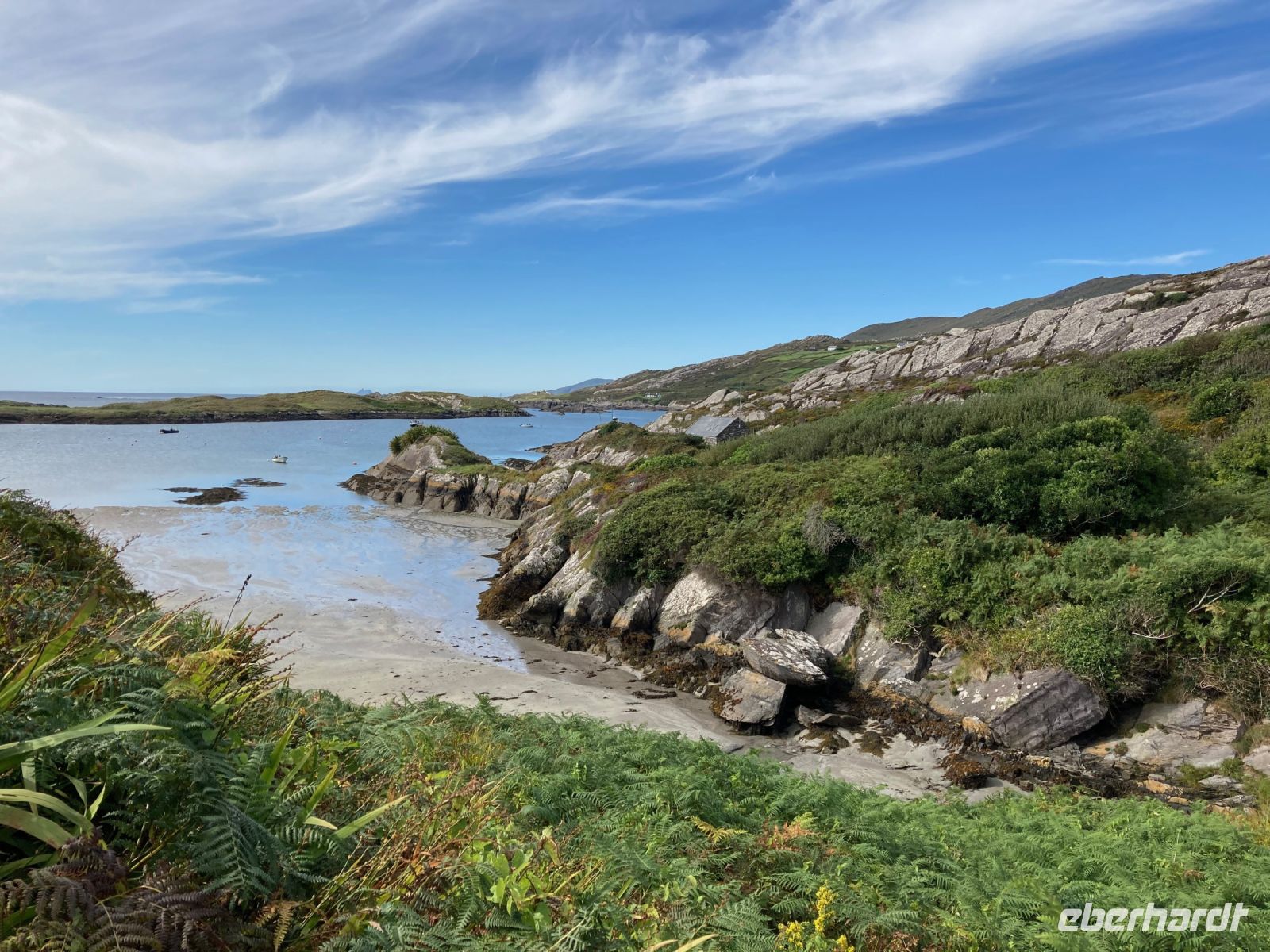 Das schöne Wetter ist zurück! Und genau zum richtigen Zeitpunkt! So können wir nämlich heute auf dem Ring of Kerry eine zusätzliche Wanderung machen. Doch zunächst wartet in Kells eine weitere Überraschung auf meine Gäste. Nach einem ersten Fotostopp mit Blick auf die Bucht von Dingle halten wir nämlich beim Schäfer Brendan mit seinen beiden treuen Border Collies, die uns nicht nur eine eindrucksvolle Demonstration ihres Könnens geben, sondern auch verschiedene, teils seltene Schafrassen vorstellen. Anschließend klettern wir in der Nähe von Cahersiveen auf den Mauern des Ringforts Cahergall herum und versetzen uns gedanklich noch einmal in die Zeit der Kelten zurück. Am Ende der Hauptsaison haben wir es sogar ganz für uns. In Waterville stärken wir uns während der Mittagspause für unsere anschließende Wanderung. Bei diesem schönen Wetter können wir uns gut vorstellen, warum es der Lieblingsferienort von Charlie Chaplin in Irland war. Dann geht es hinauf auf den Coomakista Pass, wo uns die vielleicht beste Aussicht des heutigen Tages erwartet. Diese bleibt uns auf der Wanderung hinunter zum Strand am Derrynane House erhalten. Wir fühlen uns eher wie am Mittelmeer, als im angeblich so verregneten Irland. Sogar die Skellig Islands tauchen während der Wanderung noch einmal am Horizont auf. Der traumhaft schöne Strand lädt dann zum Baden ein, während im Café am Derrynane House Eis und Kaffee locken. Hier könnten wir wieder länger verweilen, doch auf dem Ring of Kerry gibt es noch mehr zu sehen. Am Aussichtspunkt „Ladies‘ View“ können wir einen ersten Blick auf die Seen des Killarney-Nationalparks werfen. Beim Spaziergang durch den inzwischen angenehm ruhigen Park vom Torc-Wasserfall zum Muckross House sehen wir das altehrwürdige Herrenhaus mit seiner wunderschönen Gartenanlage im Licht der Abendsonne glänzen. Auf der Rückfahrt nach Tralee über Killarney sichten wir unsere vielen Fotos und schwelgen bereits in ersten Erinnerungen an diesen eindrucksreichen und sonnigen Tag.