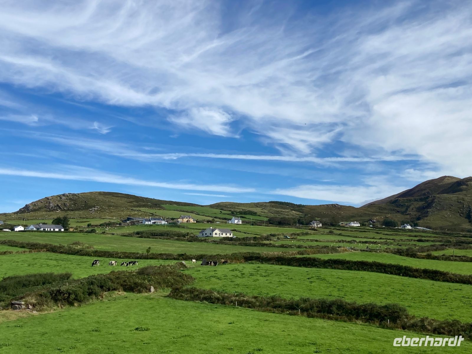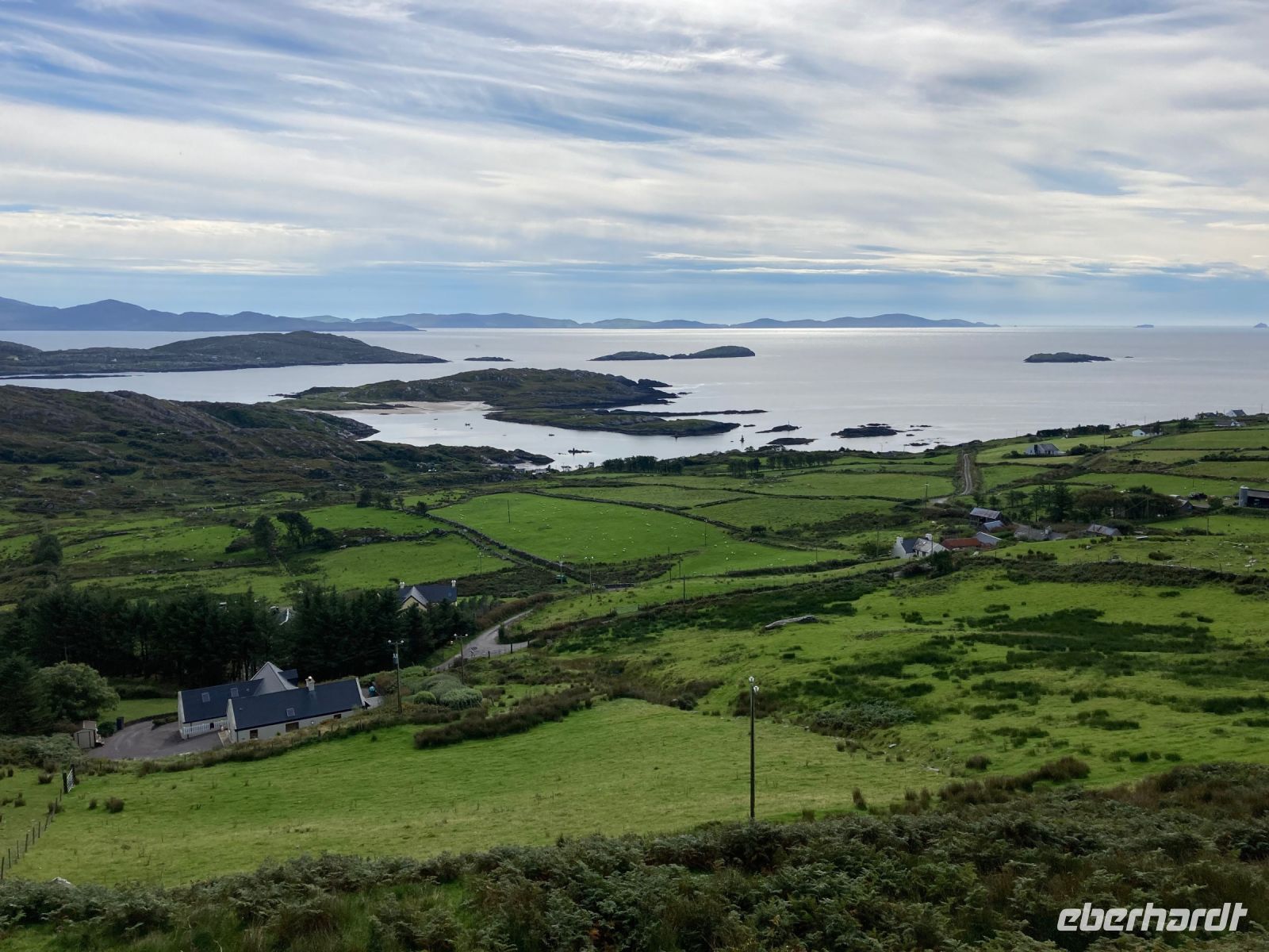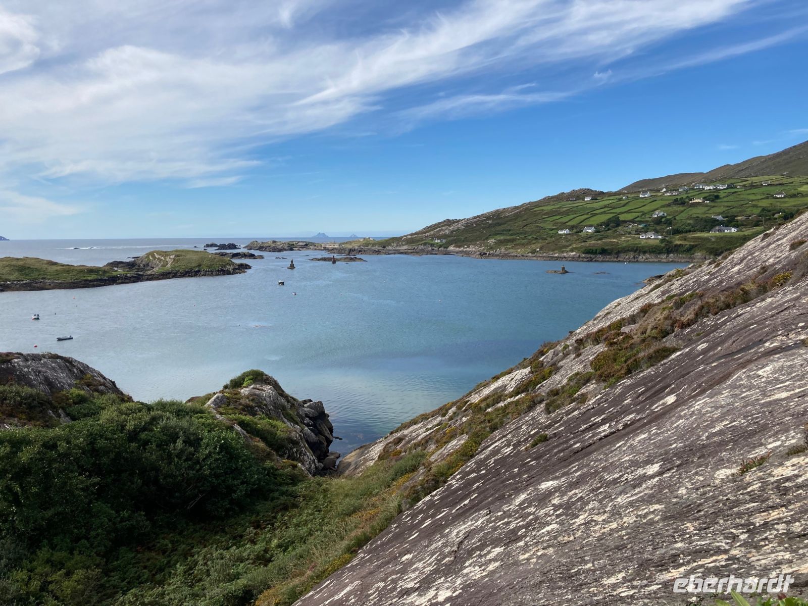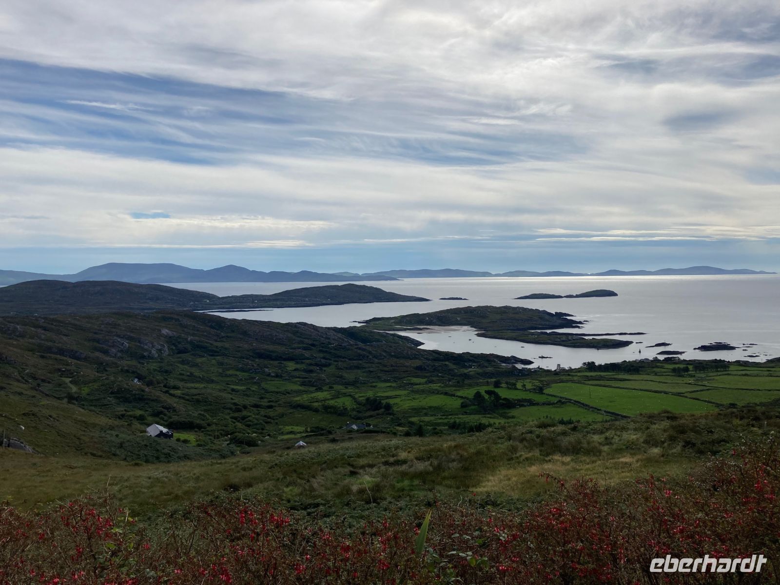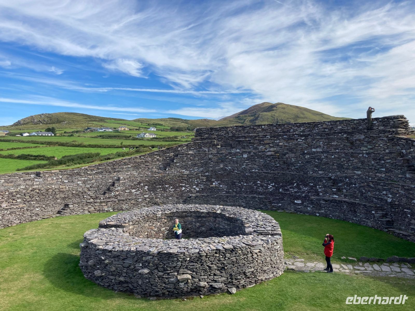 Das schöne Wetter ist zurück! Und genau zum richtigen Zeitpunkt! So können wir nämlich heute auf dem Ring of Kerry eine zusätzliche Wanderung machen. Doch zunächst wartet in Kells eine weitere Überraschung auf meine Gäste. Nach einem ersten Fotostopp mit Blick auf die Bucht von Dingle halten wir nämlich beim Schäfer Brendan mit seinen beiden treuen Border Collies, die uns nicht nur eine eindrucksvolle Demonstration ihres Könnens geben, sondern auch verschiedene, teils seltene Schafrassen vorstellen. Anschließend klettern wir in der Nähe von Cahersiveen auf den Mauern des Ringforts Cahergall herum und versetzen uns gedanklich noch einmal in die Zeit der Kelten zurück. Am Ende der Hauptsaison haben wir es sogar ganz für uns. In Waterville stärken wir uns während der Mittagspause für unsere anschließende Wanderung. Bei diesem schönen Wetter können wir uns gut vorstellen, warum es der Lieblingsferienort von Charlie Chaplin in Irland war. Dann geht es hinauf auf den Coomakista Pass, wo uns die vielleicht beste Aussicht des heutigen Tages erwartet. Diese bleibt uns auf der Wanderung hinunter zum Strand am Derrynane House erhalten. Wir fühlen uns eher wie am Mittelmeer, als im angeblich so verregneten Irland. Sogar die Skellig Islands tauchen während der Wanderung noch einmal am Horizont auf. Der traumhaft schöne Strand lädt dann zum Baden ein, während im Café am Derrynane House Eis und Kaffee locken. Hier könnten wir wieder länger verweilen, doch auf dem Ring of Kerry gibt es noch mehr zu sehen. Am Aussichtspunkt „Ladies‘ View“ können wir einen ersten Blick auf die Seen des Killarney-Nationalparks werfen. Beim Spaziergang durch den inzwischen angenehm ruhigen Park vom Torc-Wasserfall zum Muckross House sehen wir das altehrwürdige Herrenhaus mit seiner wunderschönen Gartenanlage im Licht der Abendsonne glänzen. Auf der Rückfahrt nach Tralee über Killarney sichten wir unsere vielen Fotos und schwelgen bereits in ersten Erinnerungen an diesen eindrucksreichen und sonnigen Tag.