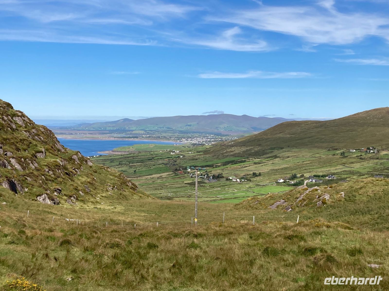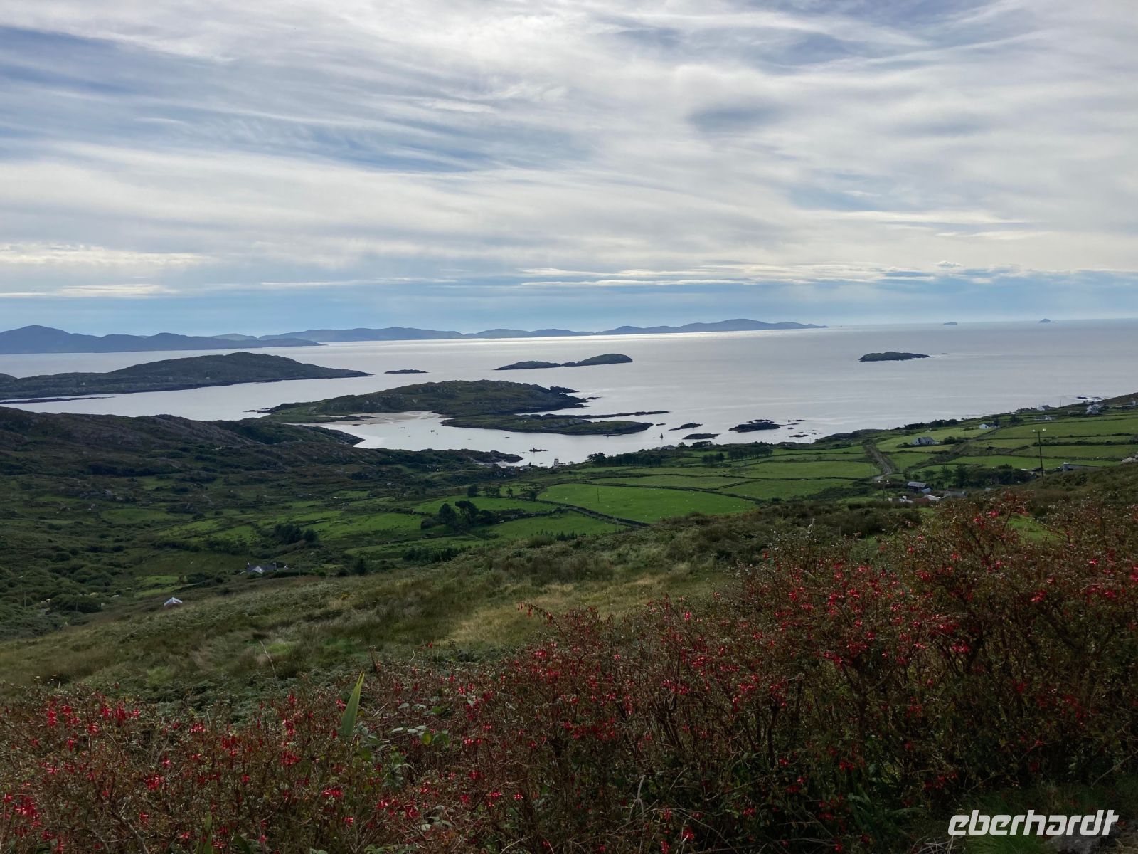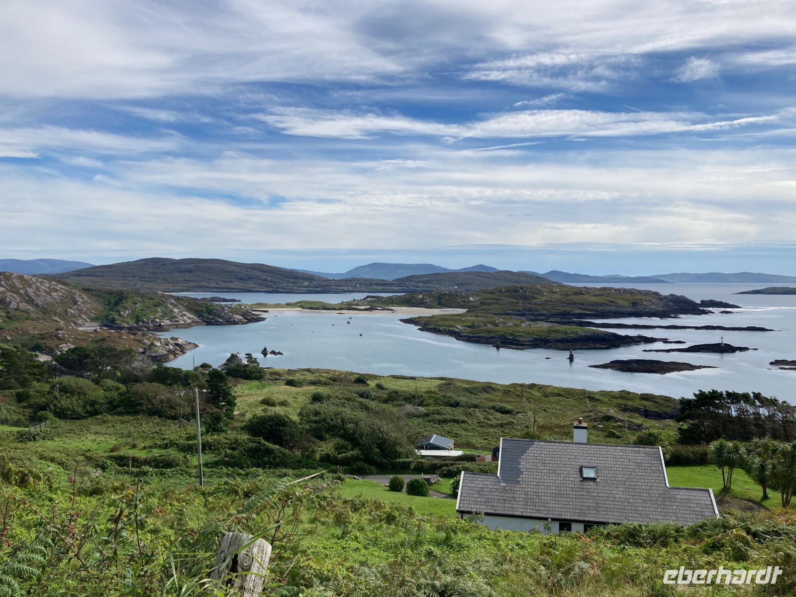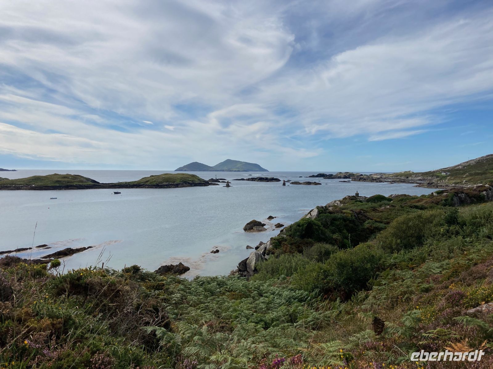 Das schöne Wetter ist zurück! Und genau zum richtigen Zeitpunkt! So können wir nämlich heute auf dem Ring of Kerry eine zusätzliche Wanderung machen. Doch zunächst wartet in Kells eine weitere Überraschung auf meine Gäste. Nach einem ersten Fotostopp mit Blick auf die Bucht von Dingle halten wir nämlich beim Schäfer Brendan mit seinen beiden treuen Border Collies, die uns nicht nur eine eindrucksvolle Demonstration ihres Könnens geben, sondern auch verschiedene, teils seltene Schafrassen vorstellen. Anschließend klettern wir in der Nähe von Cahersiveen auf den Mauern des Ringforts Cahergall herum und versetzen uns gedanklich noch einmal in die Zeit der Kelten zurück. Am Ende der Hauptsaison haben wir es sogar ganz für uns. In Waterville stärken wir uns während der Mittagspause für unsere anschließende Wanderung. Bei diesem schönen Wetter können wir uns gut vorstellen, warum es der Lieblingsferienort von Charlie Chaplin in Irland war. Dann geht es hinauf auf den Coomakista Pass, wo uns die vielleicht beste Aussicht des heutigen Tages erwartet. Diese bleibt uns auf der Wanderung hinunter zum Strand am Derrynane House erhalten. Wir fühlen uns eher wie am Mittelmeer, als im angeblich so verregneten Irland. Sogar die Skellig Islands tauchen während der Wanderung noch einmal am Horizont auf. Der traumhaft schöne Strand lädt dann zum Baden ein, während im Café am Derrynane House Eis und Kaffee locken. Hier könnten wir wieder länger verweilen, doch auf dem Ring of Kerry gibt es noch mehr zu sehen. Am Aussichtspunkt „Ladies‘ View“ können wir einen ersten Blick auf die Seen des Killarney-Nationalparks werfen. Beim Spaziergang durch den inzwischen angenehm ruhigen Park vom Torc-Wasserfall zum Muckross House sehen wir das altehrwürdige Herrenhaus mit seiner wunderschönen Gartenanlage im Licht der Abendsonne glänzen. Auf der Rückfahrt nach Tralee über Killarney sichten wir unsere vielen Fotos und schwelgen bereits in ersten Erinnerungen an diesen eindrucksreichen und sonnigen Tag.