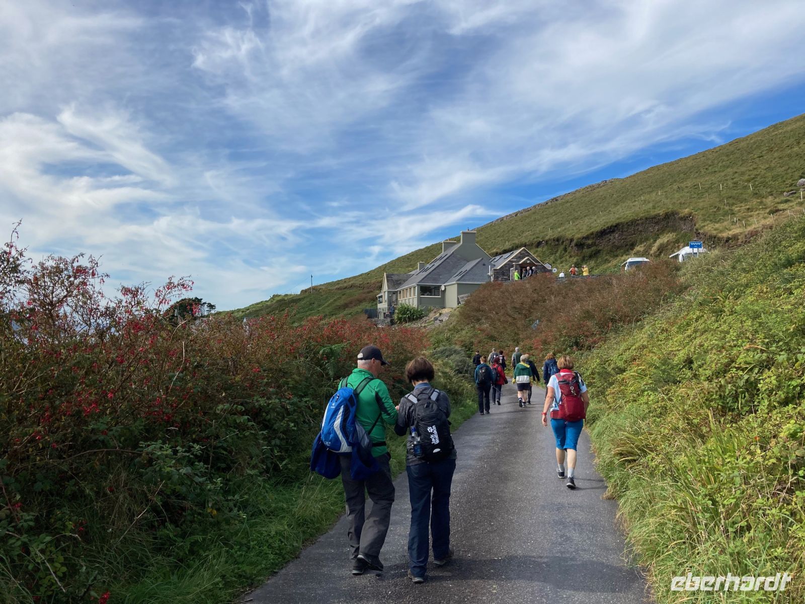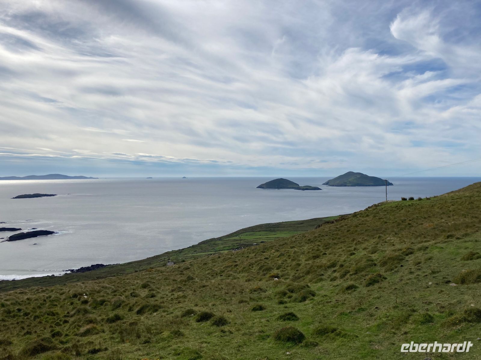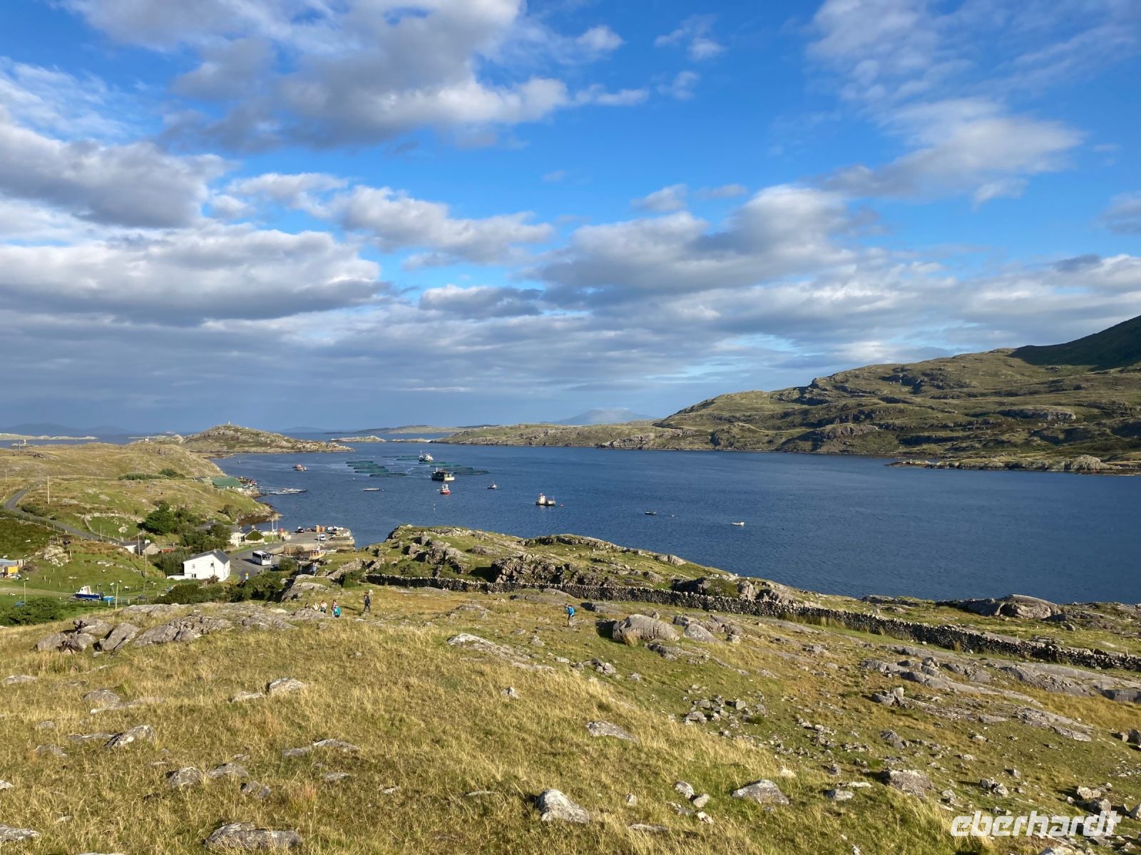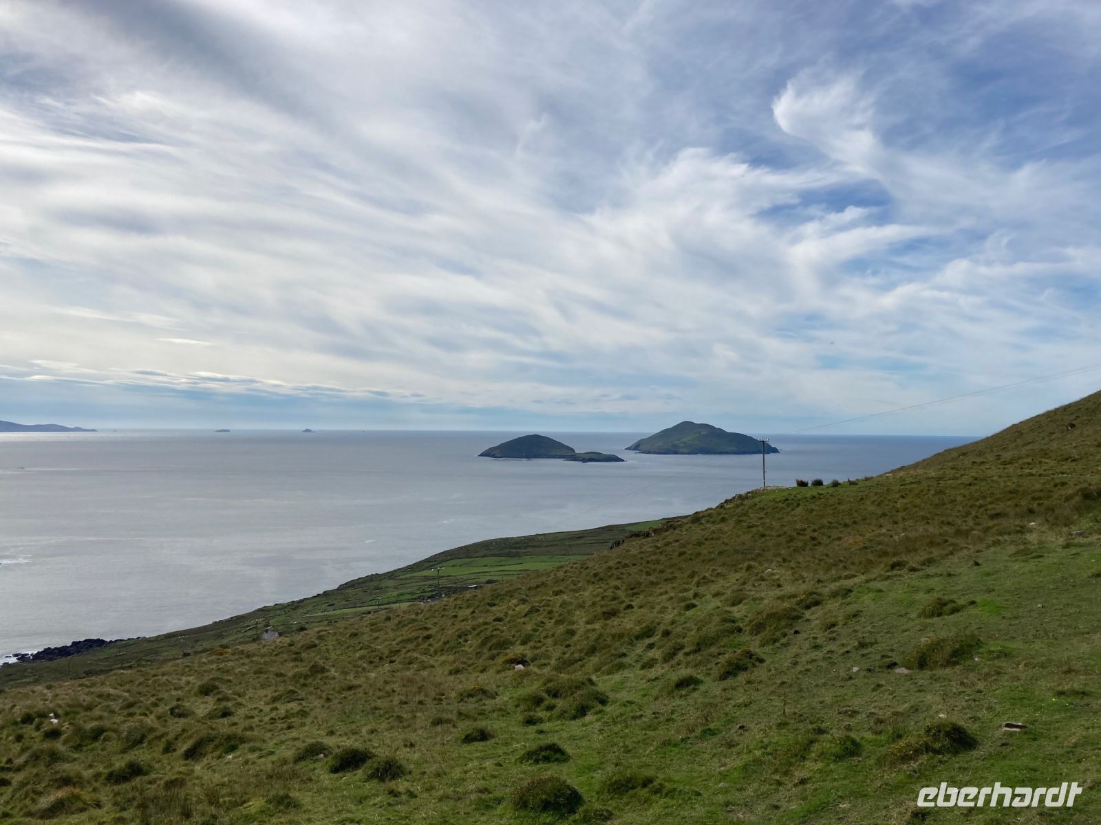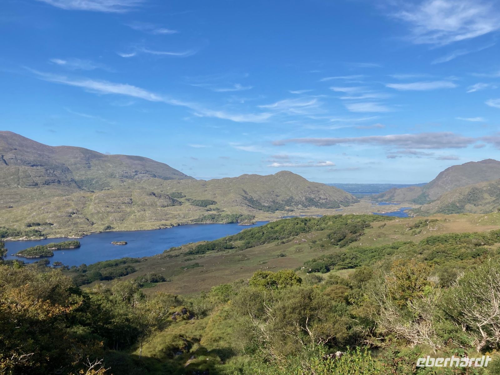 Das schöne Wetter ist zurück! Und genau zum richtigen Zeitpunkt! So können wir nämlich heute auf dem Ring of Kerry eine zusätzliche Wanderung machen. Doch zunächst wartet in Kells eine weitere Überraschung auf meine Gäste. Nach einem ersten Fotostopp mit Blick auf die Bucht von Dingle halten wir nämlich beim Schäfer Brendan mit seinen beiden treuen Border Collies, die uns nicht nur eine eindrucksvolle Demonstration ihres Könnens geben, sondern auch verschiedene, teils seltene Schafrassen vorstellen. Anschließend klettern wir in der Nähe von Cahersiveen auf den Mauern des Ringforts Cahergall herum und versetzen uns gedanklich noch einmal in die Zeit der Kelten zurück. Am Ende der Hauptsaison haben wir es sogar ganz für uns. In Waterville stärken wir uns während der Mittagspause für unsere anschließende Wanderung. Bei diesem schönen Wetter können wir uns gut vorstellen, warum es der Lieblingsferienort von Charlie Chaplin in Irland war. Dann geht es hinauf auf den Coomakista Pass, wo uns die vielleicht beste Aussicht des heutigen Tages erwartet. Diese bleibt uns auf der Wanderung hinunter zum Strand am Derrynane House erhalten. Wir fühlen uns eher wie am Mittelmeer, als im angeblich so verregneten Irland. Sogar die Skellig Islands tauchen während der Wanderung noch einmal am Horizont auf. Der traumhaft schöne Strand lädt dann zum Baden ein, während im Café am Derrynane House Eis und Kaffee locken. Hier könnten wir wieder länger verweilen, doch auf dem Ring of Kerry gibt es noch mehr zu sehen. Am Aussichtspunkt „Ladies‘ View“ können wir einen ersten Blick auf die Seen des Killarney-Nationalparks werfen. Beim Spaziergang durch den inzwischen angenehm ruhigen Park vom Torc-Wasserfall zum Muckross House sehen wir das altehrwürdige Herrenhaus mit seiner wunderschönen Gartenanlage im Licht der Abendsonne glänzen. Auf der Rückfahrt nach Tralee über Killarney sichten wir unsere vielen Fotos und schwelgen bereits in ersten Erinnerungen an diesen eindrucksreichen und sonnigen Tag.