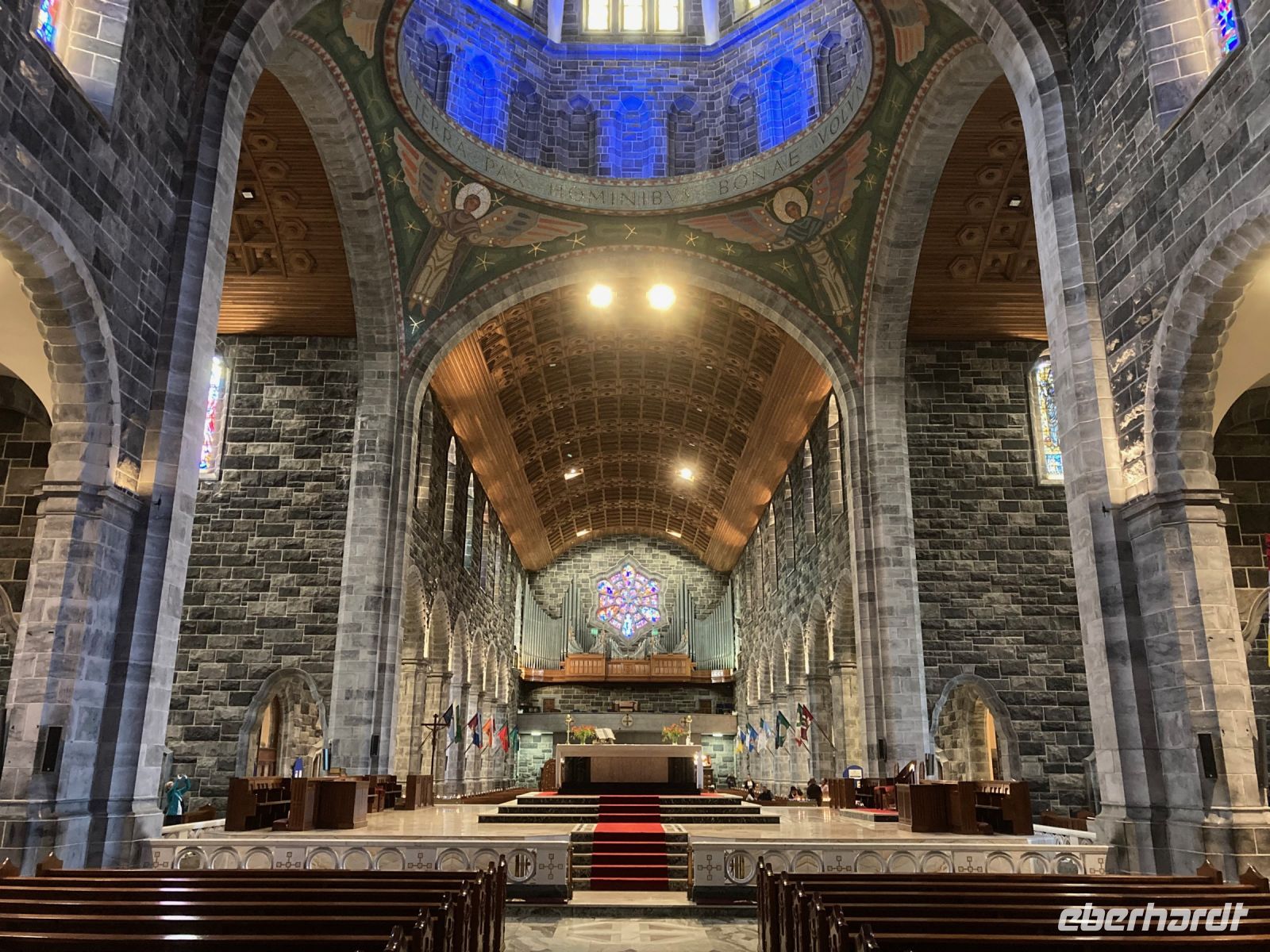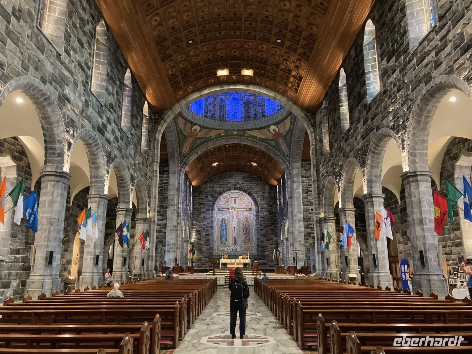 Ein wunderschöner Morgen beginnt für uns am Fjord. Die Sonne scheint über die Berge ins Tal hinein und sorgt im Bus für eine Atmosphäre der Glückseeligkeit, die uns erst zum Aussichtspunkt am Killary Harbour und schließlich bis zum Rosroe Pier fast an der Mündung des Fjords trägt. Die ganze Landschaft um uns herum wird am Morgen in einem warmen, goldenen Licht gebadet. Am Rosroe Pier klettern wir auf einen kleinen Hügel, der uns eine bessere Aussicht erlaubt. Einige Schafe begleiten uns sogar fast bis zum Bus hinunter, haben aber dann Angst vor dem dröhnenden Blechmonster. Hätte ich allerdings auch an ihrer Stelle, schließlich sitzt Donal am Steuer. Und Donal freut sich heute ganz besonders auf den Aufstieg auf den Diamond Hill im Connemara-Nationalpark. Besseres Wetter dafür könnte man sich nicht wünschen. Und das im September! Ja, der Aufstieg ist nicht ganz einfach, vor allem kurz vor dem Gipfel. Doch er wird mit einer fantastischen Aussicht belohnt. Wir können den ganzen Nationalpark überblicken und sehen auch die Kylemore Abbey sowie den dazugehörigen Garten. Übrigens wurde Donal heute locker abgehängt von unserem „18-jährigen Küken“ in der Gruppe. Das hat schon ein bisschen an seinem Soldatenego gekratzt. Wir genießen noch einmal den Blick hinüber zum Meer, dann machen wir uns langsam an den Abstieg. Im Bus wird dann erstmal Bergfest gefeiert. Ich habe dazu eine Flasche Irish Mist besorgt, die mal wieder sehr gut ankommt. Außer bei unserem Fahrer, denn er darf wieder nur zugucken. Und muss uns dann hinüber zur Kylemore Abbey fahren. Ein schönes altes Herrenhaus am See, erst vor kurzem restauriert, in wunderschöner Lage. Leider nicht zu verkaufen, da es im Besitz eines Benediktinerinnenordens ist. Auch hier können wir schön spazierengehen unter alten Bäumen und neben dem Hauptgebäude auch eine kleine neogotische Kirche und den großen viktorianischen Garten bewundern. Am Nachmittag fahren wir dann durch das Inagh Valley bis nach Galway, wo wir der St.-Nikolaus-Kathedrale noch einen kleinen Besuch abstatten, bevor uns Donal schließlich zu unserem nächsten Hotel nach Gort fährt. Nach dem Abendessen sorgen meine Gäste dann unten im dortigen Pub für reichlich Stimmung. Die Videos davon bleiben allerdings für die Allgemeinheit unter Verschluss. Versprochen.