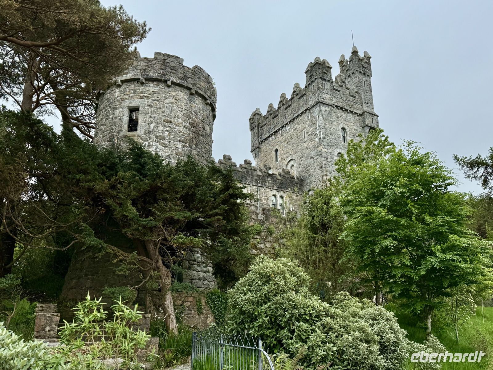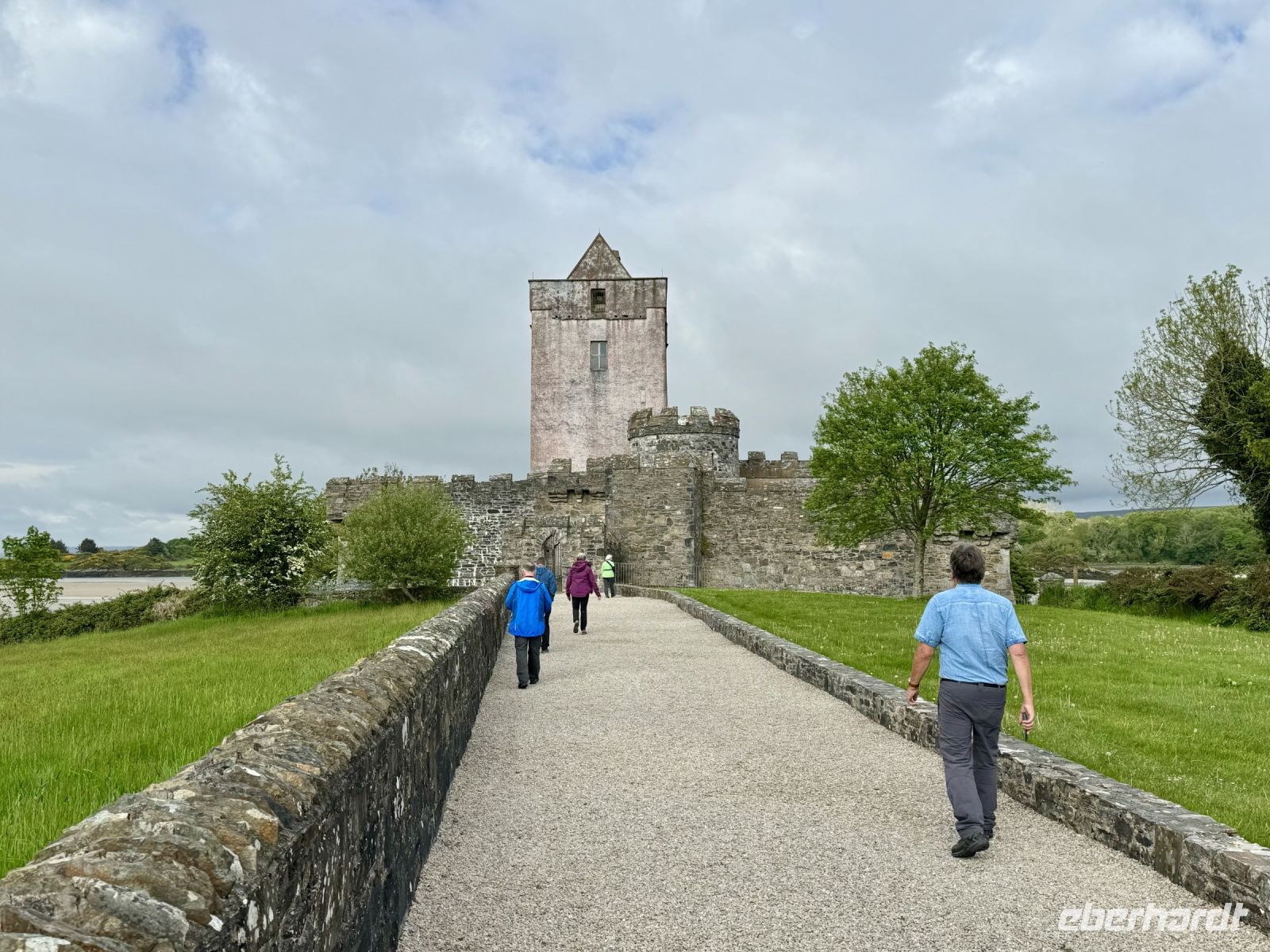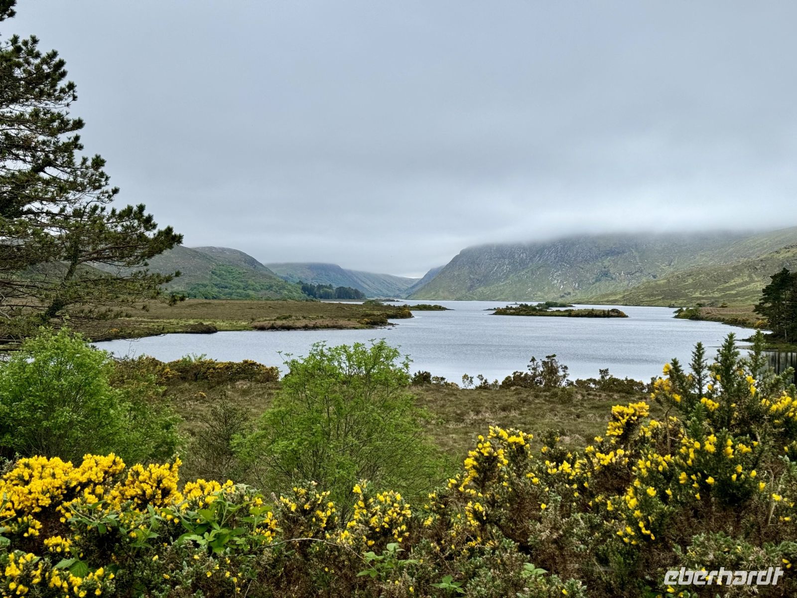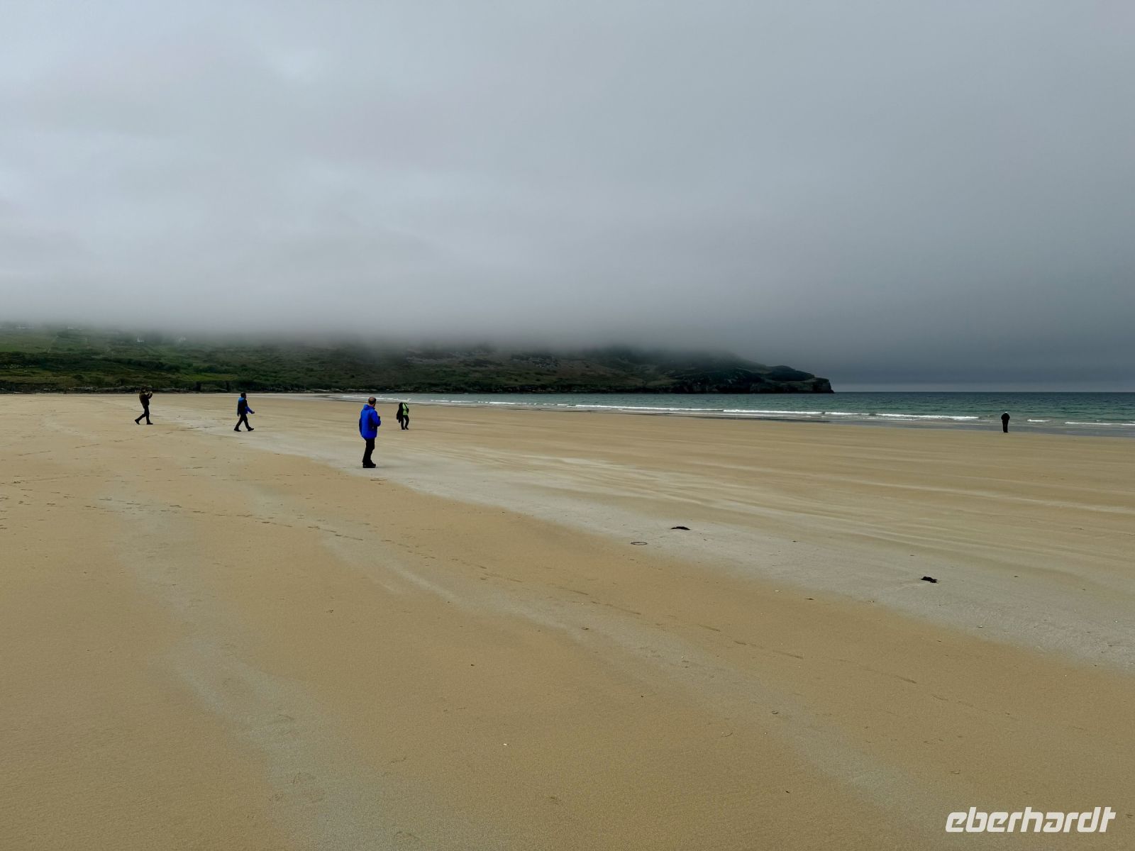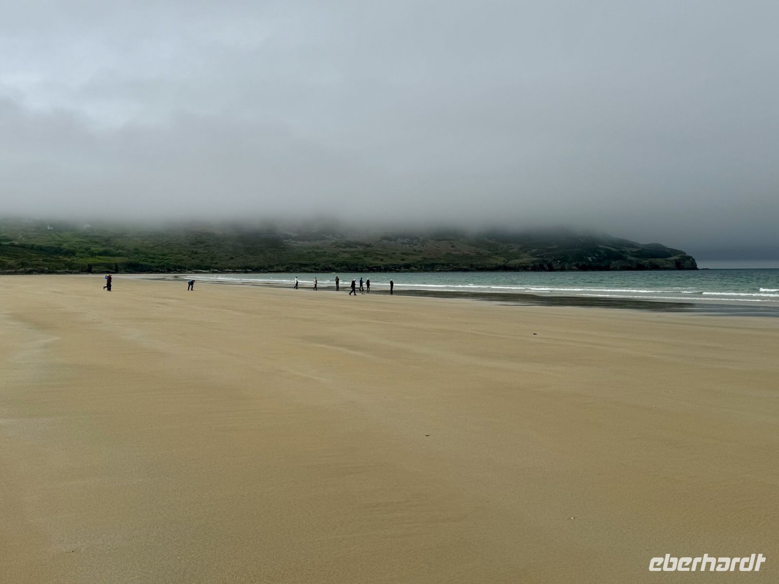 Ach, mein Herz schlägt für Glenveagh! Wären da nicht die Midges, die uns Wanderer vor allem im Sommer plagen, aber auch im Mai schon an einigen Stellen in kleinen Schwärmen auftreten, würde ich glatt einziehen in das hübsche kleine Schloss am Lough Veagh im Herzen der Derryveagh Mountains. Nach einer halben Stunde Fahrt haben wir den Nationalpark erreicht. Ein kurzer Film sorgt für die passende historische und musikalische Einstimmung auf den heutigen Tag. Mit einem Shuttlebus werden wir vom Besucherzentrum zum Castle gebracht und brechen von dort alsbald auf unsere erste gemeinsame Wanderung auf dieser Reise auf. Eine gute Gelegenheit, Ausrüstung und Kondition zu testen und miteinander ins Gespräch zu kommen … würde einen nicht die herrliche Landschaft des Tals immer wieder ablenken und zum Staunen bringen. Wir laufen am See entlang durch einen alten Eichenwald bis zu einem kleinen weißen Cottage, wo wir zur Stärkung für den Rückweg eine Pause einlegen. Donal ist die letzten Meter schon vorgelaufen und räumt uns Stühle vor die Hütte. Auf dem Rückweg zum Schloss machen wir fast alle einen Abstecher zum Aussichtspunkt. Die kurze Quälerei den Hügel hinauf lohnt sich immer wieder, werden wir doch mit einer wunderbaren Aussicht über das ganze Tal belohnt. Ein just in diesem Moment heraufziehender Regenschauer kann uns nicht die gute Stimmung verderben, zumal er schnell wieder endet. Unsere Wanderung endet im Park bzw. viktorianischen Garten des Schlosses, der uns mit einer wahren Blütenpracht in Rot, Weiß, Gelb und einem zarten Rosa empfängt. Nun können wir uns im Schlosscafé mit einem Kaffee, Tee, Kuchen oder warmen Essen belohnen, weiter die Gartenanlage erkunden und sogar noch ein paar zusätzliche Schritte sammeln, indem wir auch die vier Kilometer zurück zum Busparkplatz laufen. Den Rest des Nachmittags verbringen wir mir einer kleinen Rundfahrt durch das County Donegal. Sie führt uns an einen weiteren schönen Aussichtspunkt oberhalb des Poisoned Glen. Nur leider hängt ein dichter Nebel über allem, sodass wir auch den Mount Errigal, den höchsten Berg Donegals, nur schemenhaft erahnen können. Je tiefer wir kommen, desto mehr (Meer) können wir wieder sehen. Am Strand von Dunfanaghy sind wir fast alleine und können unsere Freude ganz ungezwungen hinausrufen. Wir können gut verstehen, dass die Iren hier an diesem schönen Sandstrand den Sommer über gerne Urlaub machen, obgleich das Wasser des Nordatlantiks noch etwas kalt ist. Da wir immer noch mit unserem kleinen Sprinter unterwegs sind, können wir auf der Rückfahrt nach Letterkenny sogar noch einen Abstecher zum Doe Castle machen, einem irischen Wohnturm aus dem 15. Jahrhundert, wunderschön an einer tiefen Bucht gelegen.